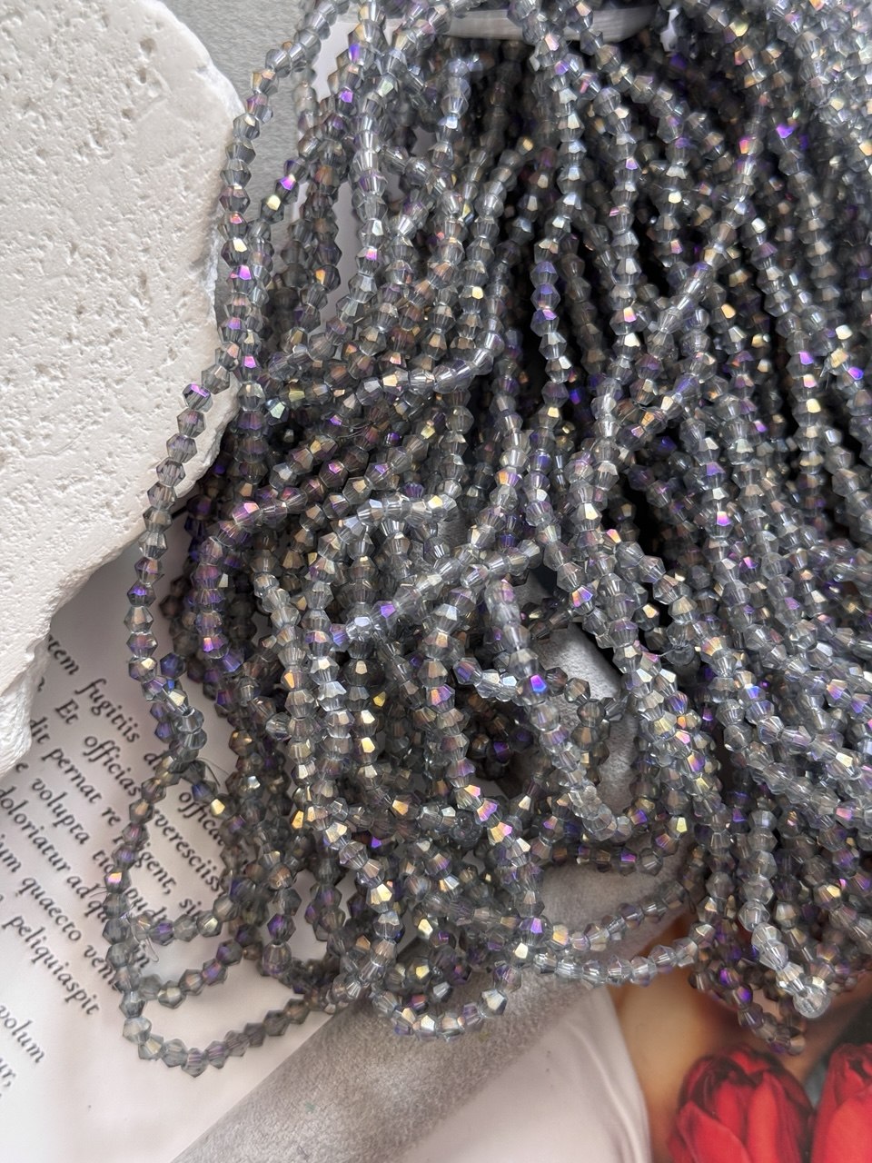 Стеклянные биконусы на нити для рукоделия и вышивки 3 мм цвет Серый гальванизированный