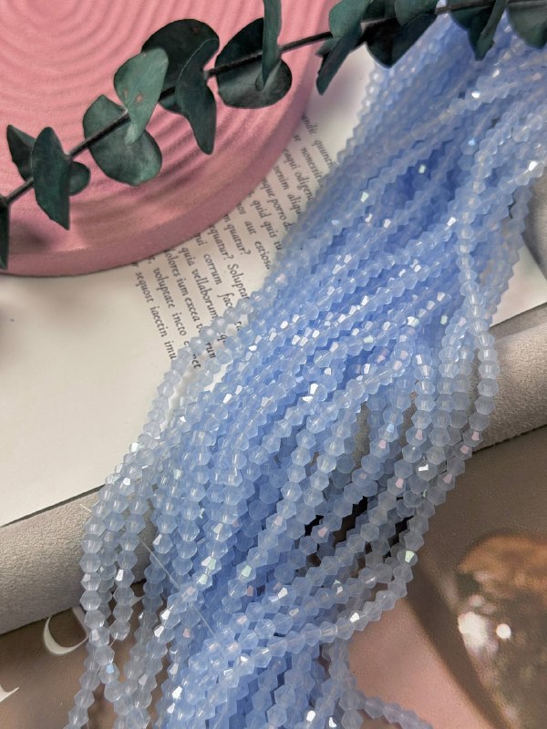 Стеклянные биконусы на нити для рукоделия и вышивки 4 мм, голубой опал.