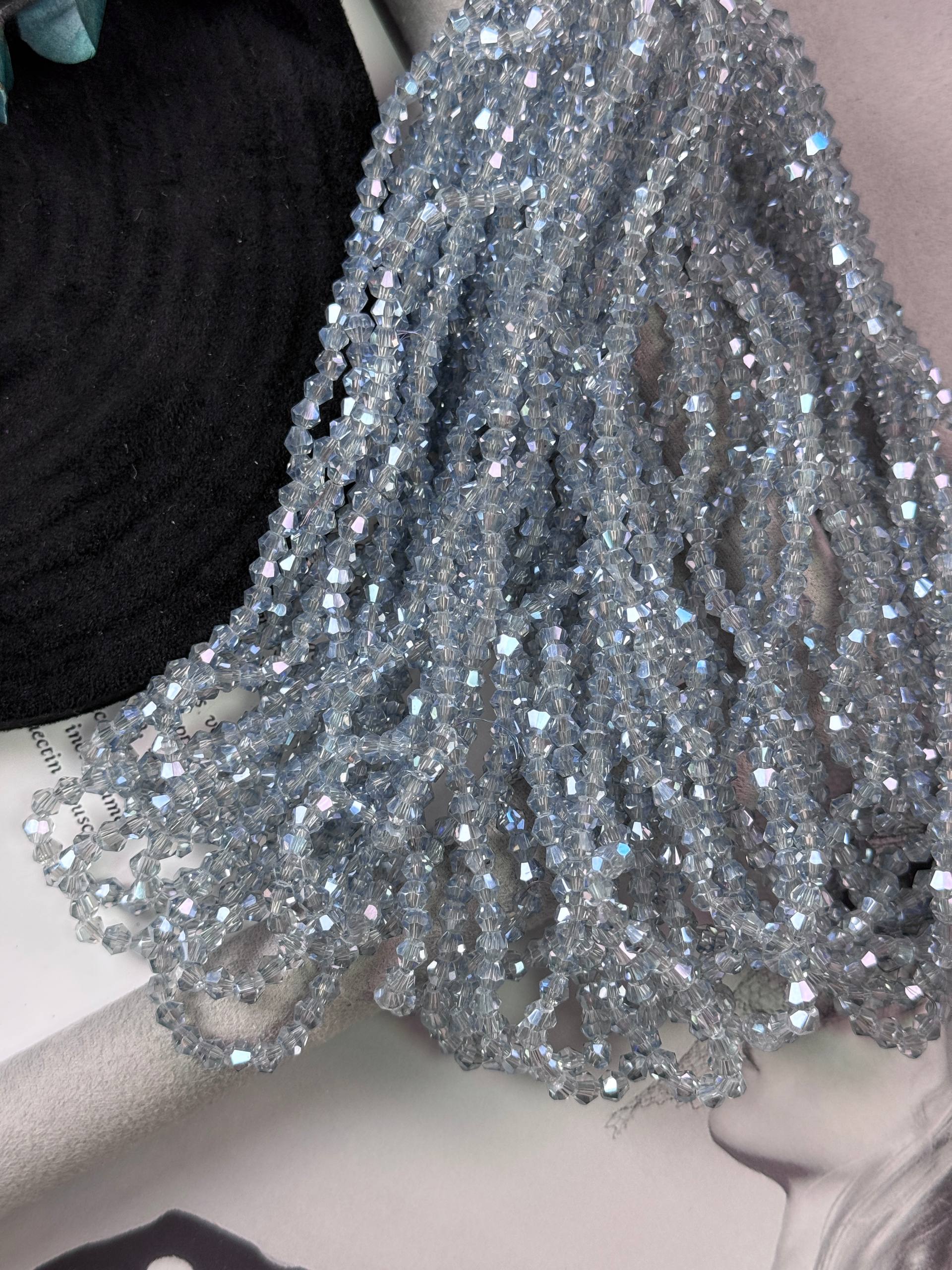 Стеклянные биконусы на нити для рукоделия и вышивки 4 мм серо-голубой.