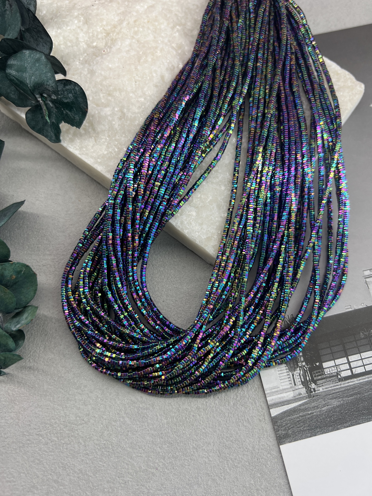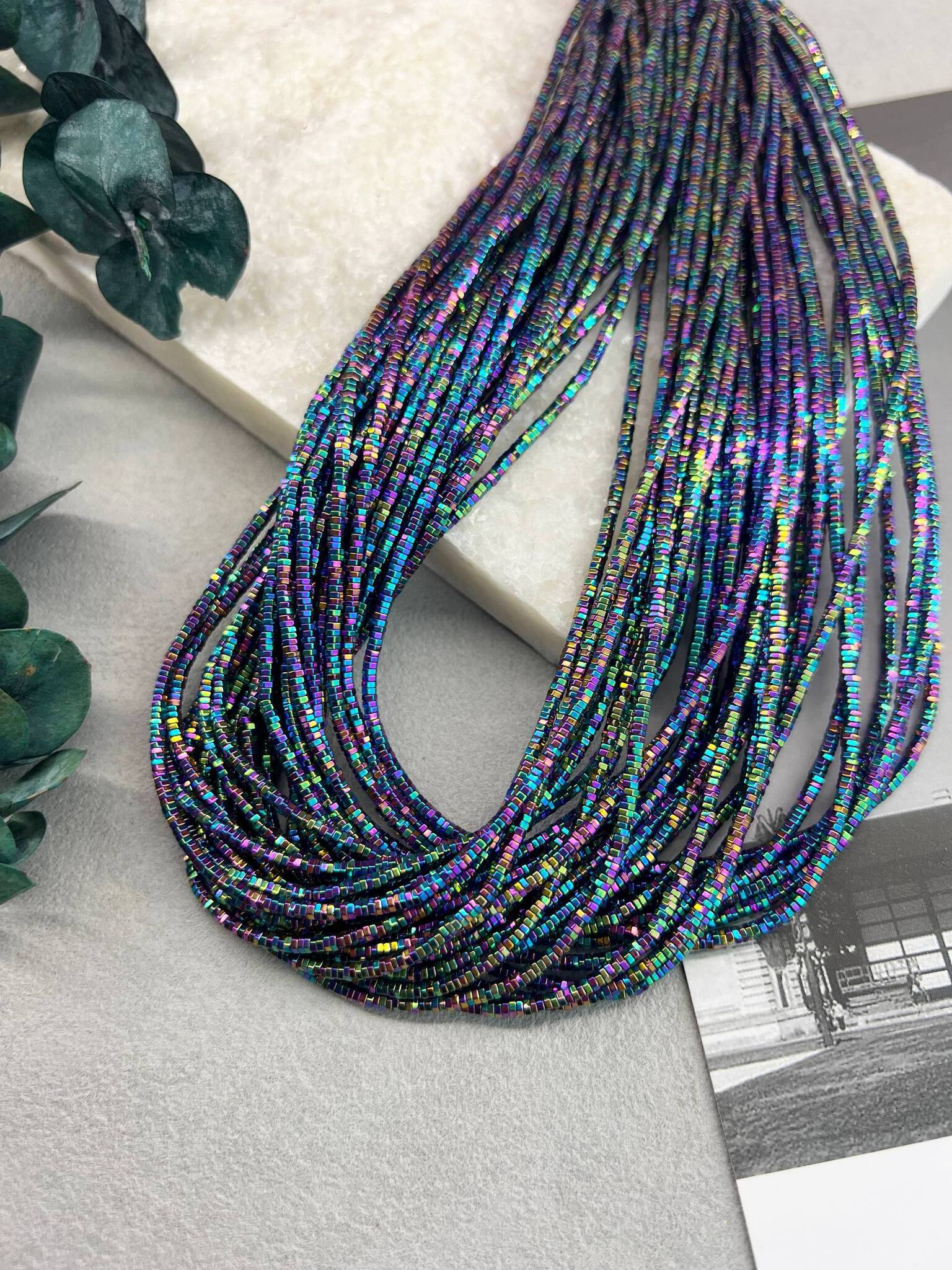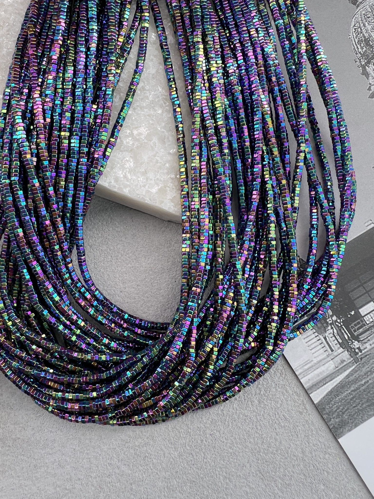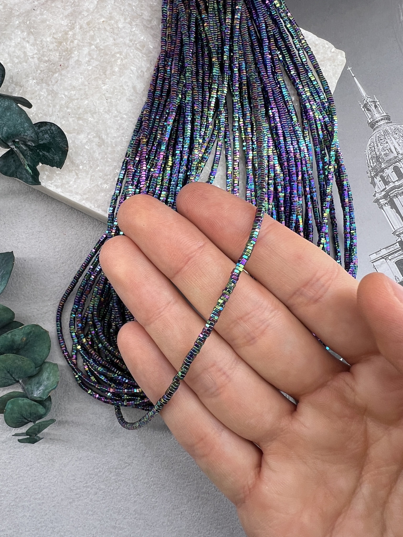 Гематит с гальваническим покрытием многогранного синего цвета с лиловыми переливами в форме шестигранника. Размер одной бусины 2*1 мм, длина нити около 40 см (может отличаться на пару сантиметров в зависимости от разных партий). Гипоаллергенно.