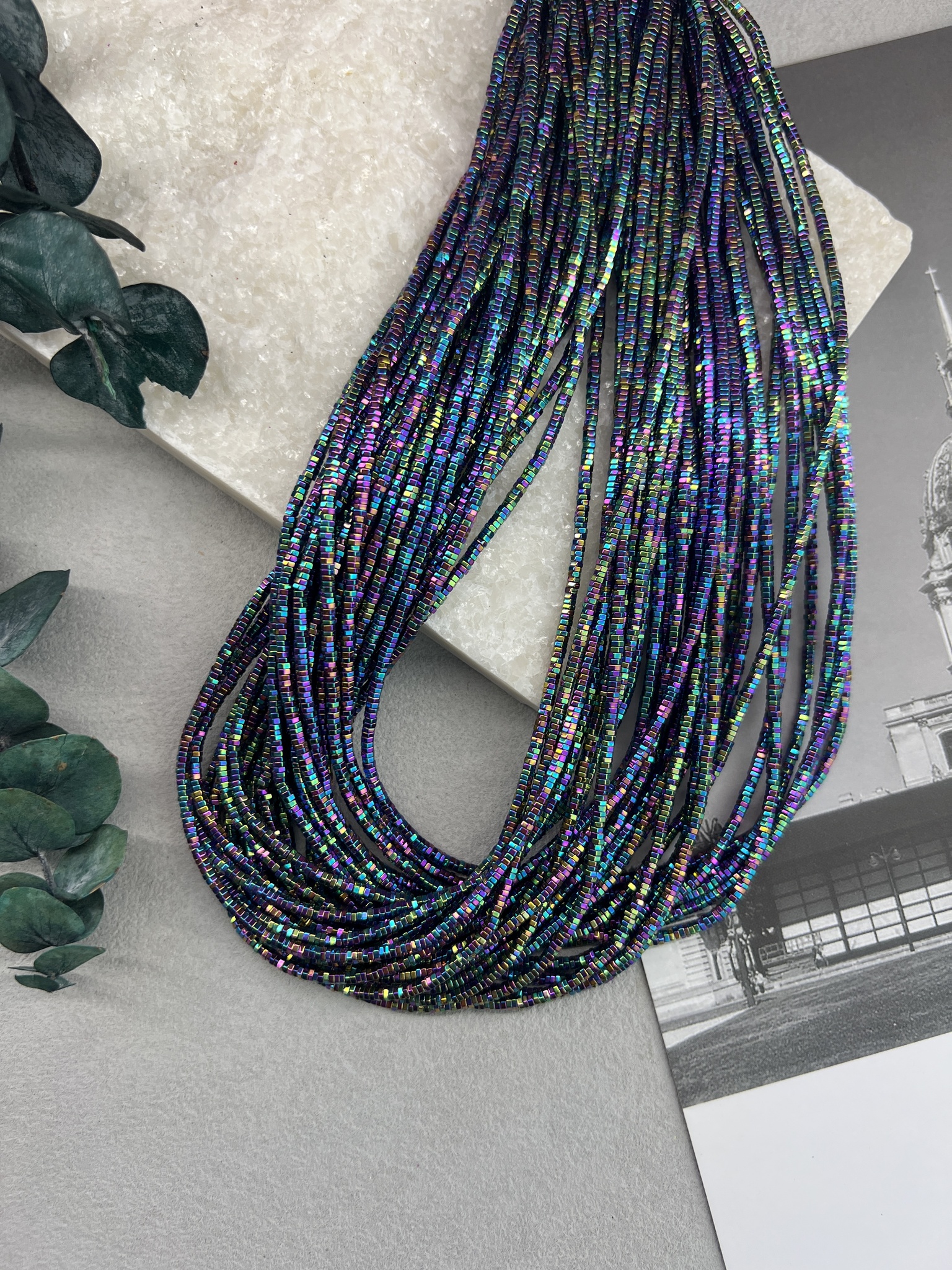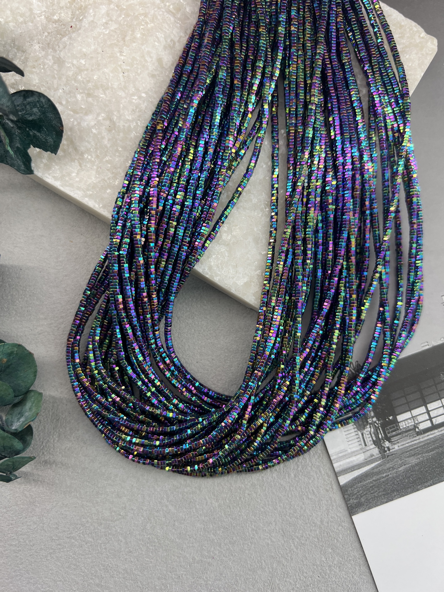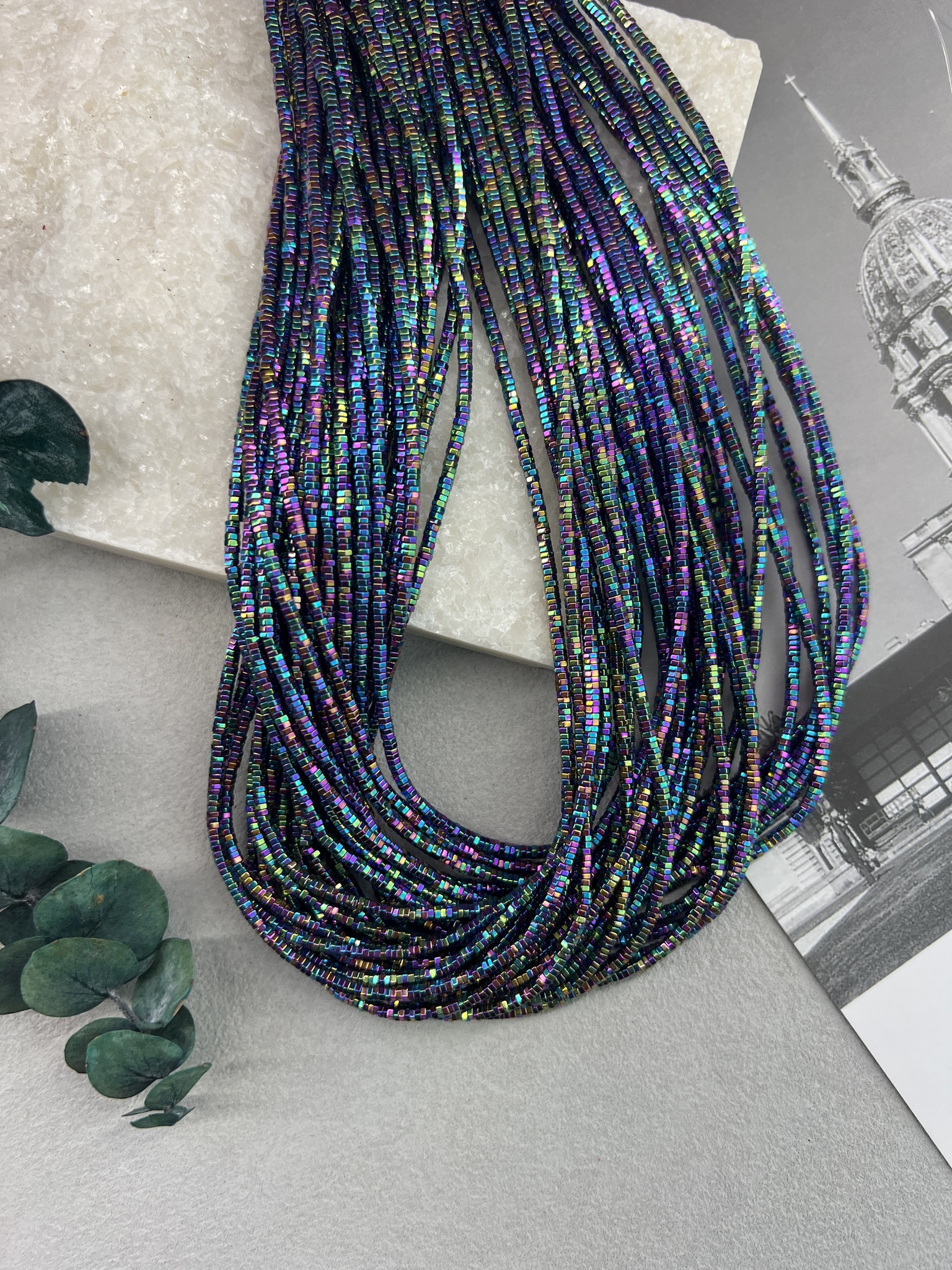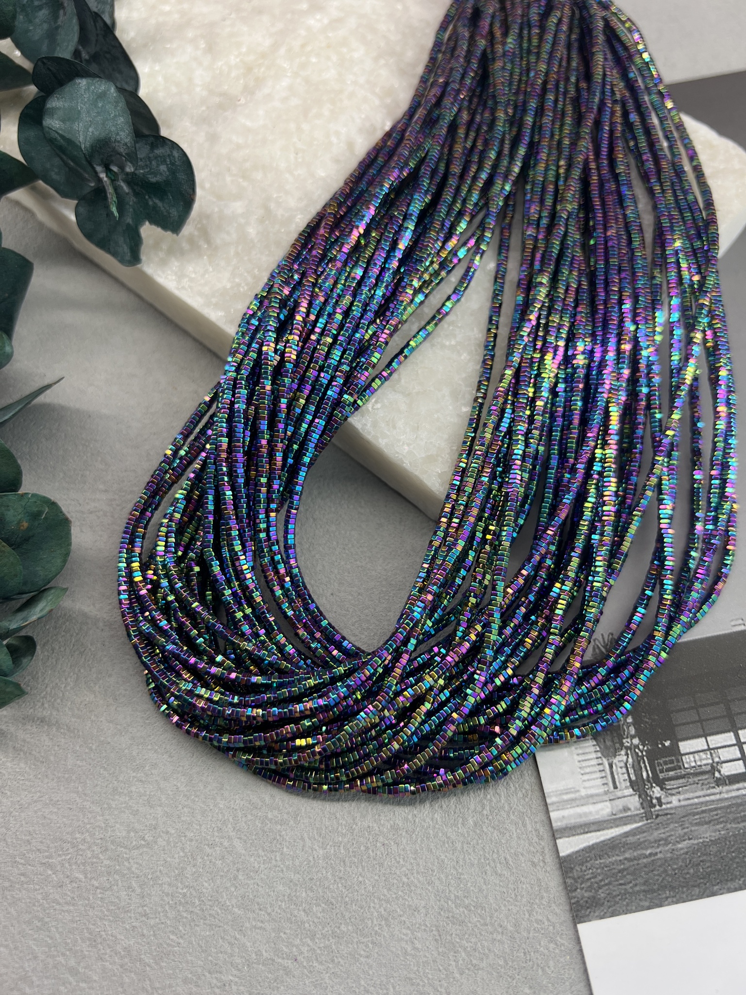 Гематит с гальваническим покрытием многогранного синего цвета с лиловыми переливами в форме шестигранника. Размер одной бусины 2*1 мм, длина нити около 40 см (может отличаться на пару сантиметров в зависимости от разных партий). Гипоаллергенно.