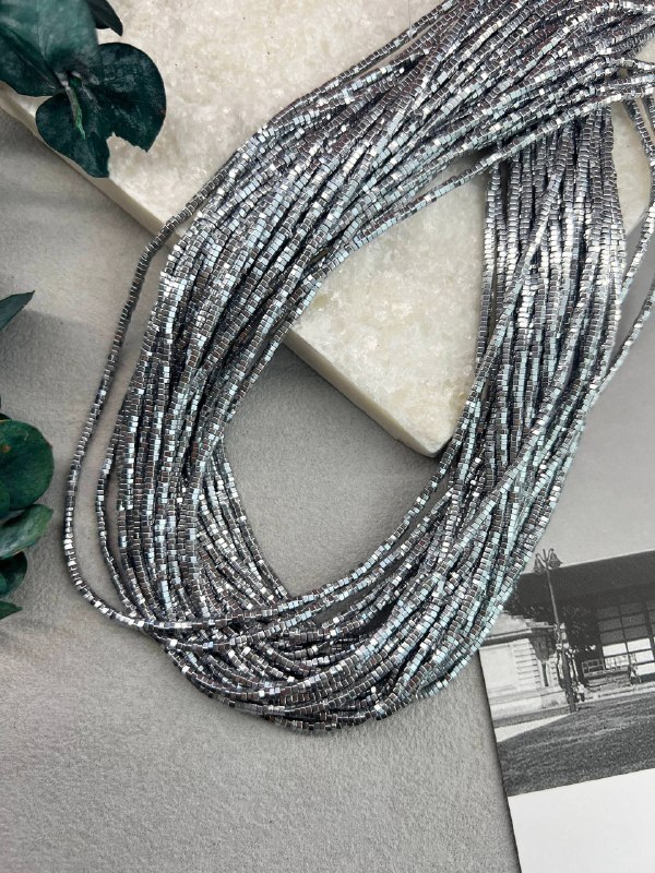 Гематит с гальваническим покрытием серебряного цвета в форме шестигранника. Размер одной бусины 2*1 мм, длина нити около 40 см (может отличаться на пару сантиметров в зависимости от разных партий). Гипоаллергенно.
