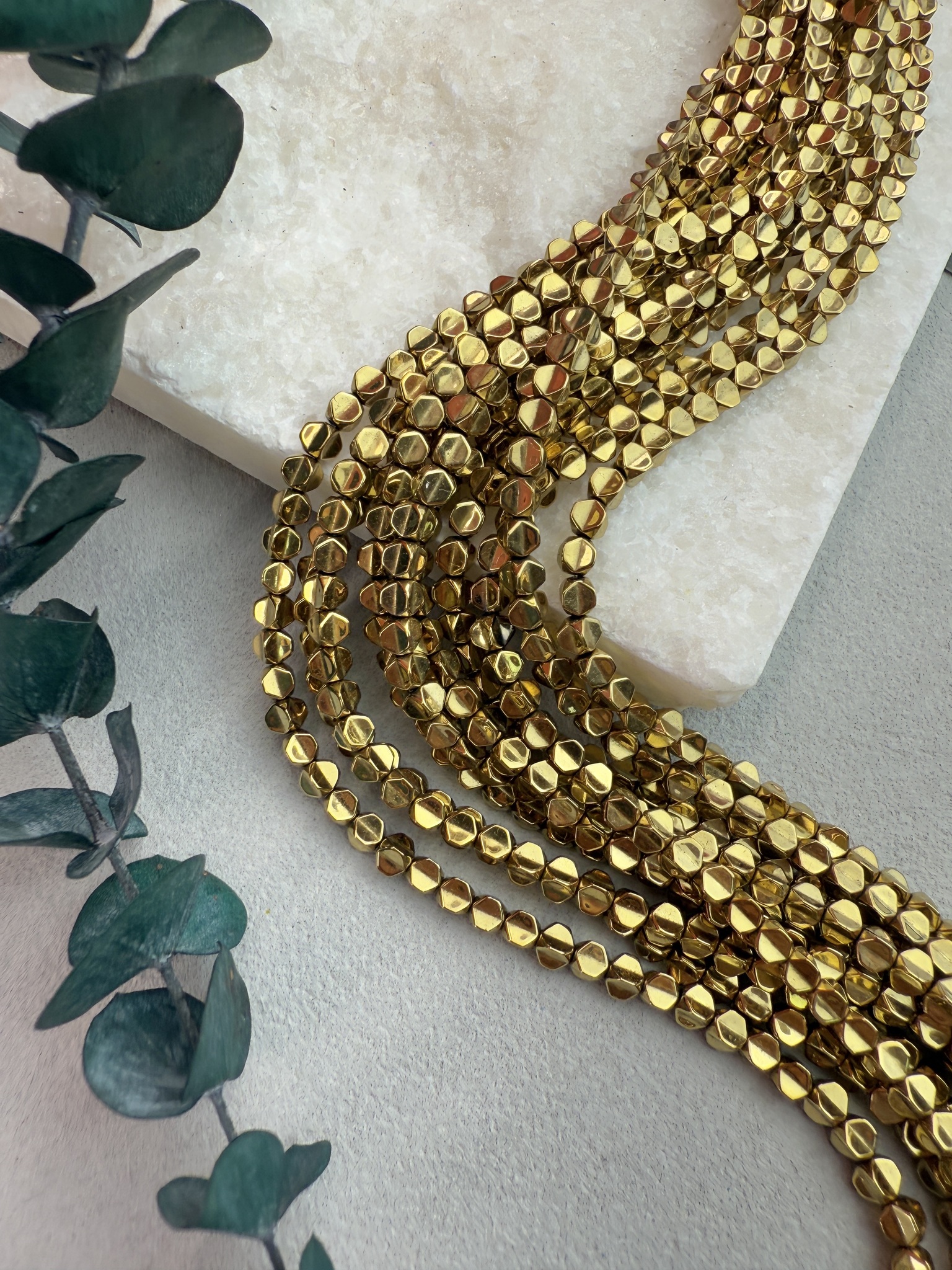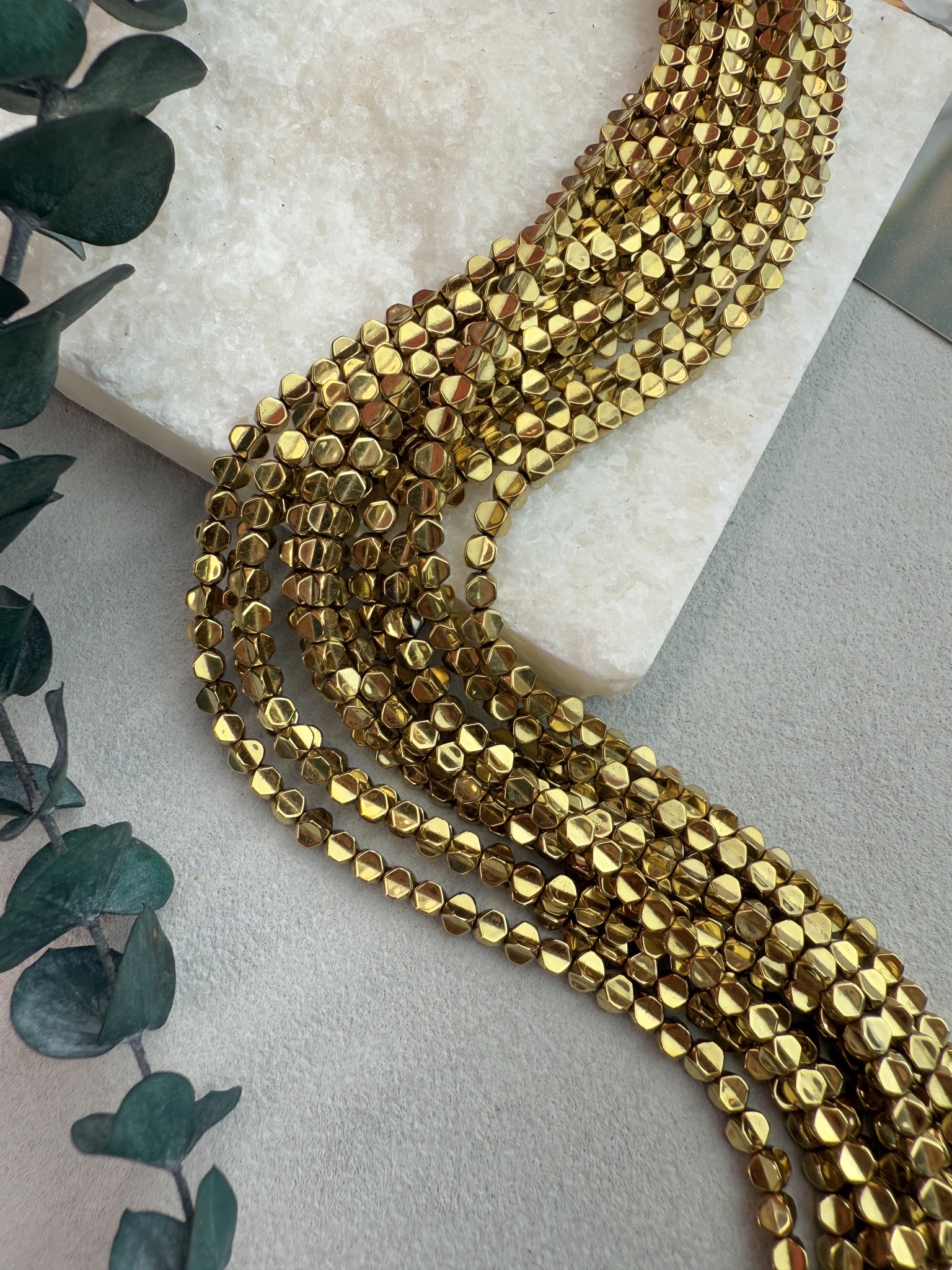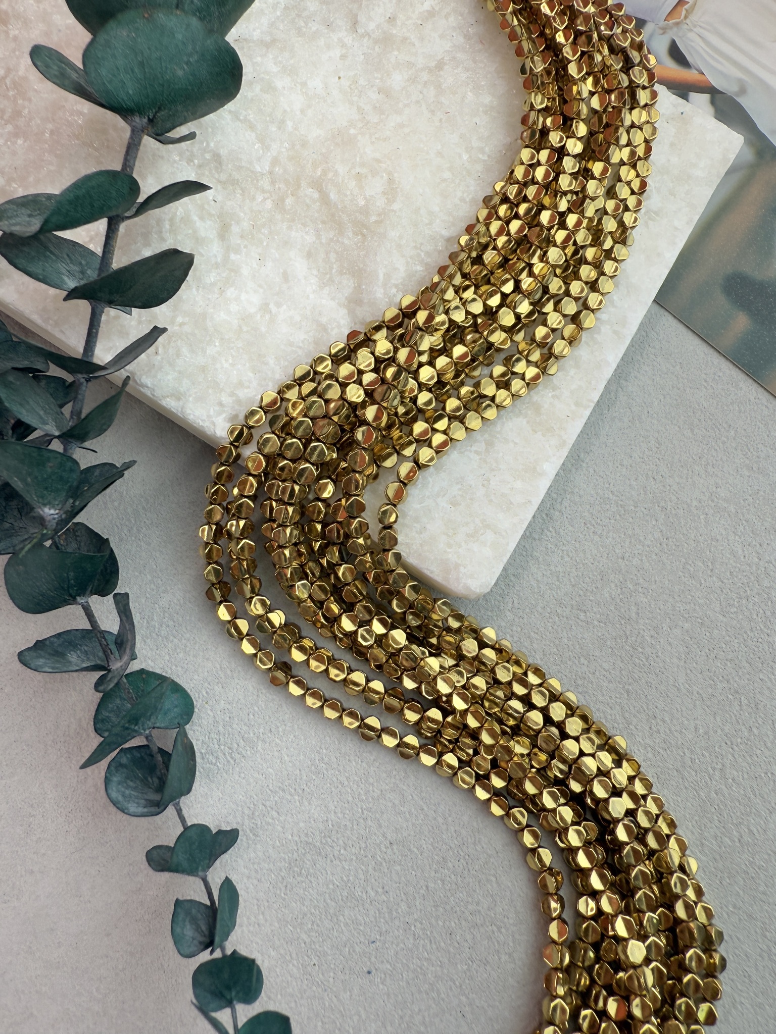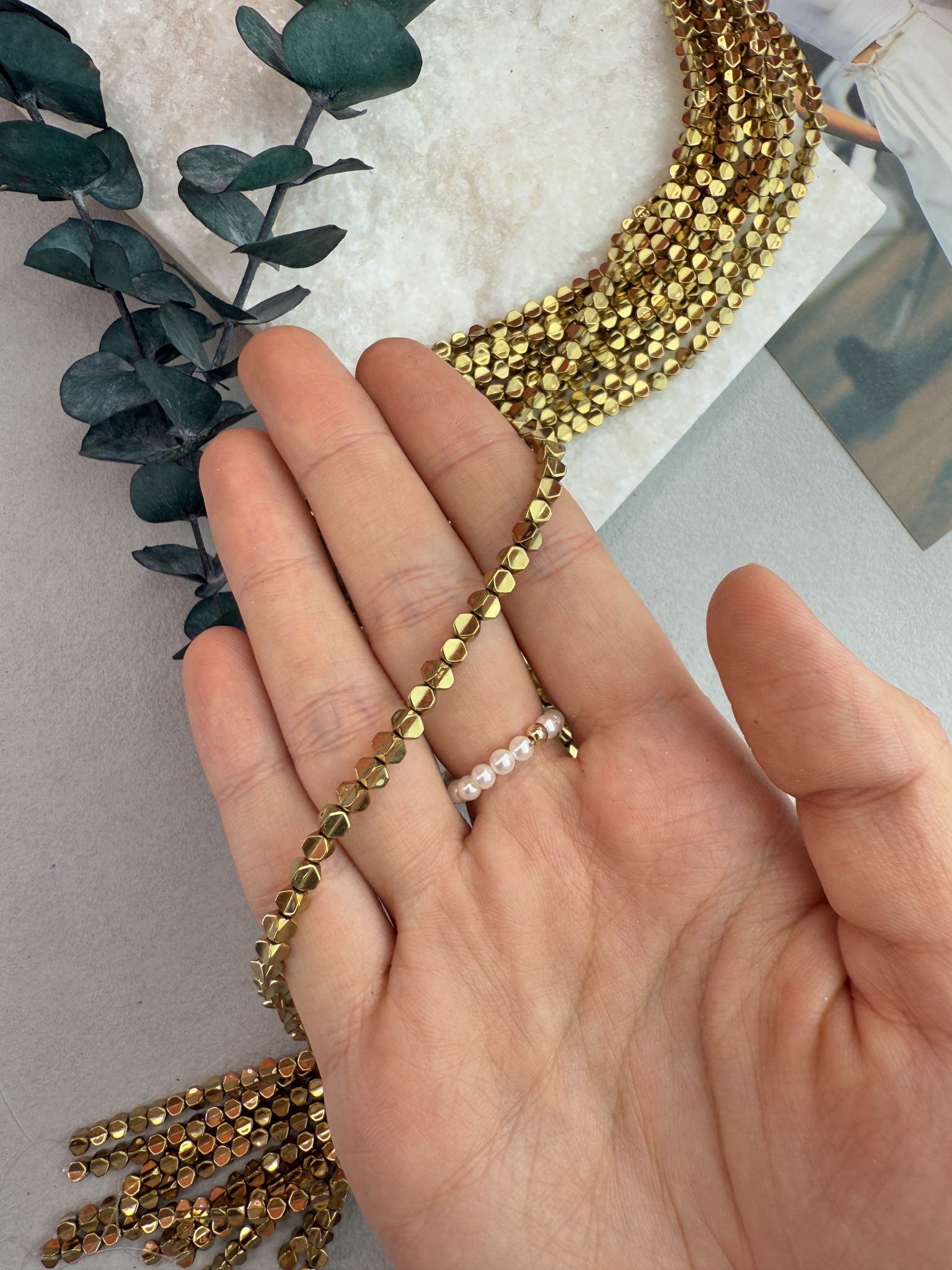 Гематит с гальваническим покрытием золотого цвета в форме булавы. Размер одной бусины 4 мм, длина нити около 40 см (может отличаться на пару сантиметров в зависимости от разных партий). Гипоаллергенно.