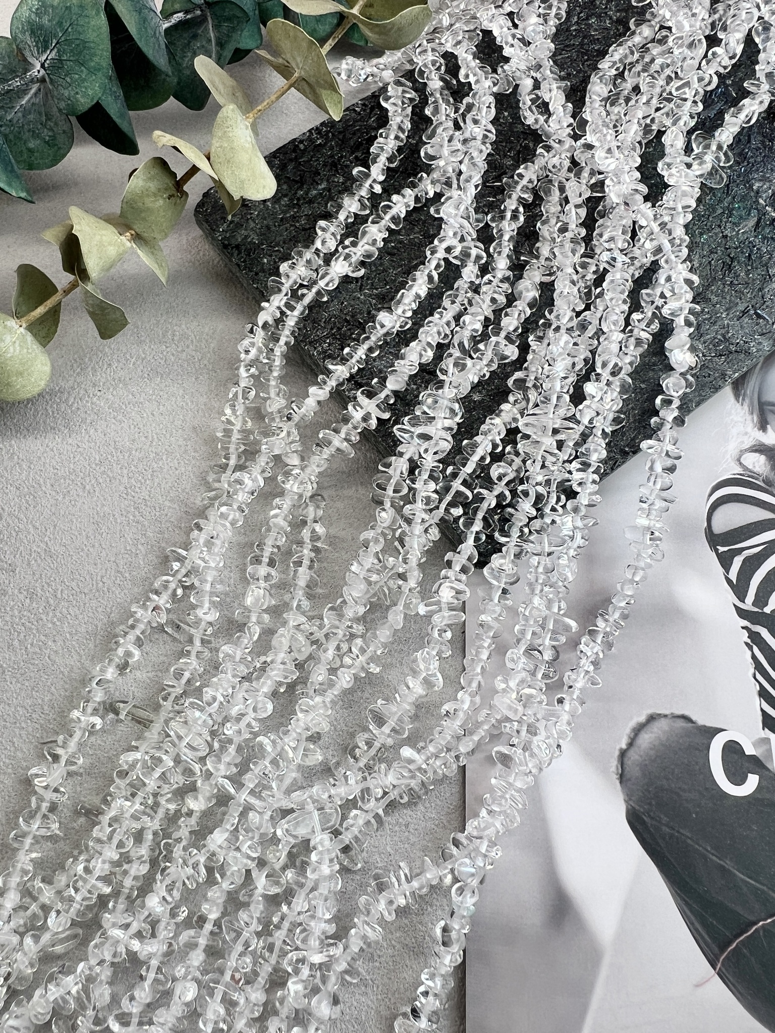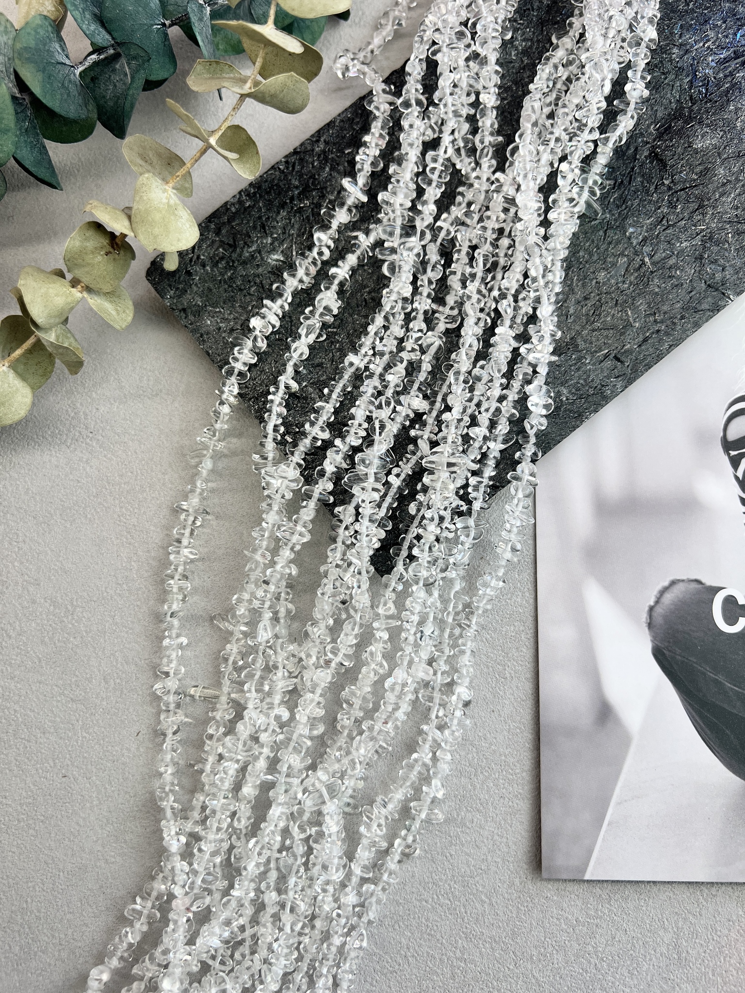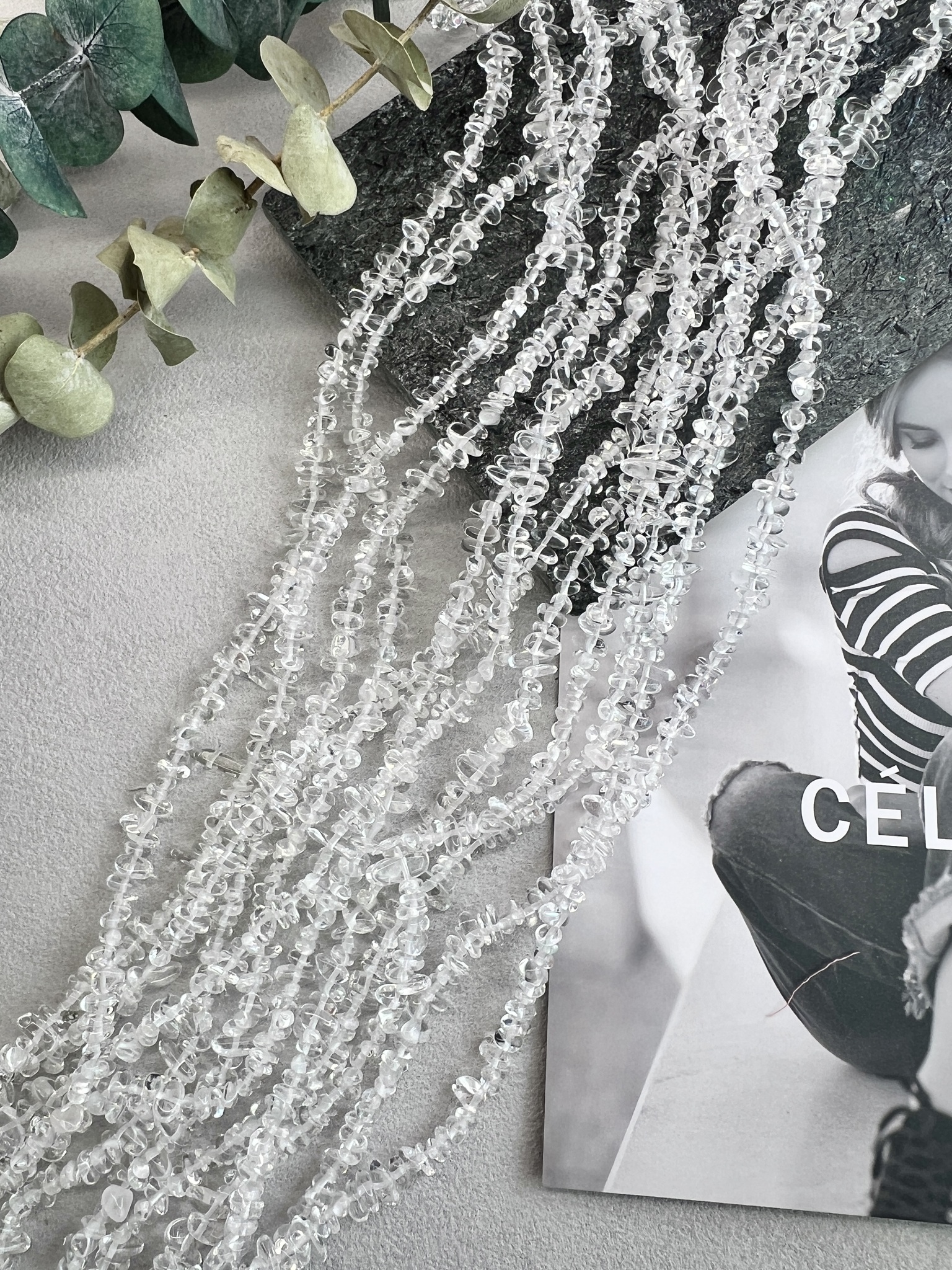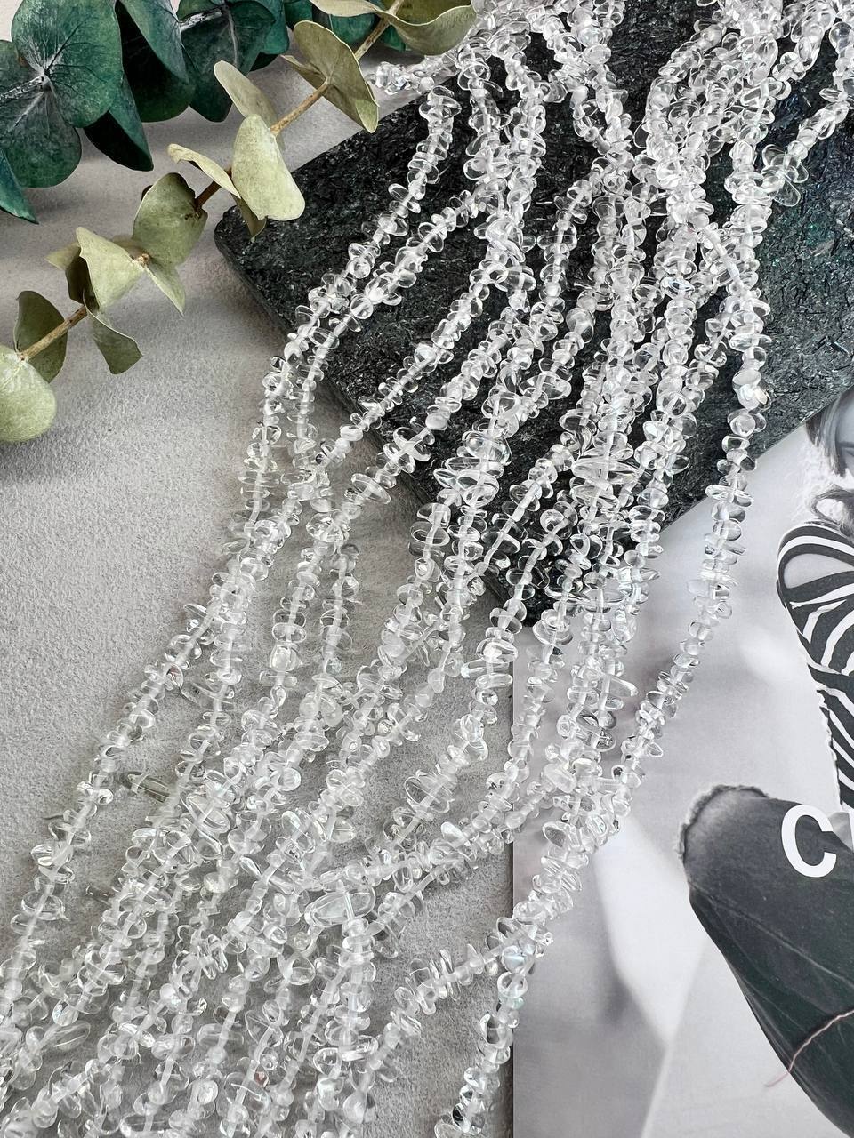 Бусины произвольной формы из чистейшего горного хрусталя. Размер бусин (примерный) 5-3 мм. Продается россыпью или на нити длиной 80 см (нить иногда рвется и мы меняем фасовку на россыпь). Форма всех бусин разная, неопределенная (галька).