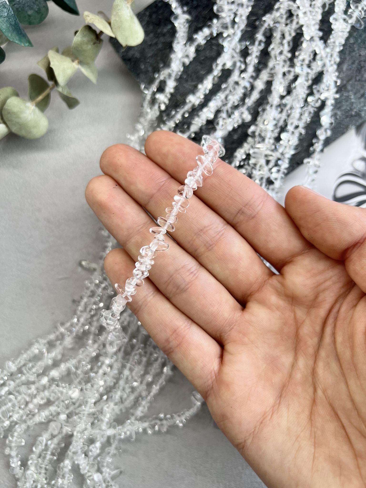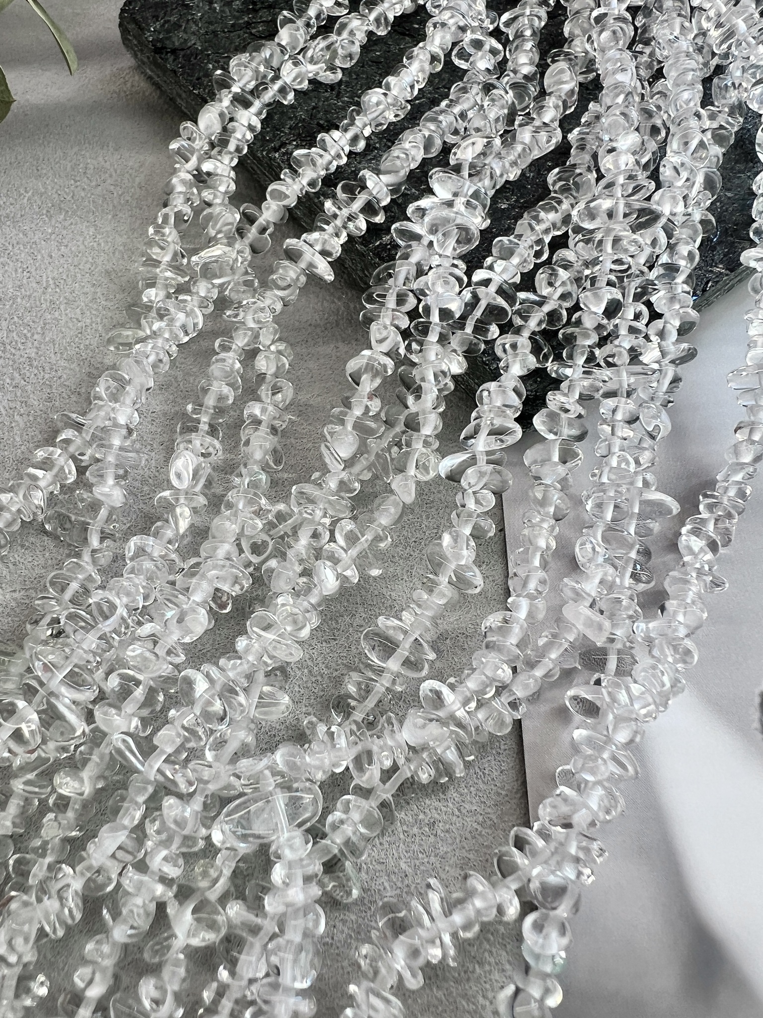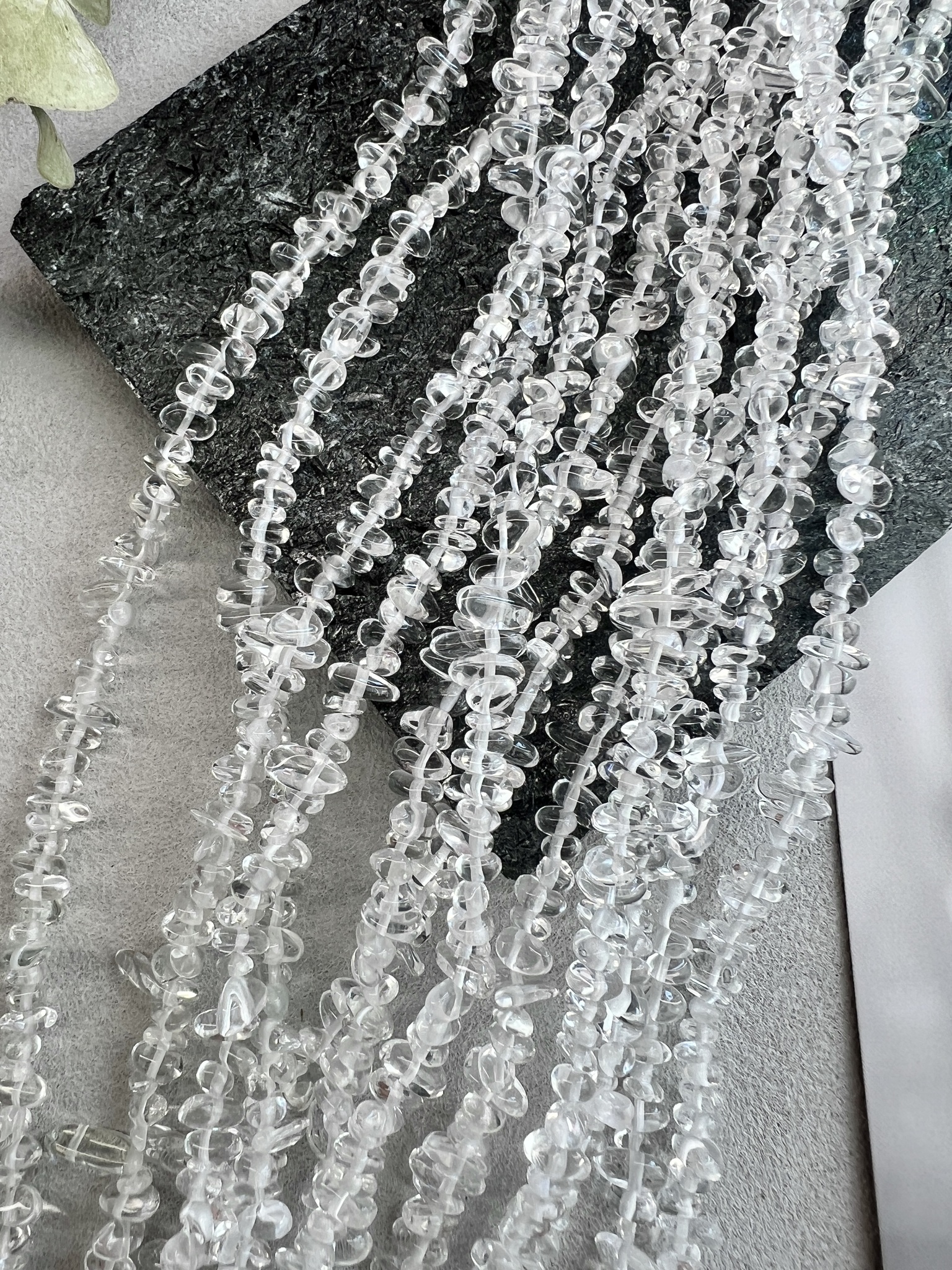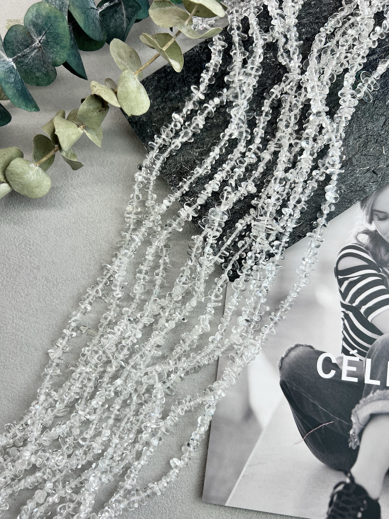 Бусины произвольной формы из чистейшего горного хрусталя. Размер бусин (примерный) 5-3 мм. Продается россыпью или на нити длиной 80 см (нить иногда рвется и мы меняем фасовку на россыпь). Форма всех бусин разная, неопределенная (галька).