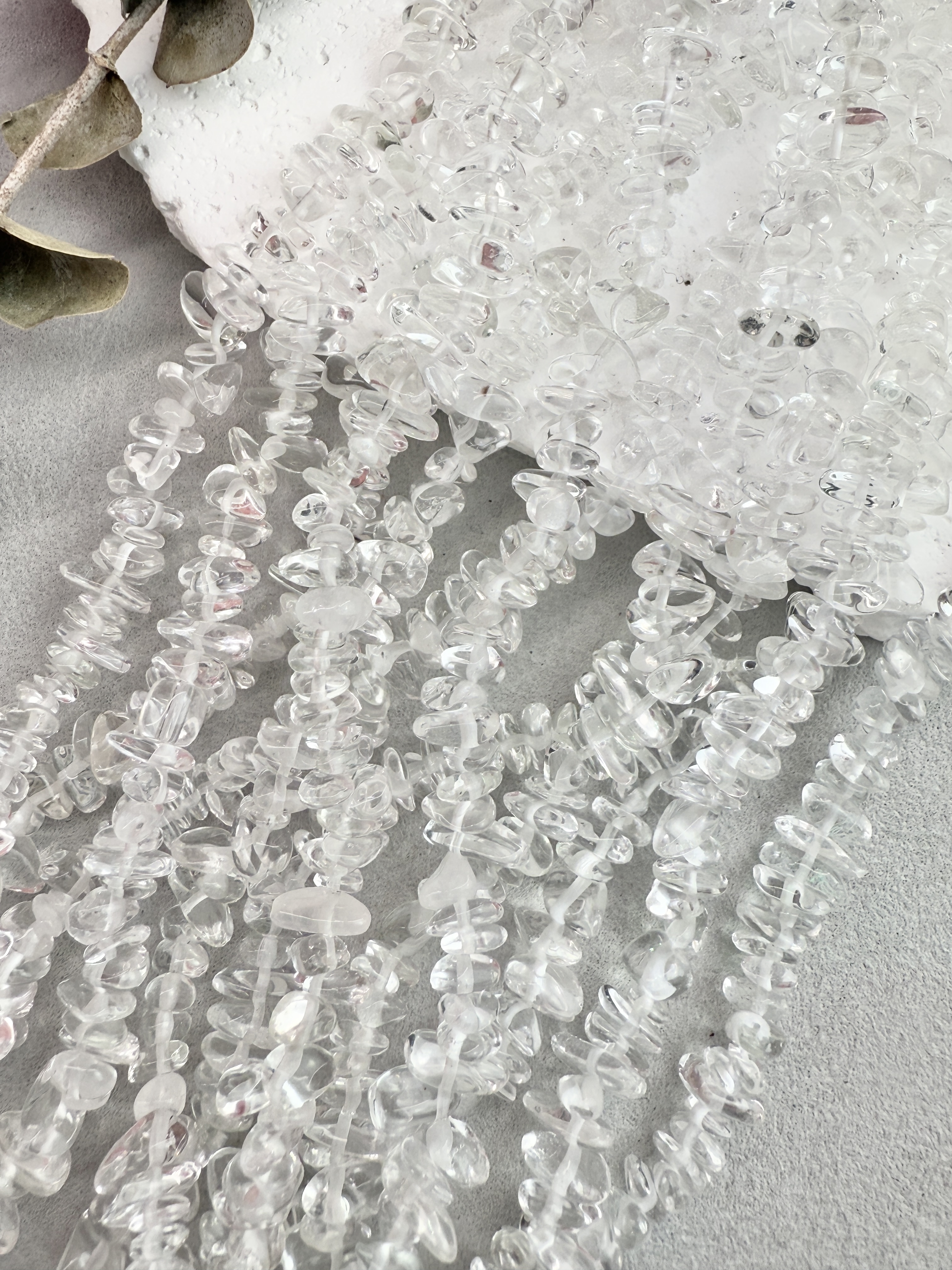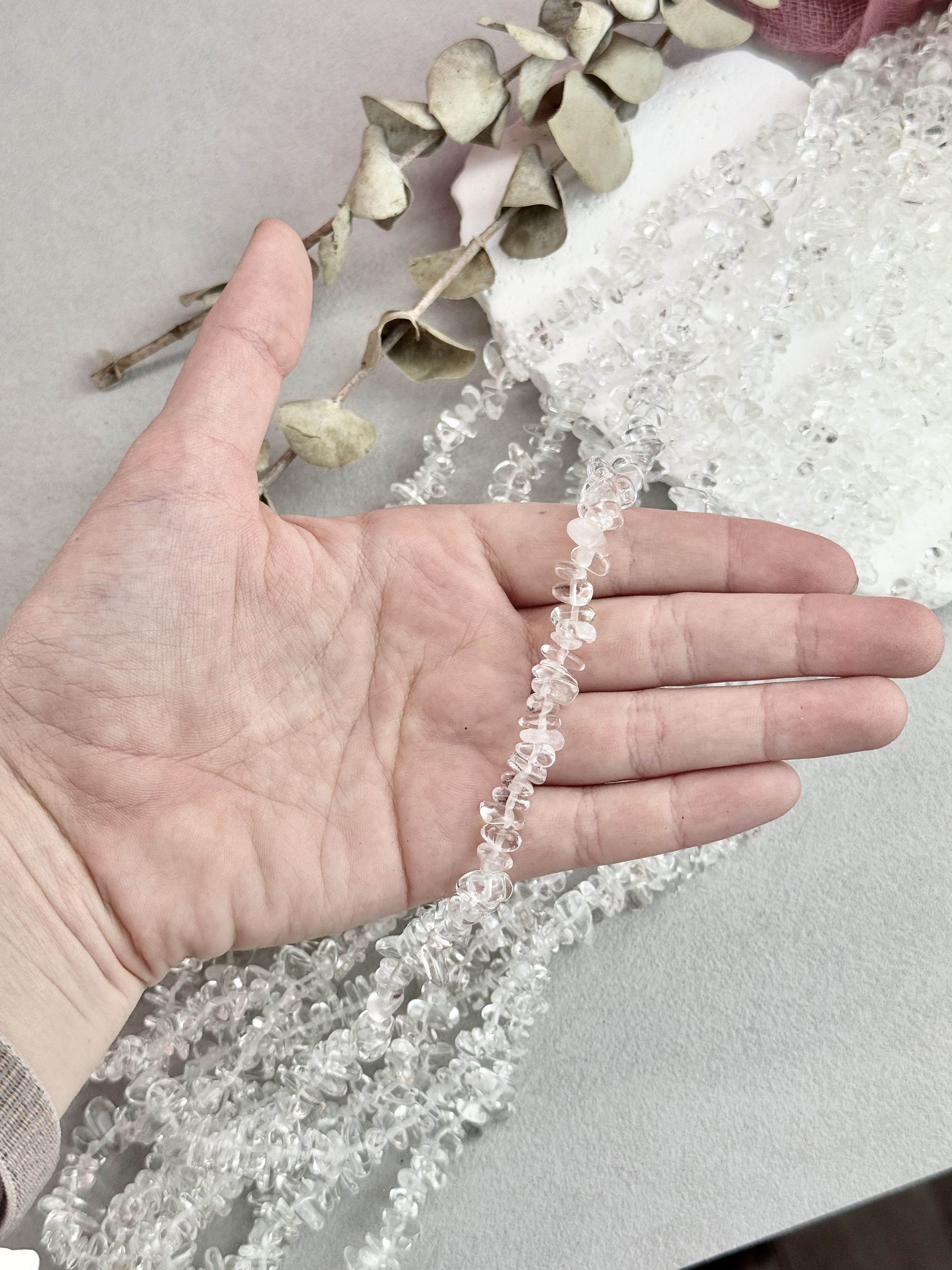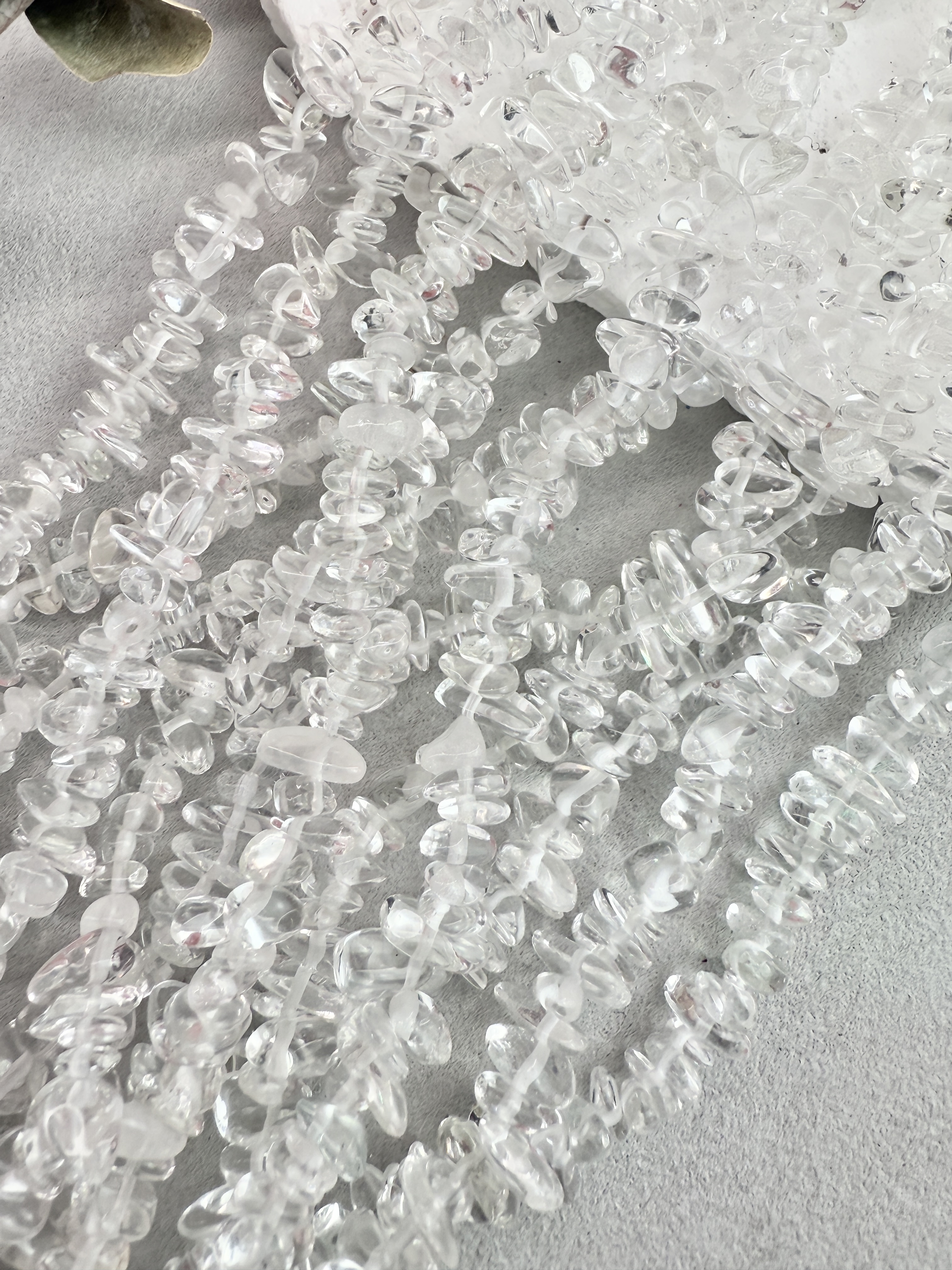 Бусины произвольной формы из чистейшего горного хрусталя. Размер бусин (примерный) 5-8 мм. Продается россыпью или на нити длиной 80 см (нить иногда рвется и мы меняем фасовку на россыпь). Форма всех бусин разная, неопределенная (галька).