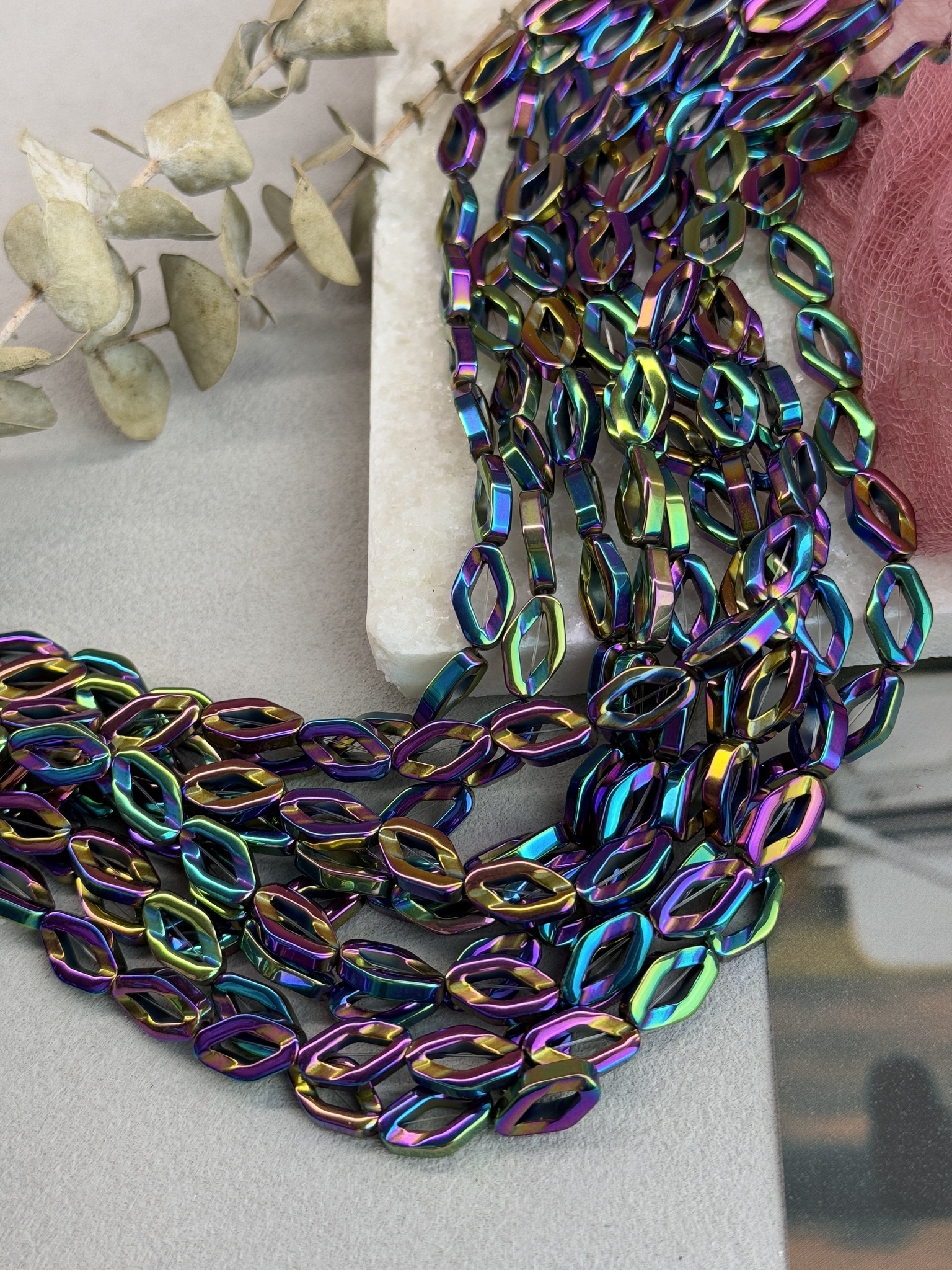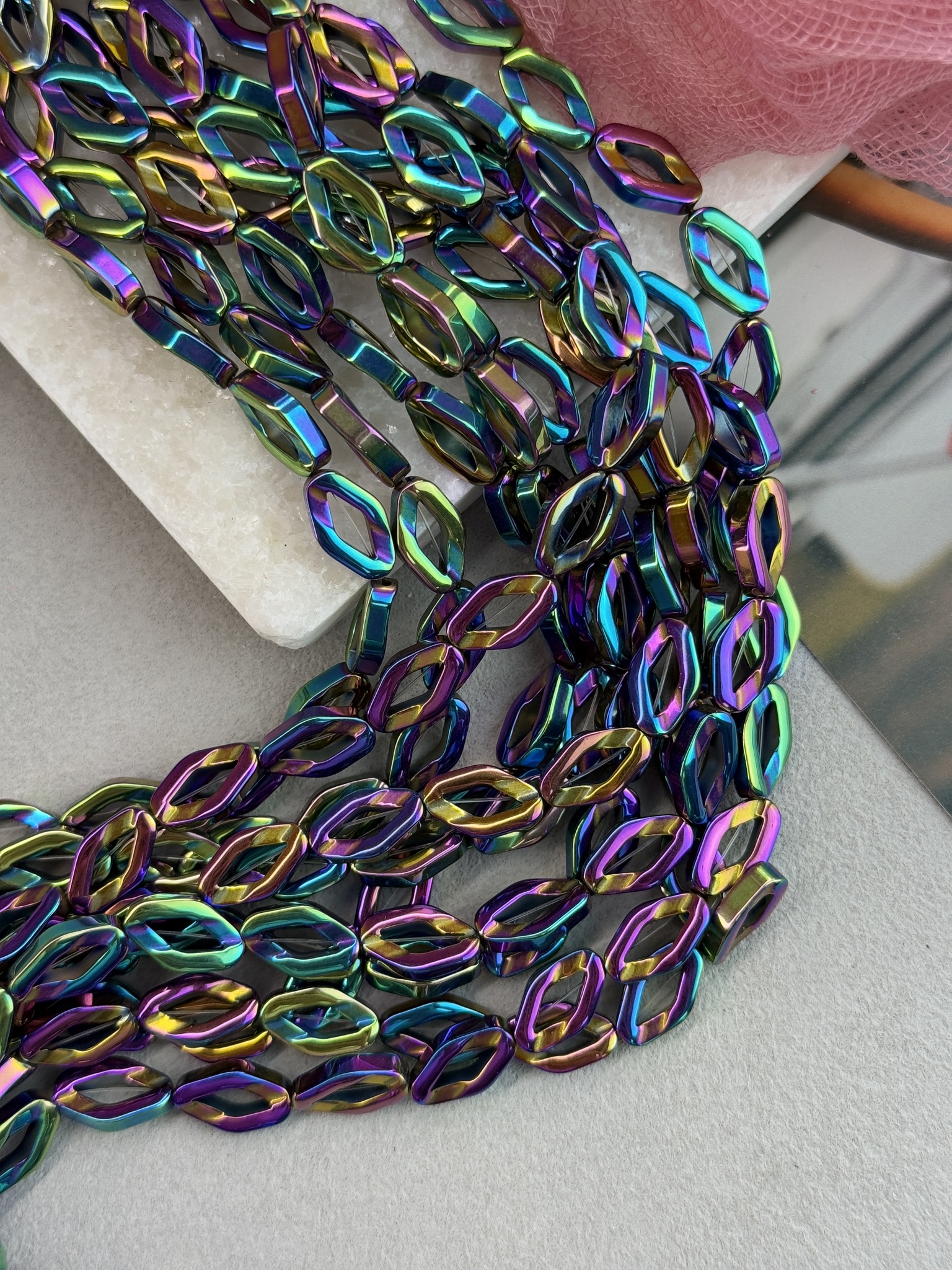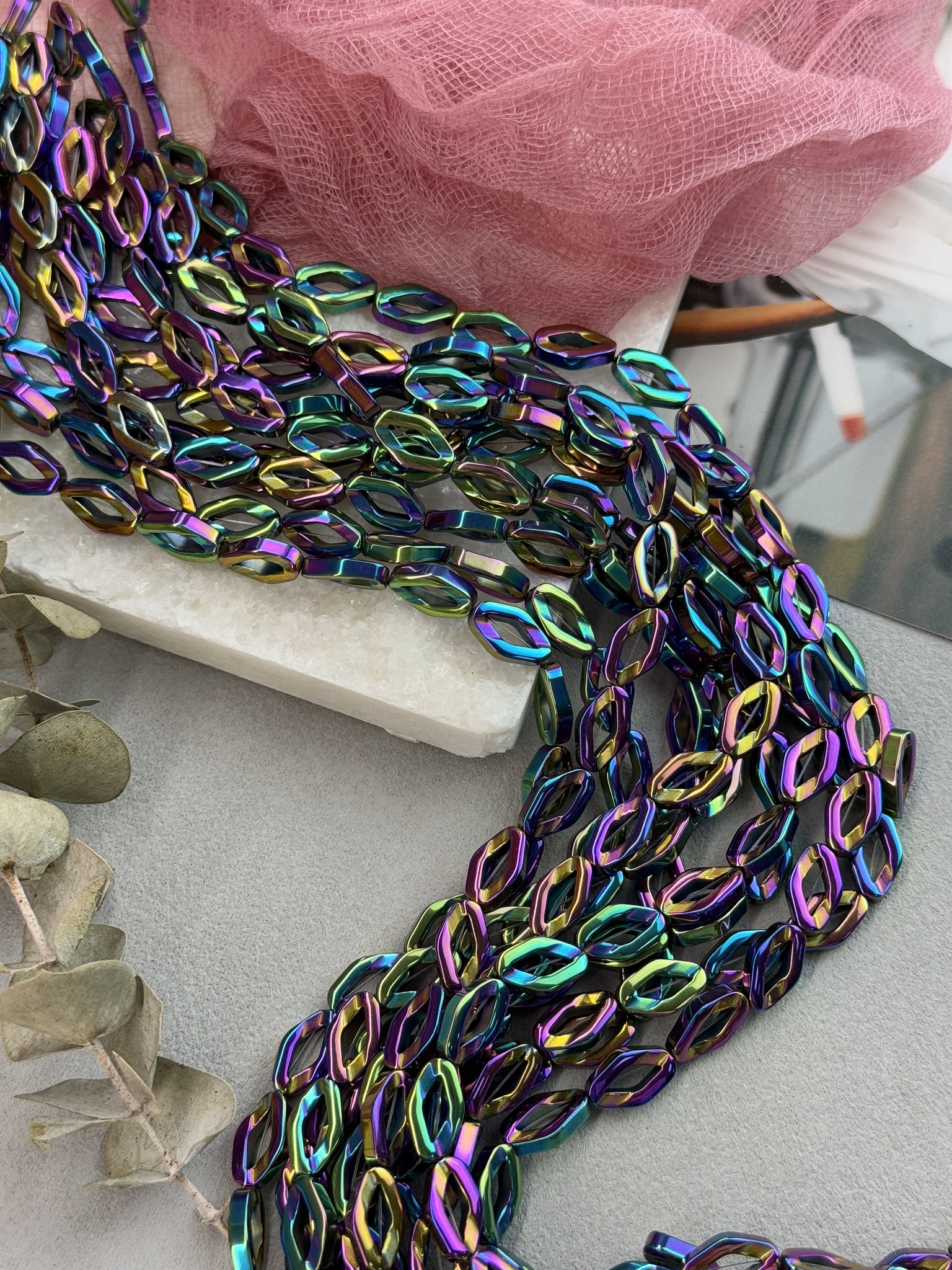 Гематит с гальваническим покрытием радужного цвета в форме витого ромба. Размер одной бусины 14*8 мм, длина нити около 40 см (может отличаться на пару сантиметров в зависимости от разных партий). Гипоаллергенно.