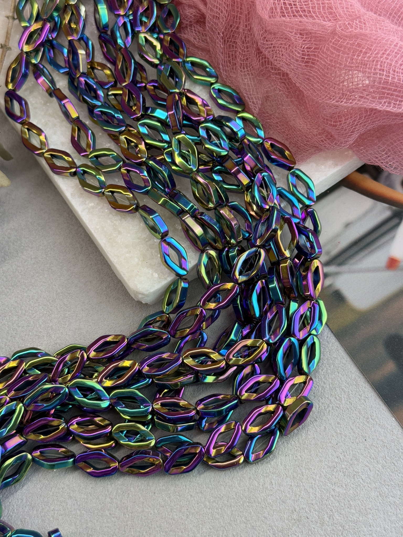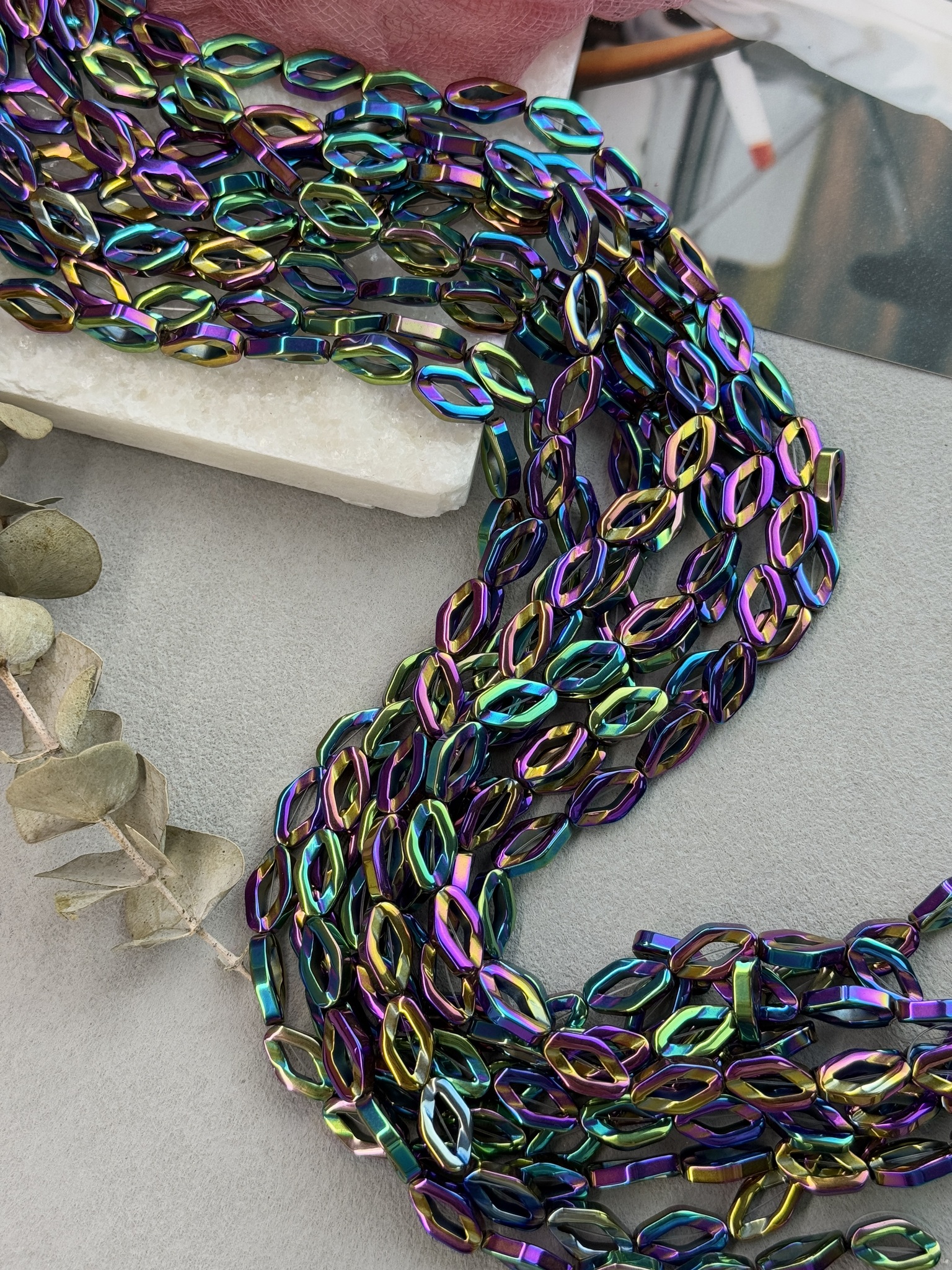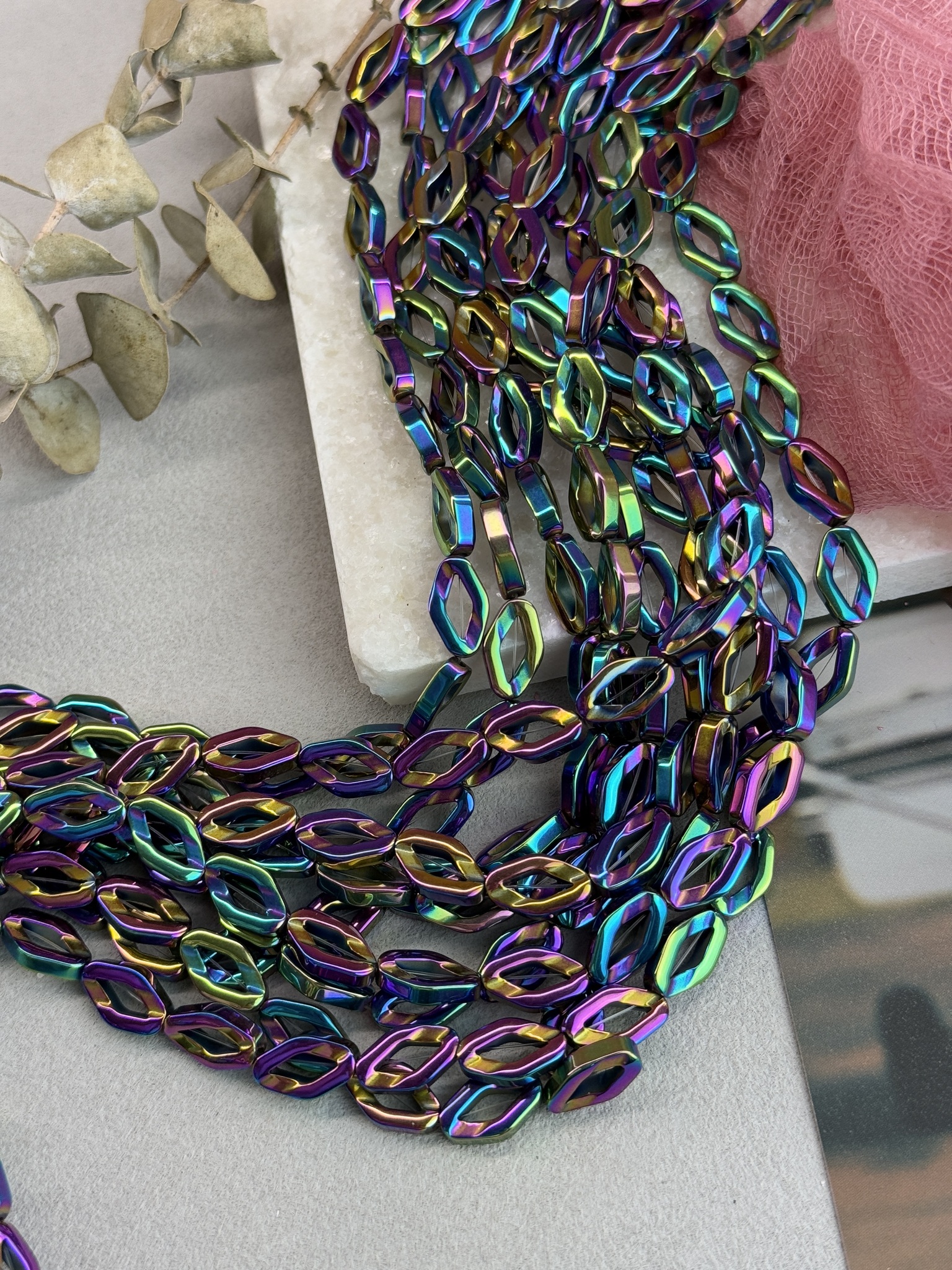 Гематит с гальваническим покрытием радужного цвета в форме витого ромба. Размер одной бусины 14*8 мм, длина нити около 40 см (может отличаться на пару сантиметров в зависимости от разных партий). Гипоаллергенно.