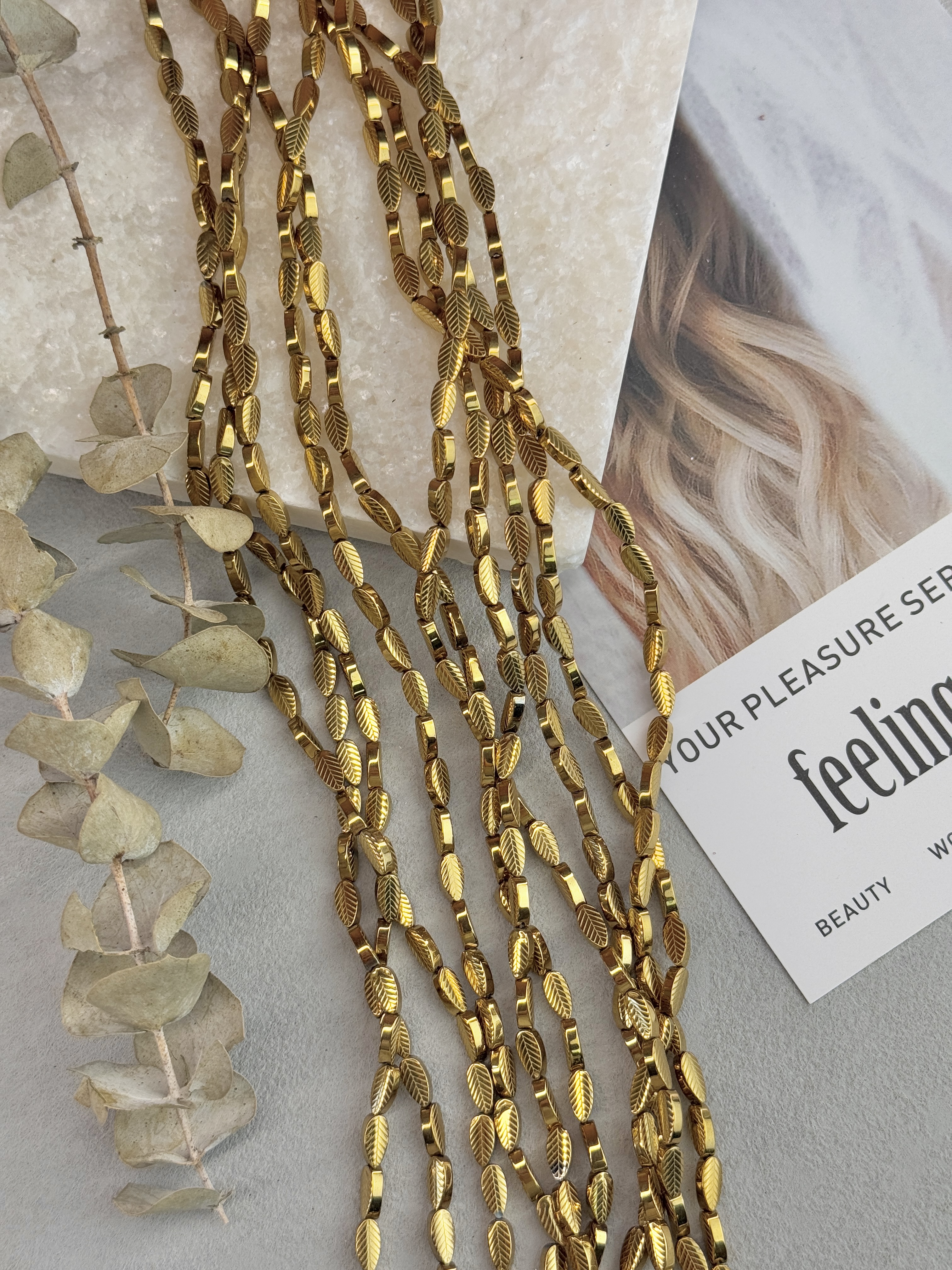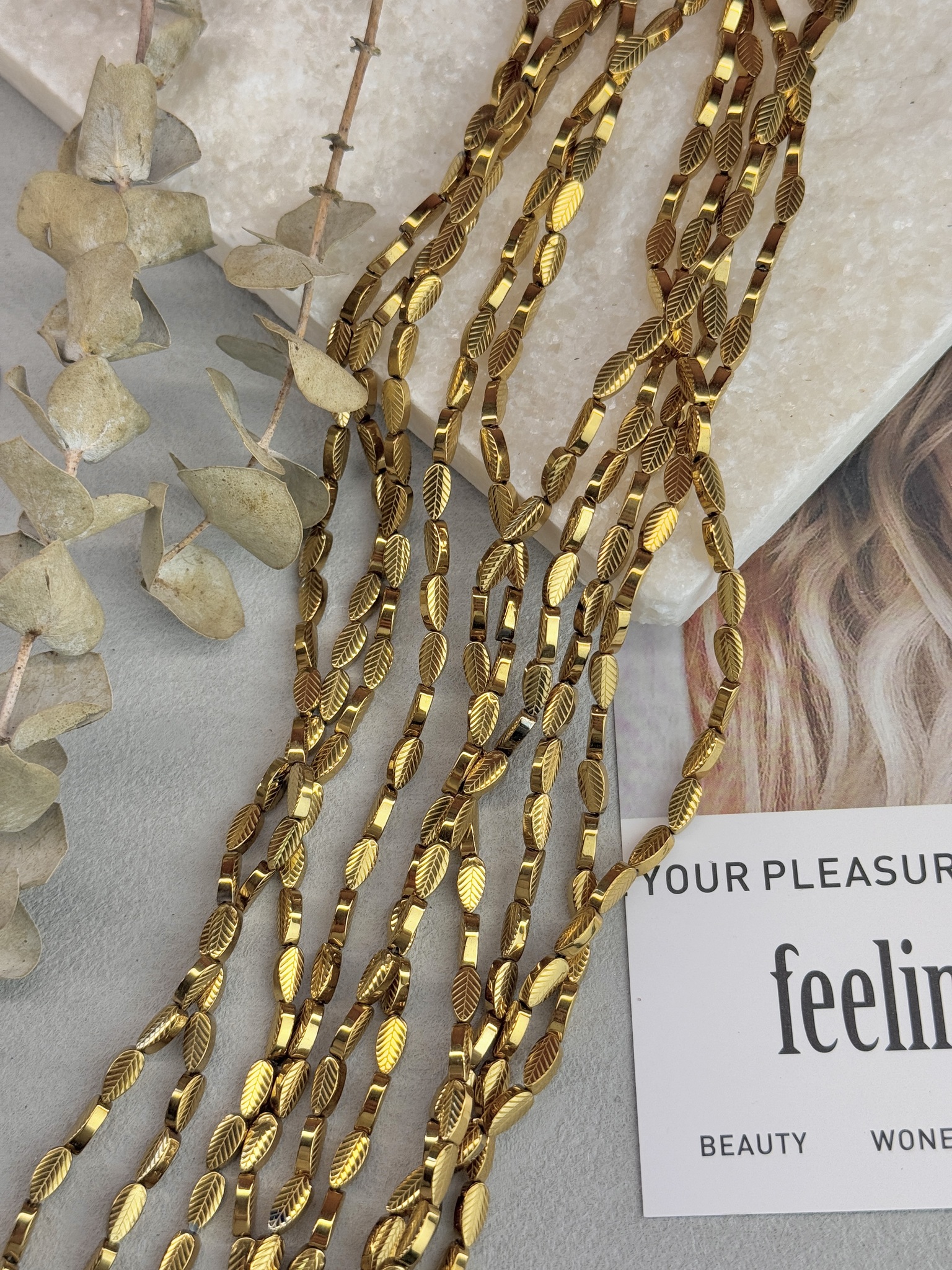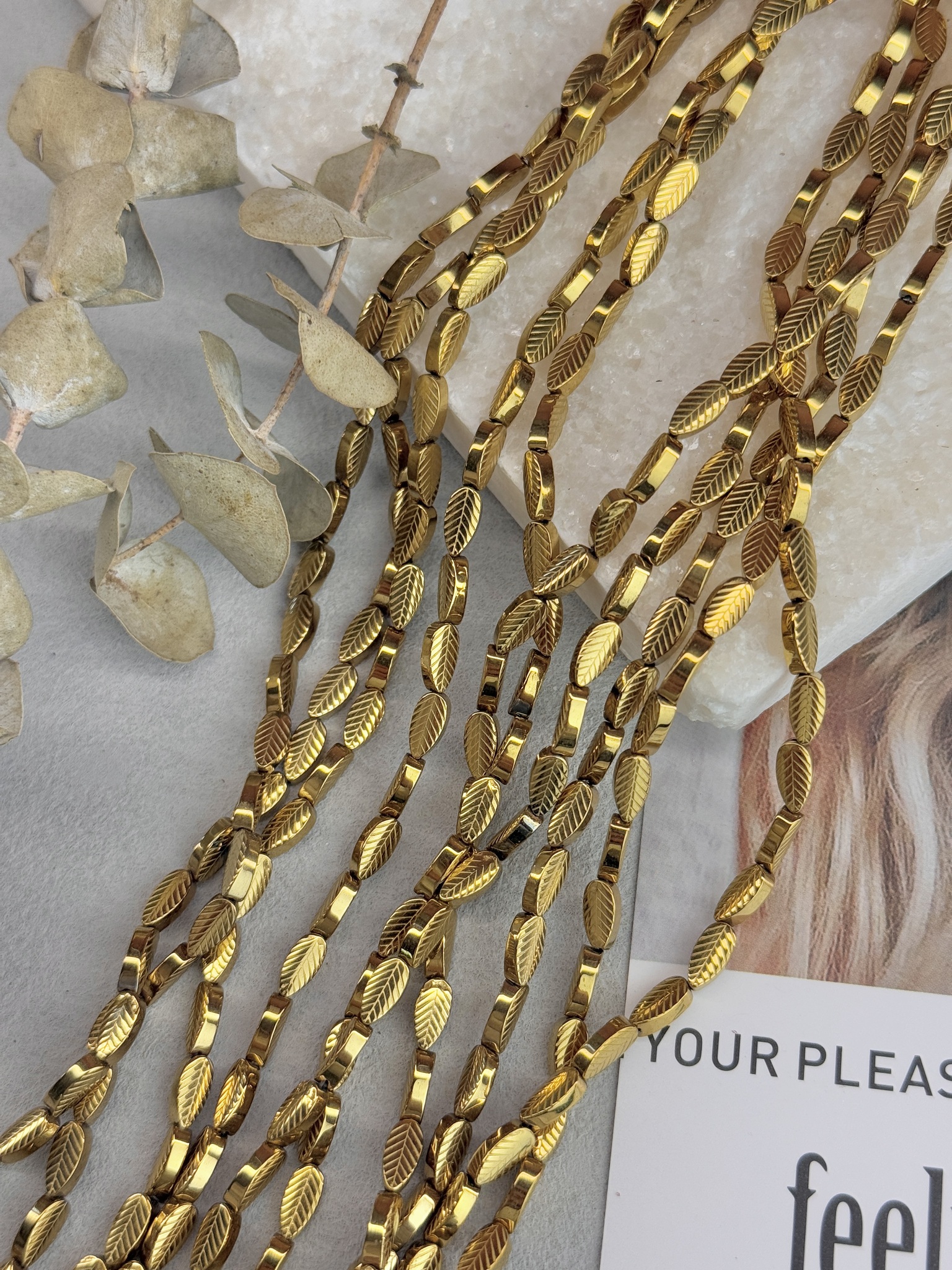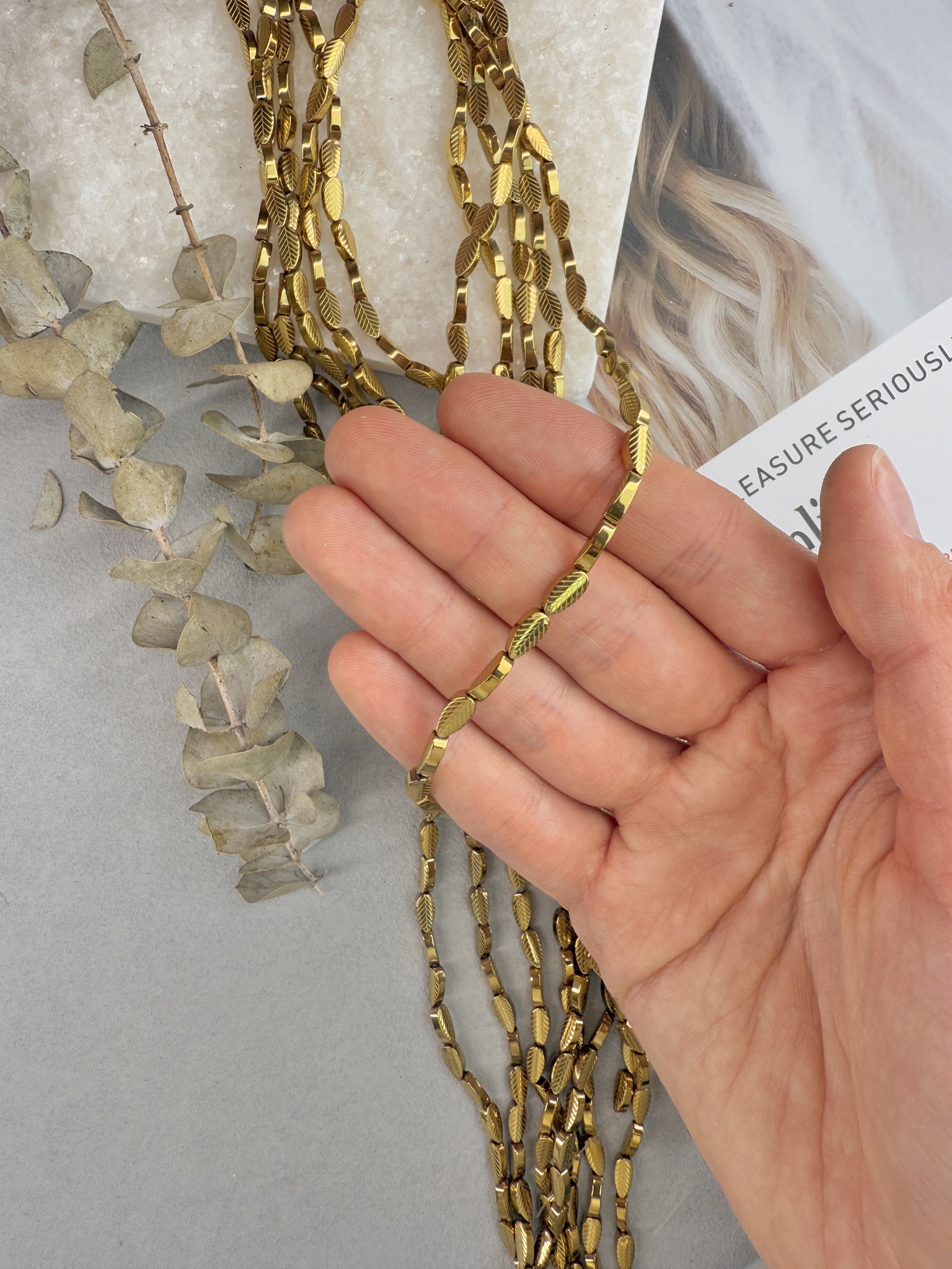 Гематит с гальваническим покрытием золотого цвета в форме листика. Размер одной бусины 6*4 мм, длина нити около 40 см (может отличаться на пару сантиметров в зависимости от разных партий). Гипоаллергенно.