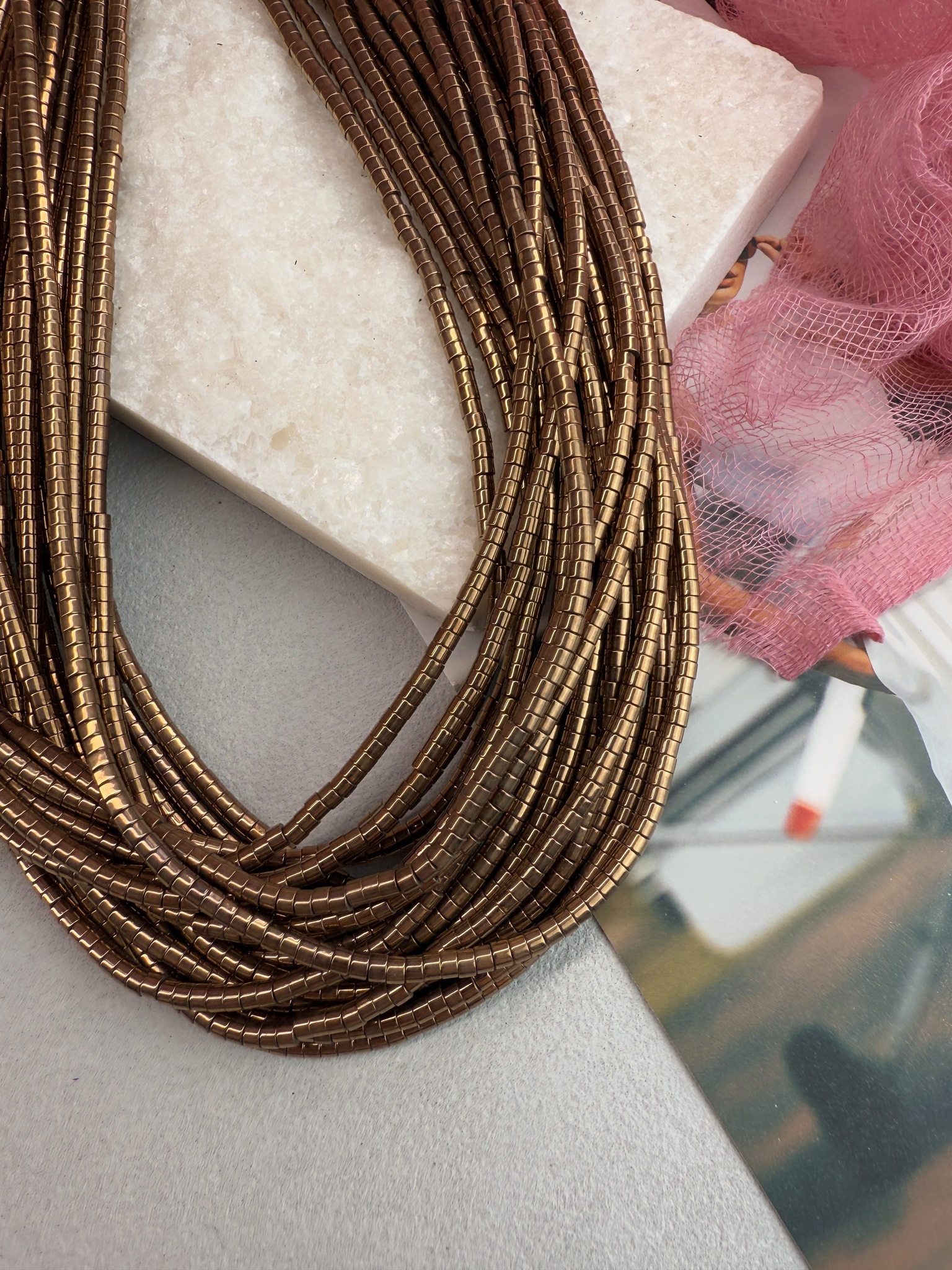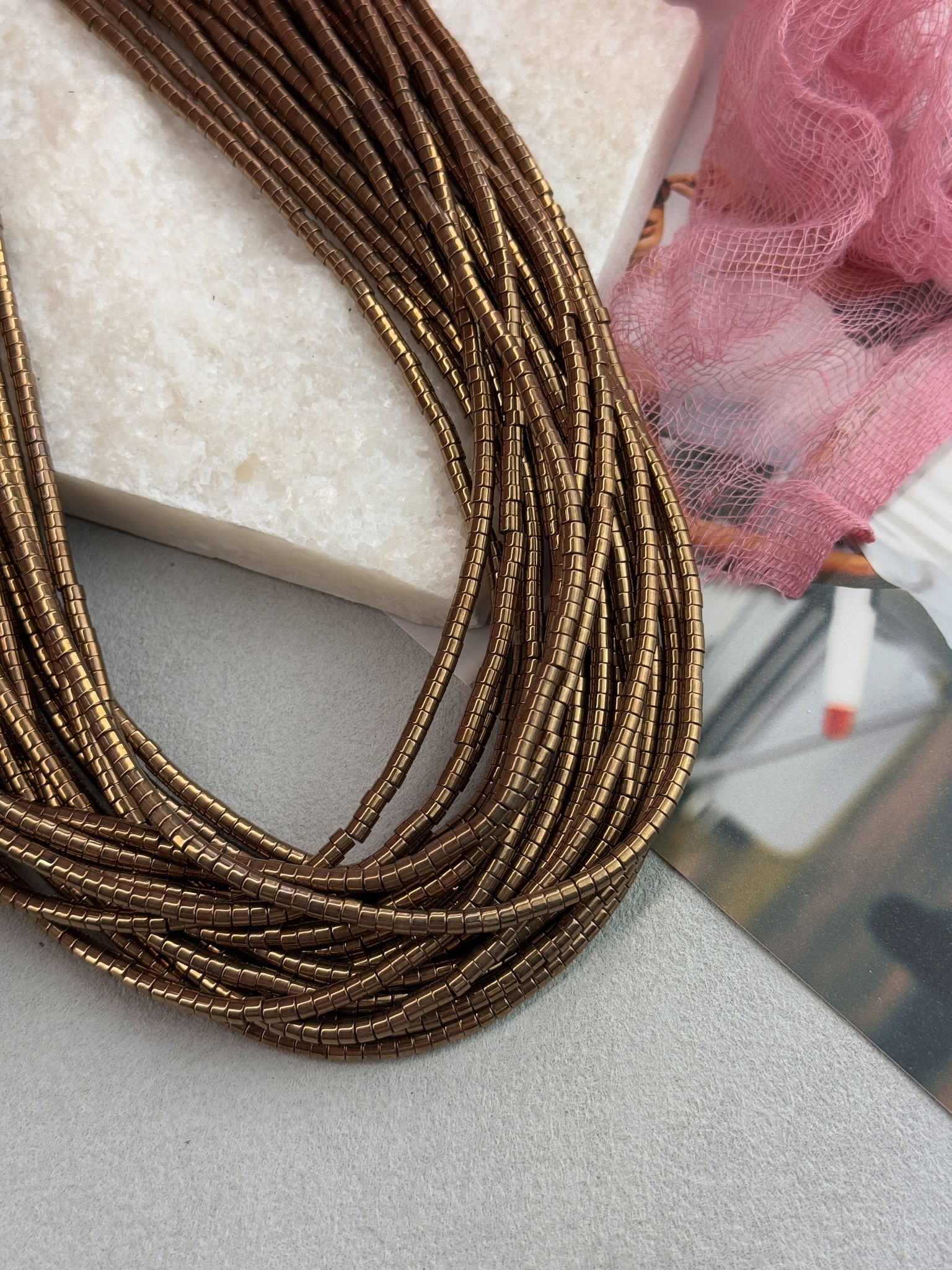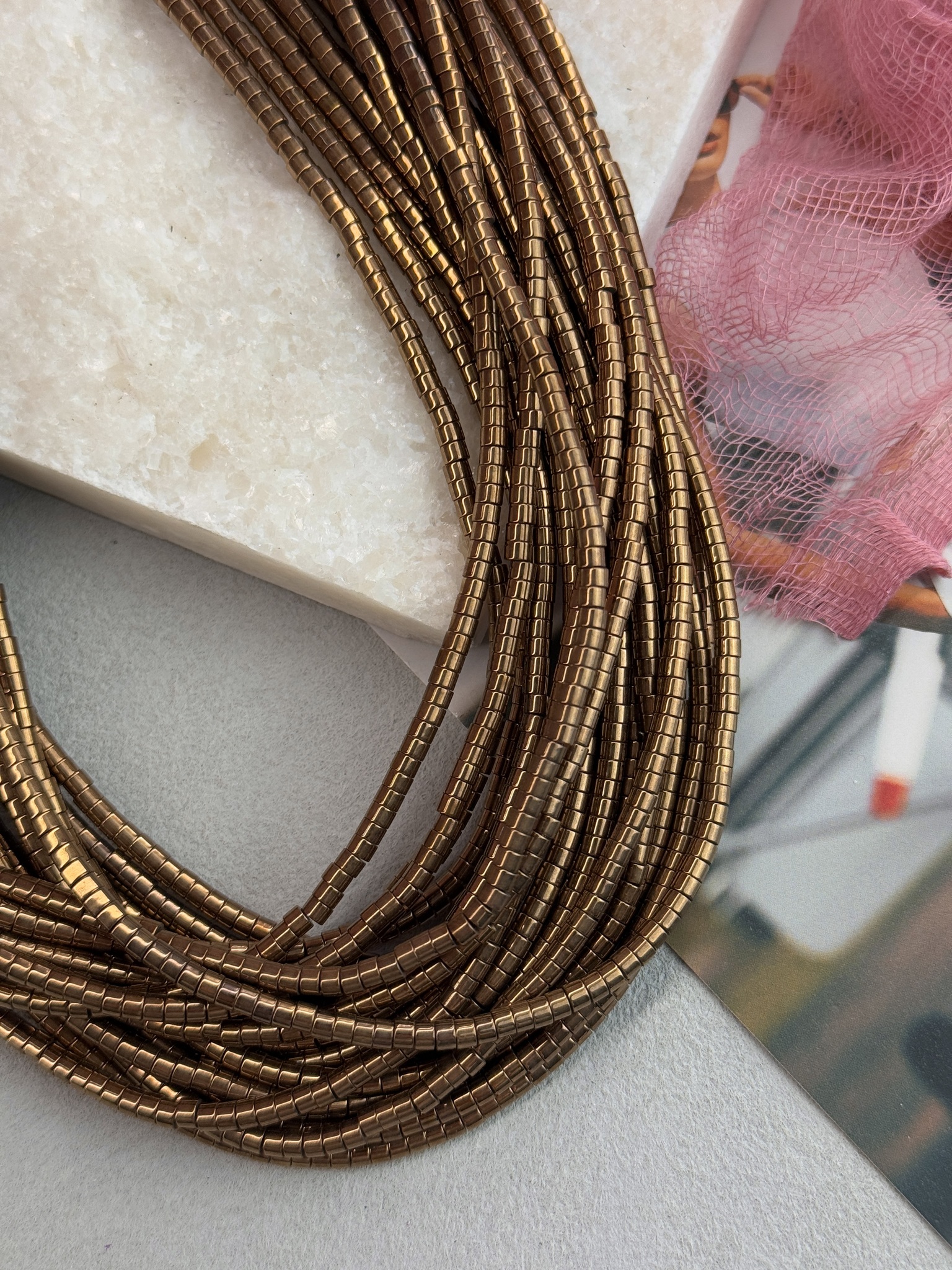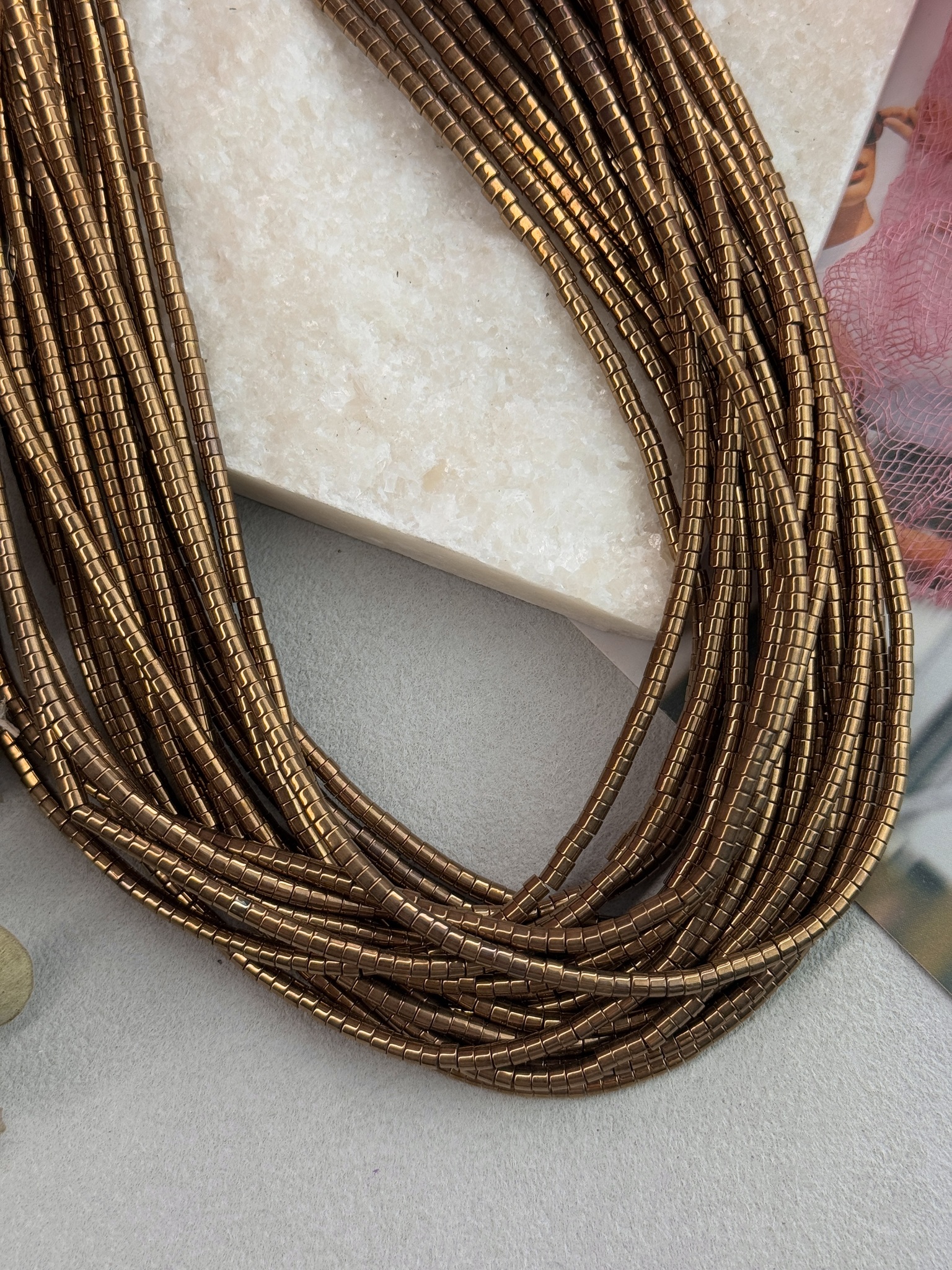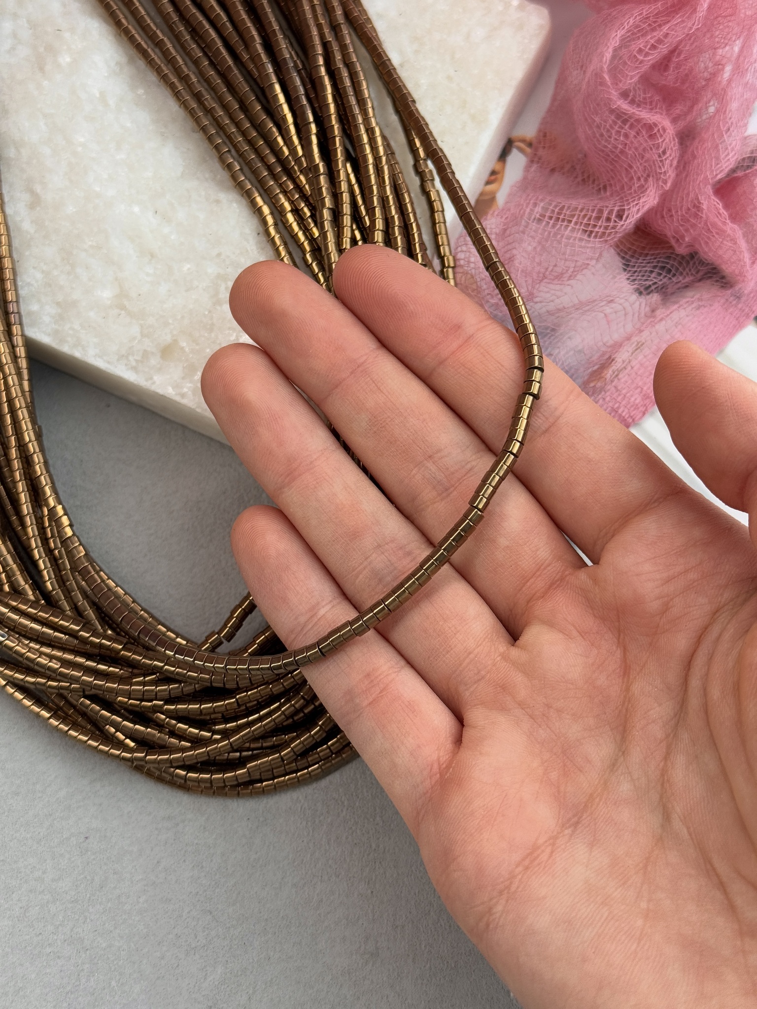 Гематит с гальваническим покрытием золотого цвета в форме диска. Размер одной бусины 3*2 мм, длина нити около 40 см (может отличаться на пару сантиметров в зависимости от разных партий). Гипоаллергенно.