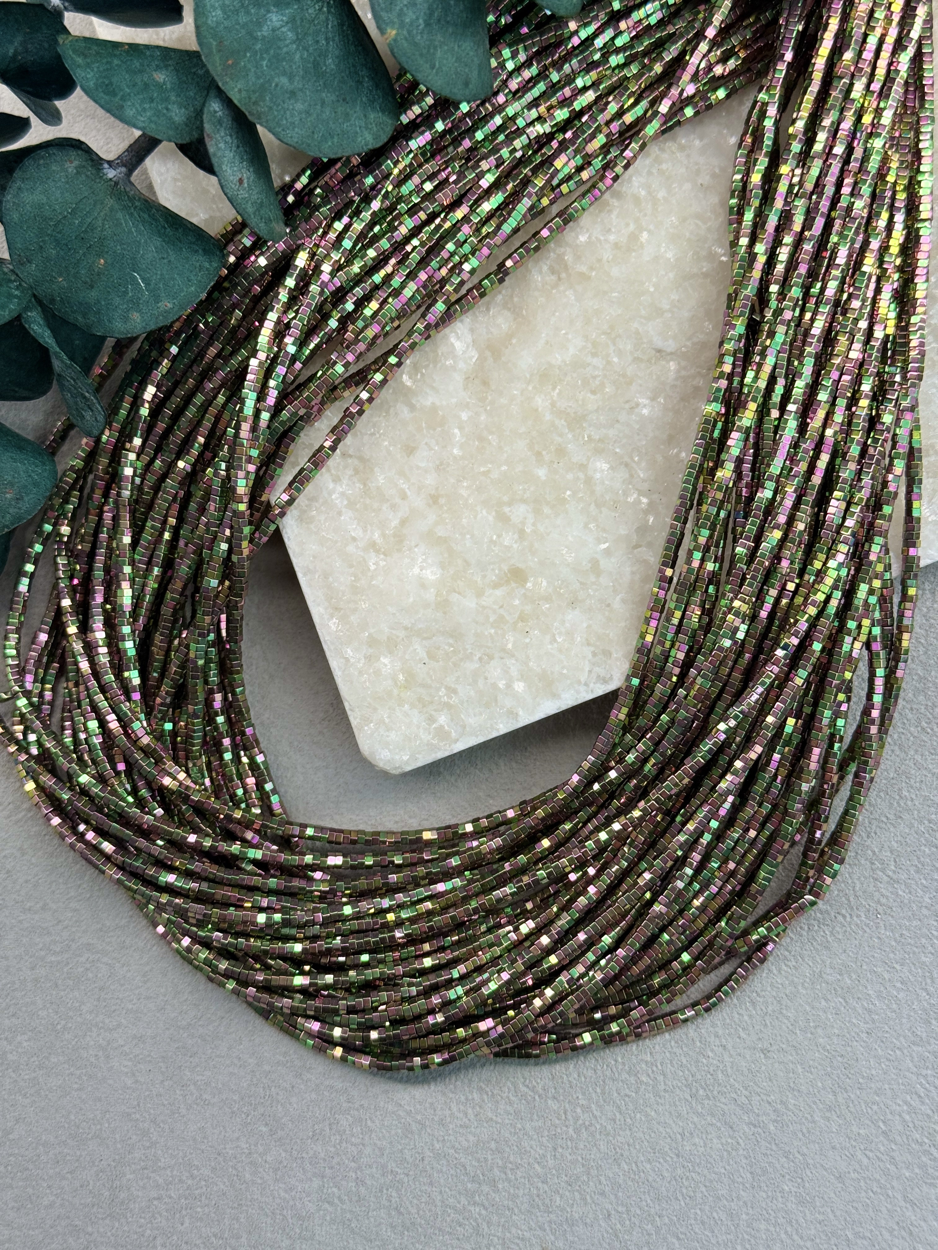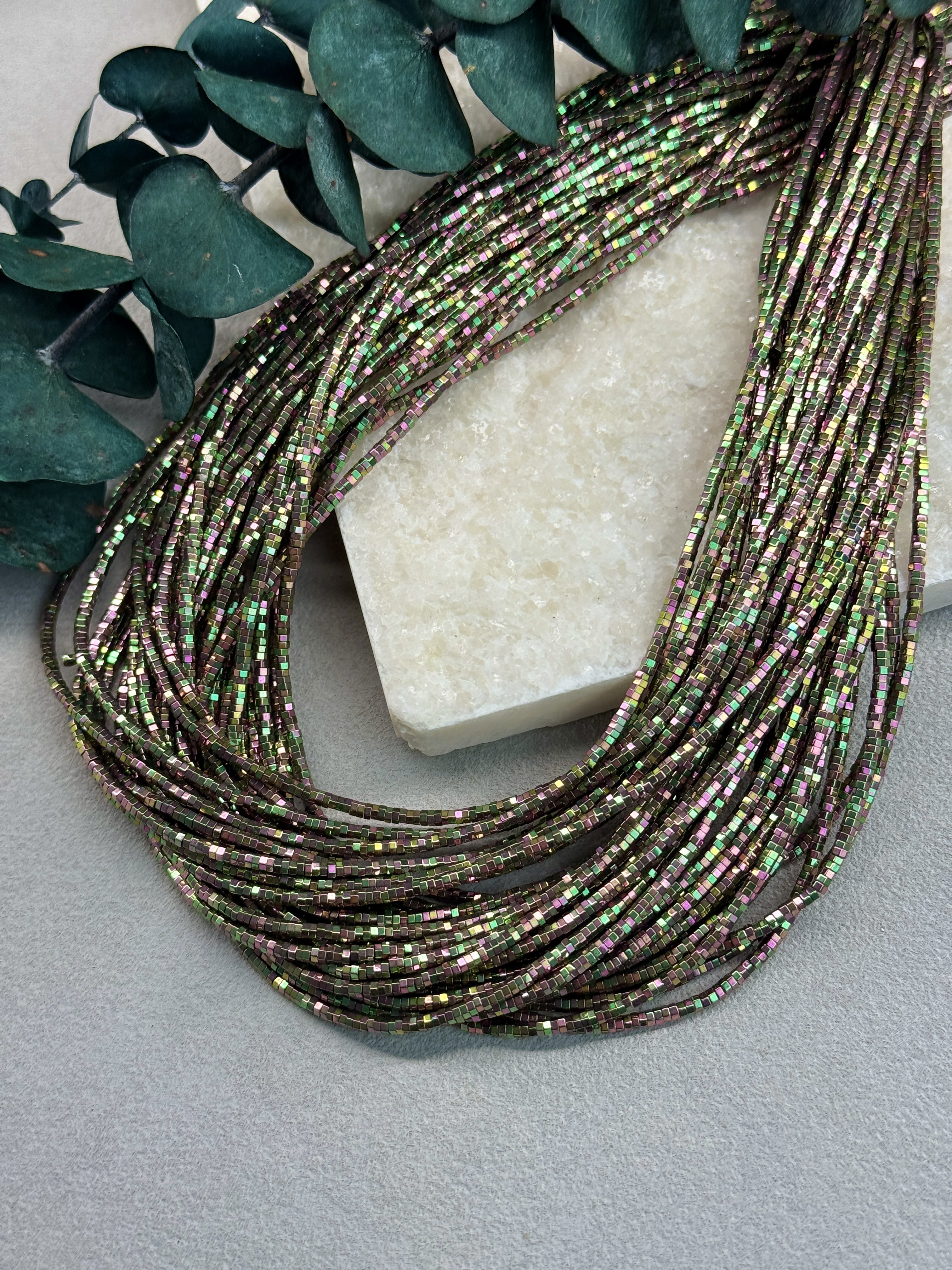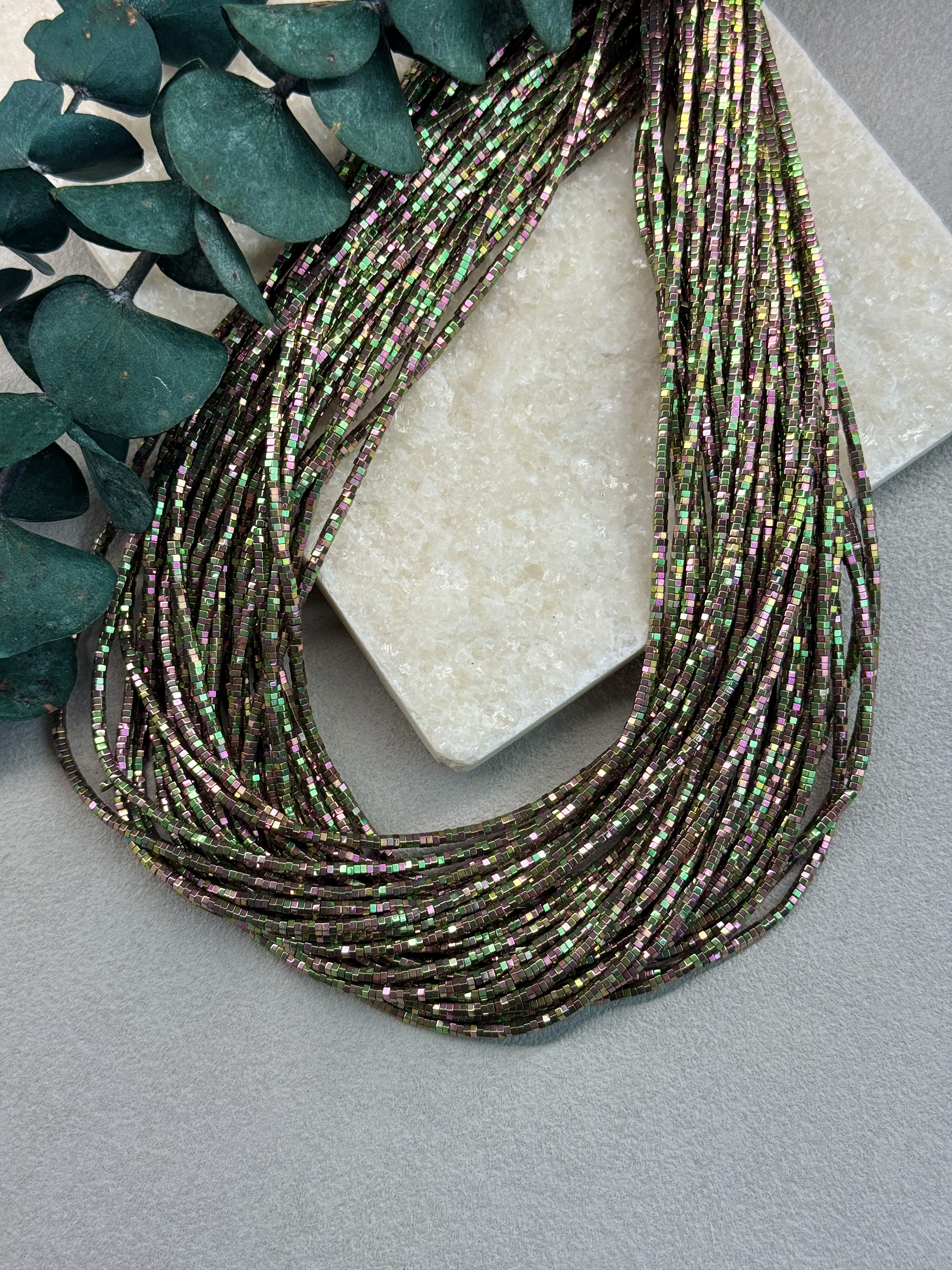 Гематит с гальваническим покрытием лилового и зеленого цветов в форме шестигранника. Размер одной бусины 2*1 мм, длина нити около 40 см (может отличаться на пару сантиметров в зависимости от разных партий). Гипоаллергенно.