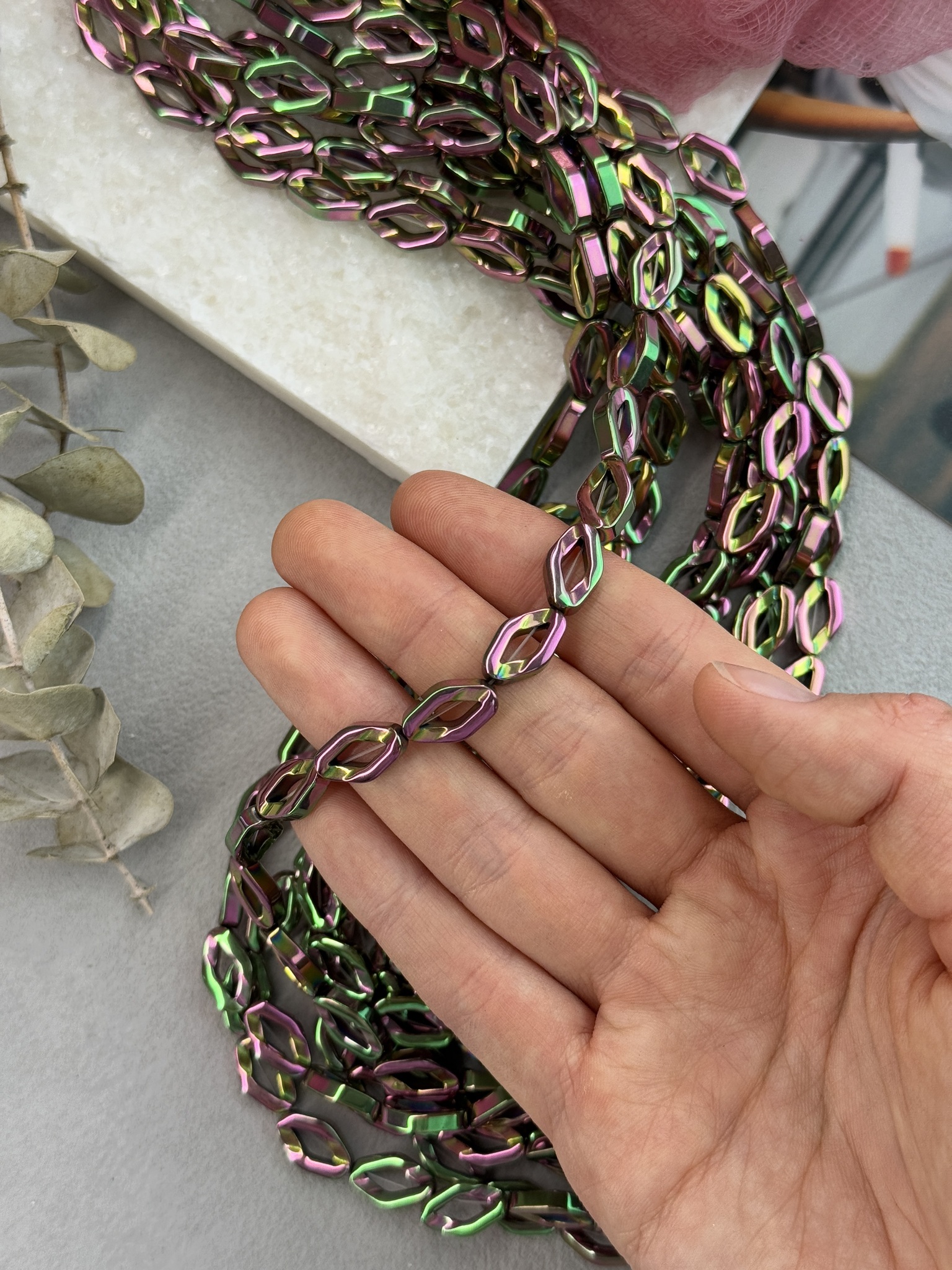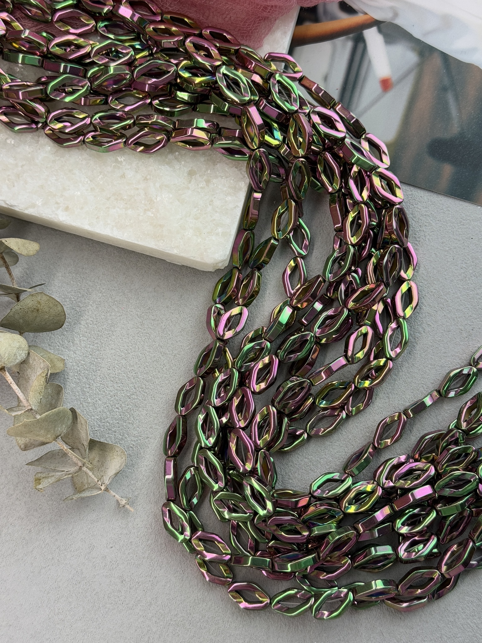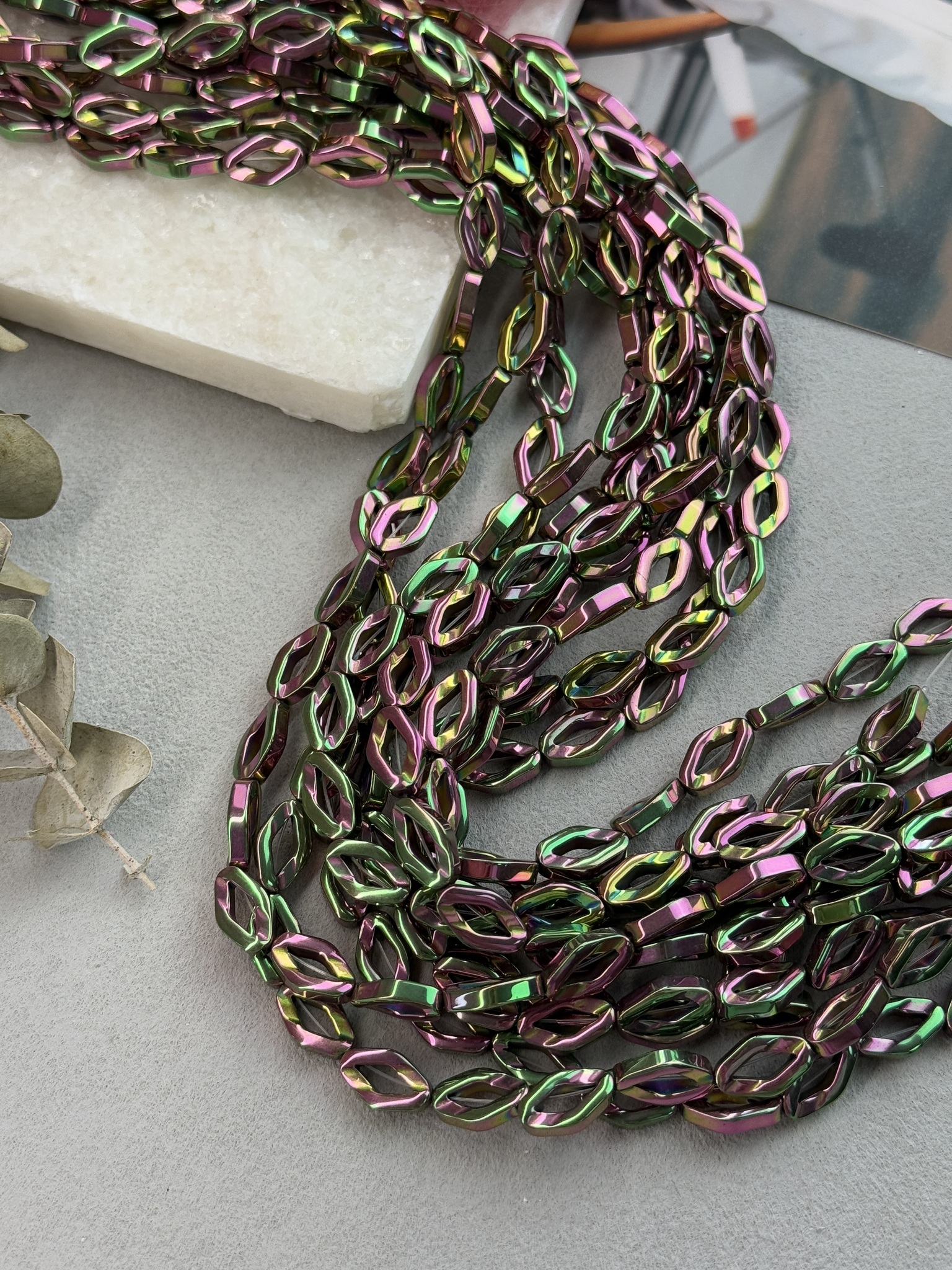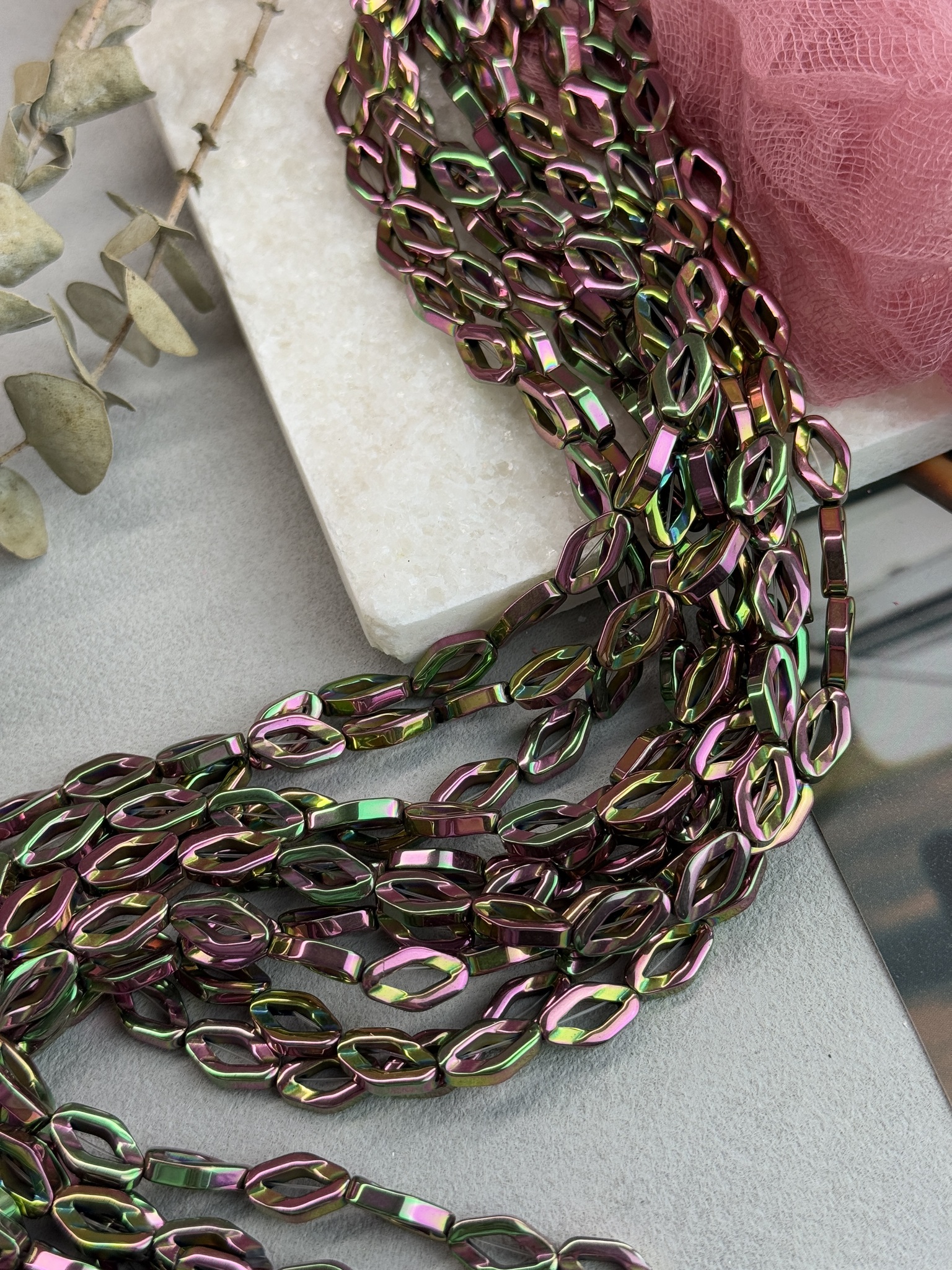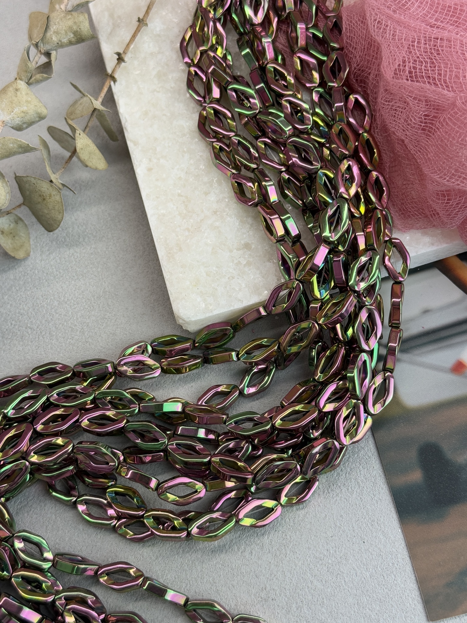 Гематит с гальваническим покрытием радужного цвета в форме витого ромба. Размер одной бусины 14*8 мм, длина нити около 40 см (может отличаться на пару сантиметров в зависимости от разных партий). Гипоаллергенно.