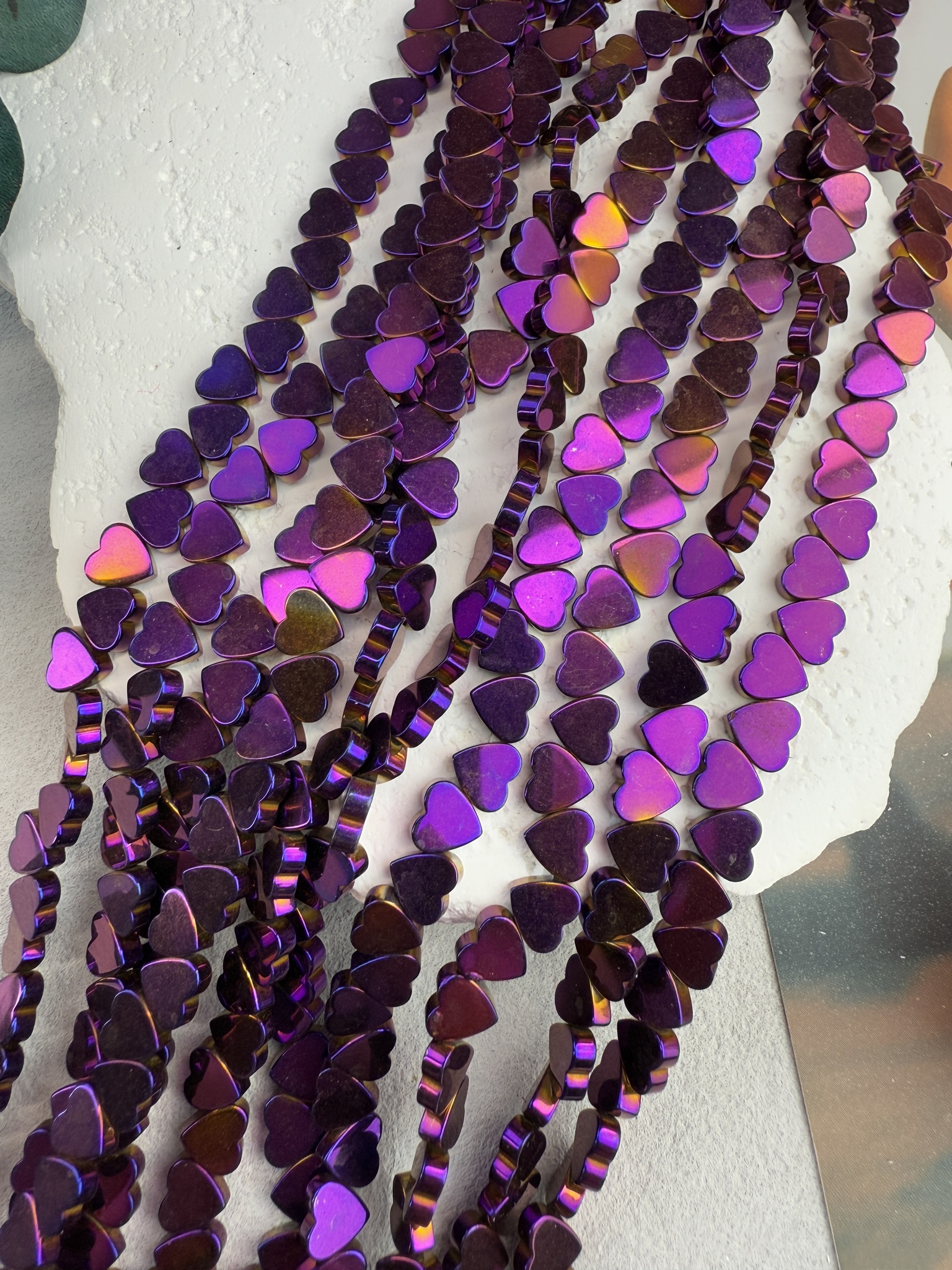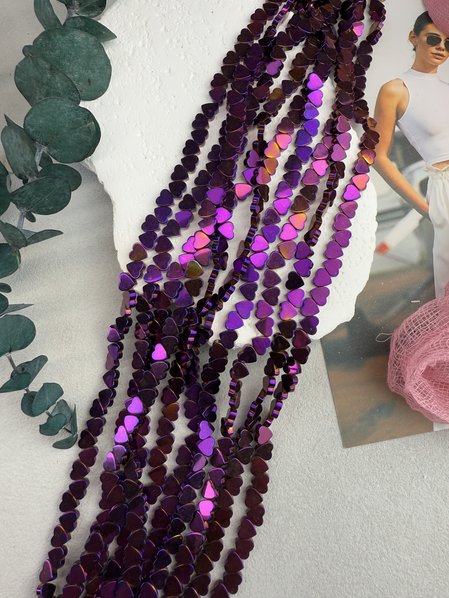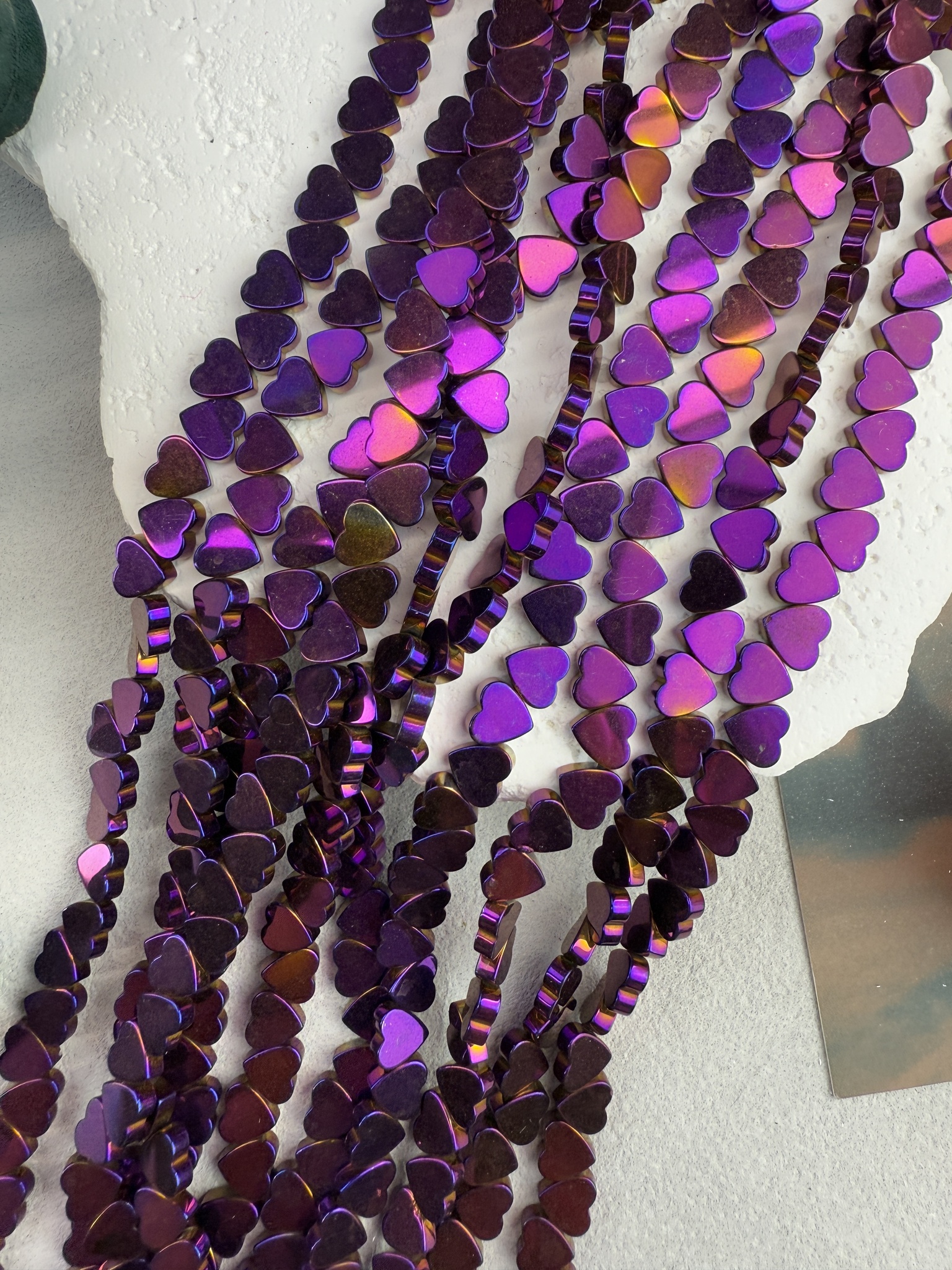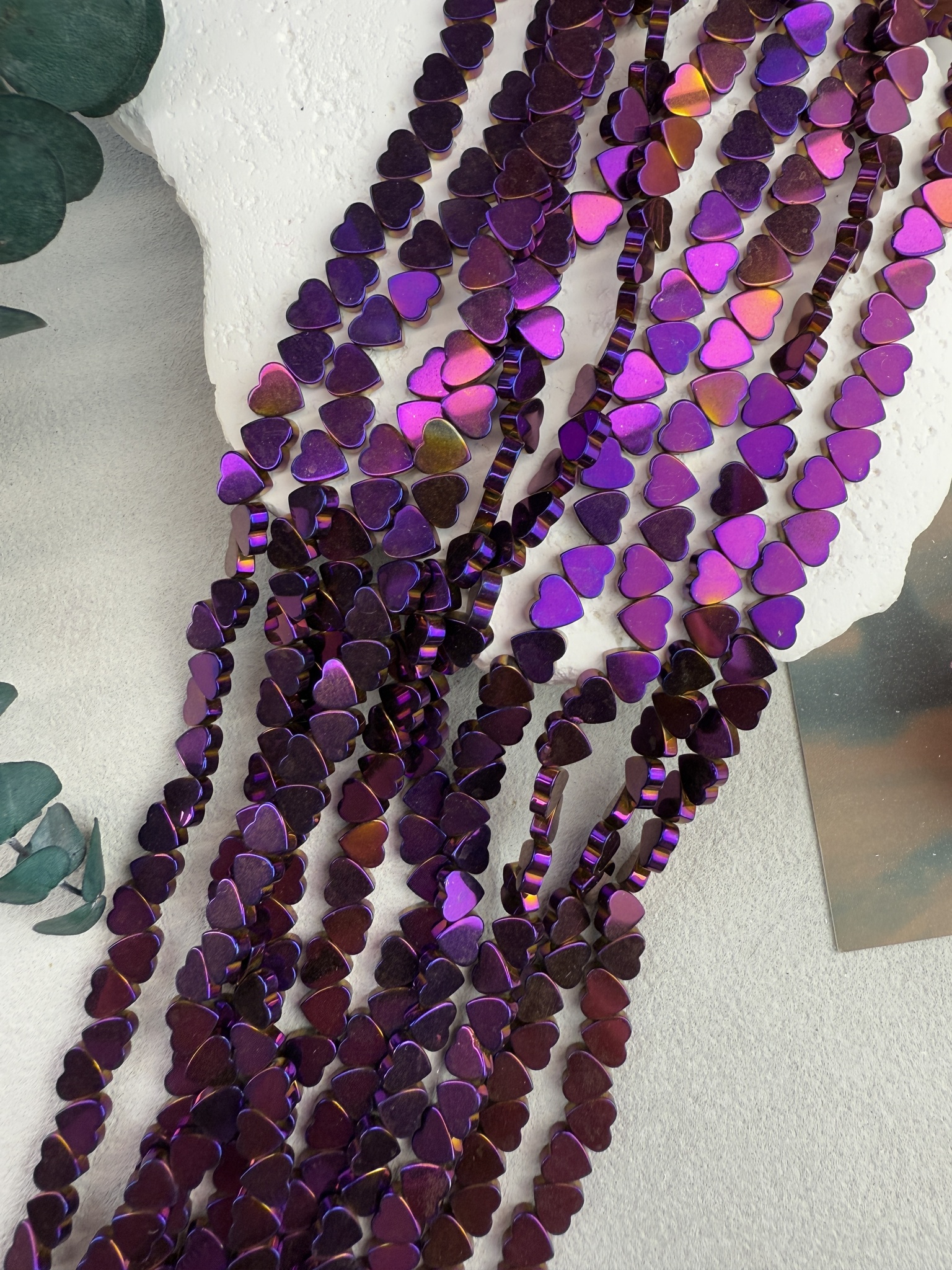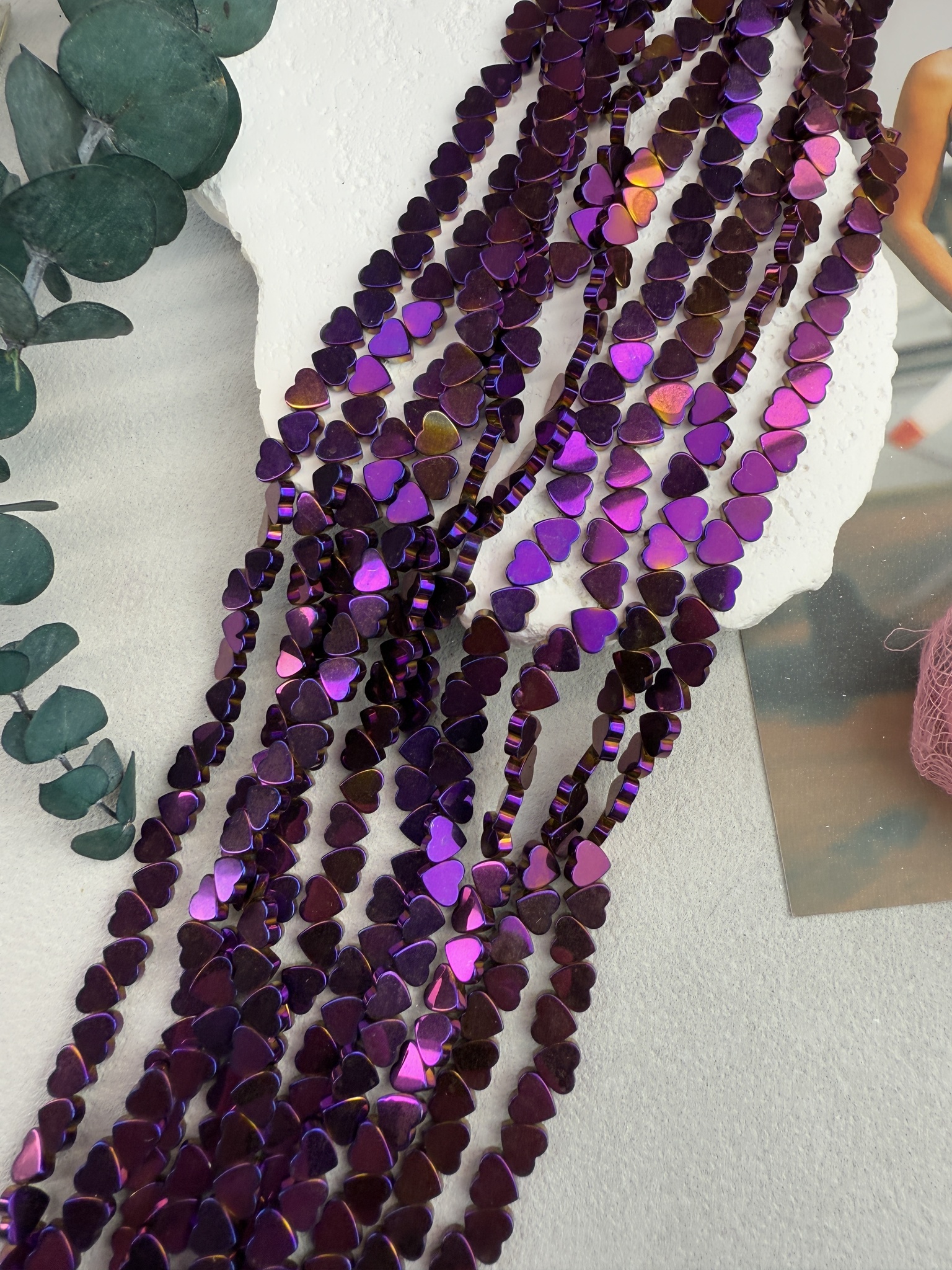 Гематит в форме сердца, размер одной бусины 6 мм, длина нити около 40 см (может отличаться на пару сантиметров в зависимости от разных партий). Гипоаллергенно. На поверхности могут быть незначительные микроцарапины не портящие вид изделия. Не является браком.