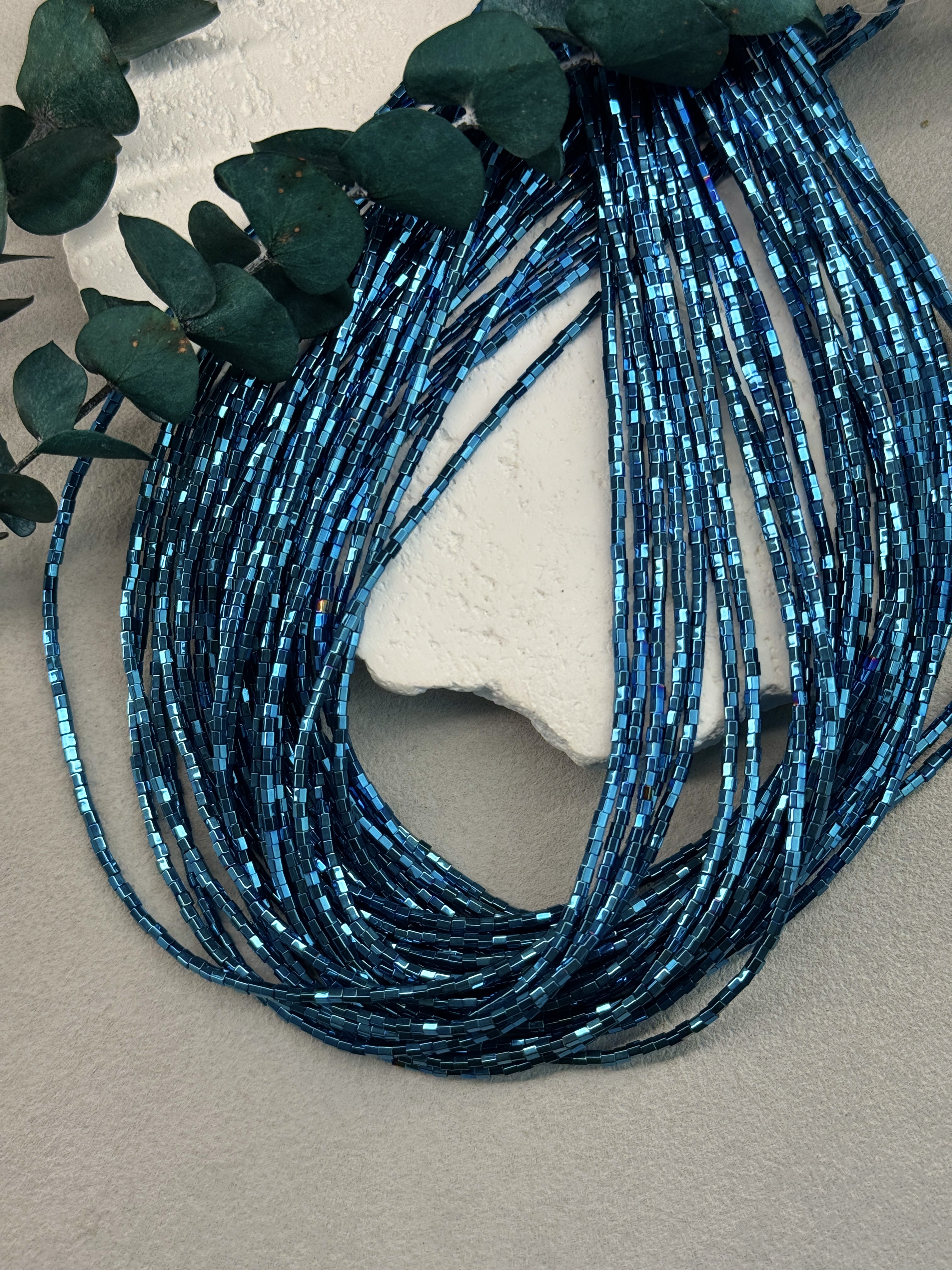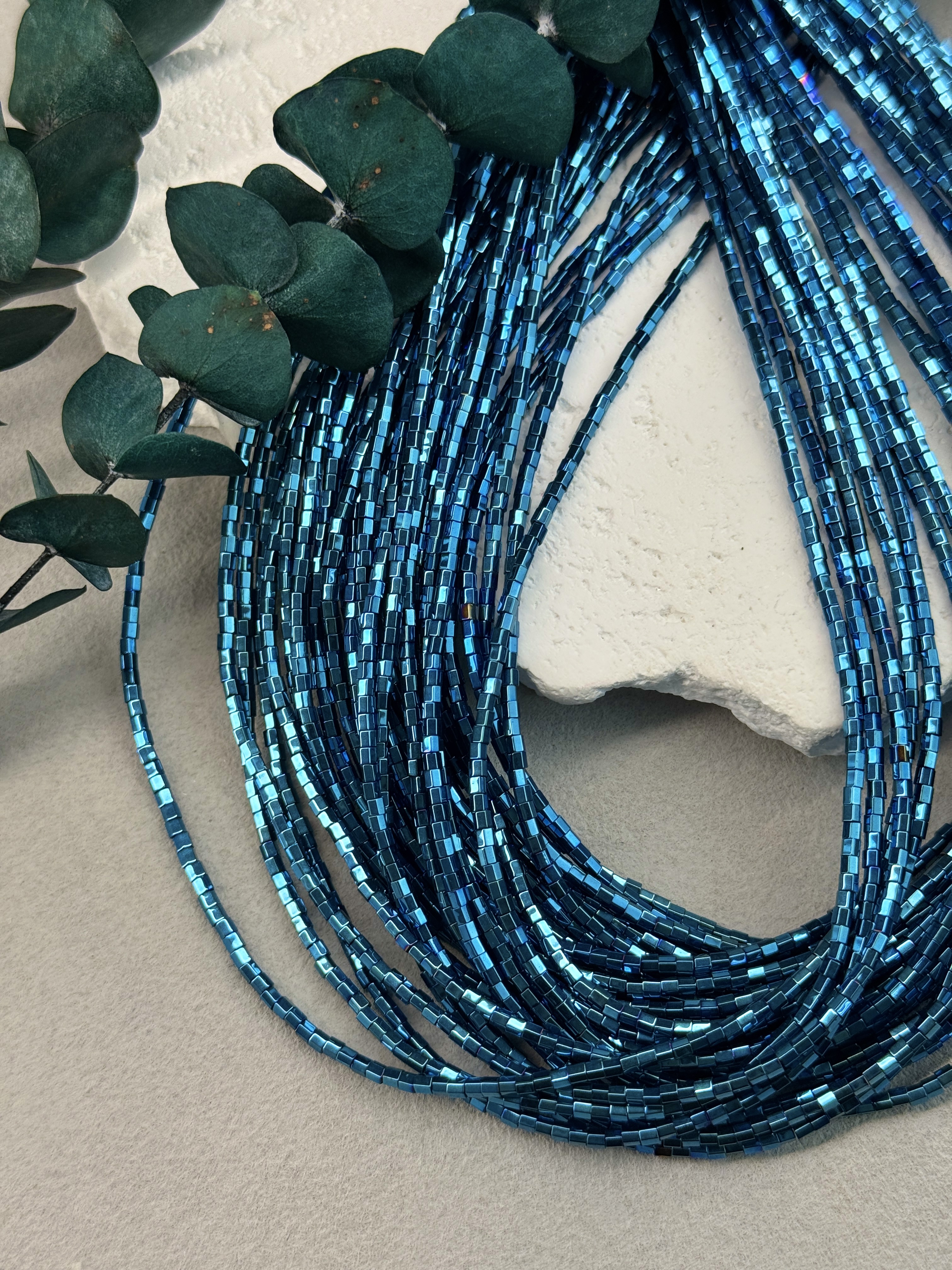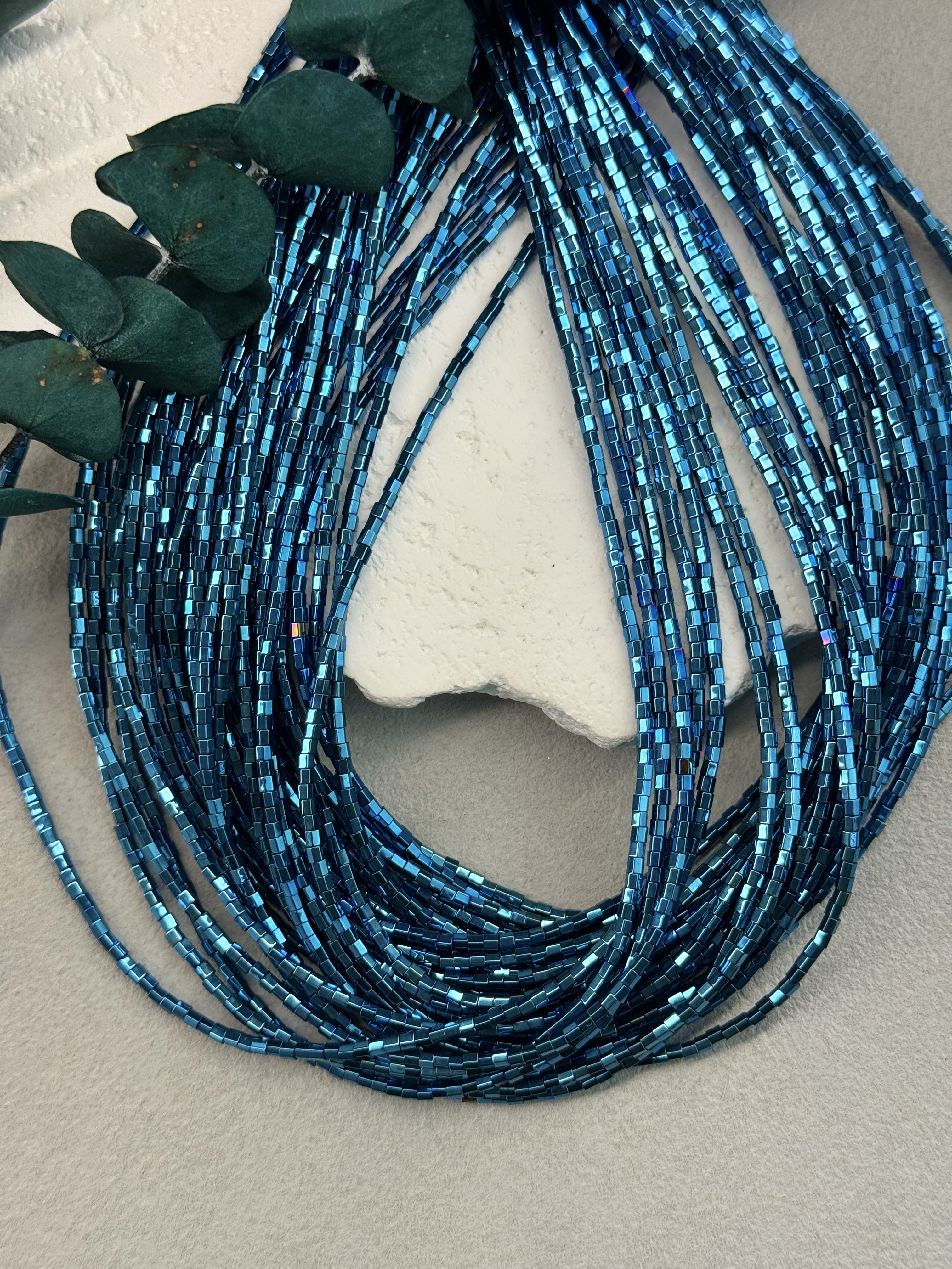 Гематит с гальваническим покрытием синего цвета в форме шестигранника. Размер одной бусины 2 мм, длина нити около 40 см (может отличаться на пару сантиметров в зависимости от разных партий). Гипоаллергенно.
