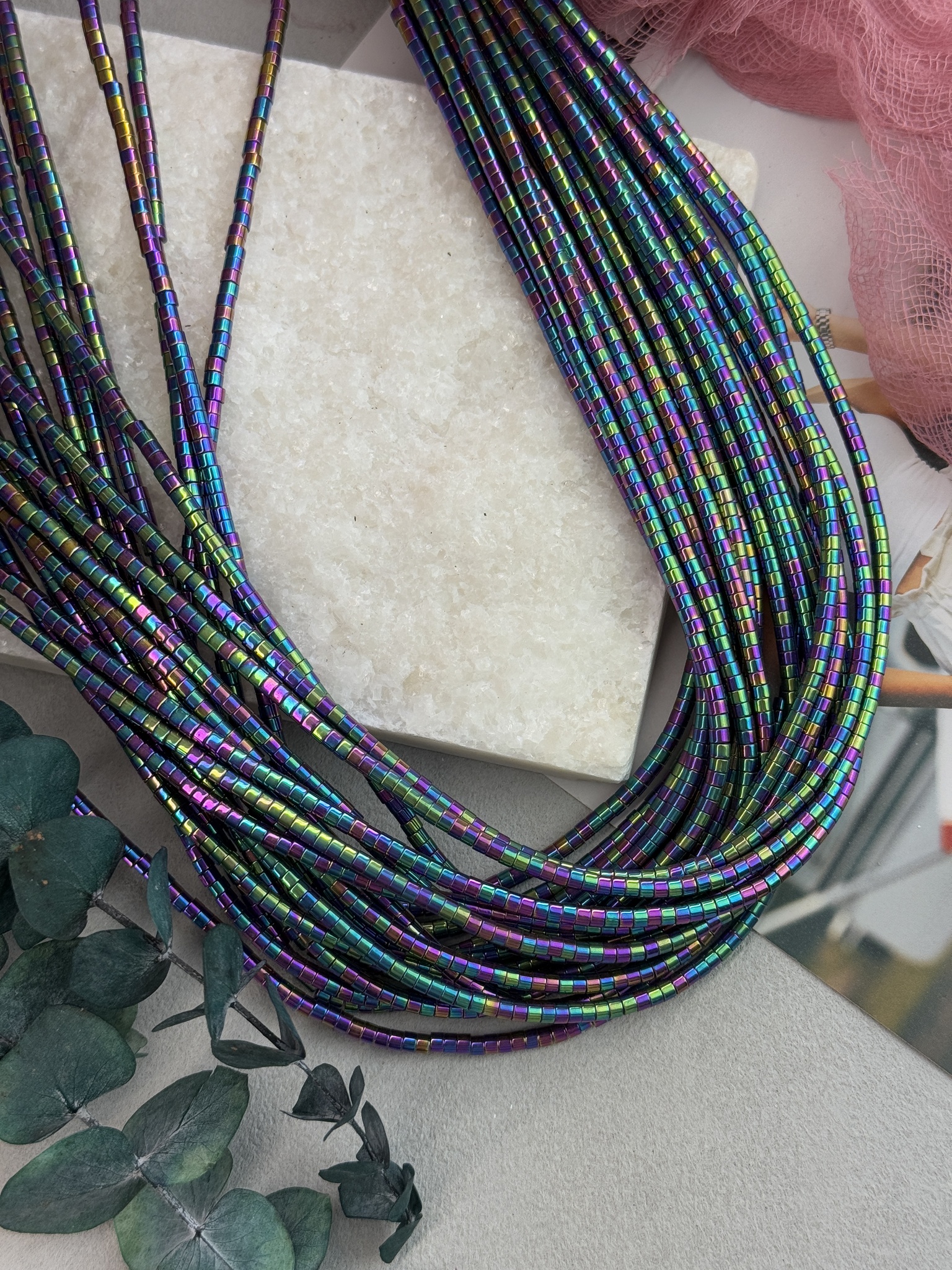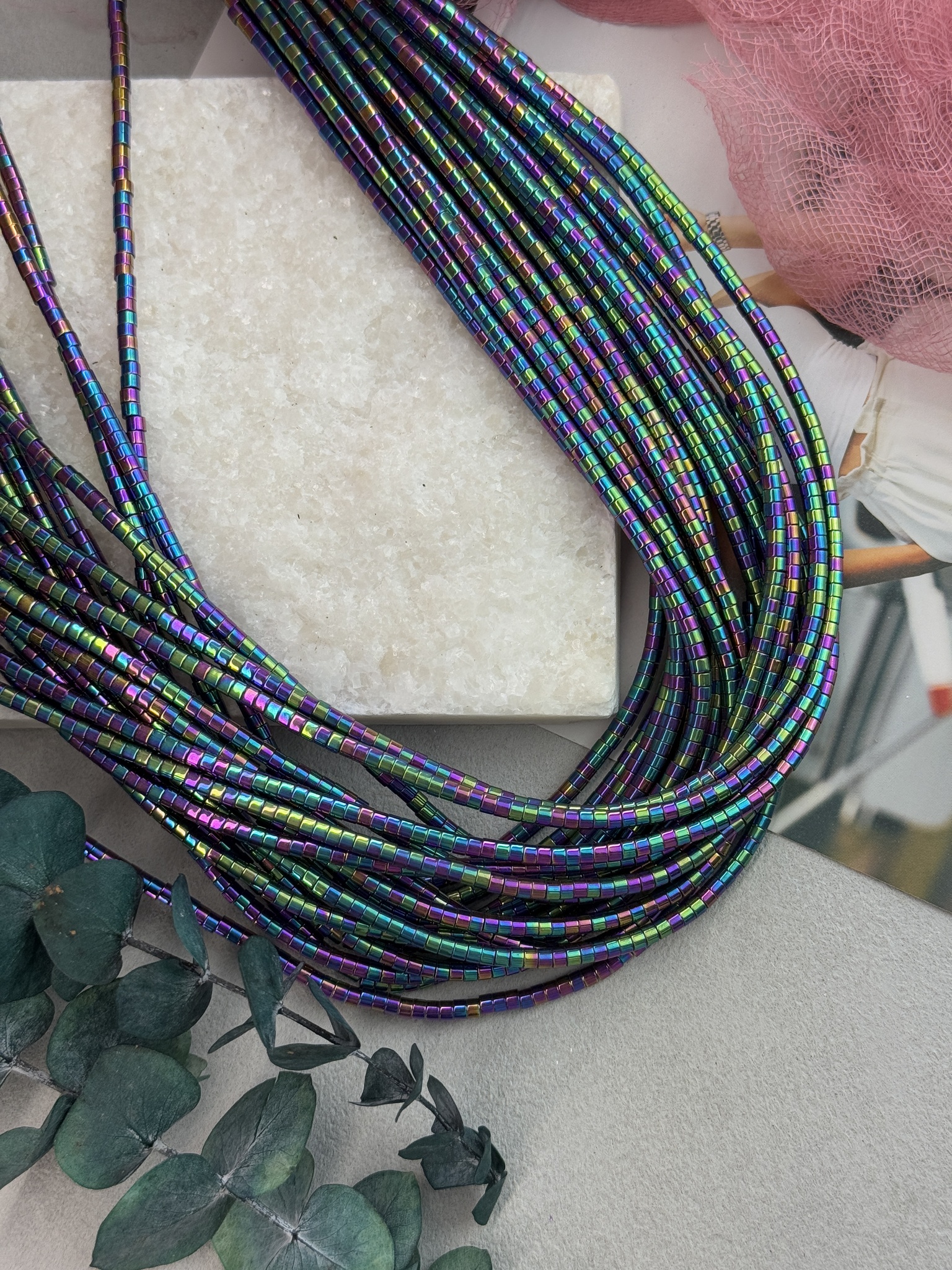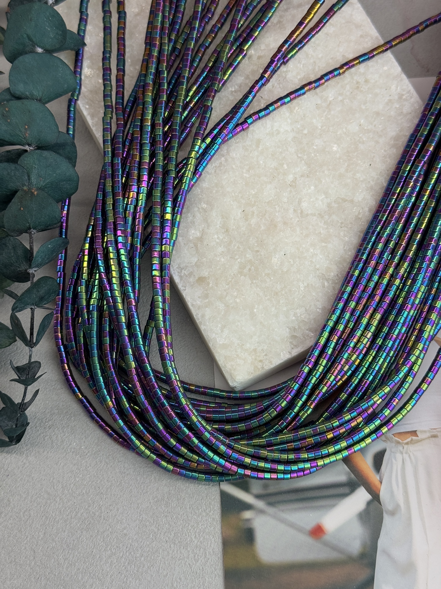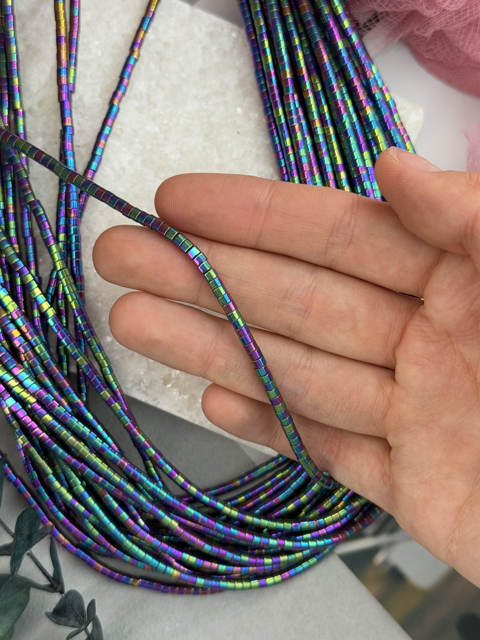 Гематит с гальваническим покрытием синего цвета с переливами в форме диска. Размер одной бусины 3*2 мм, длина нити около 40 см (может отличаться на пару сантиметров в зависимости от разных партий). Гипоаллергенно.