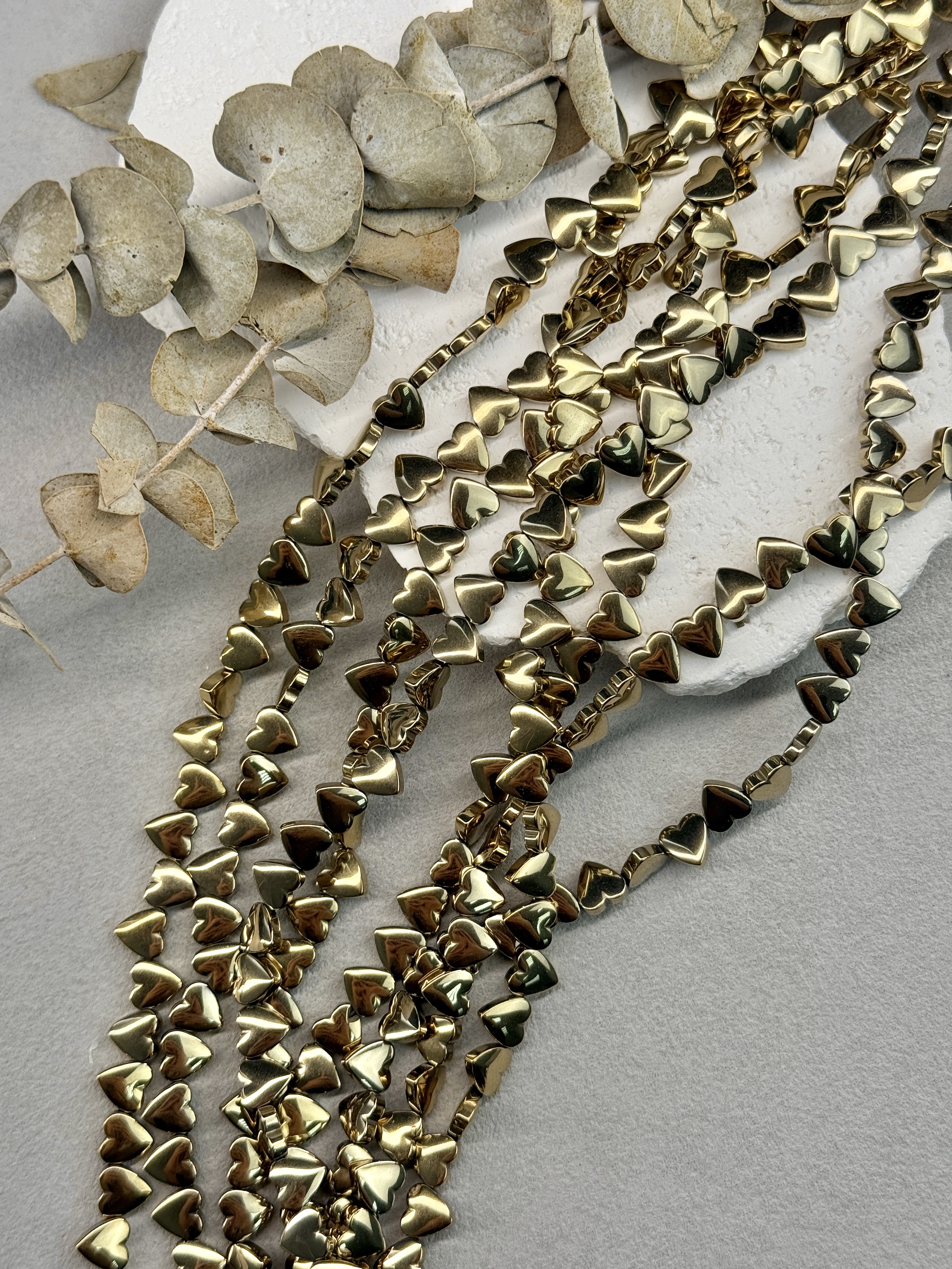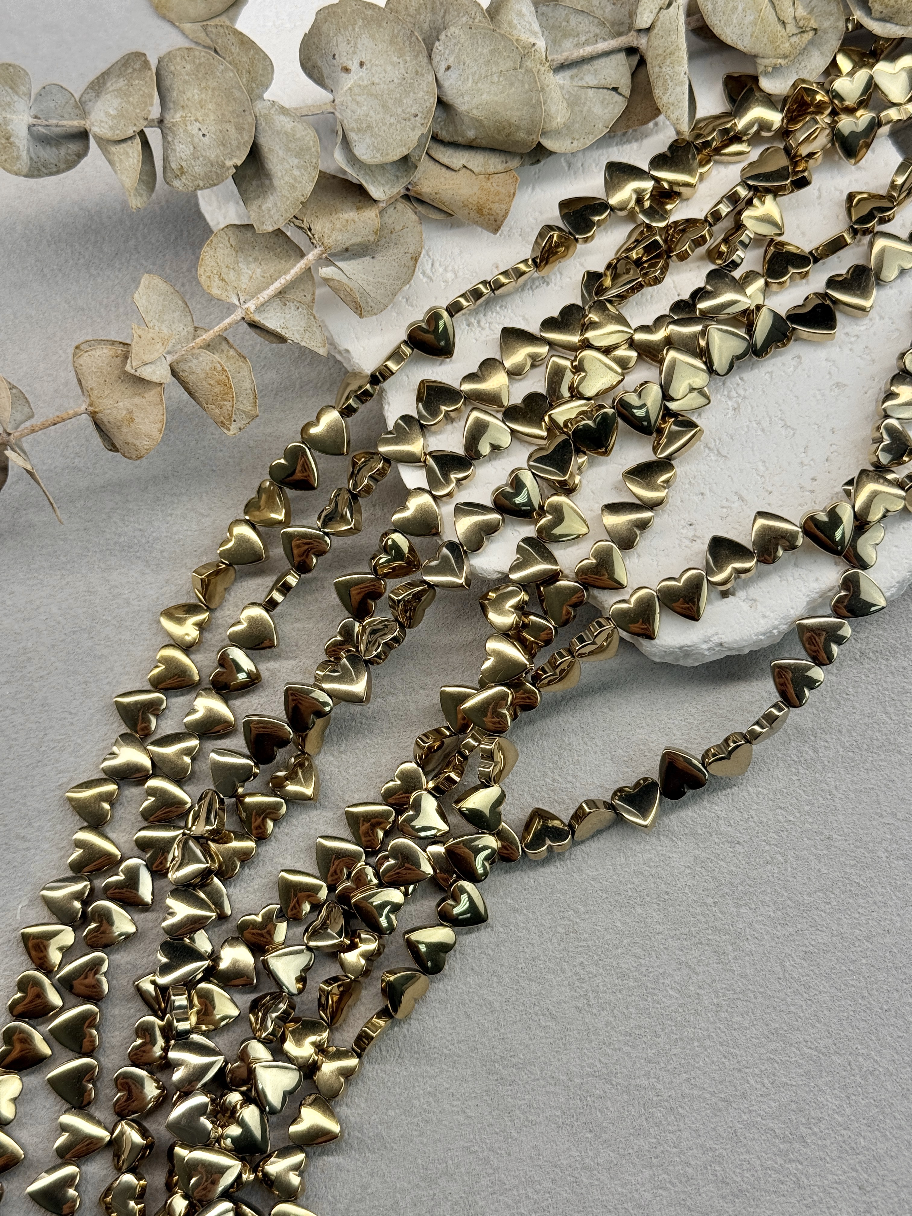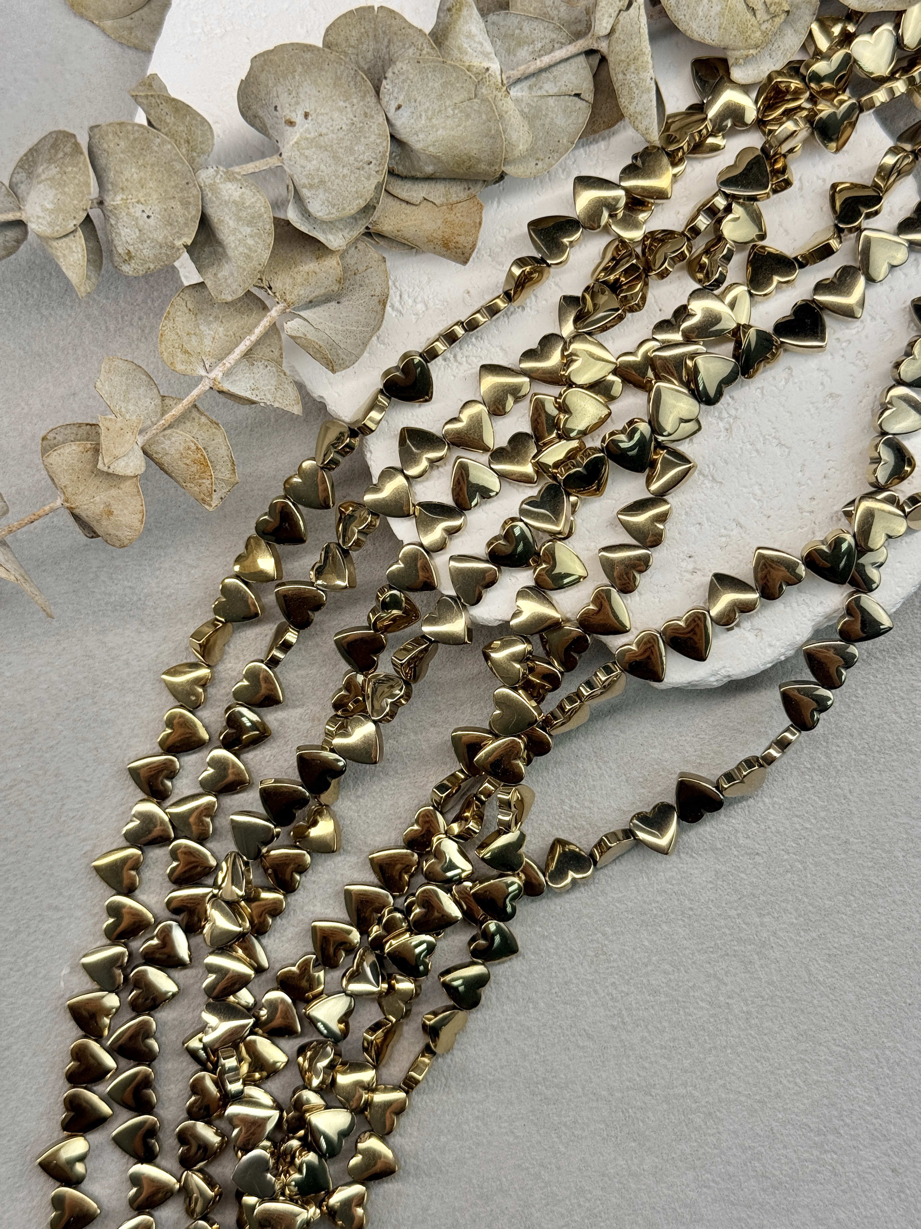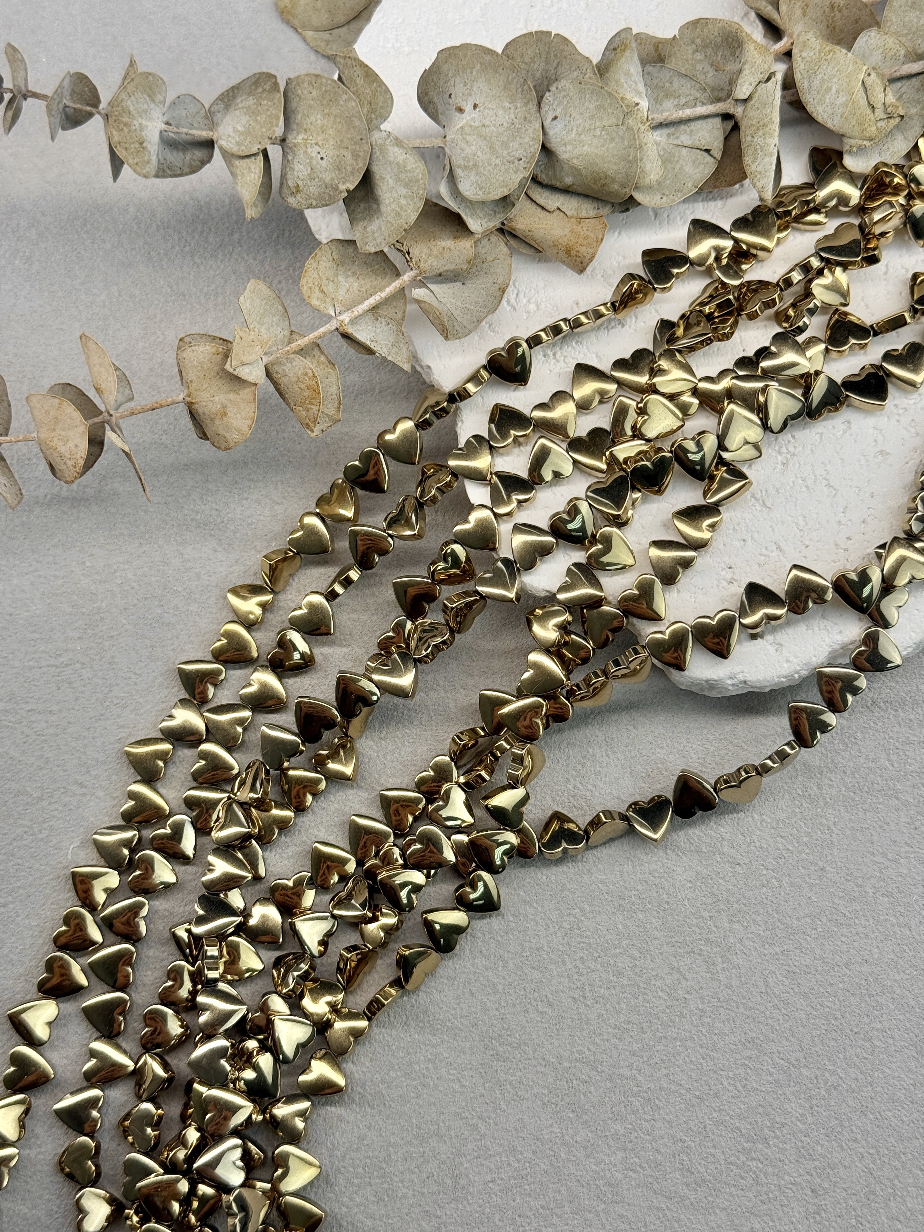 Гематит в форме сердца, размер одной бусины 6 мм, длина нити около 40 см (может отличаться на пару сантиметров в зависимости от разных партий). Гипоаллергенно. На поверхности могут быть незначительные микроцарапины не портящие вид изделия. Не является браком.