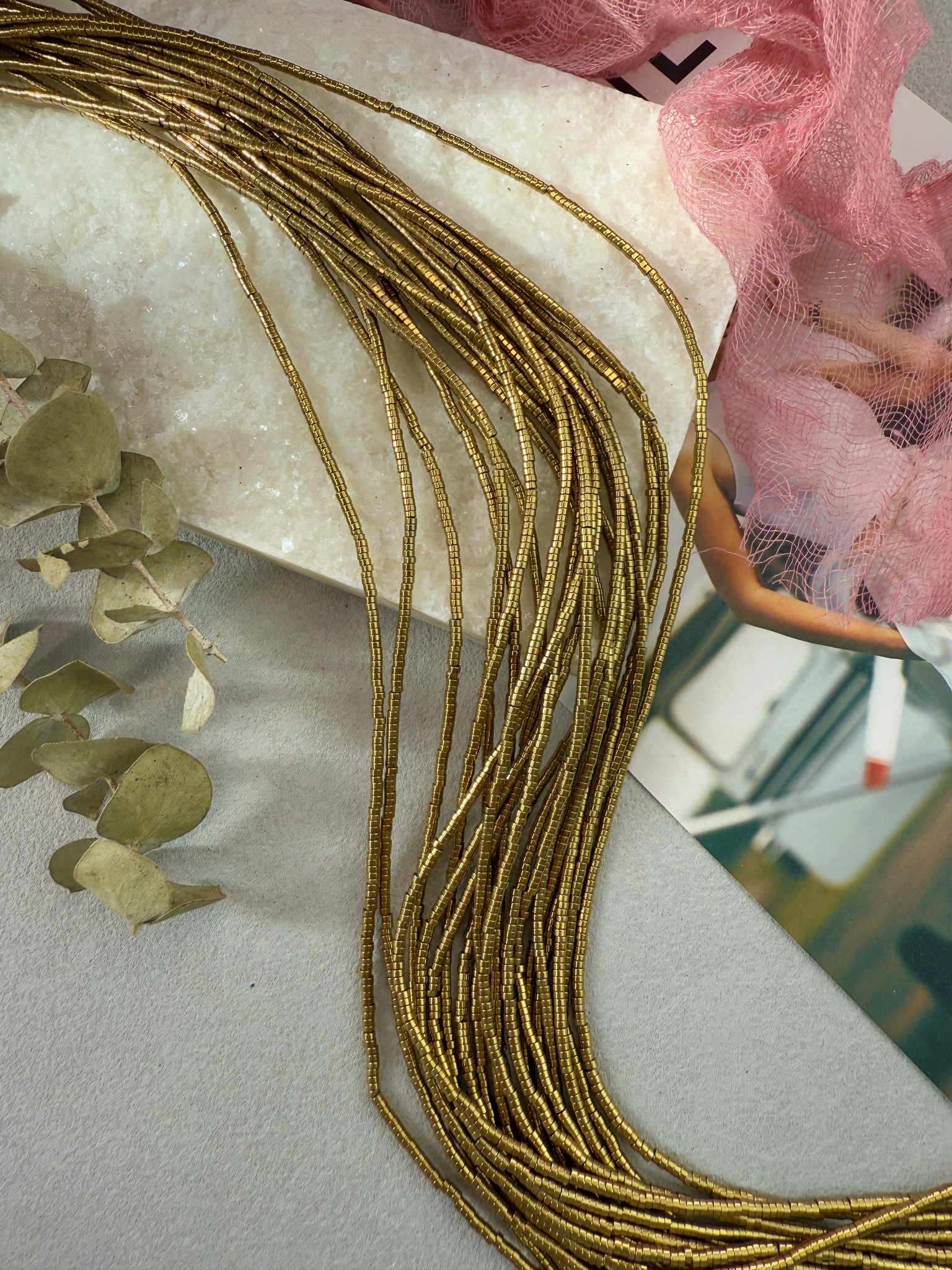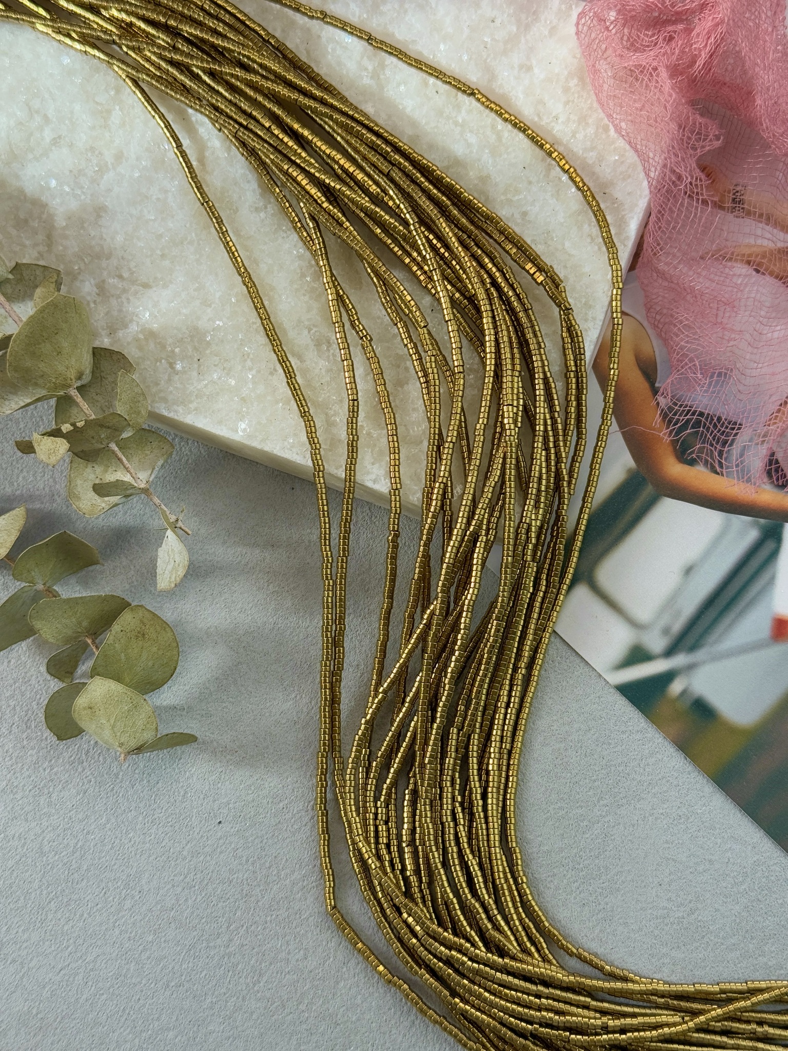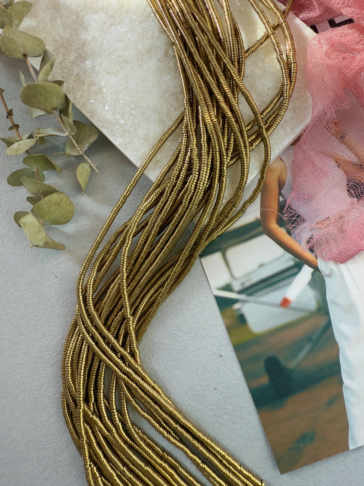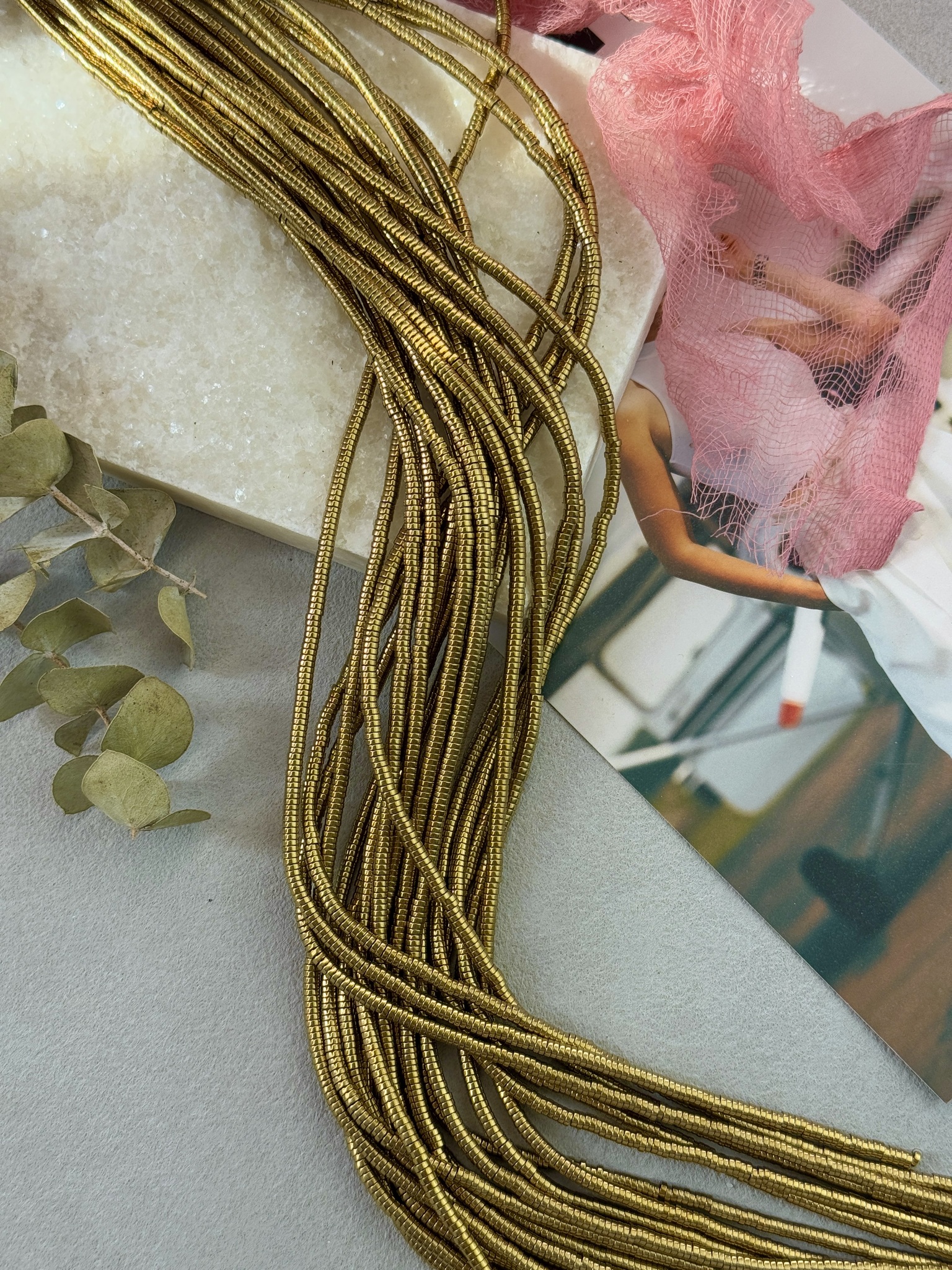 Гематит с гальваническим покрытием темно-золотого цвета в форме дисков. Размер одной бусины 2*1 мм, длина нити около 40 см (может отличаться на пару сантиметров в зависимости от разных партий). Идеально подходят в качестве разделителей бусин.