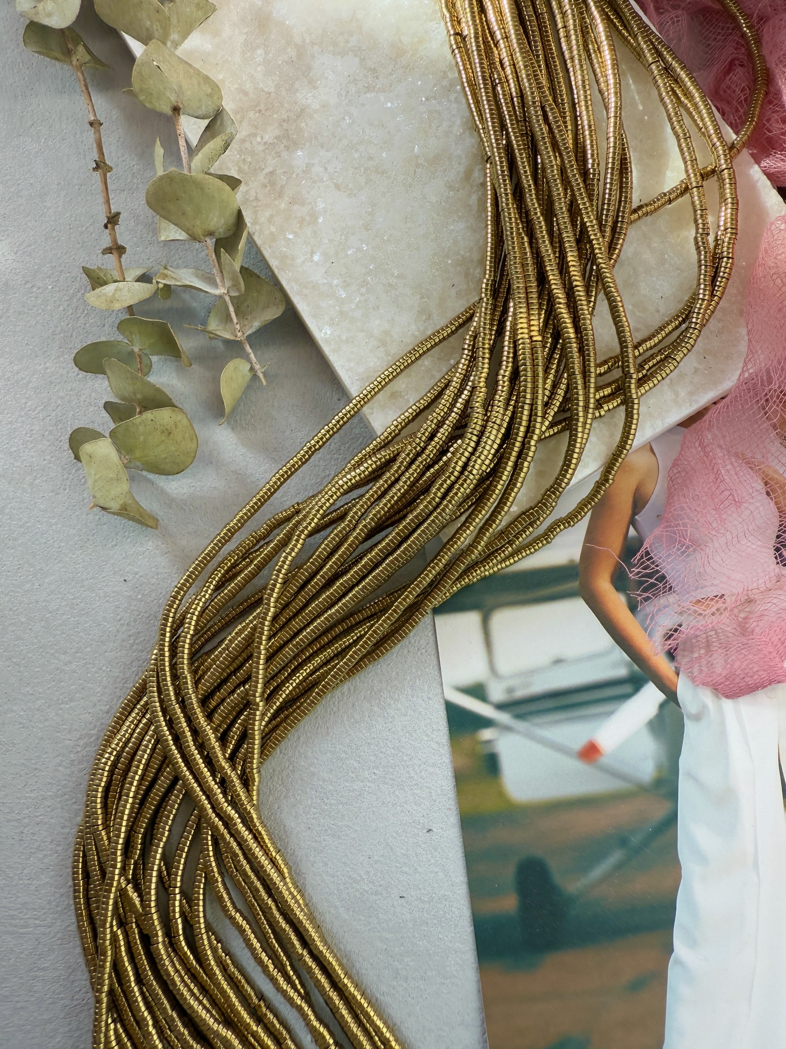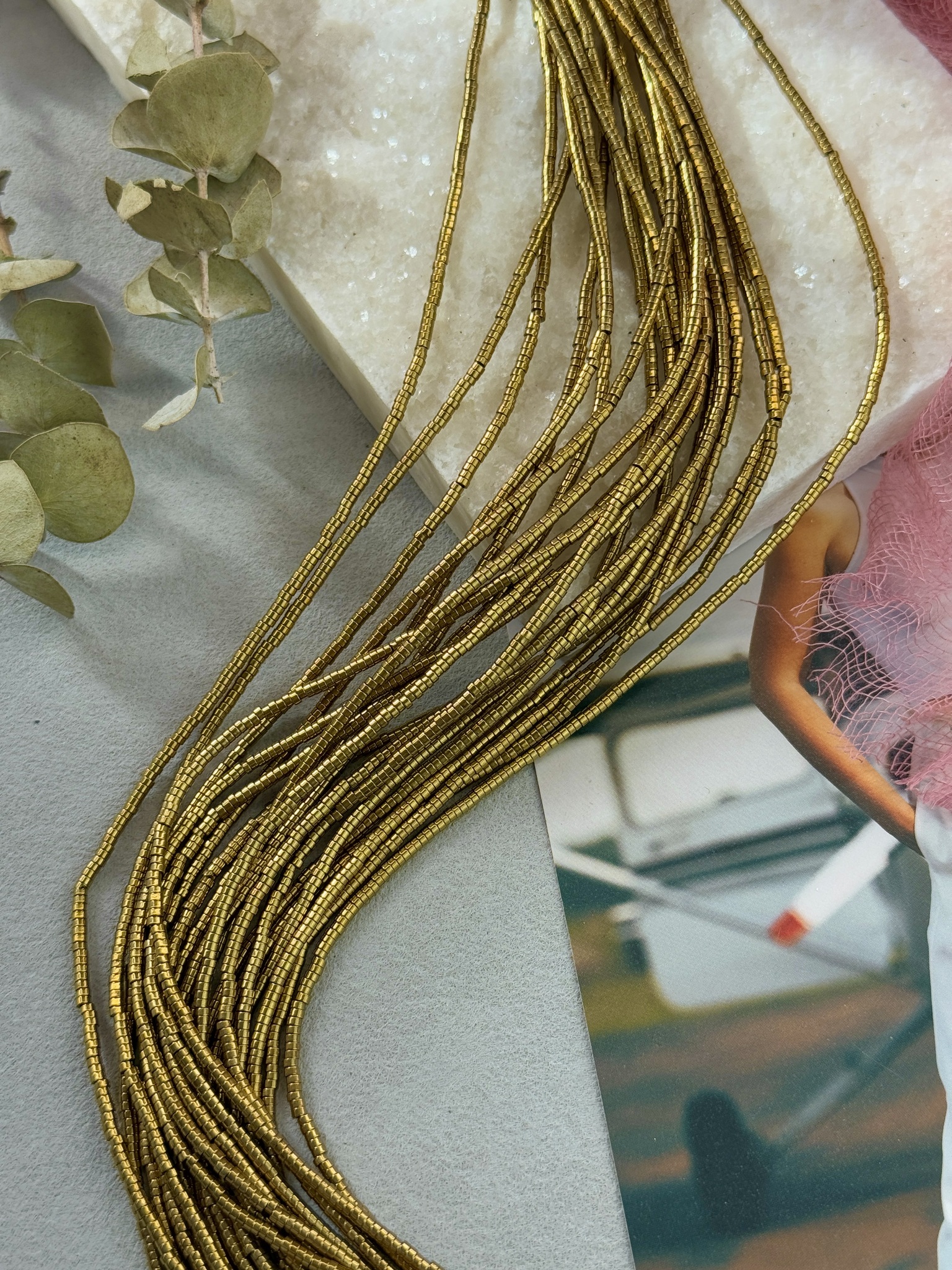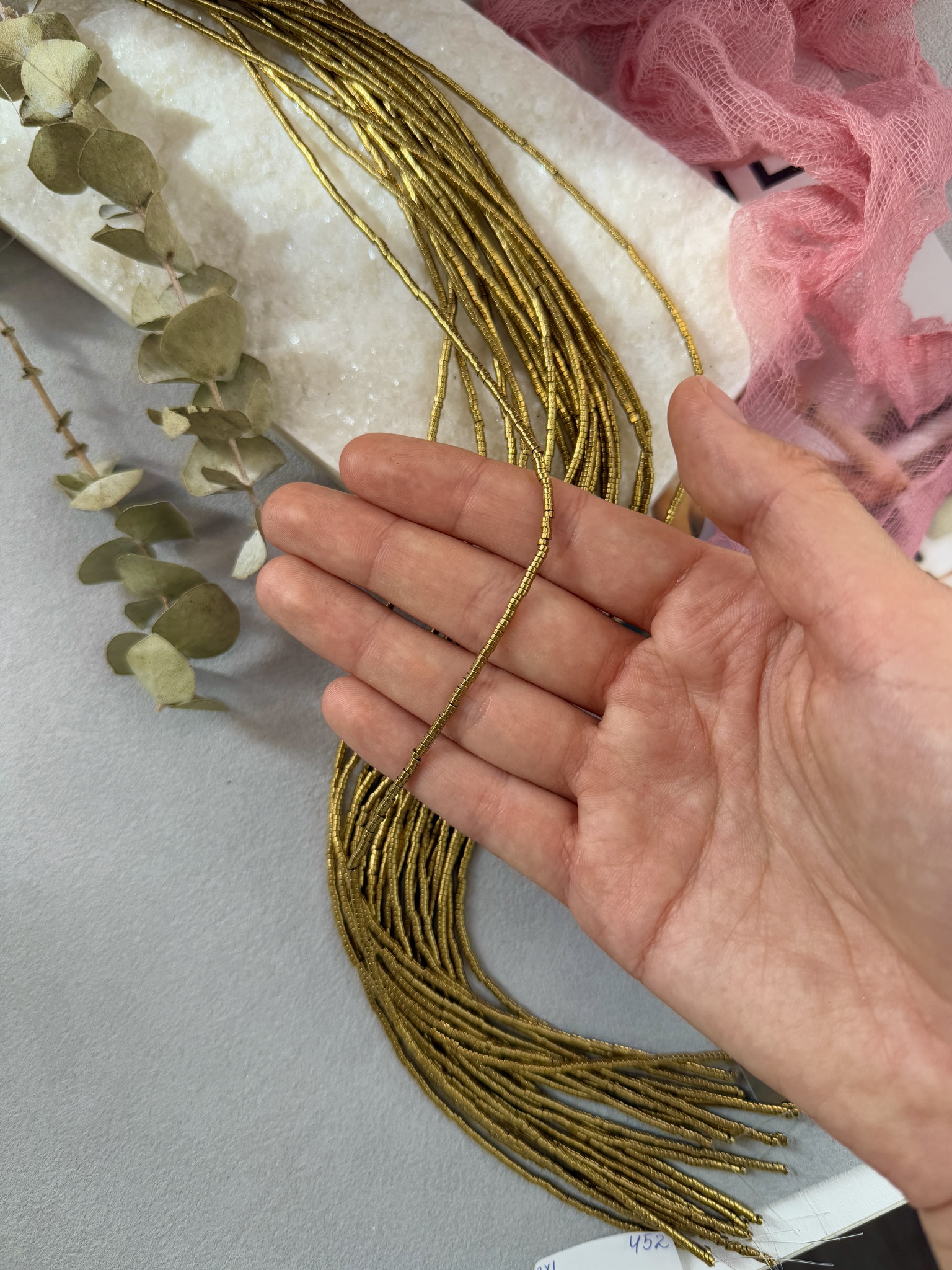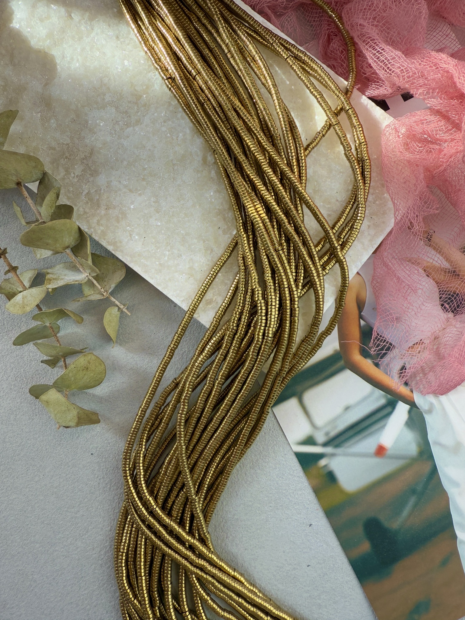 Гематит с гальваническим покрытием темно-золотого цвета в форме дисков. Размер одной бусины 2*1 мм, длина нити около 40 см (может отличаться на пару сантиметров в зависимости от разных партий). Идеально подходят в качестве разделителей бусин.