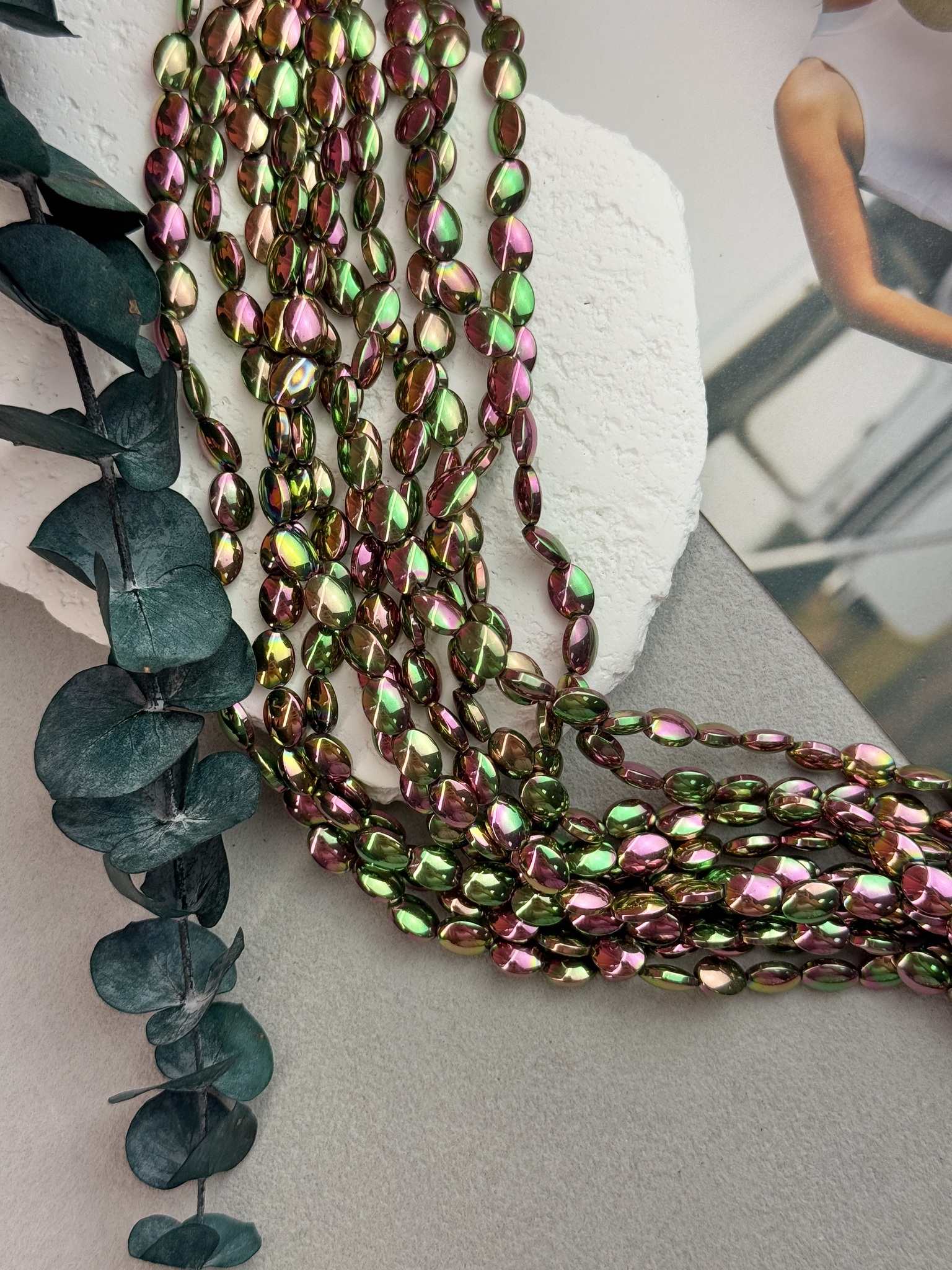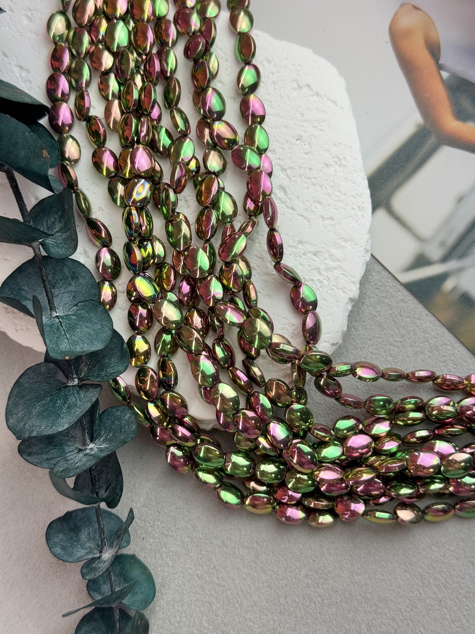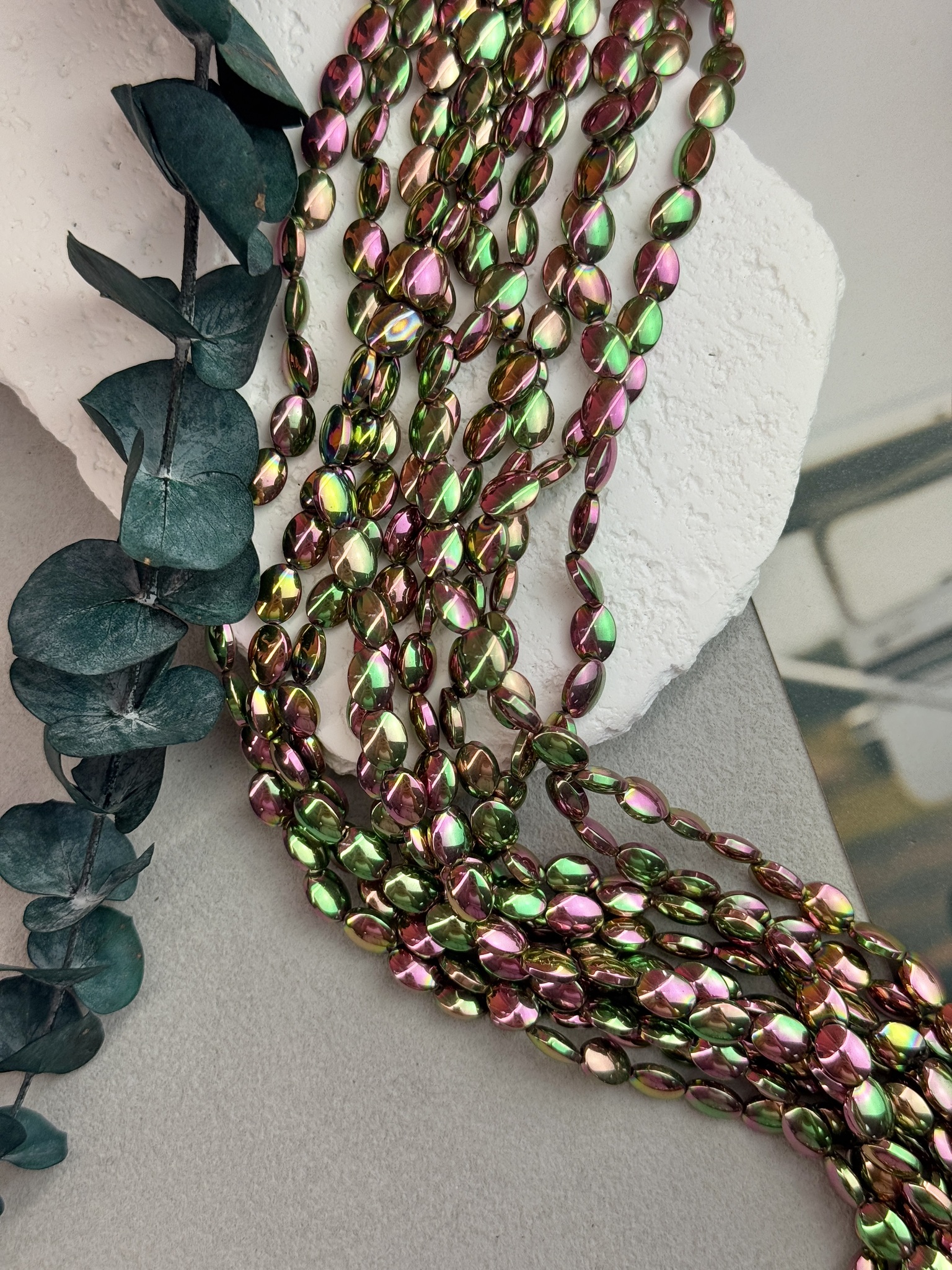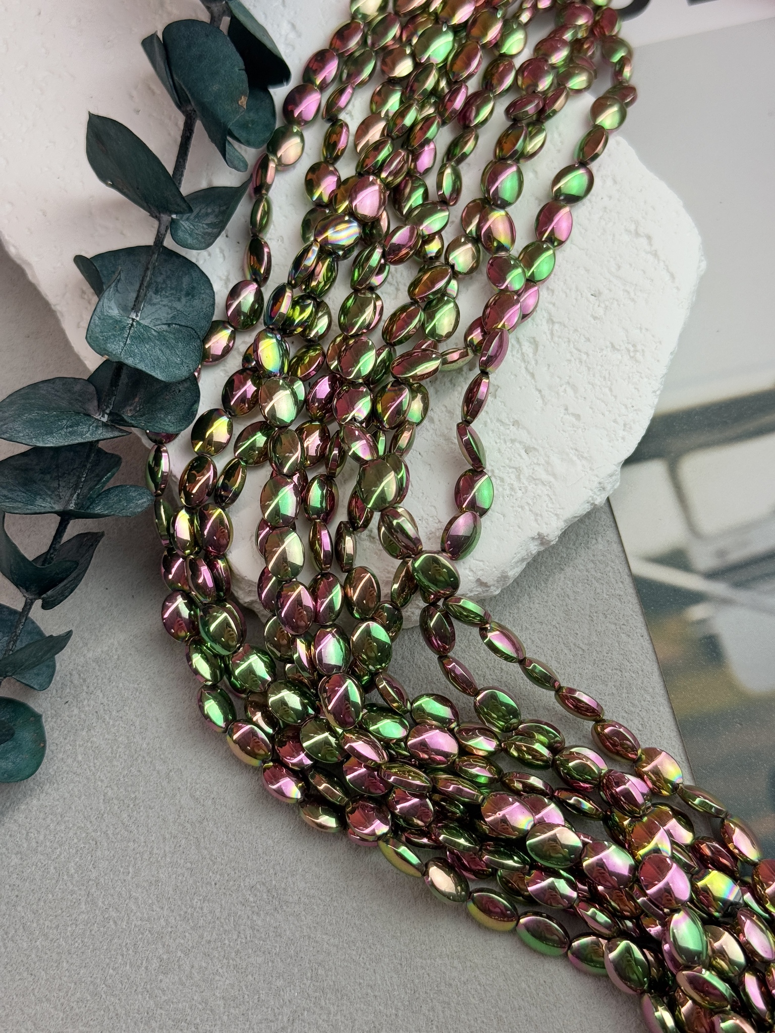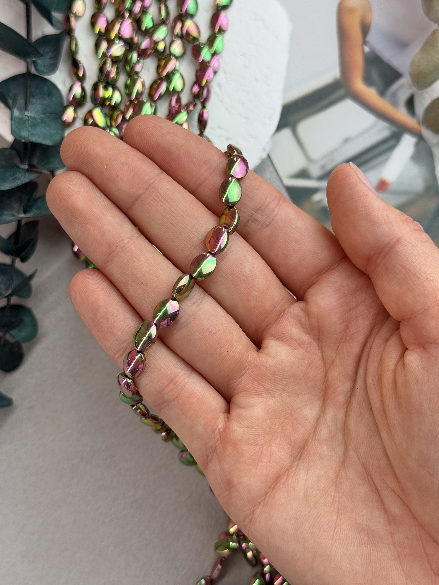 Гематит с гальваническим покрытием радужного цвета в форме овалов. Размер одной бусины 6*8 мм, длина нити около 38 см (может отличаться на пару сантиметров в зависимости от разных партий). Гипоаллергенно.