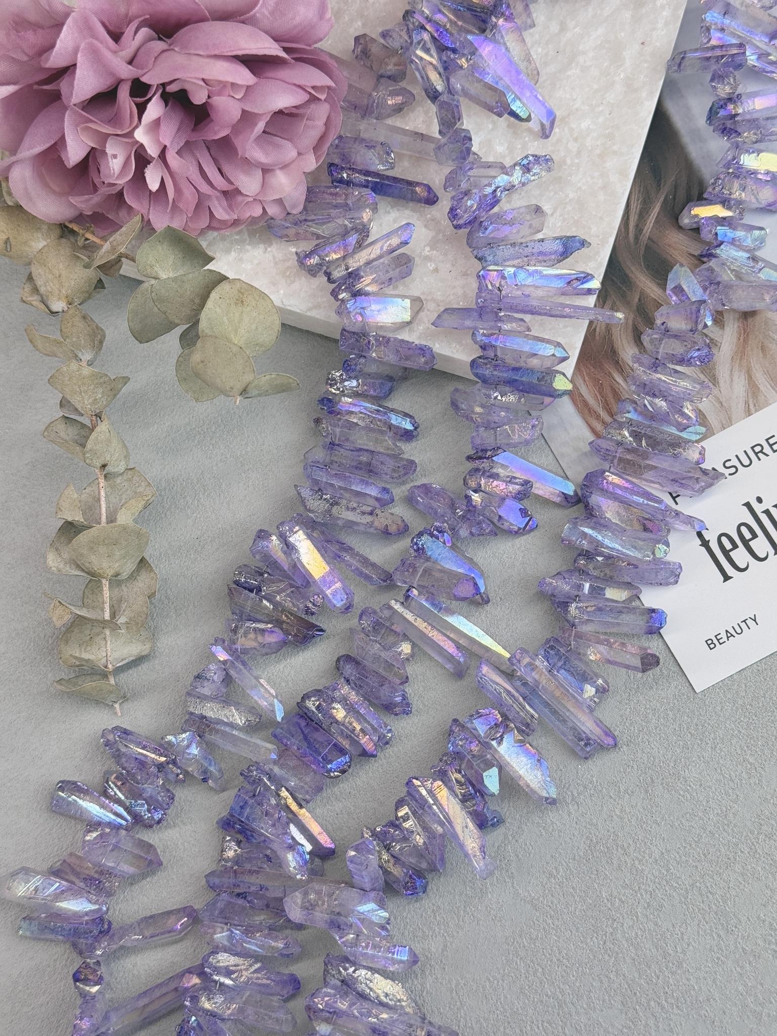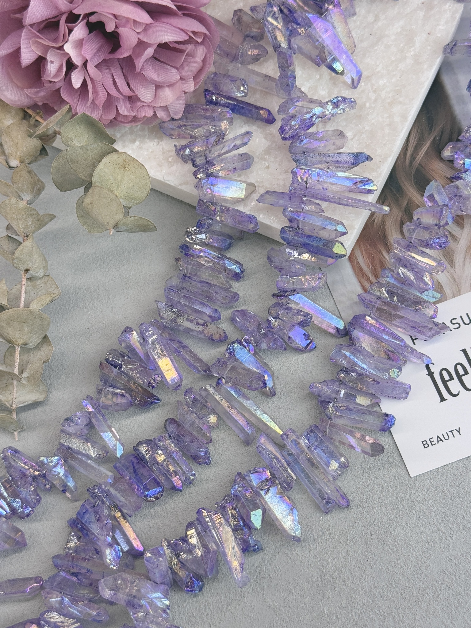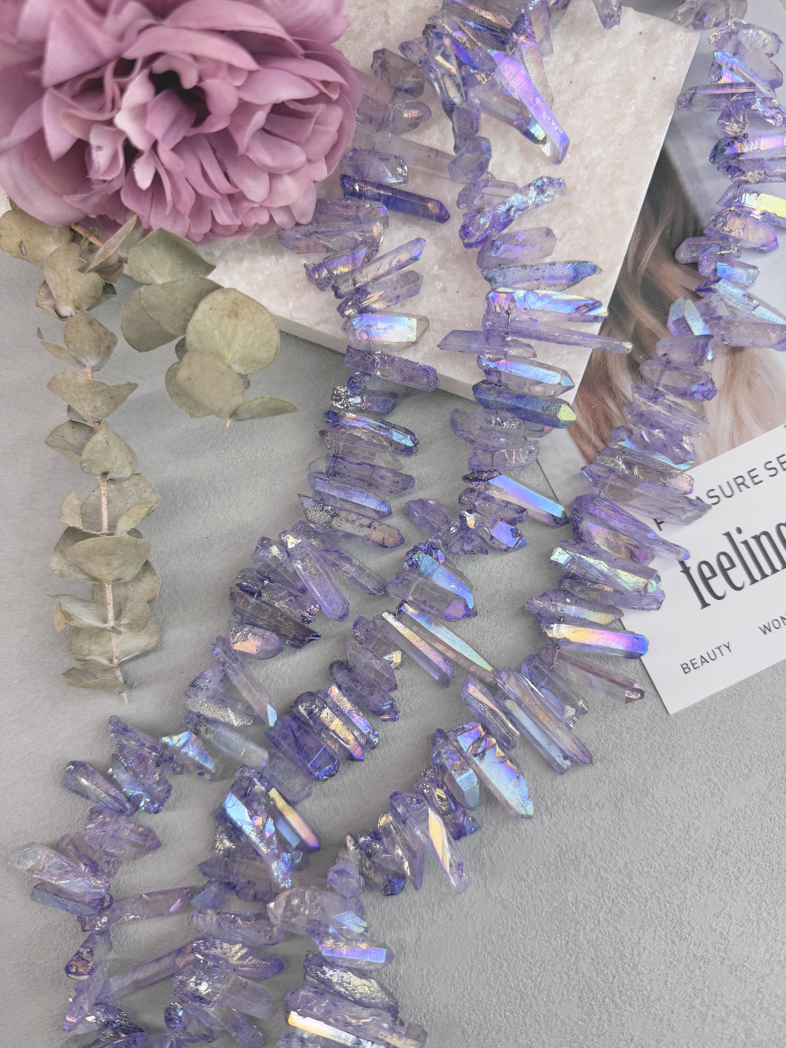 Бусины кристаллической формы из гальванизированного горного хрусталя. Размер бусин (примерный) толщина 4-8 мм , длина 15-40 мм. Продается россыпью или на нити длиной 40 см (нить иногда рвется и мы меняем фасовку на россыпь). Форма всех бусин в виде кристаллов.