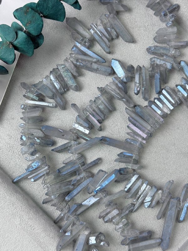 Бусины кристаллической формы из горного хрусталя. Размер бусин (примерный) толщина 3-7 мм , длина 10-40 мм. Продается россыпью или на нити длиной 40 см (нить иногда рвется и мы меняем фасовку на россыпь). Форма всех бусин в виде кристаллов.