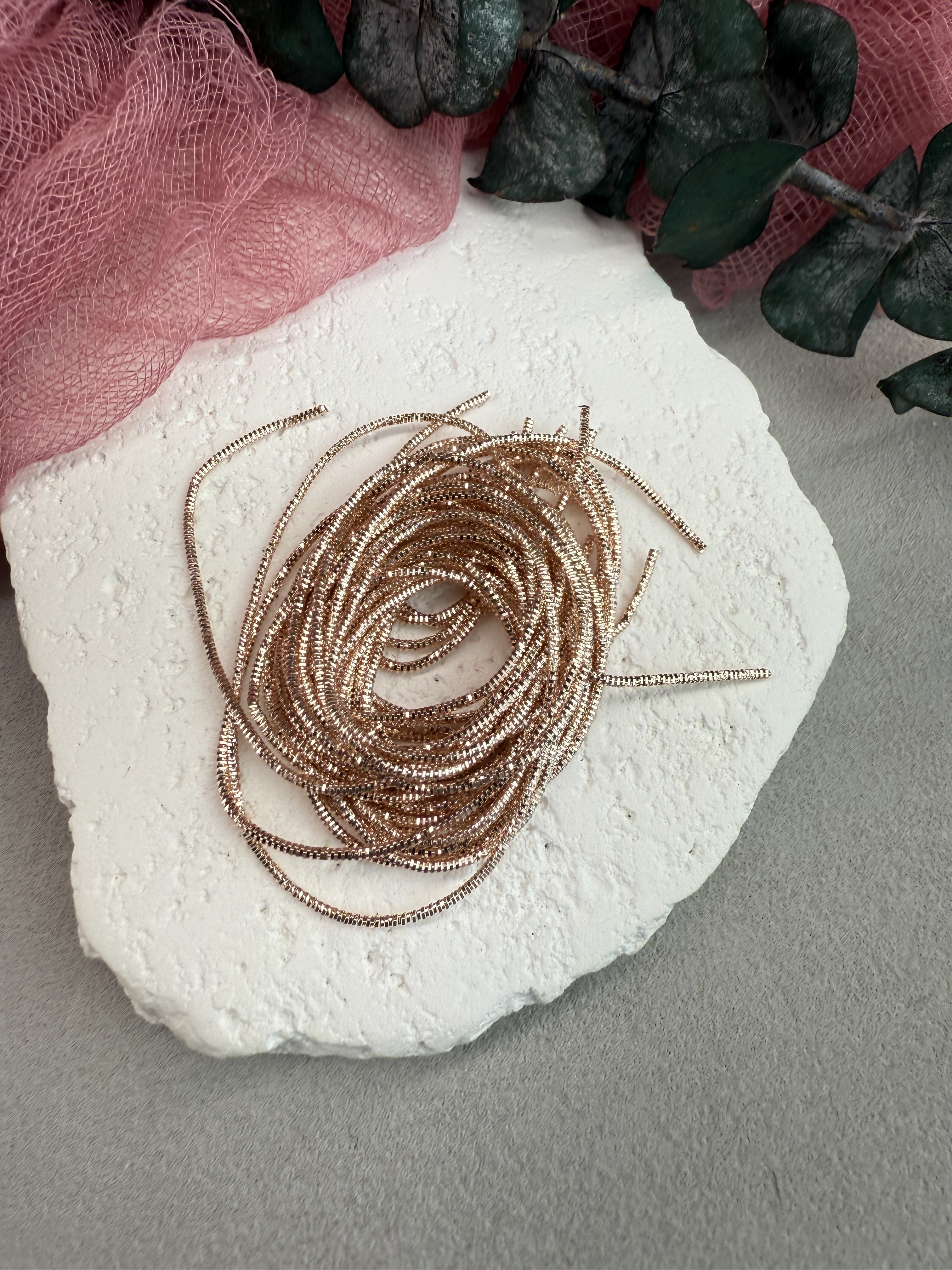 Канитель трунцал, размер 0,7 мм, цвет №4986 или канительный шнур представляет собой тонкую металлическую проволоку, туго свитую в преломляющуюся спираль, из-за чего трунцал играет и блестит в вышивке интереснее, чем обычная канитель. Нарезается ножницами или ювелирными кусачками отрезками нужной длины и пришивается мононитью через витки без натяжения.