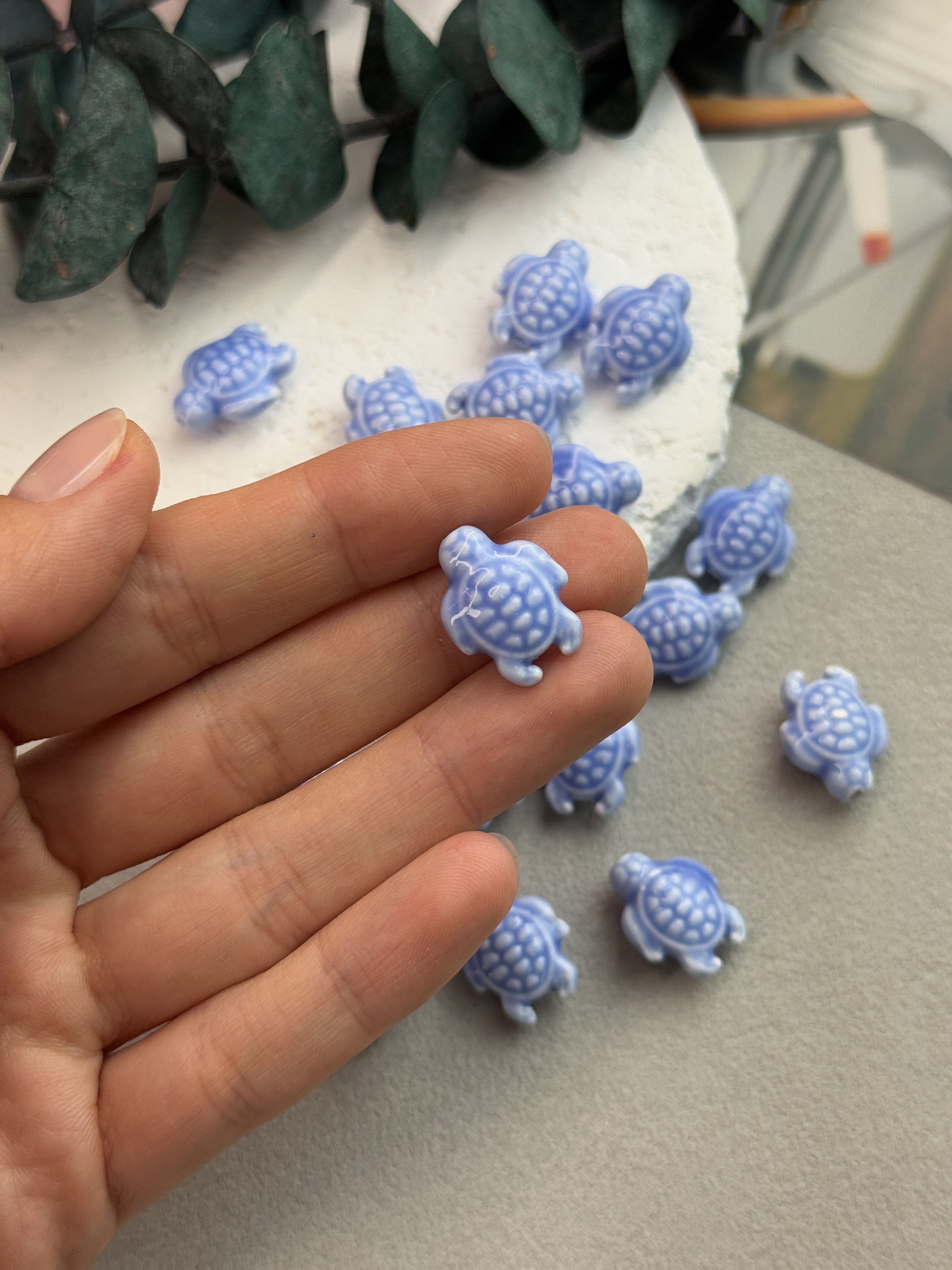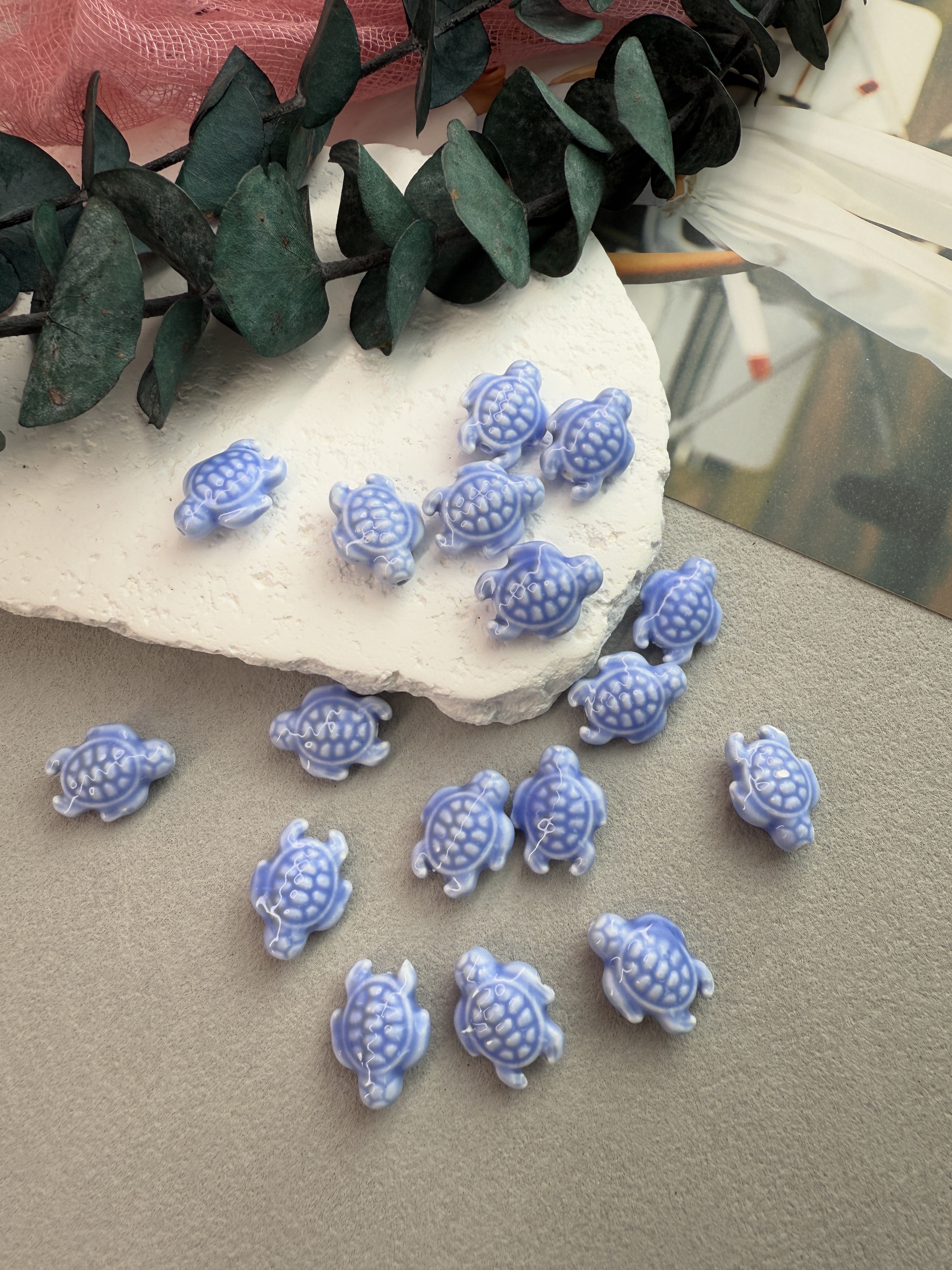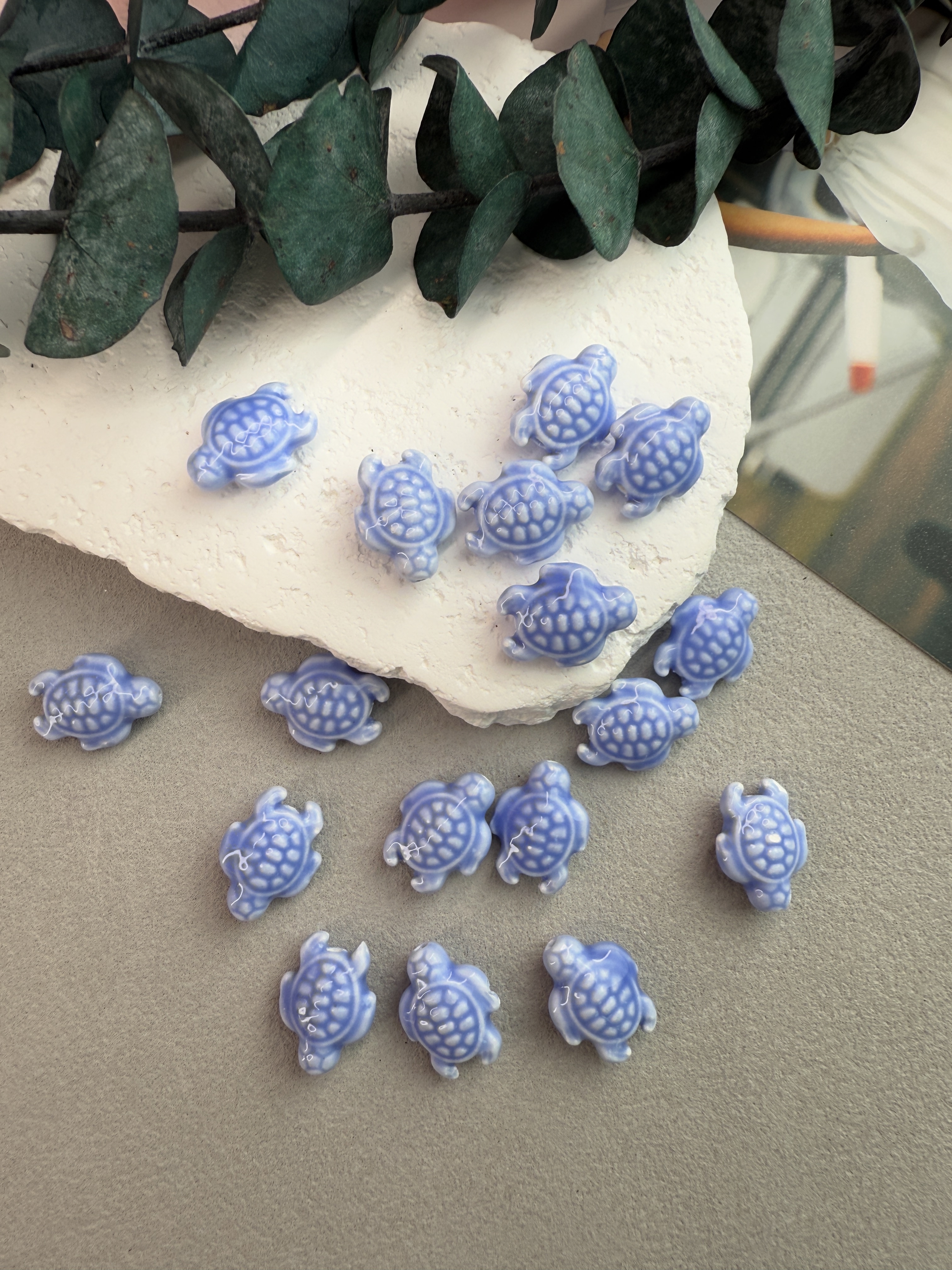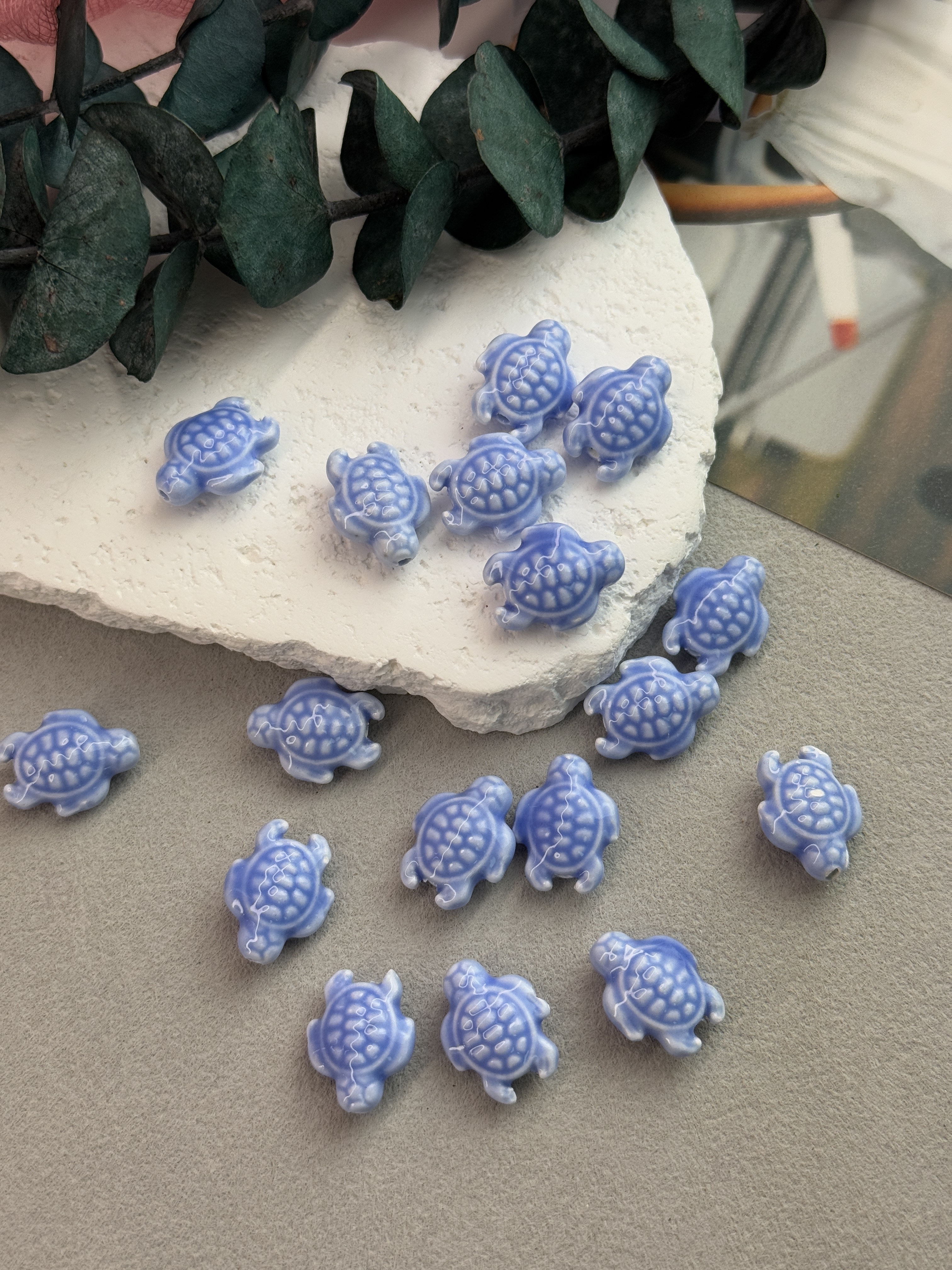 Милые глянцевые бусинки из керамики ручной работы в виде черепашек для создания украшений ручной работы. Покрыты блестящей глазурью (стекло). Долговечны (не выцветают, не боятся трения и абразивов). Гипоаллергенны. В наборе 10 штук. Размер одной черепашки 12*19 мм.