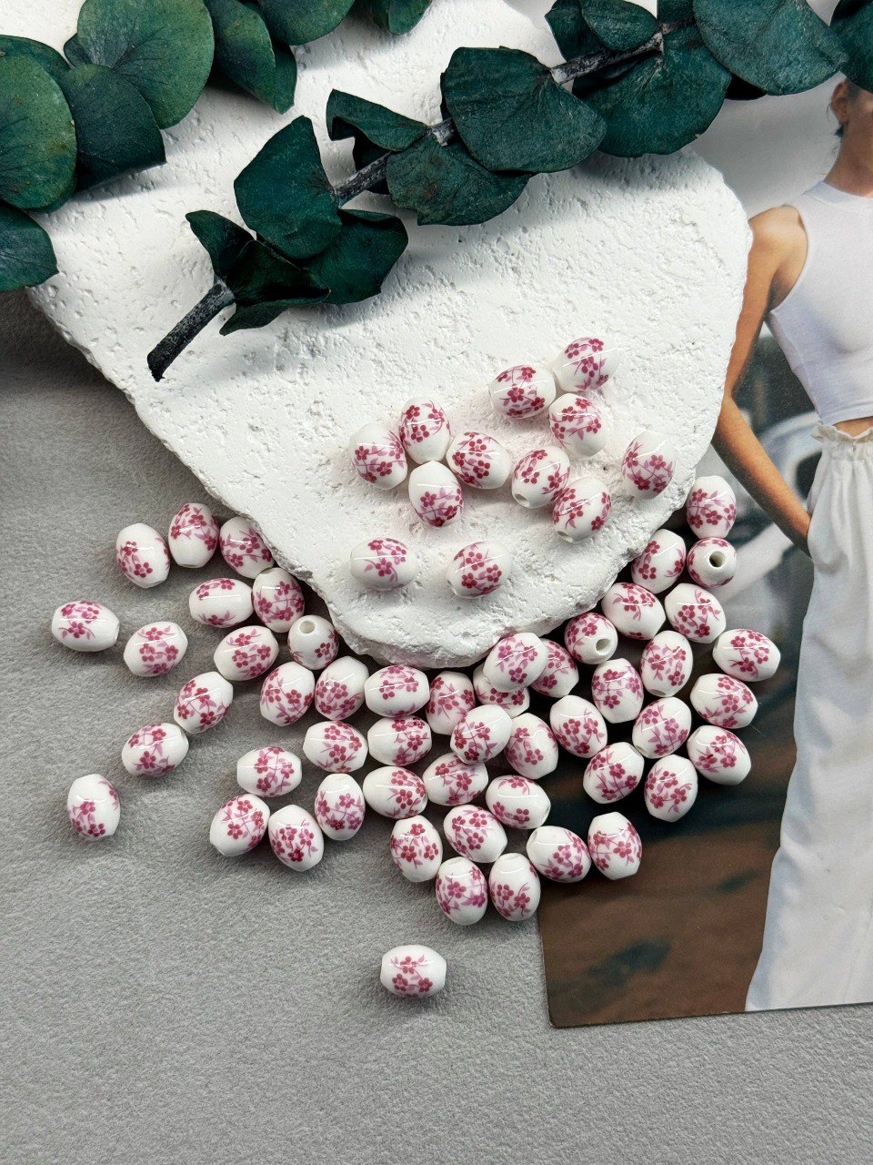 Керамические бусины, овал 8*10 мм, «Гжель», розовый, 25 штук