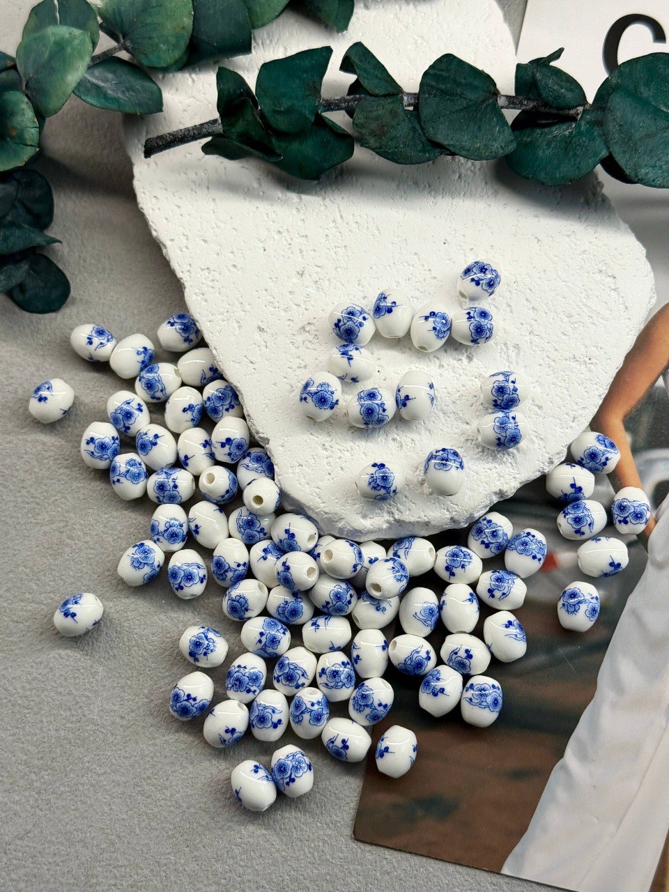 Керамические бусины, овал 8*10 мм, «Гжель», синий, 25 штук