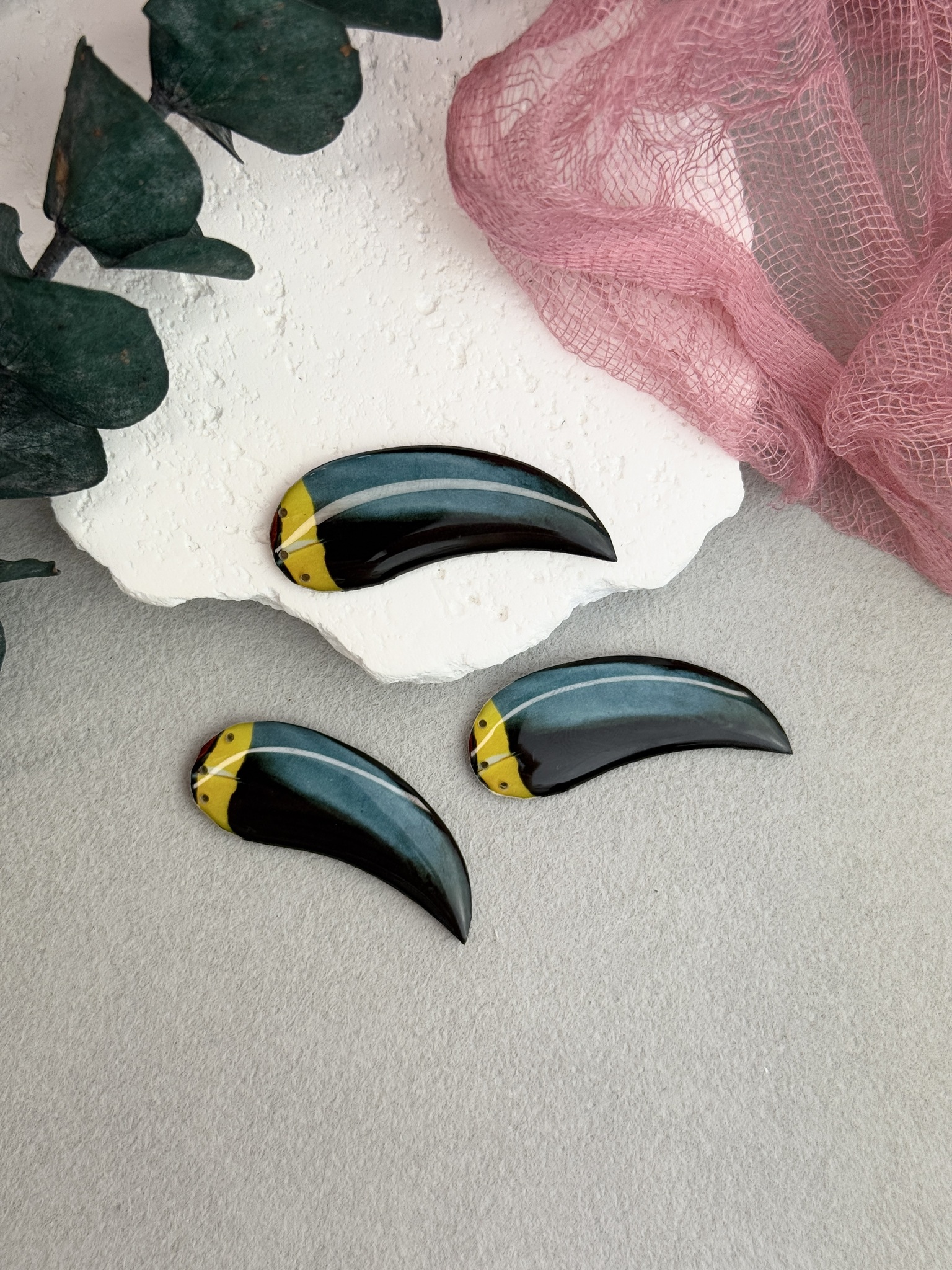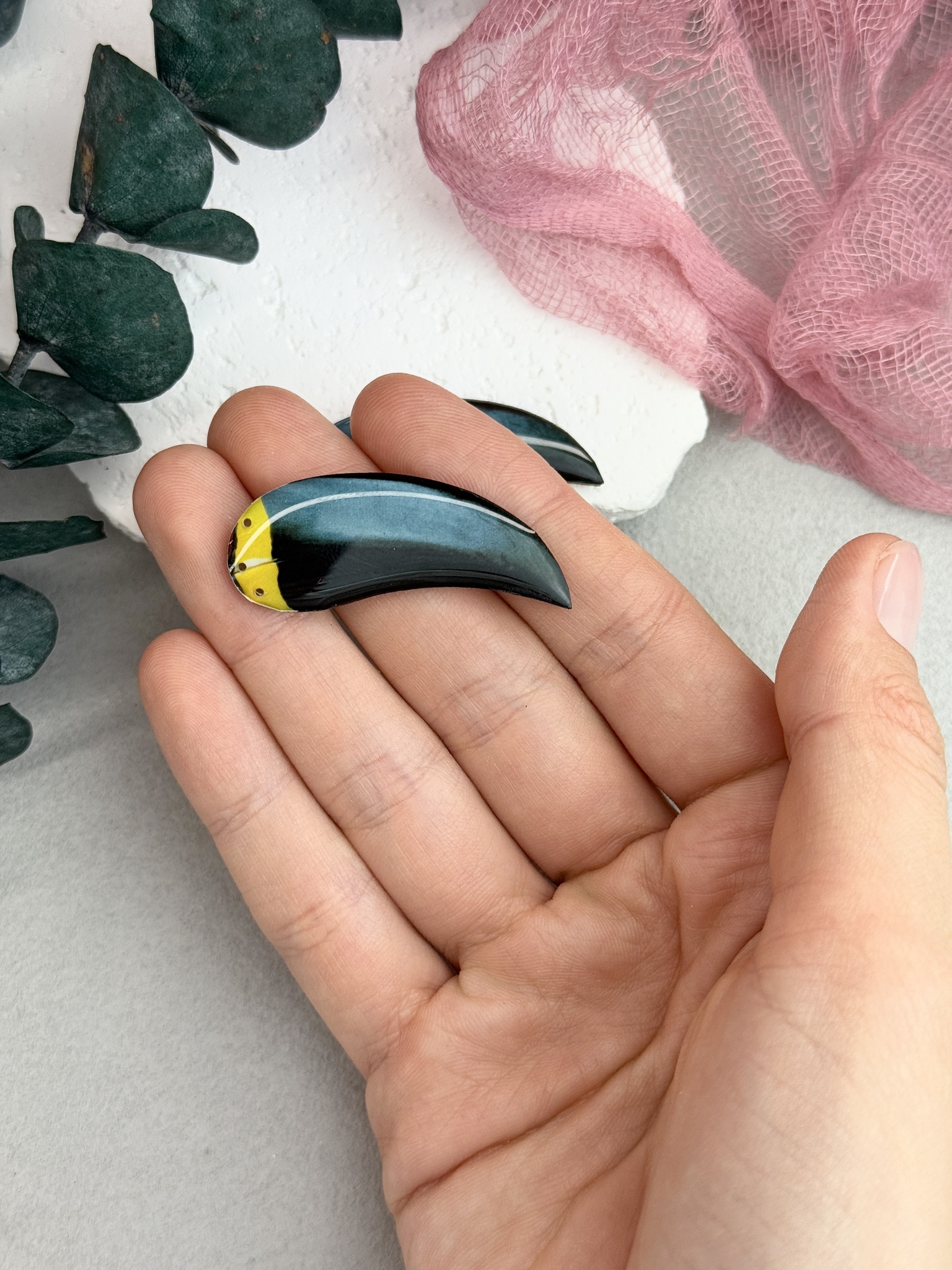 Клюв тукана ручной работы для брошей и украшений, выполнен из дерева и эпоксидной смолы. Высота 2-3 мм, размер 40*15 мм