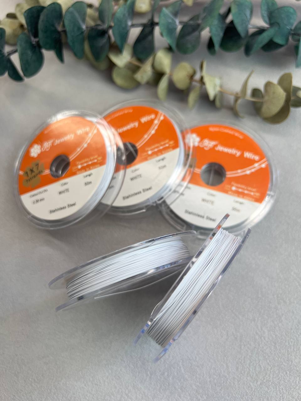 Ювелирный тросик для создания бижутерии с нейлоновым покрытием белого цвета. Идеальная основа для чокеров и колье из бусин. Основные преимущества ювелирного тросика: он не растягивается, не рвется, не преломляется.