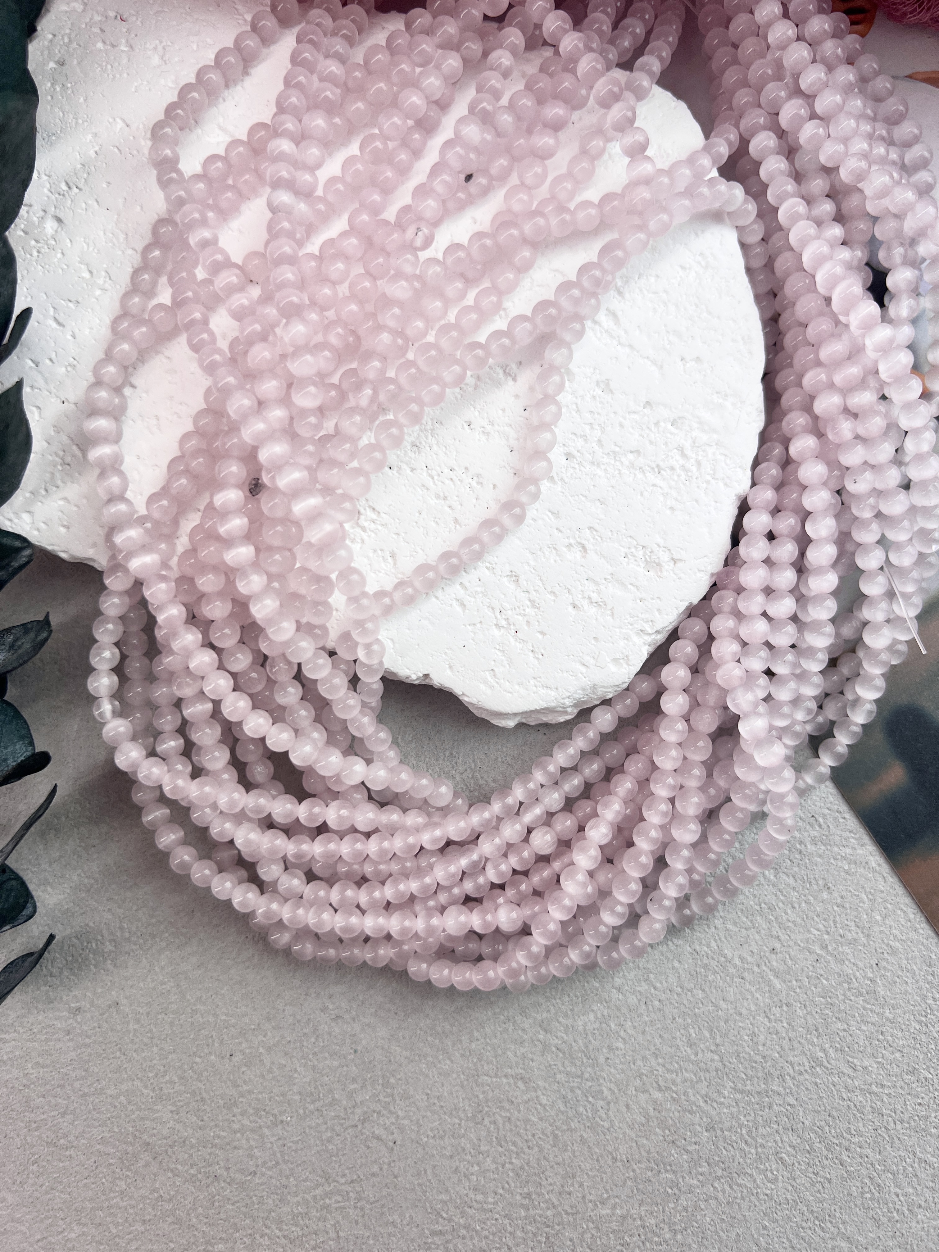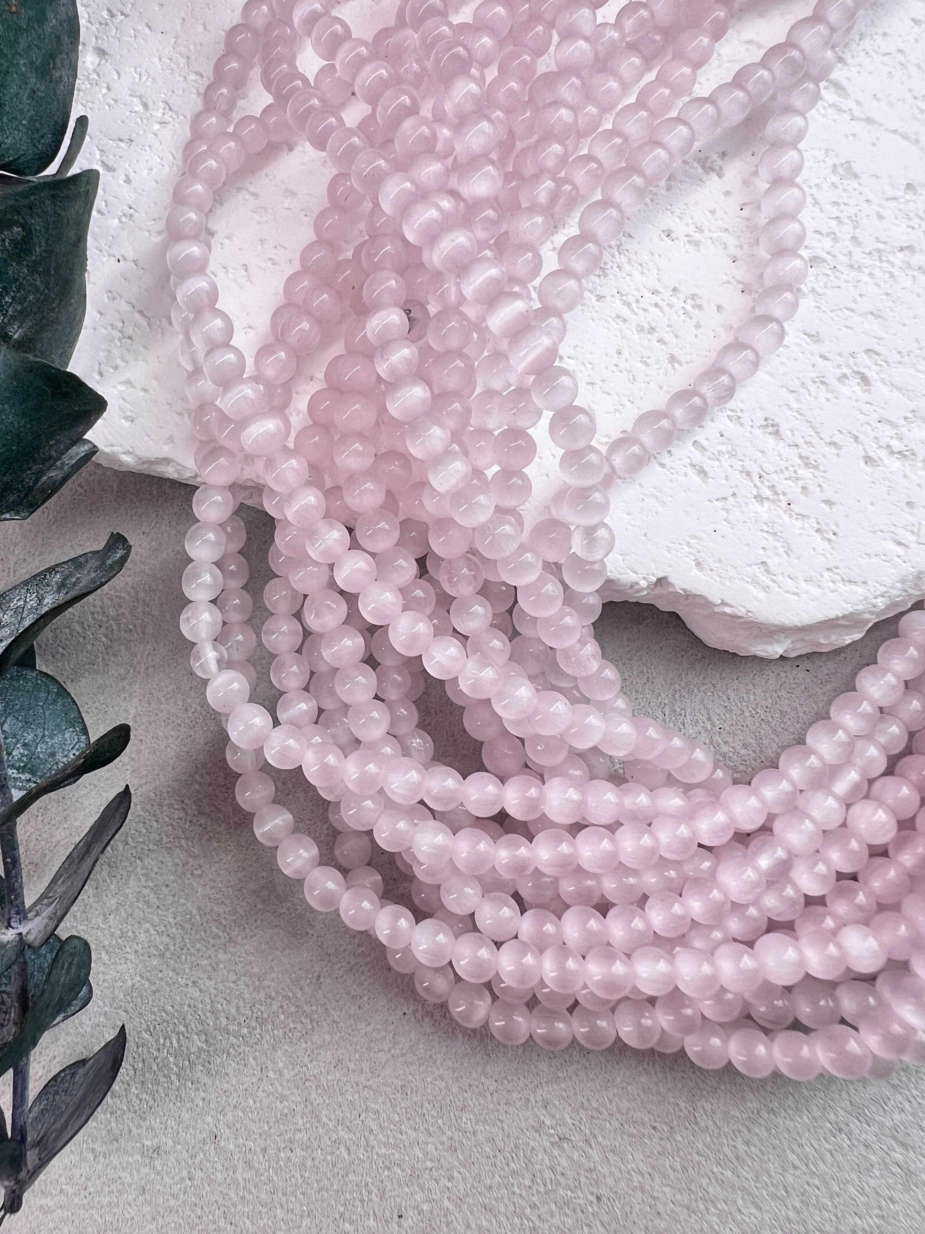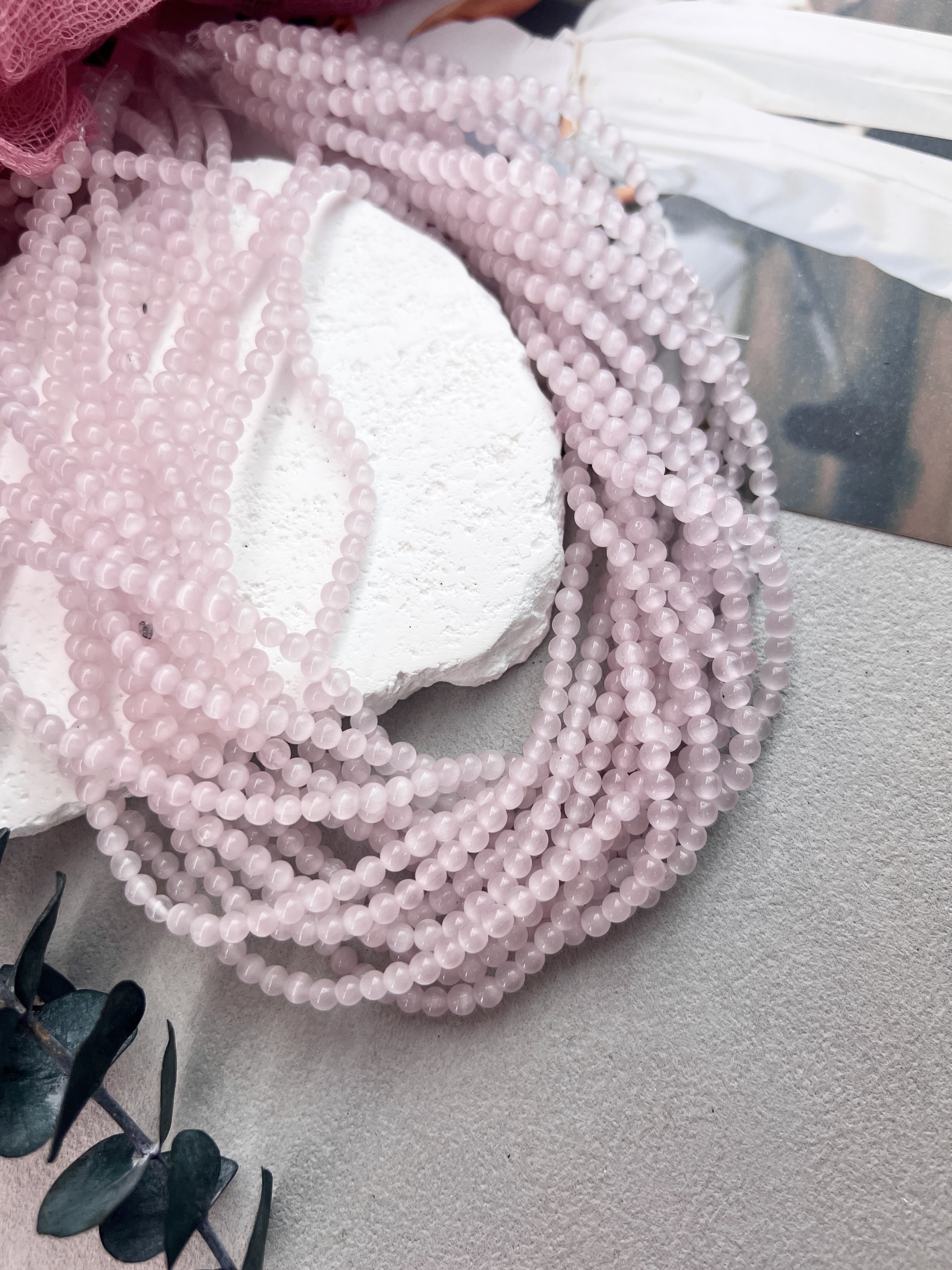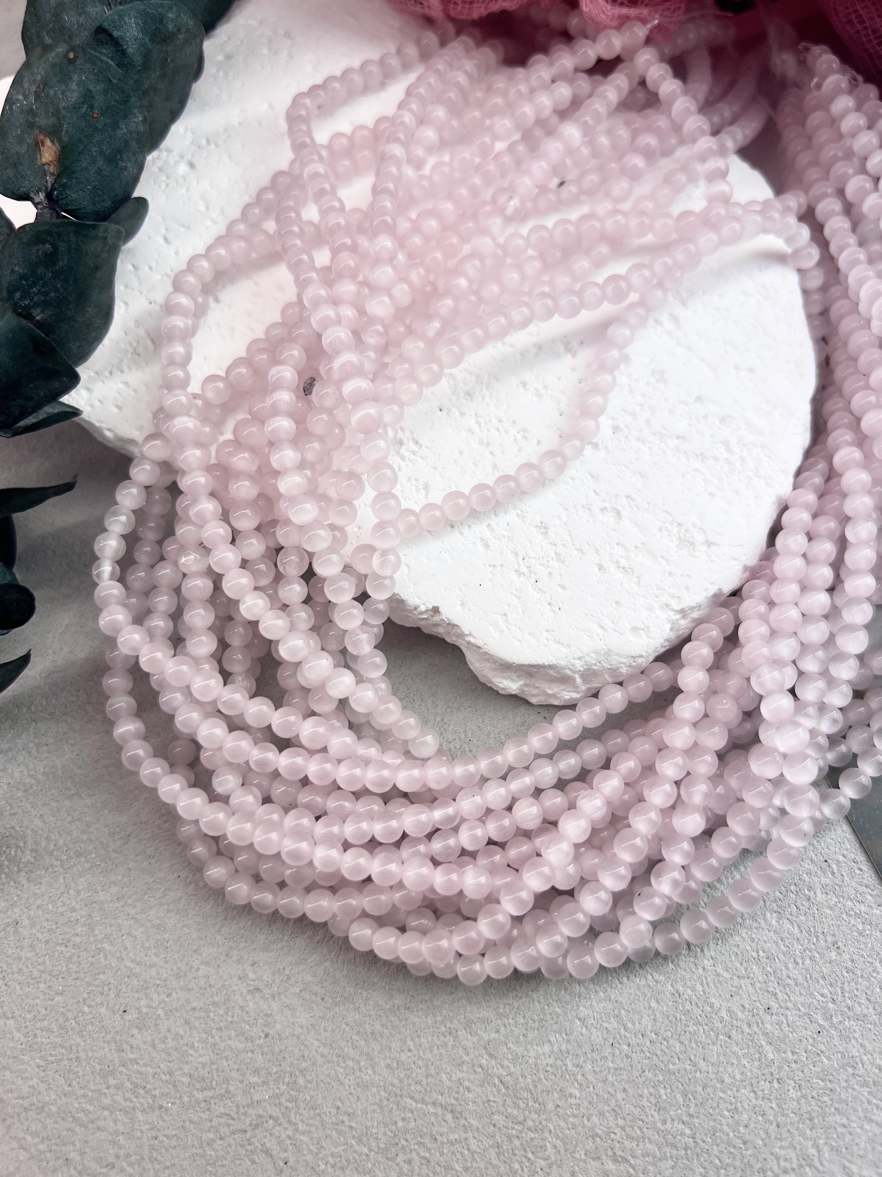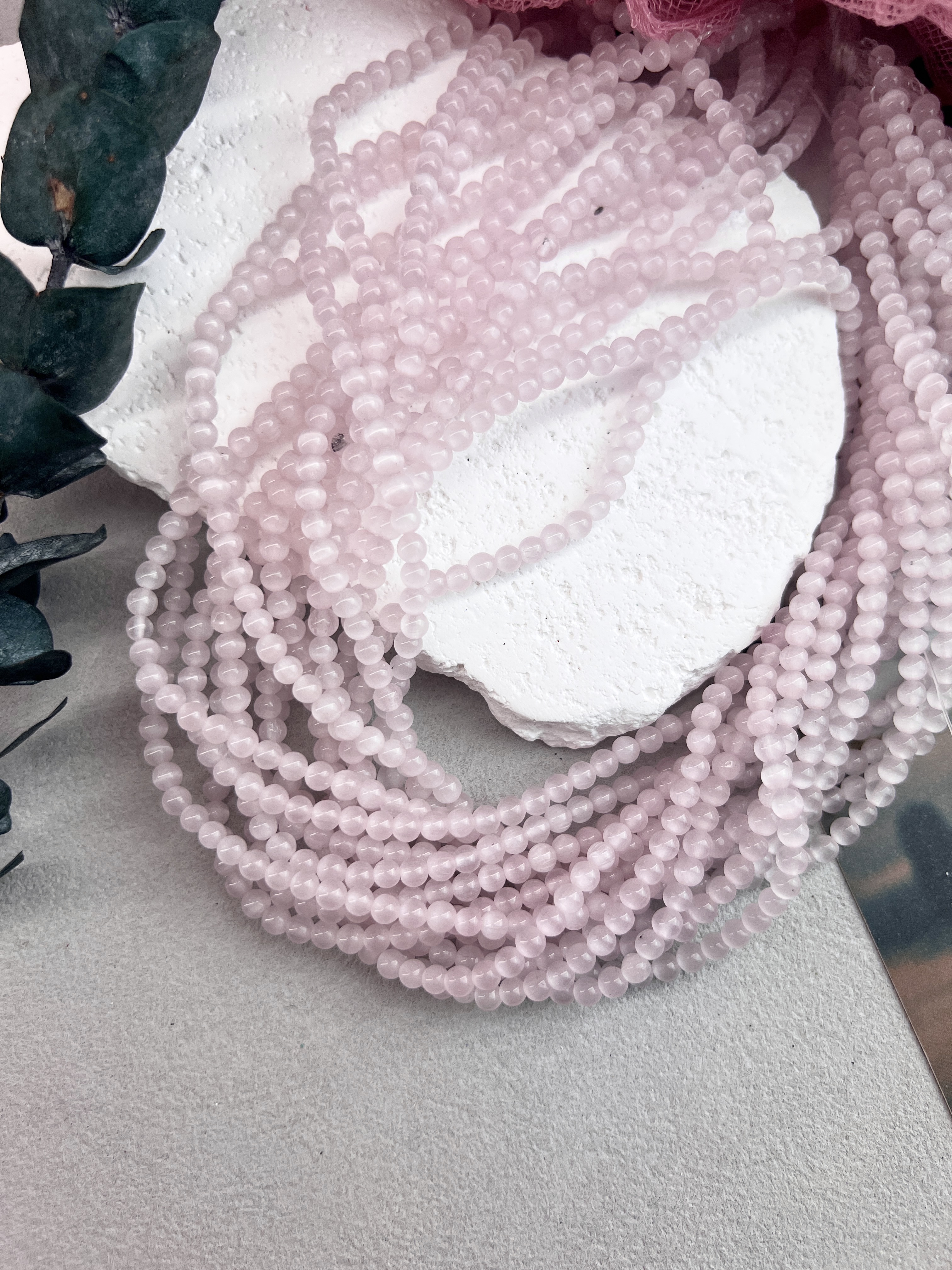 Круглые бусины синтетического кошачьего глаза 4 мм с красивыми переливами розового цвета. Продаются на нити или россыпью. Подходят для создания украшений ручной работы. Не вызывают аллергии, не выцветают.