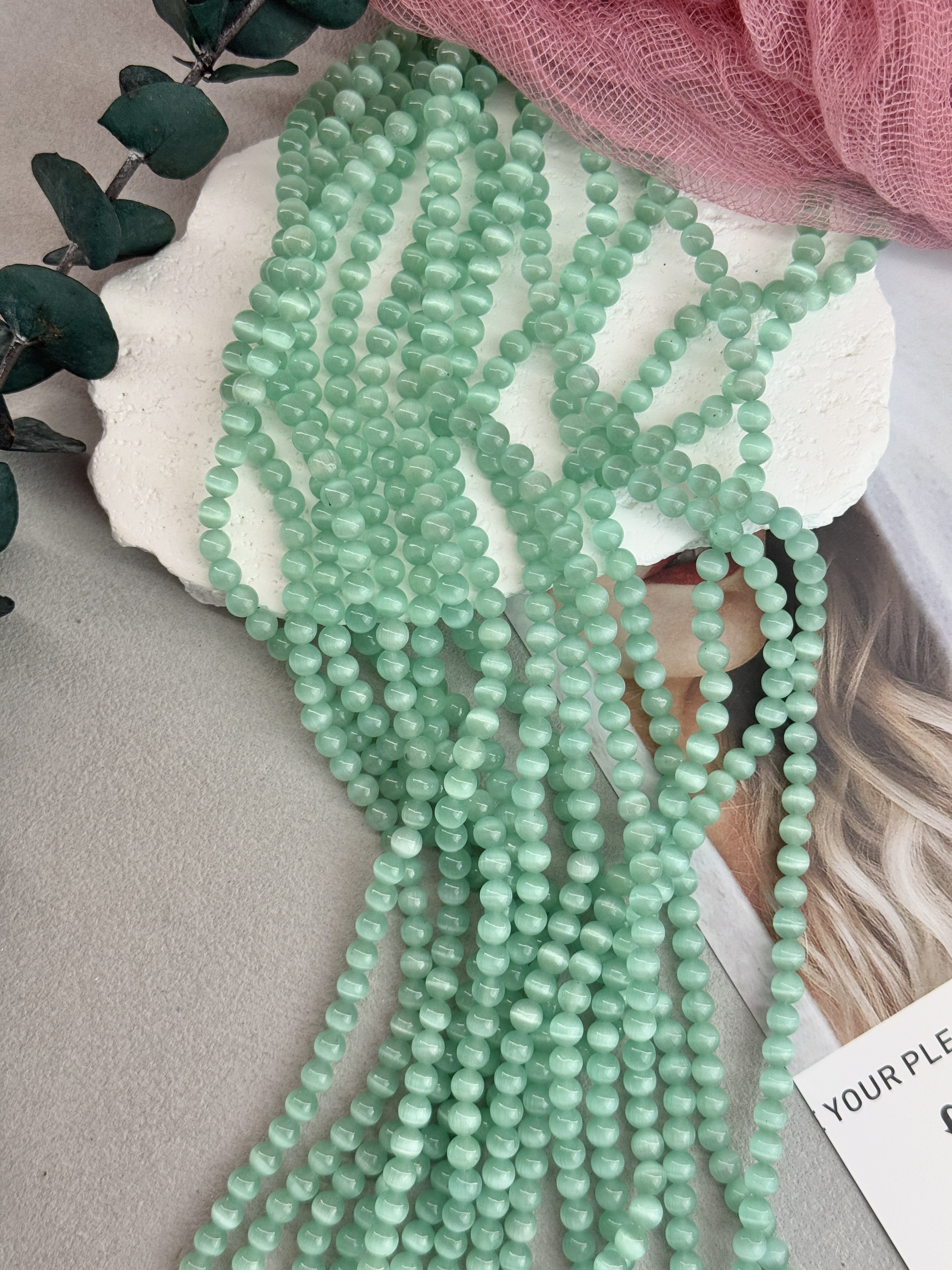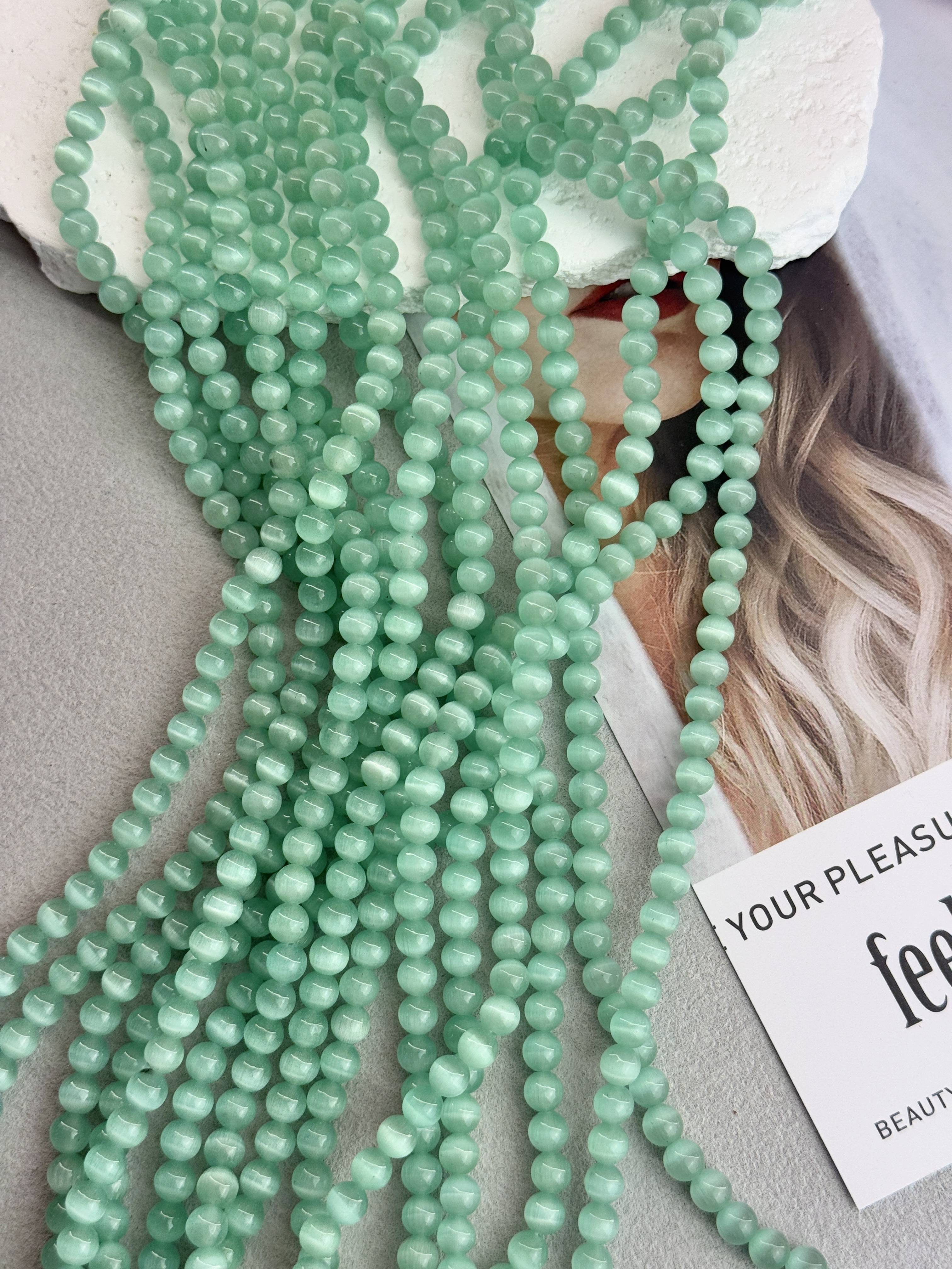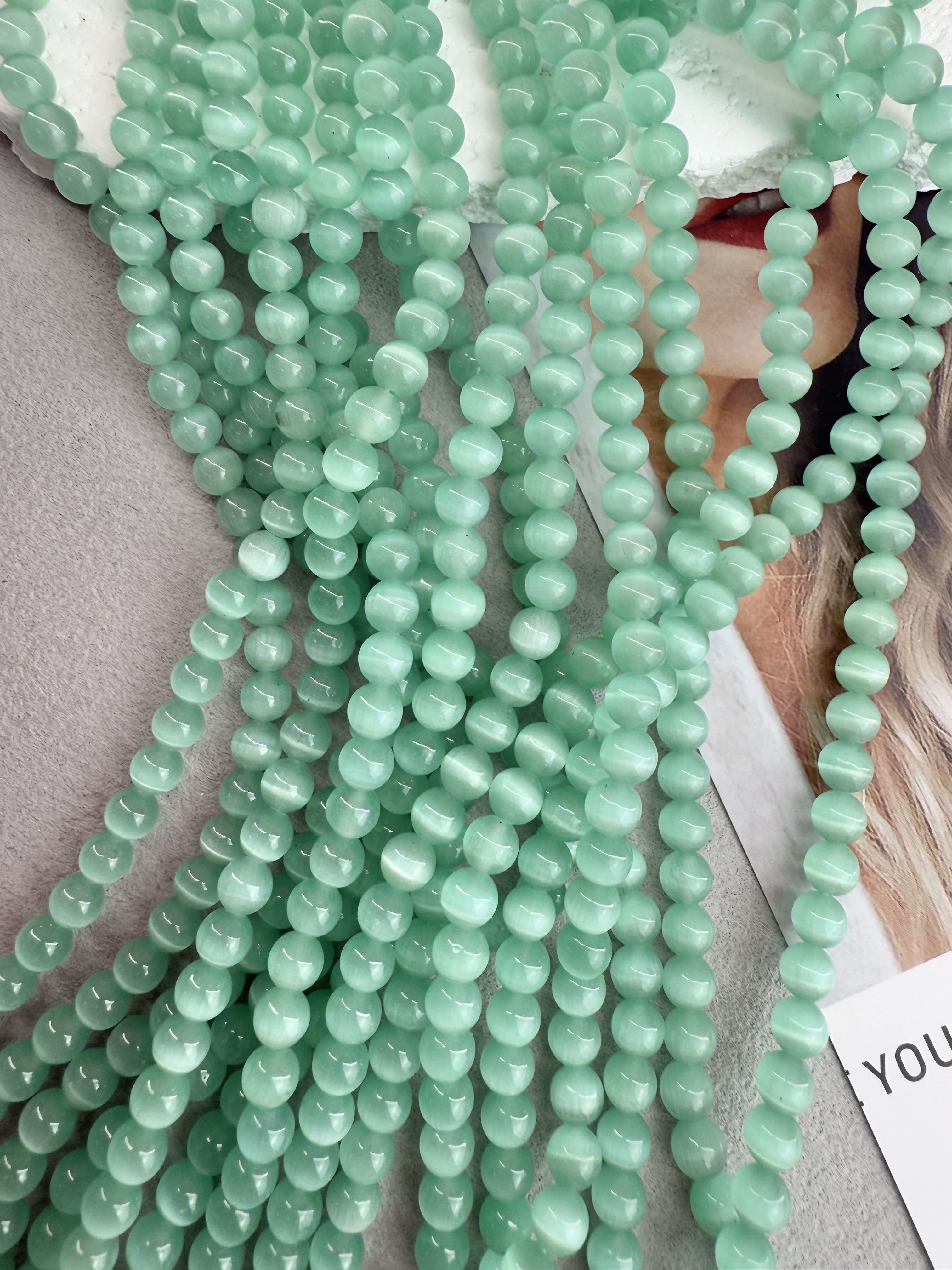 Крупные бусины синтетического кошачьего глаза 6 мм с красивыми переливами бирюзового цвета. Продаются на нити или россыпью. Подходят для создания украшений ручной работы. Не вызывают аллергии, не выцветают.