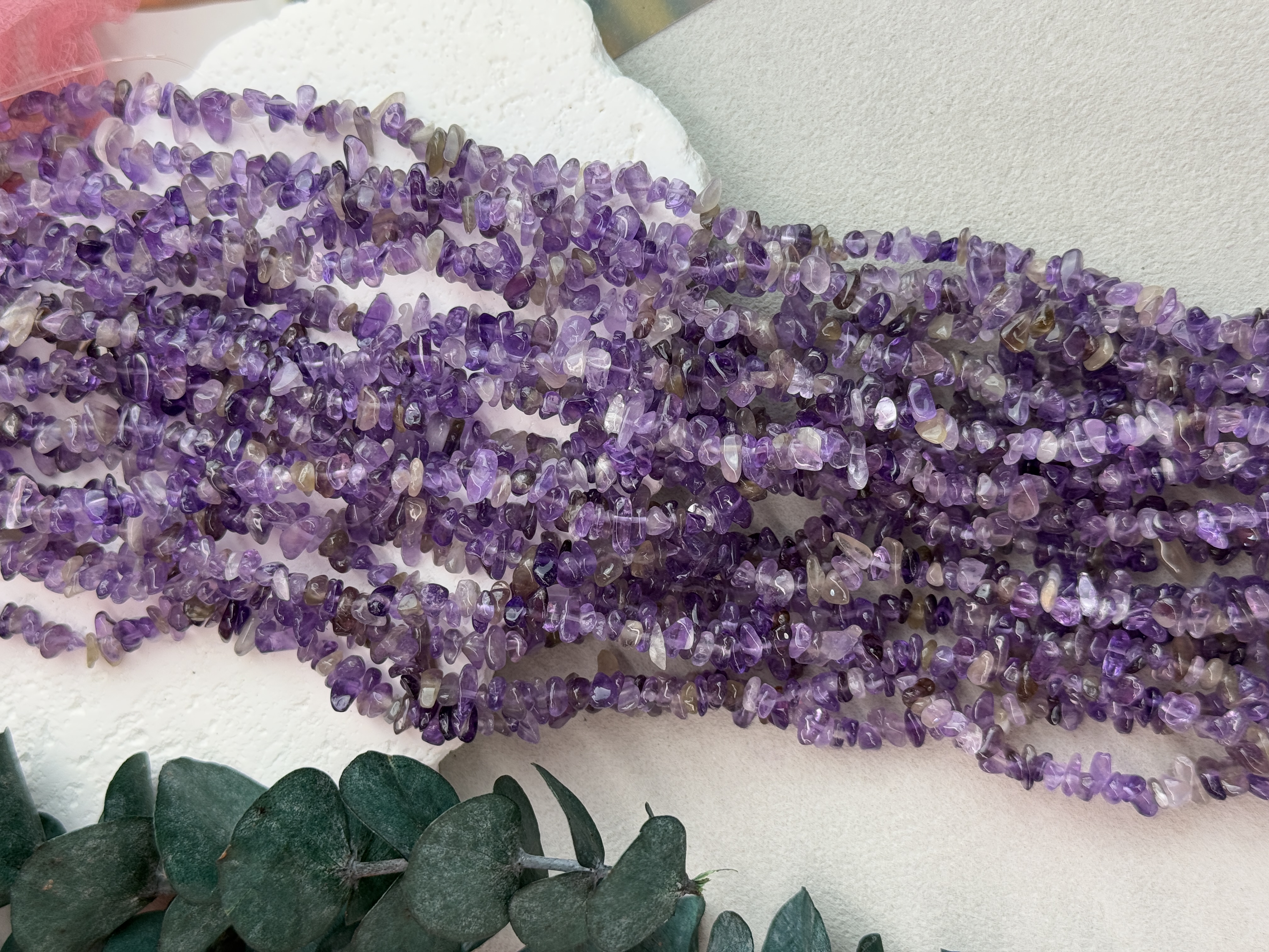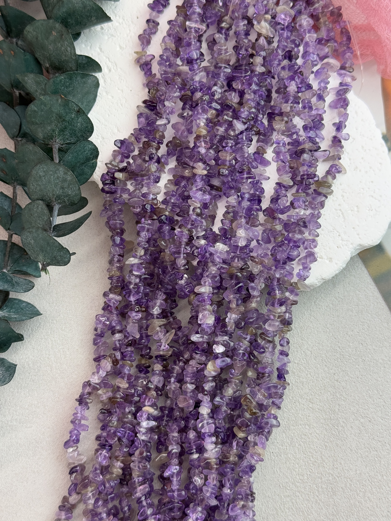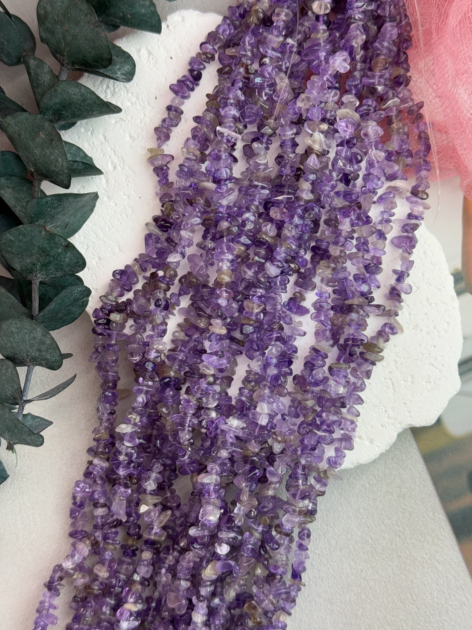 Бусины произвольной формы из натурального аметиста. Размер бусин (примерный) 5-3 мм. Продается россыпью или на нити длиной 80 см (нить иногда рвется и мы меняем фасовку на россыпь). Форма всех бусин разная, неопределенная (галька).