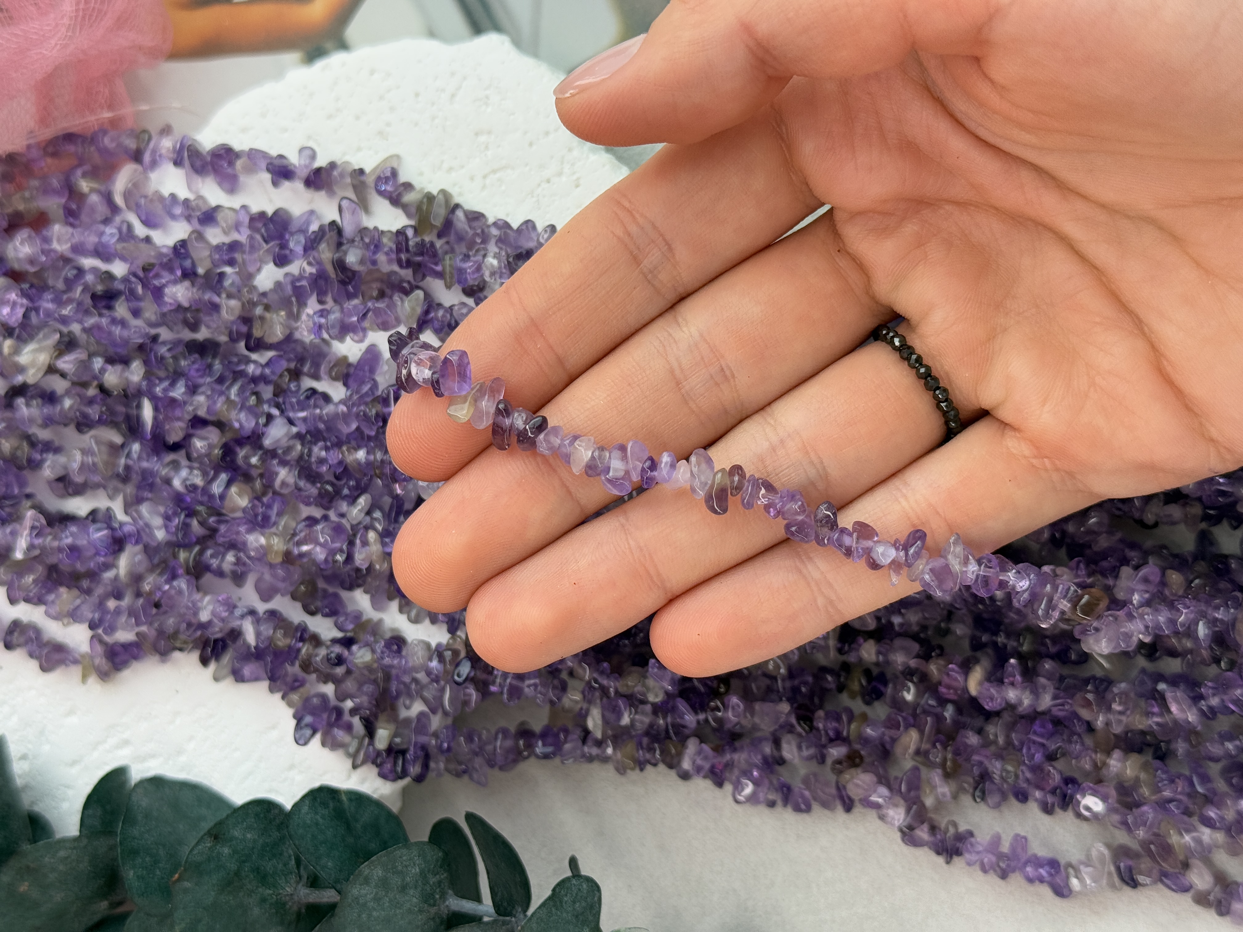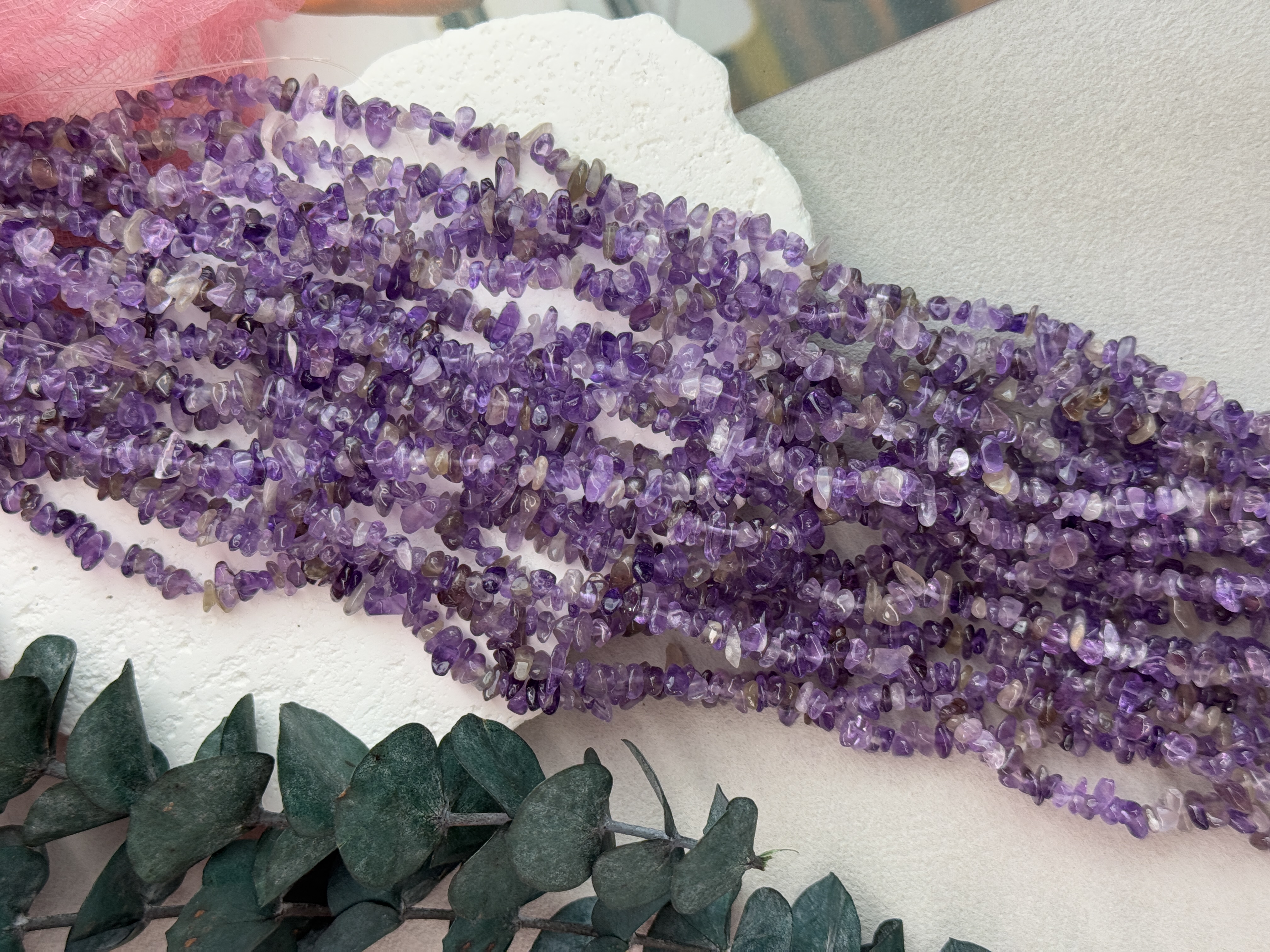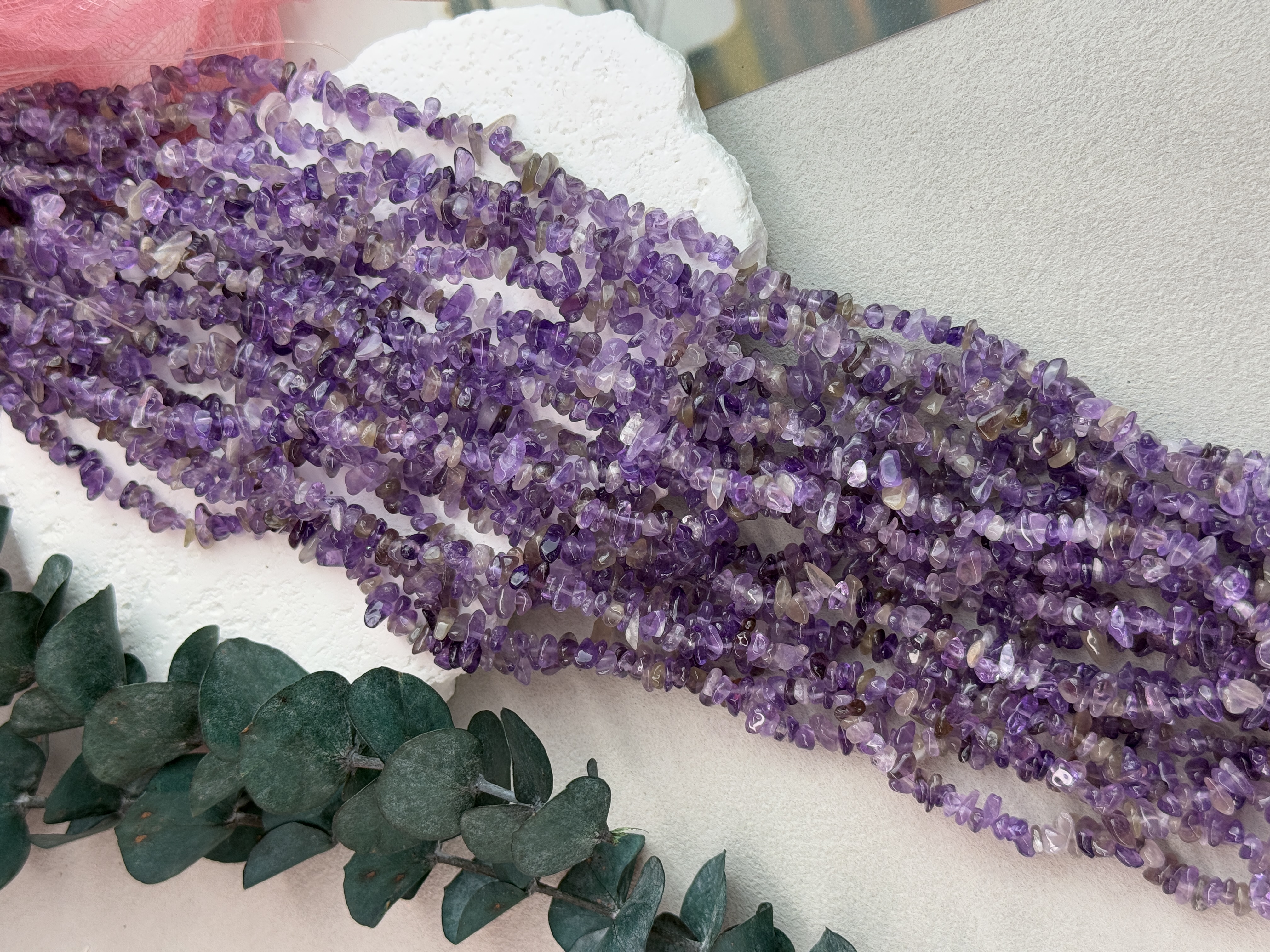 Бусины произвольной формы из натурального аметиста. Размер бусин (примерный) 5-3 мм. Продается россыпью или на нити длиной 80 см (нить иногда рвется и мы меняем фасовку на россыпь). Форма всех бусин разная, неопределенная (галька).