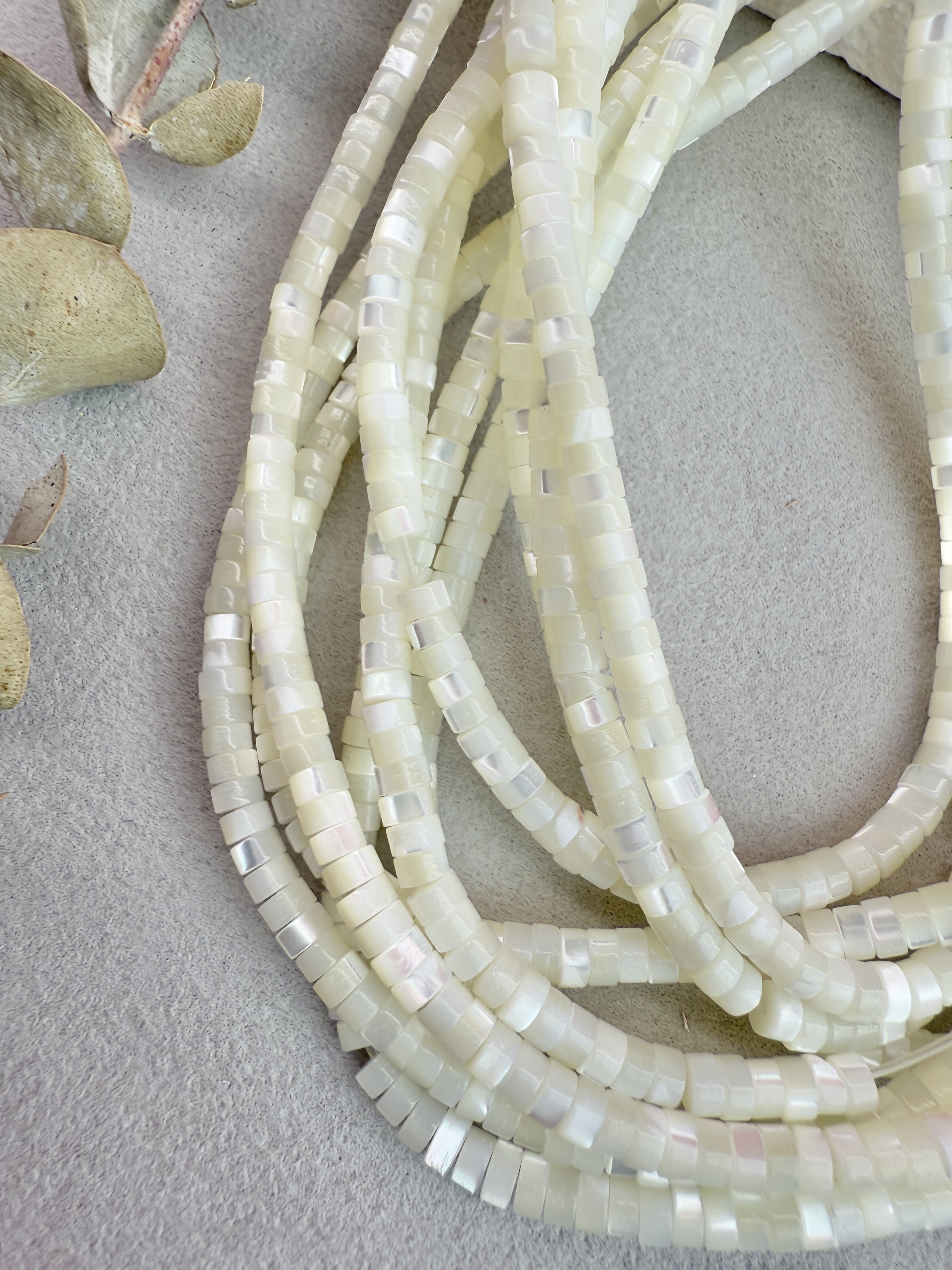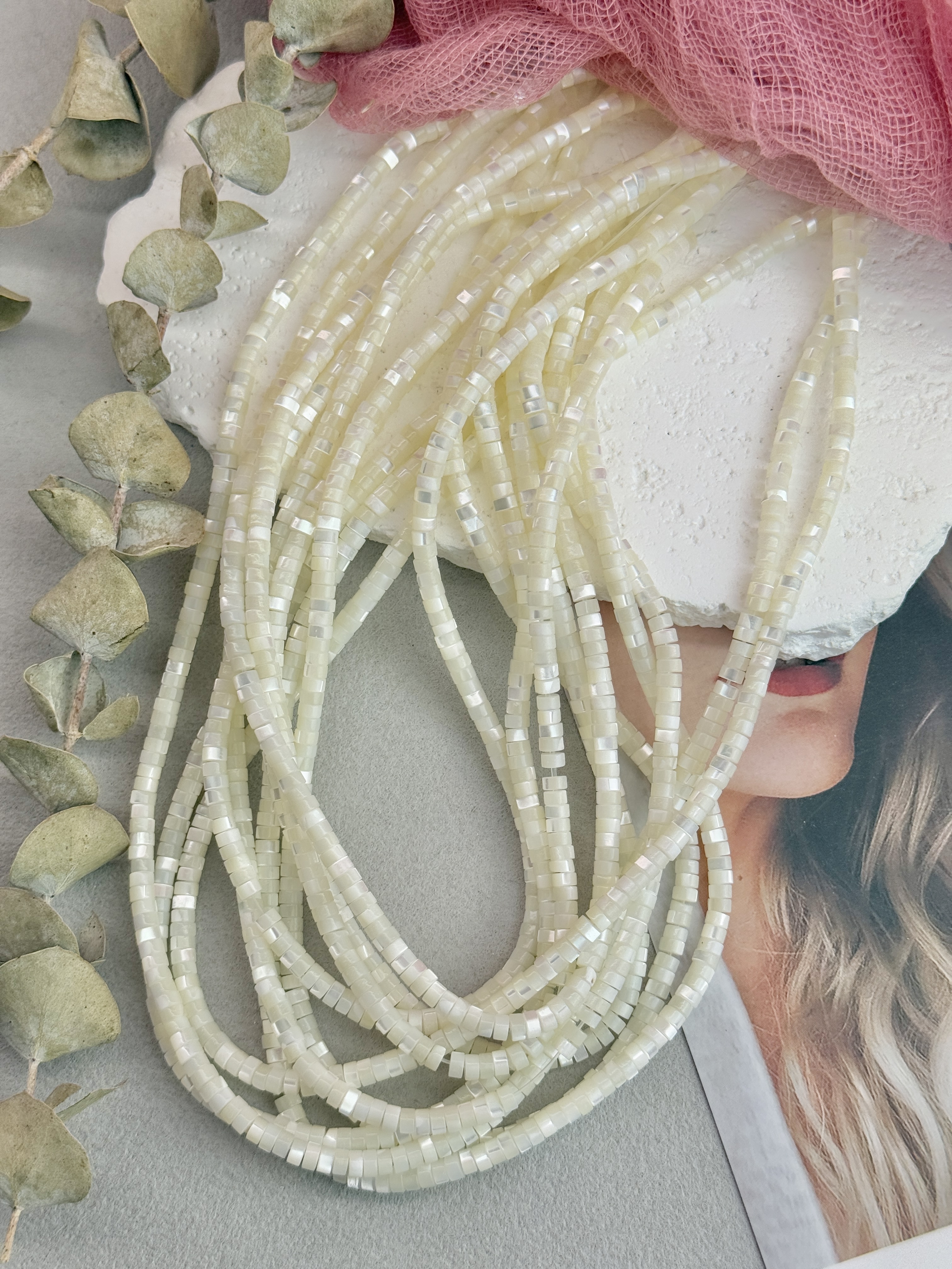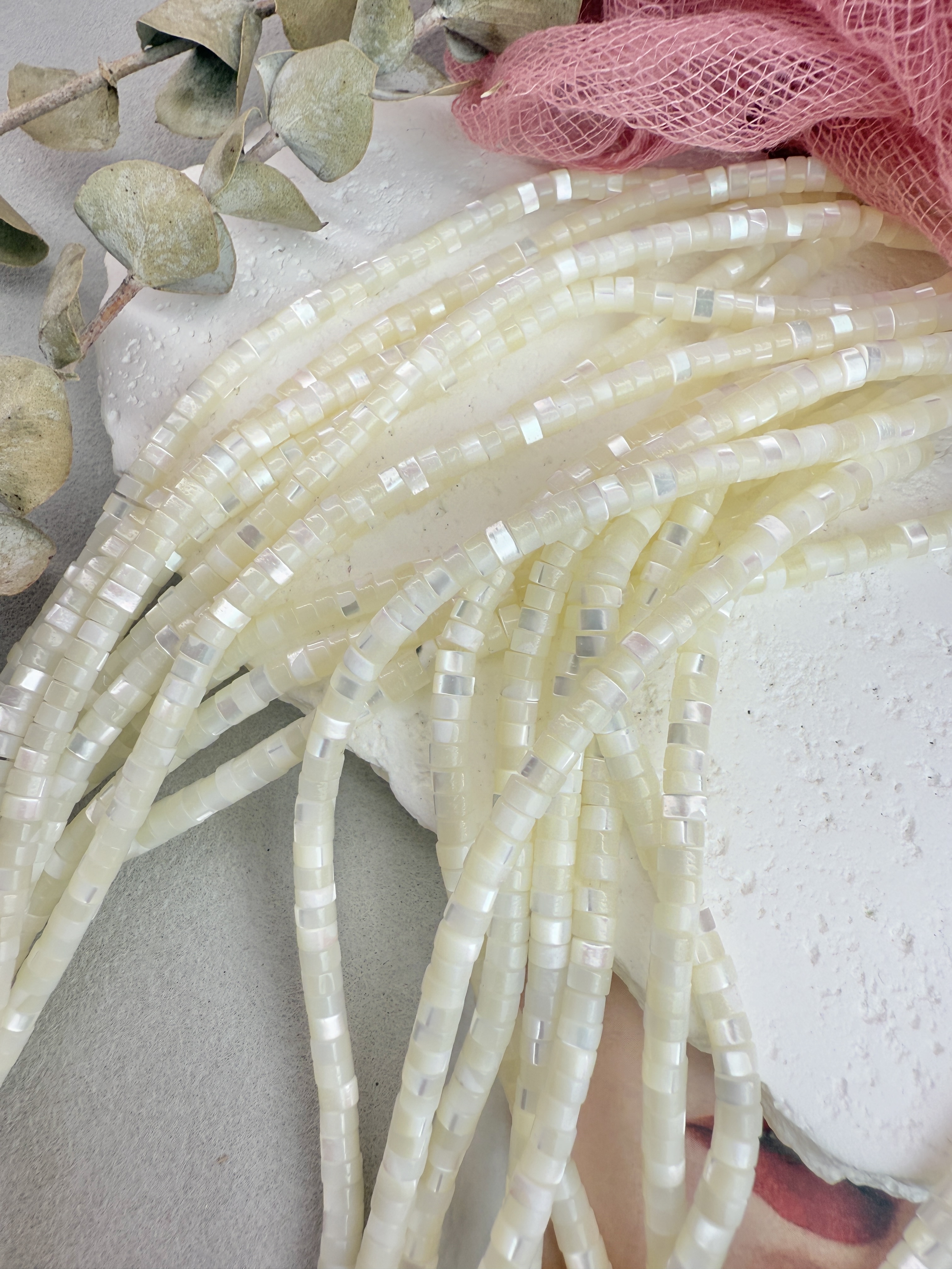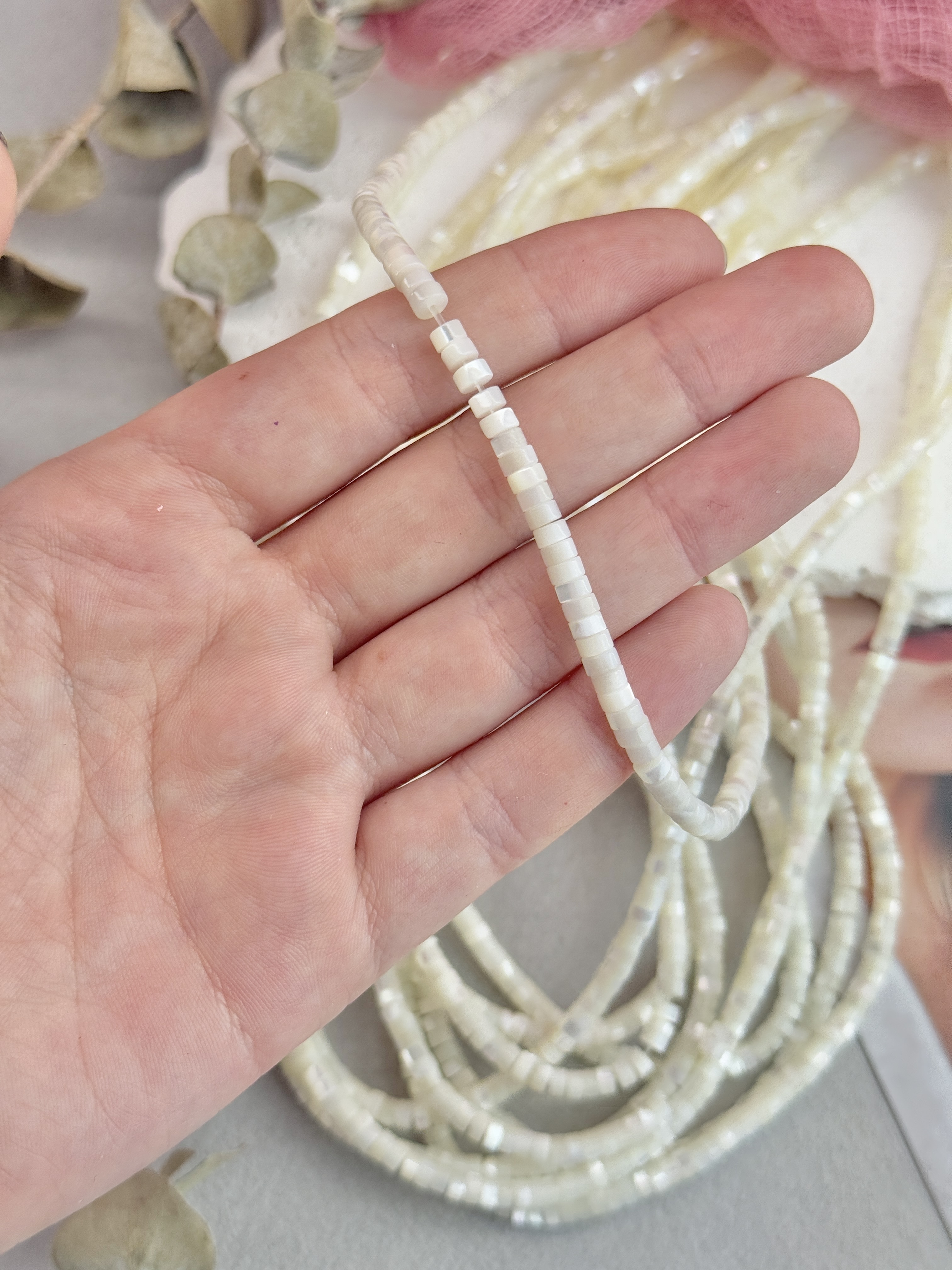 Бусины из натурального перламутра в форме диска. Идеальный материал для сборки украшений ручной работы: бусины не выцветают, гипоаллергенны, долговечны. Продаются нитью 40 см ( может отличаться на несколько сантиметров в зависимости от партии). Размер бусин 4*2 мм (могут отличаться друг от друга на несколько мм).