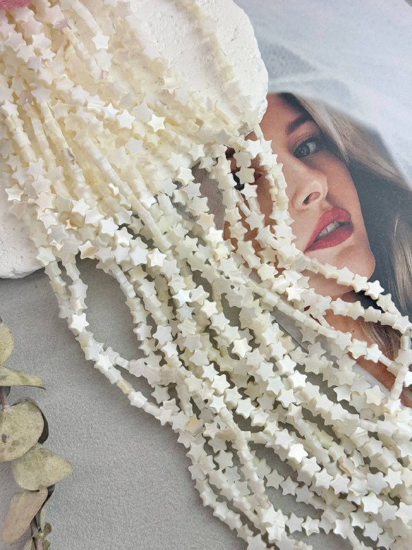 Бусины из натурального перламутра в форме звездочки. Идеальный материал для сборки украшений ручной работы: бусины не выцветают, гипоаллергенны, долговечны. Продаются нитью 38 см ( может отличаться на несколько сантиметров в зависимости от партии). Размер бусин 6 мм (могут отличаться друг от друга на несколько мм).