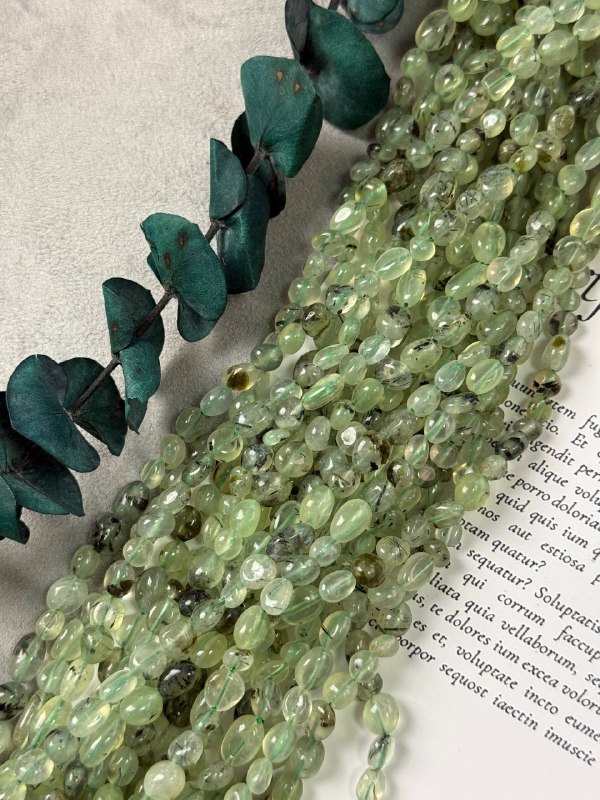 Бусины произвольной формы из натурального зеленого пренита. Размер бусин (примерный) 6-8 мм. Продается россыпью или на нити длиной 39 см (нить иногда рвется и мы меняем фасовку на россыпь). Форма всех бусин разная, неопределенная (галтовка).