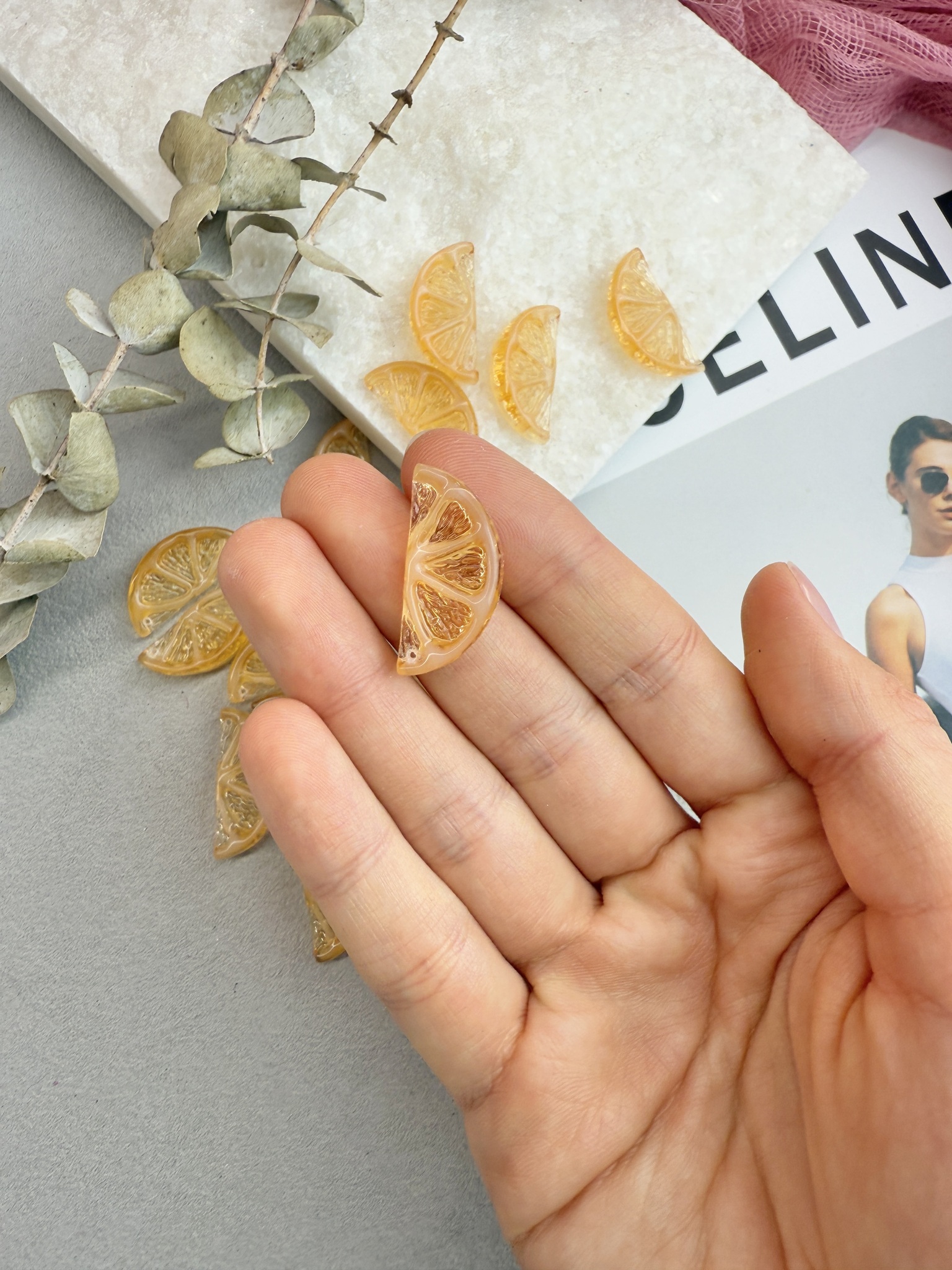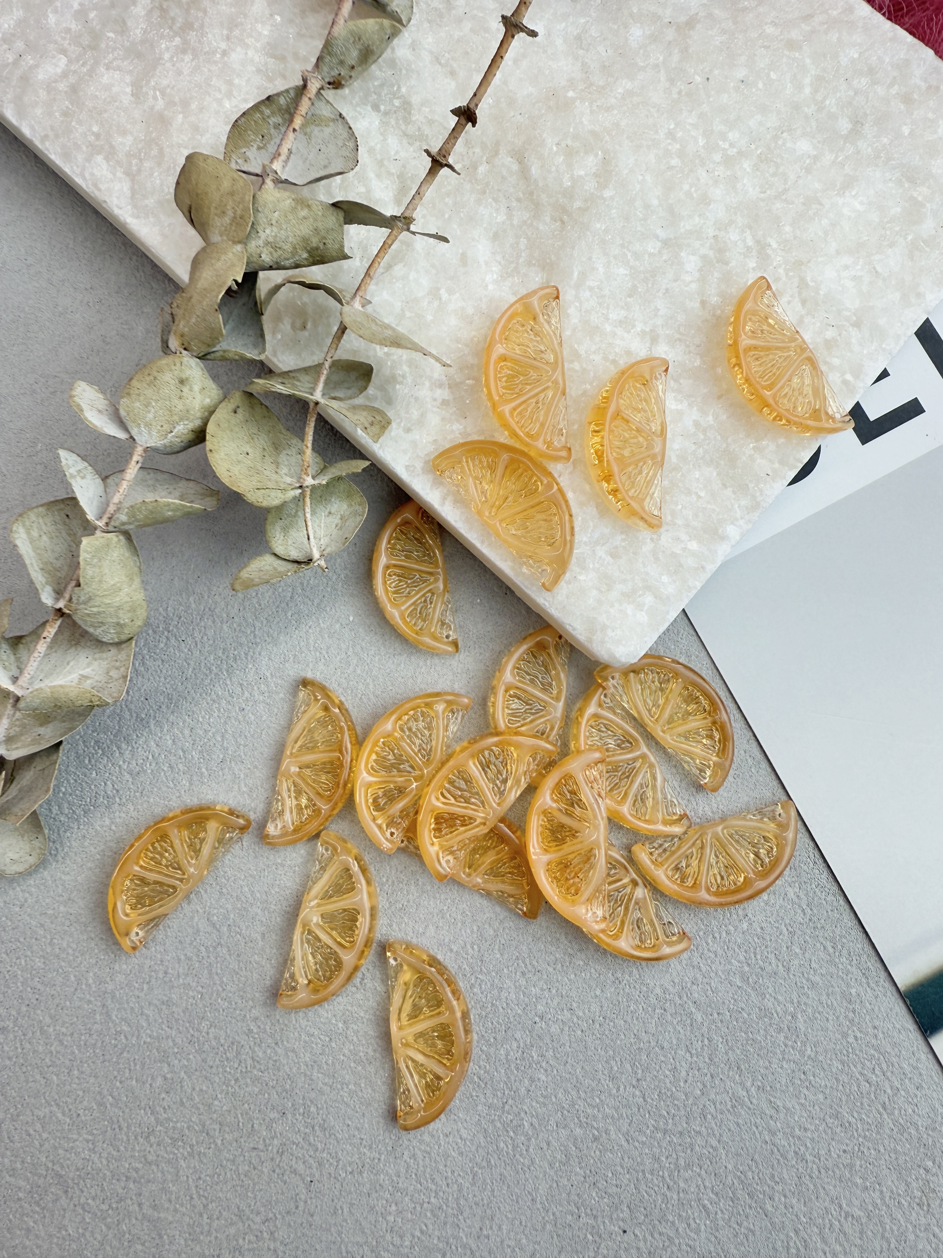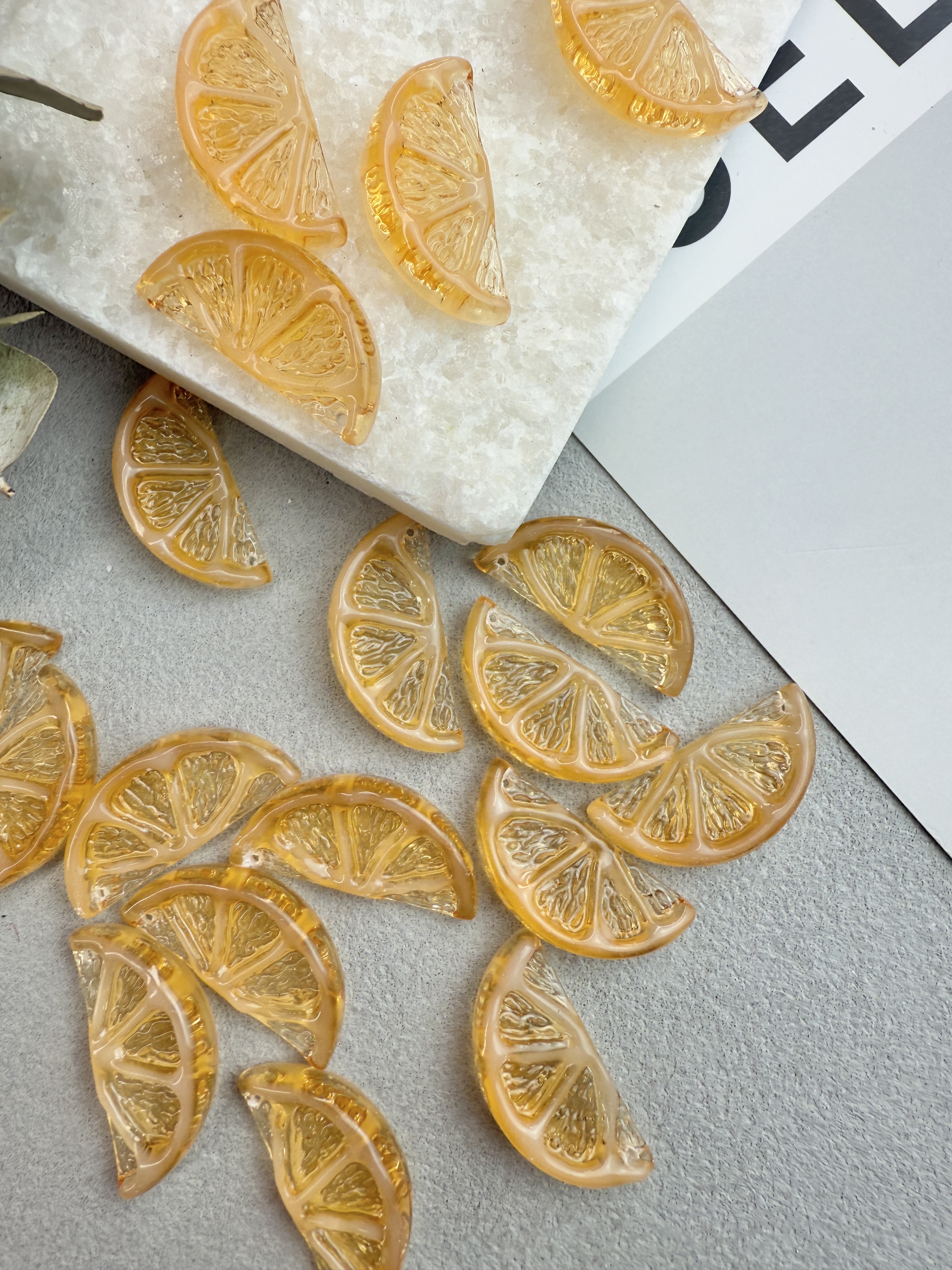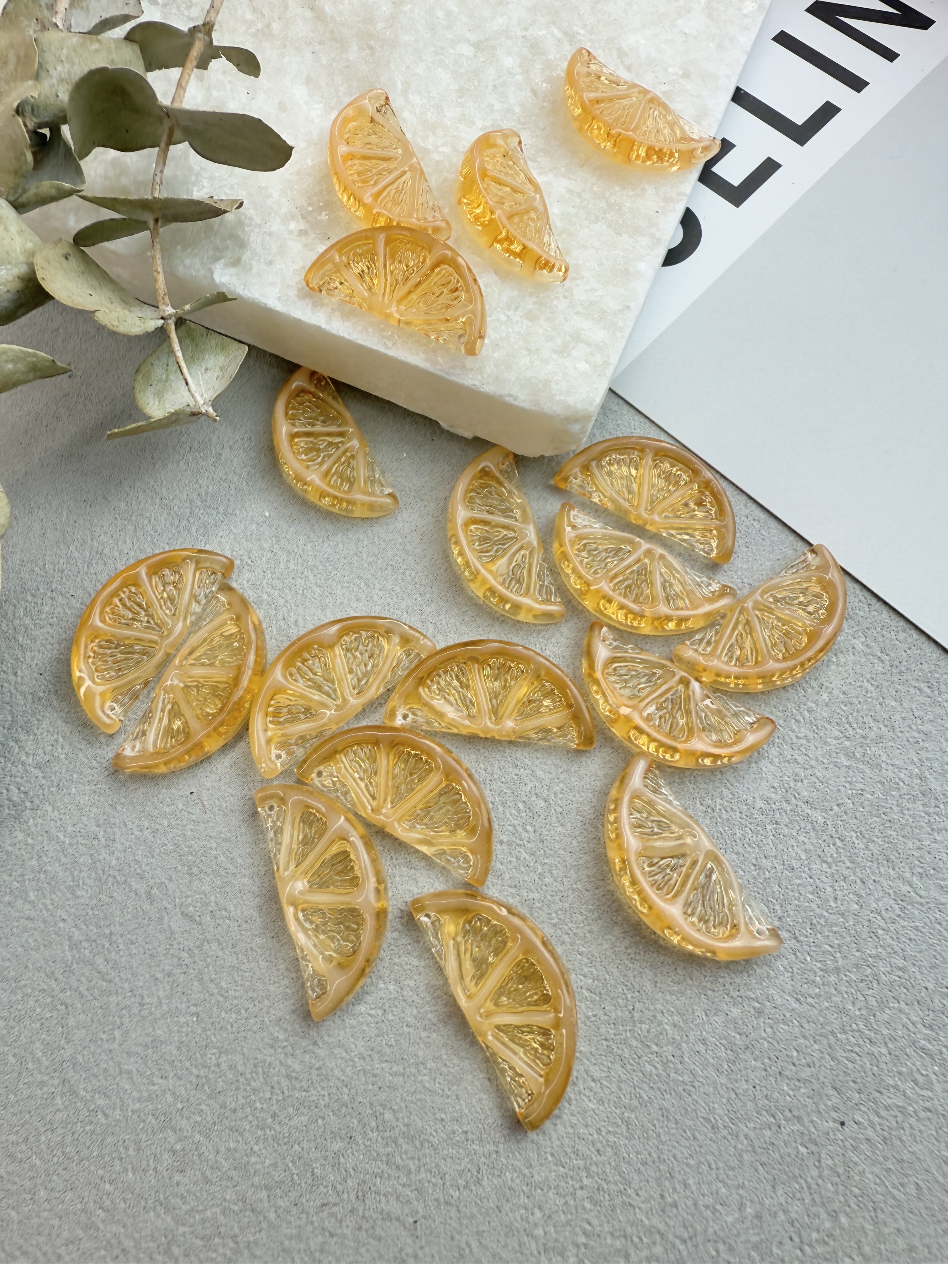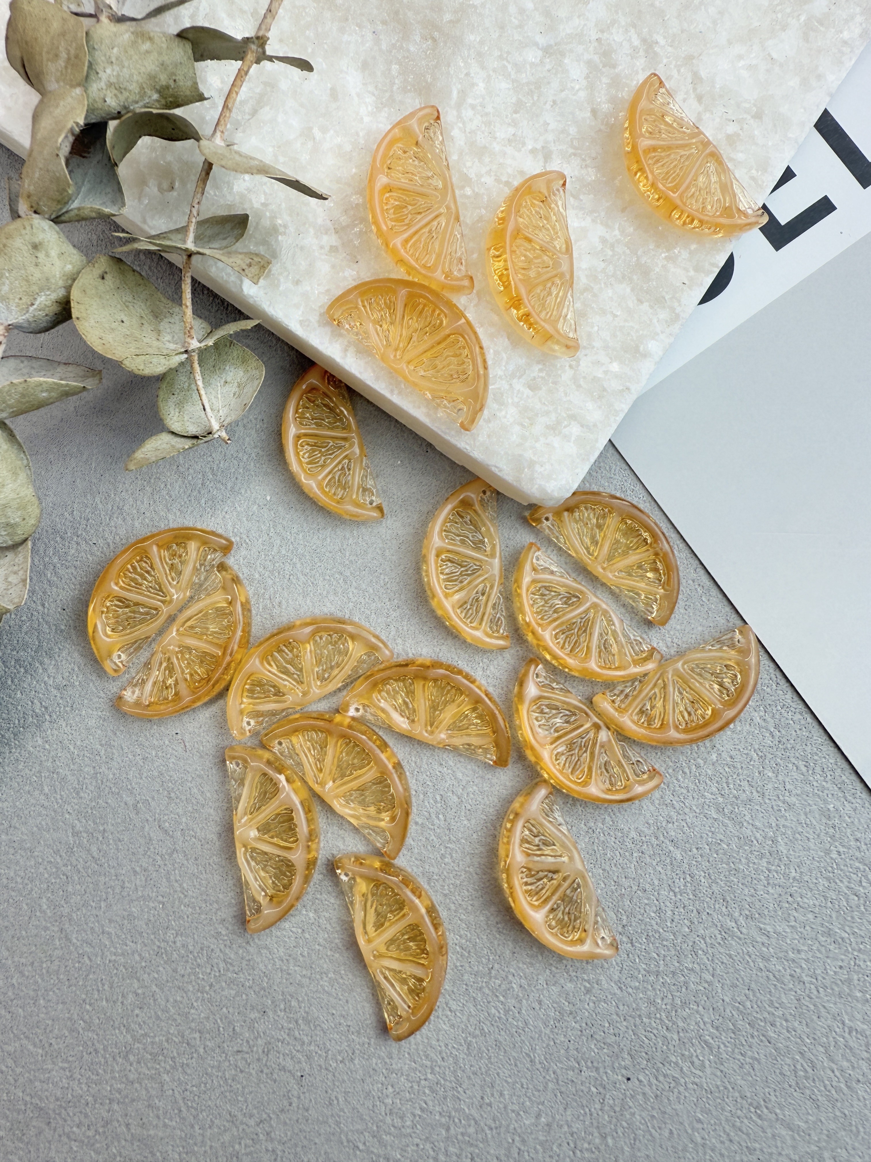 Объемные подвески с фактурой дольки лайма. Выполнены из акрила, размер 23*13 мм. В упаковке 2 штуки.