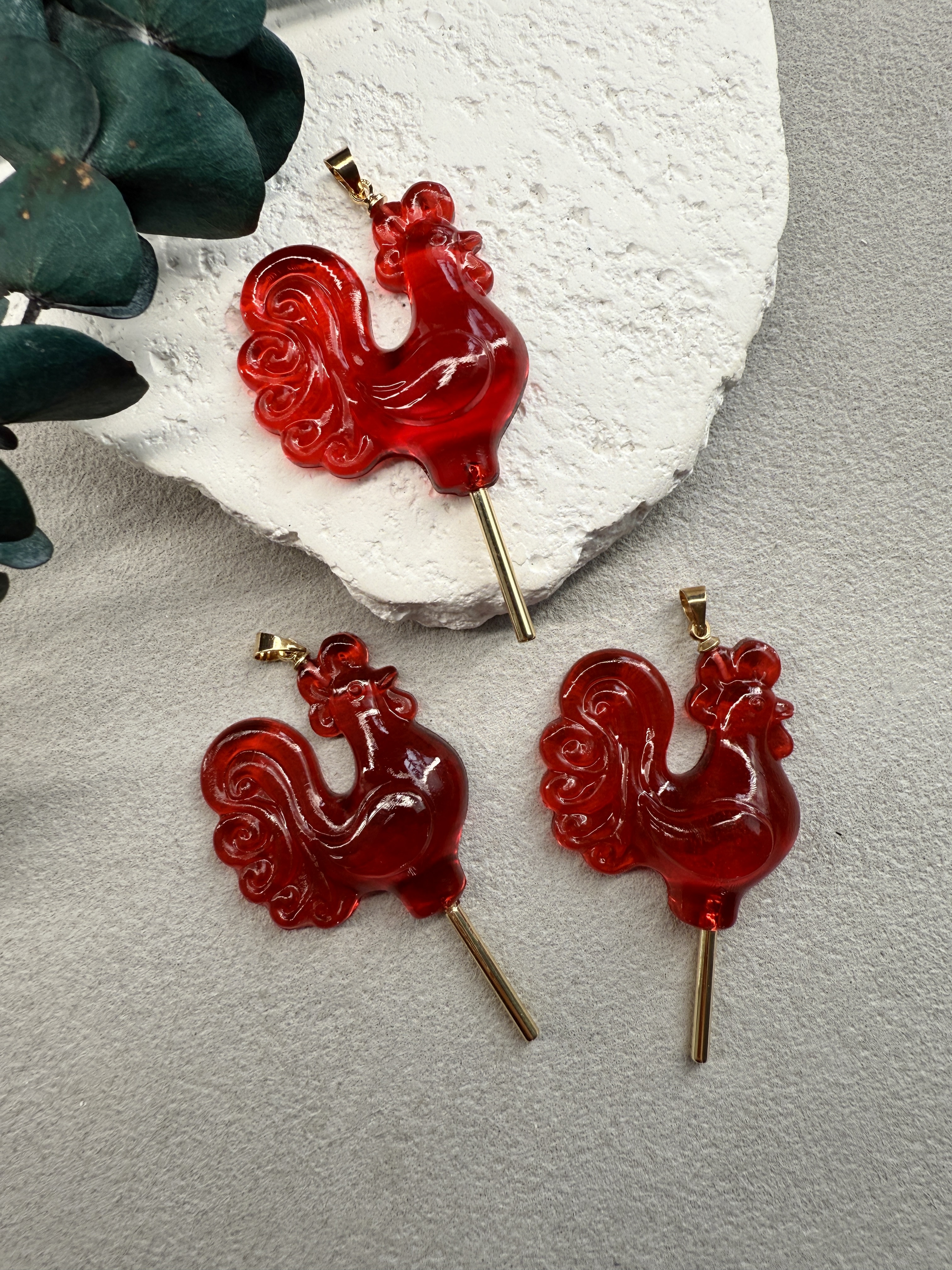 Подвеска "Петушок на палочке" ручной работы, бейл и палочка- позолота 14к, алый