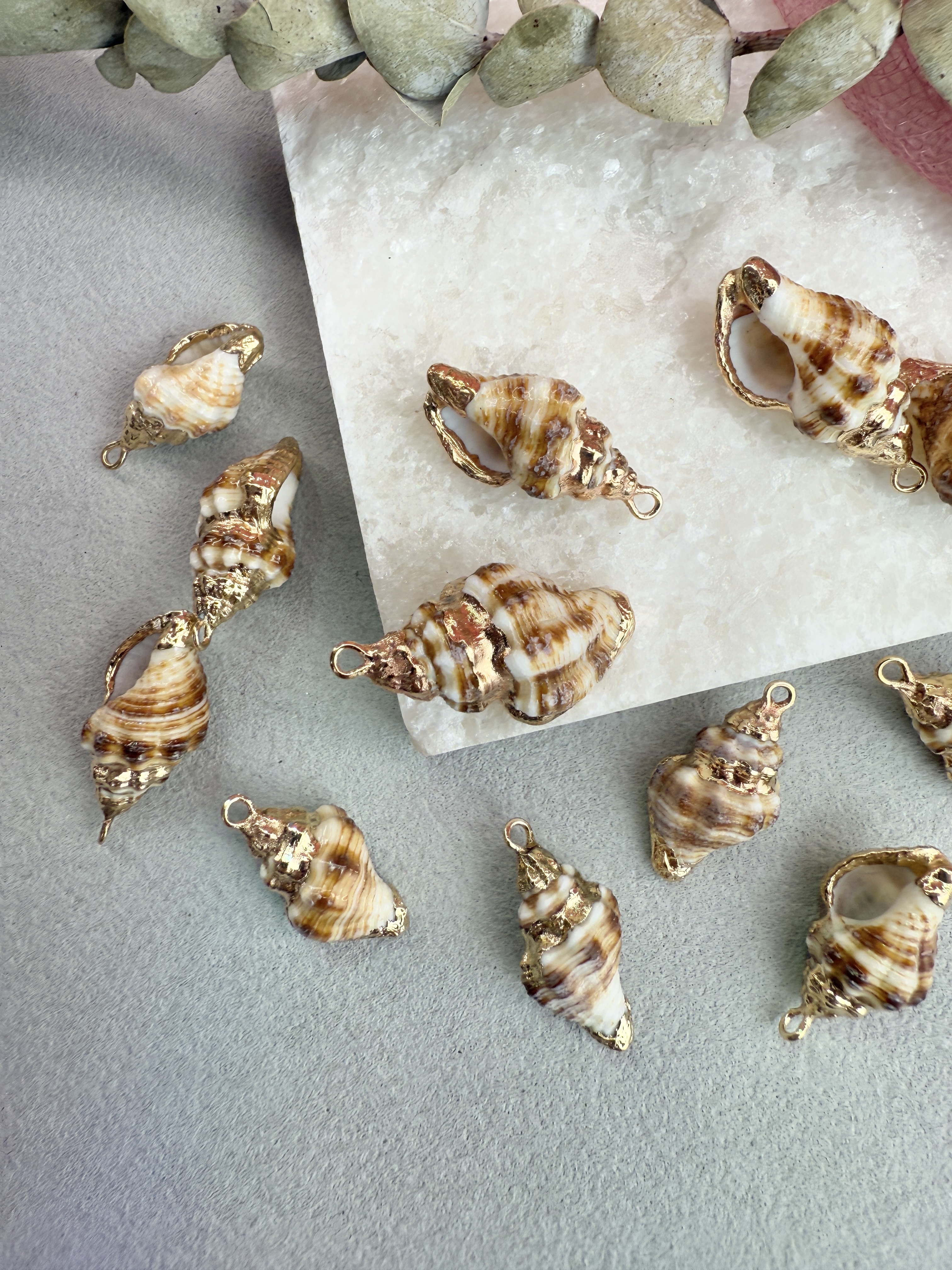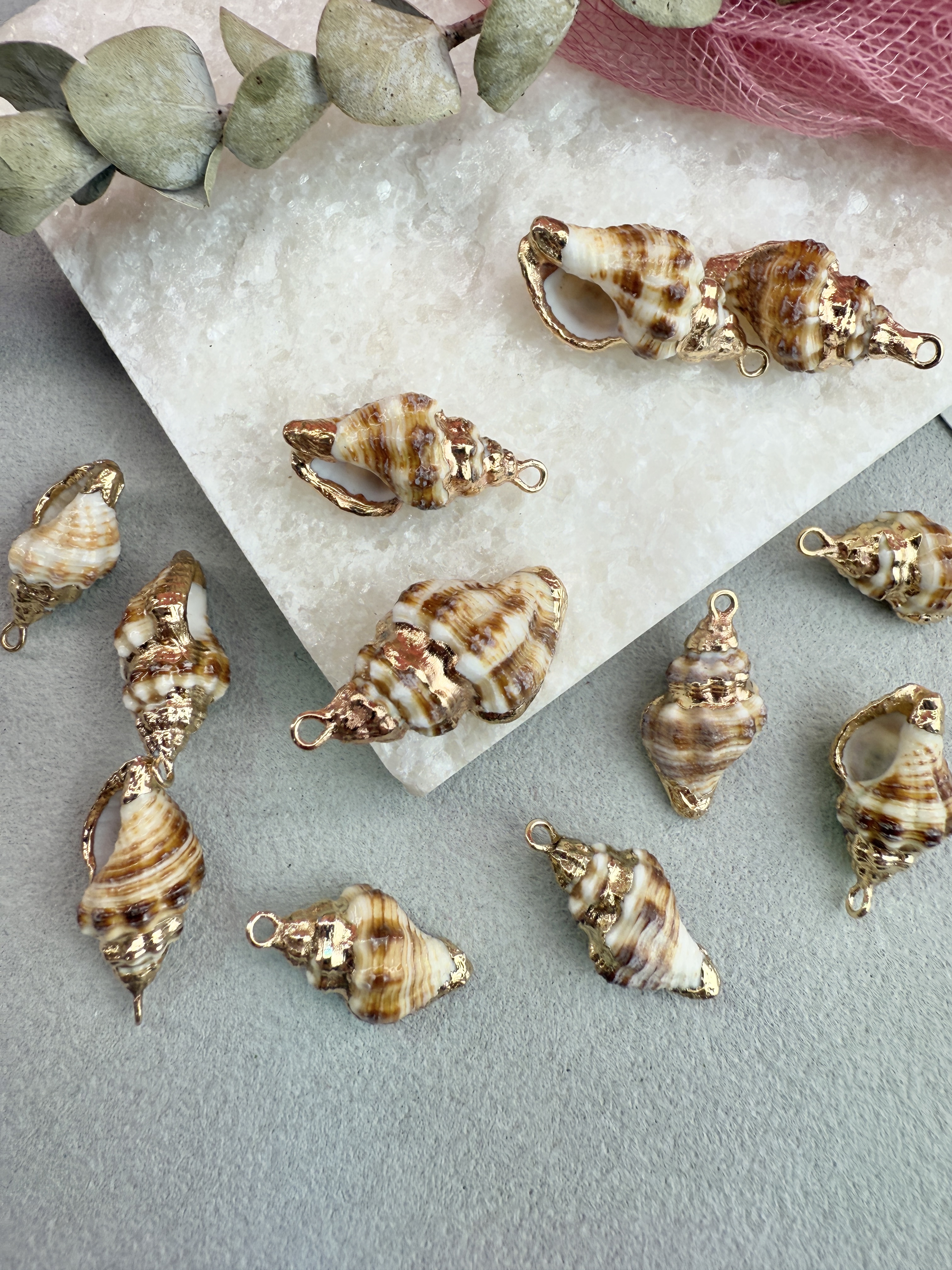 Подвеска ракушка с гальваническим покрытием некоторых участков. Размер ракушки 14-28 мм (выбирается любой случайный набор). Ракушки в наборе могут быть не одинакового размера.