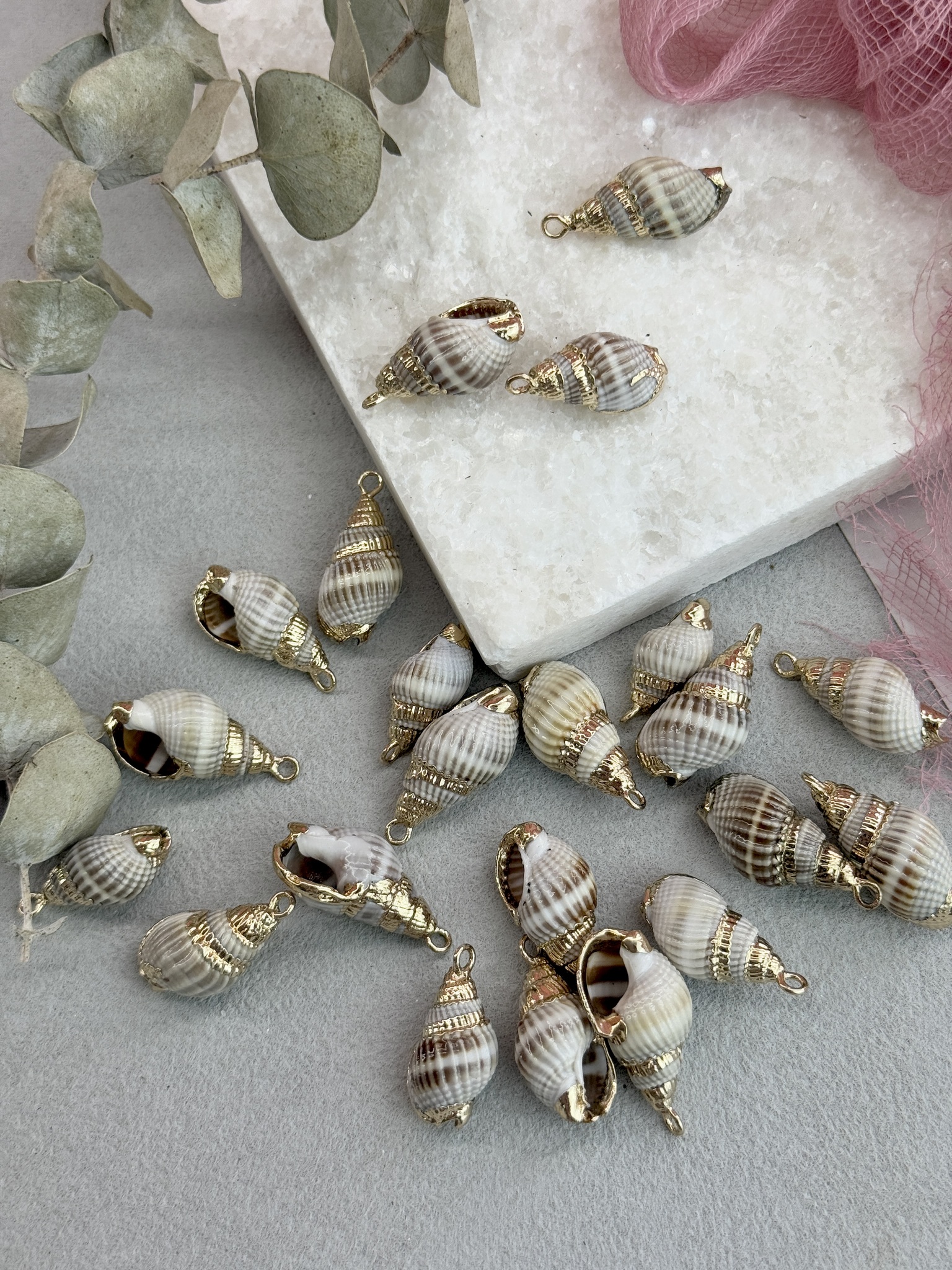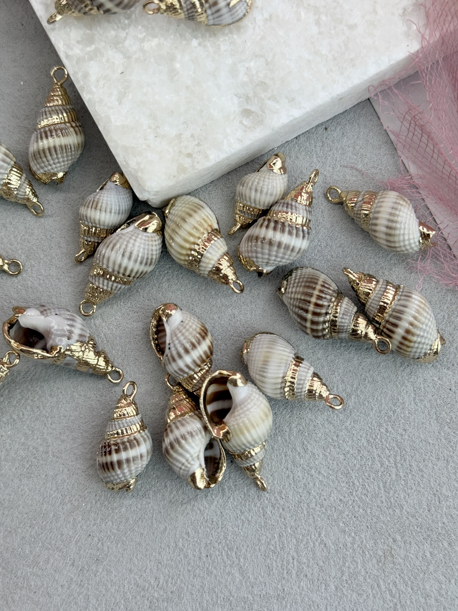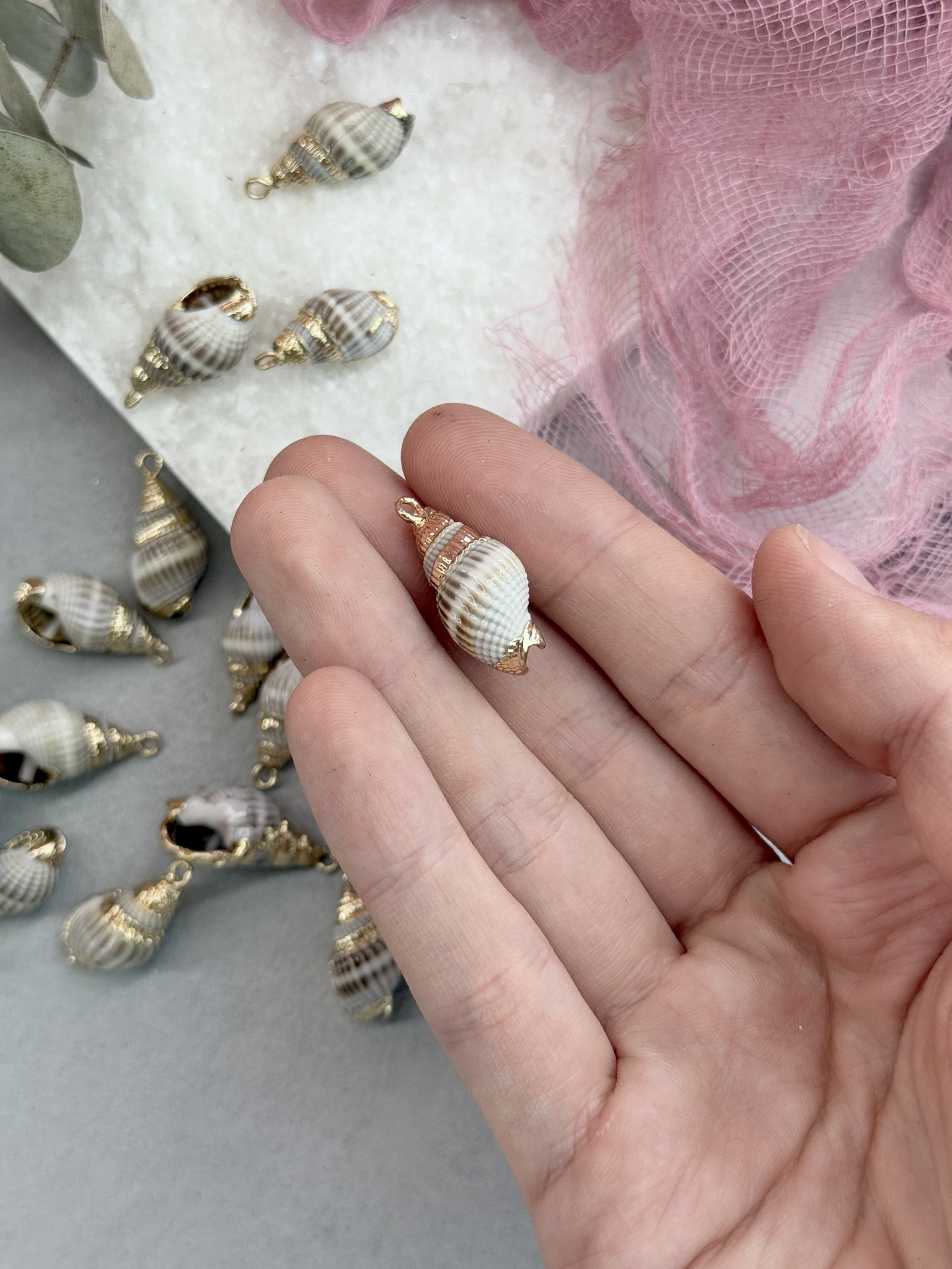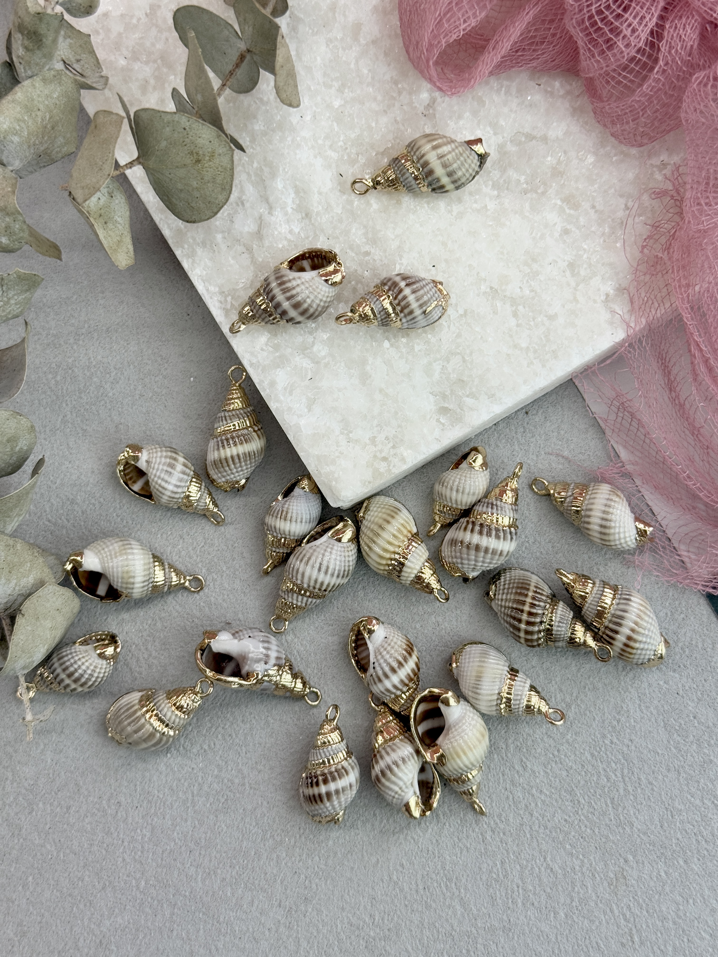 Подвеска ракушка с гальваническим покрытием некоторых участков. Размер ракушки 20-40 мм (выбирается любой случайный набор). Ракушки в наборе могут быть не одинакового размера.