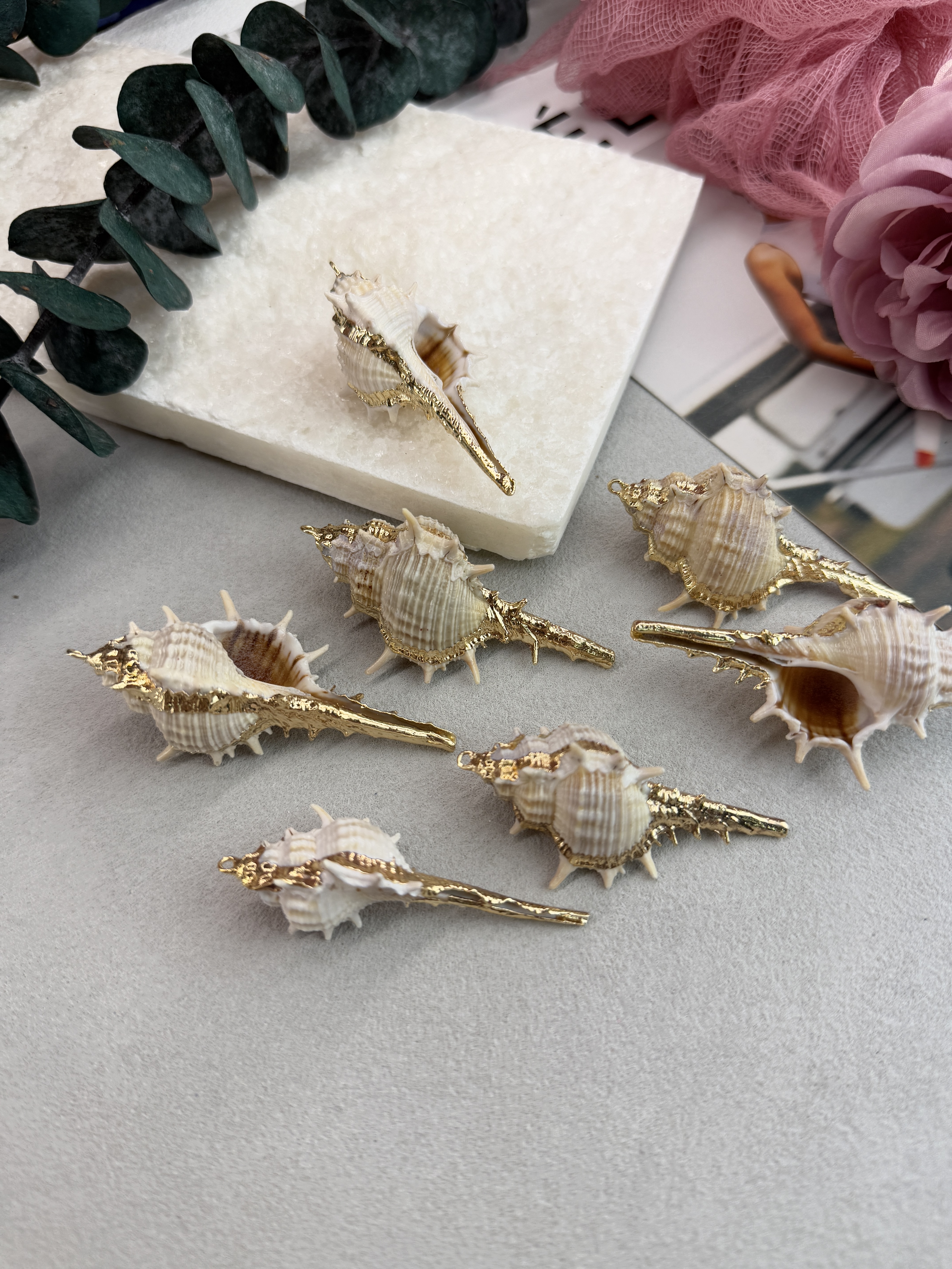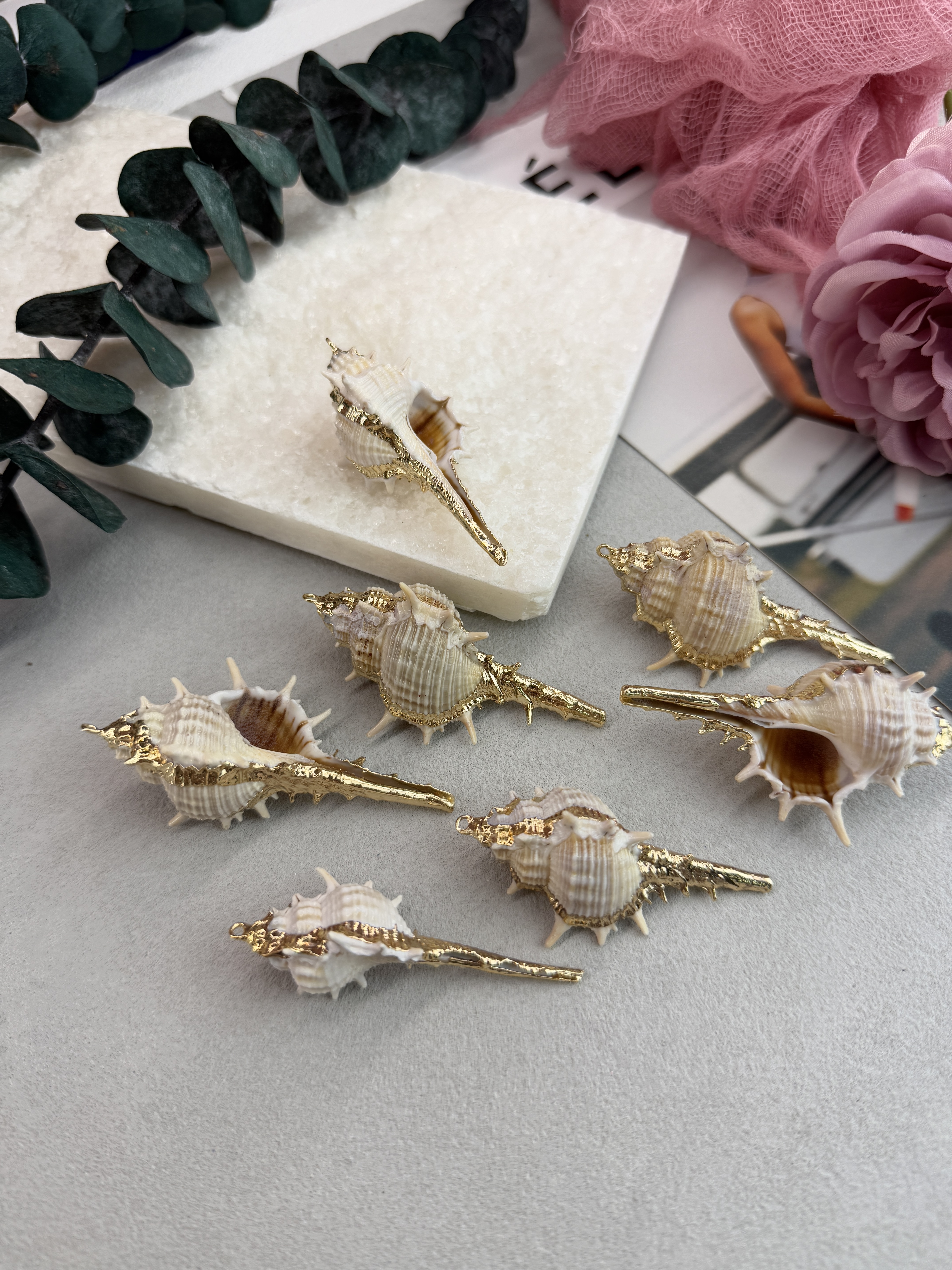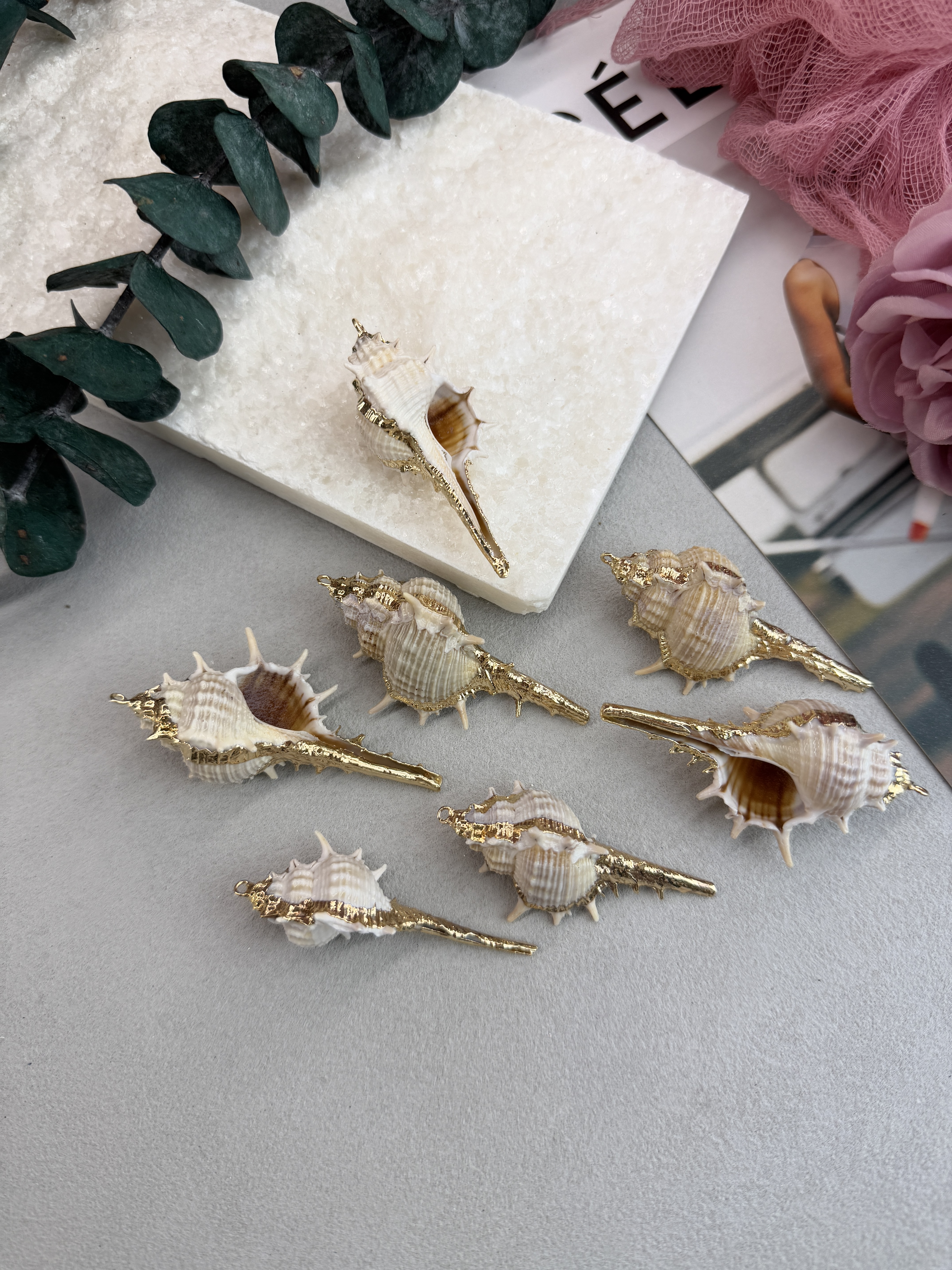 Подвеска ракушка с гальваническим покрытием некоторых участков. Размер ракушки 20-40 мм (выбирается любой случайный набор). Ракушки в наборе могут быть не одинакового размера.