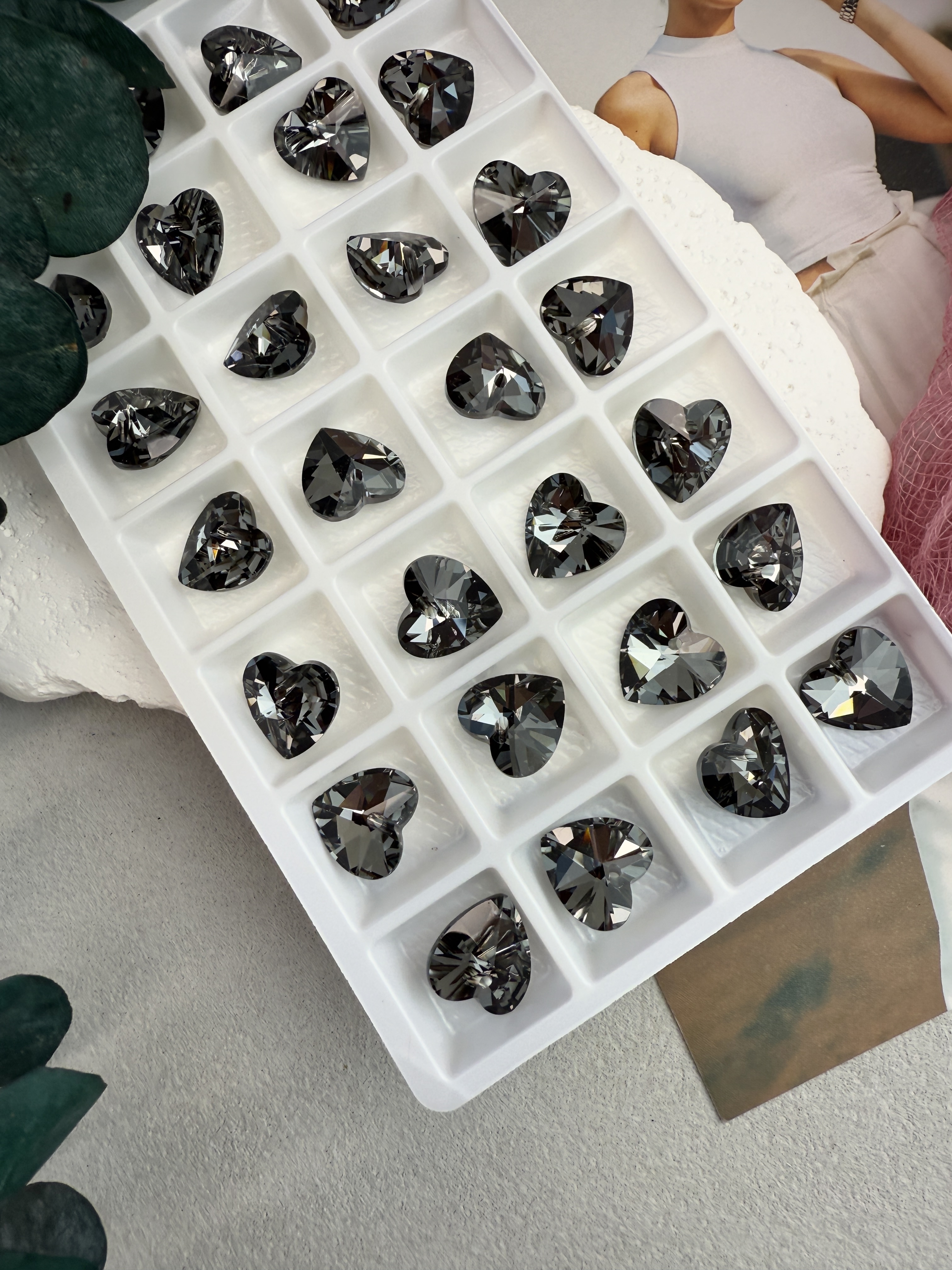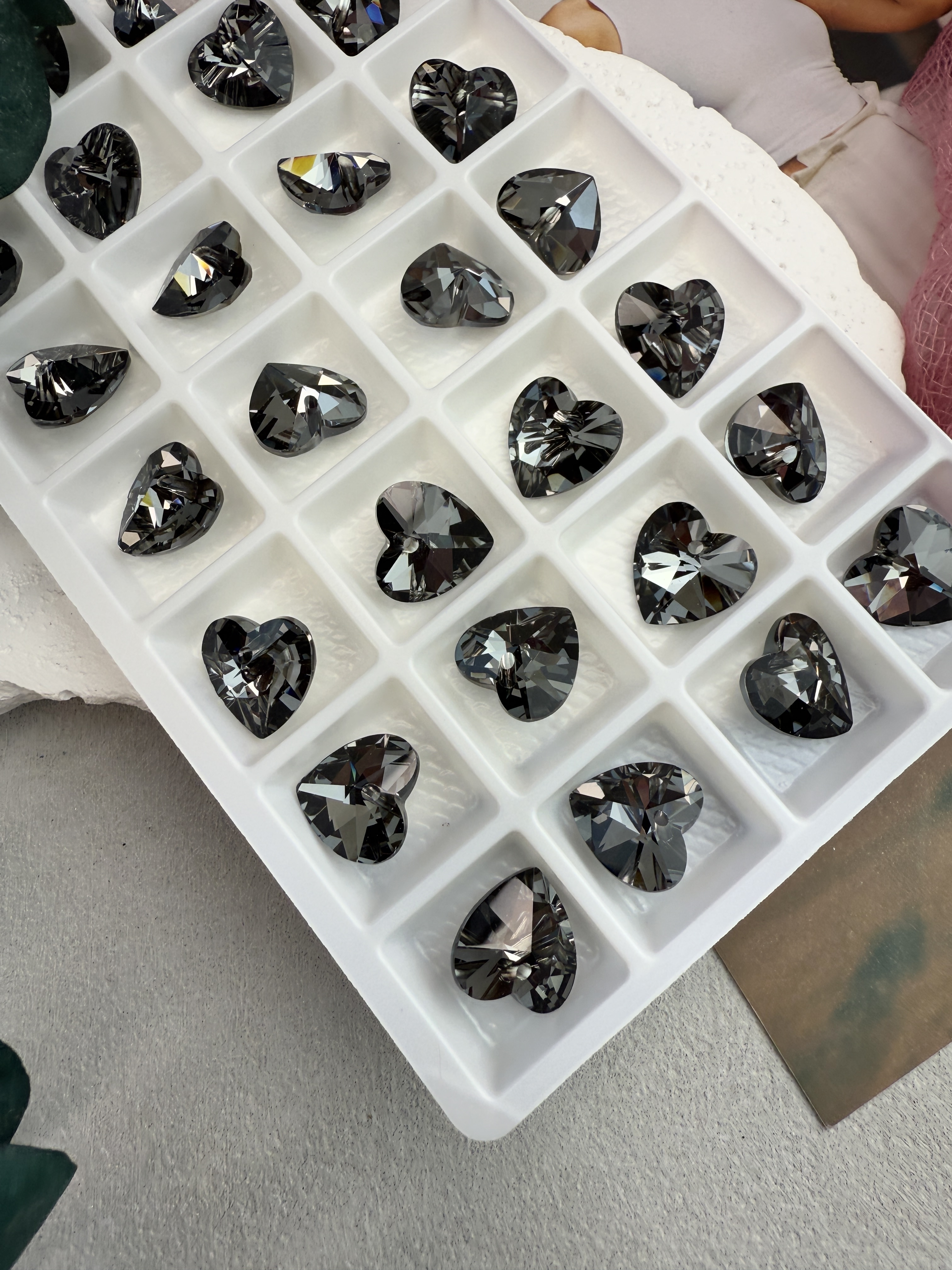Изящная подвеска в виде маленького сердца с гранями. Подвеска выполнена из хрустального стекла (стекло с добавлением свинца для повышения блеска и твердости). Цвет серый. Размер одного сердца 12 мм, в упаковке 2 штуки.