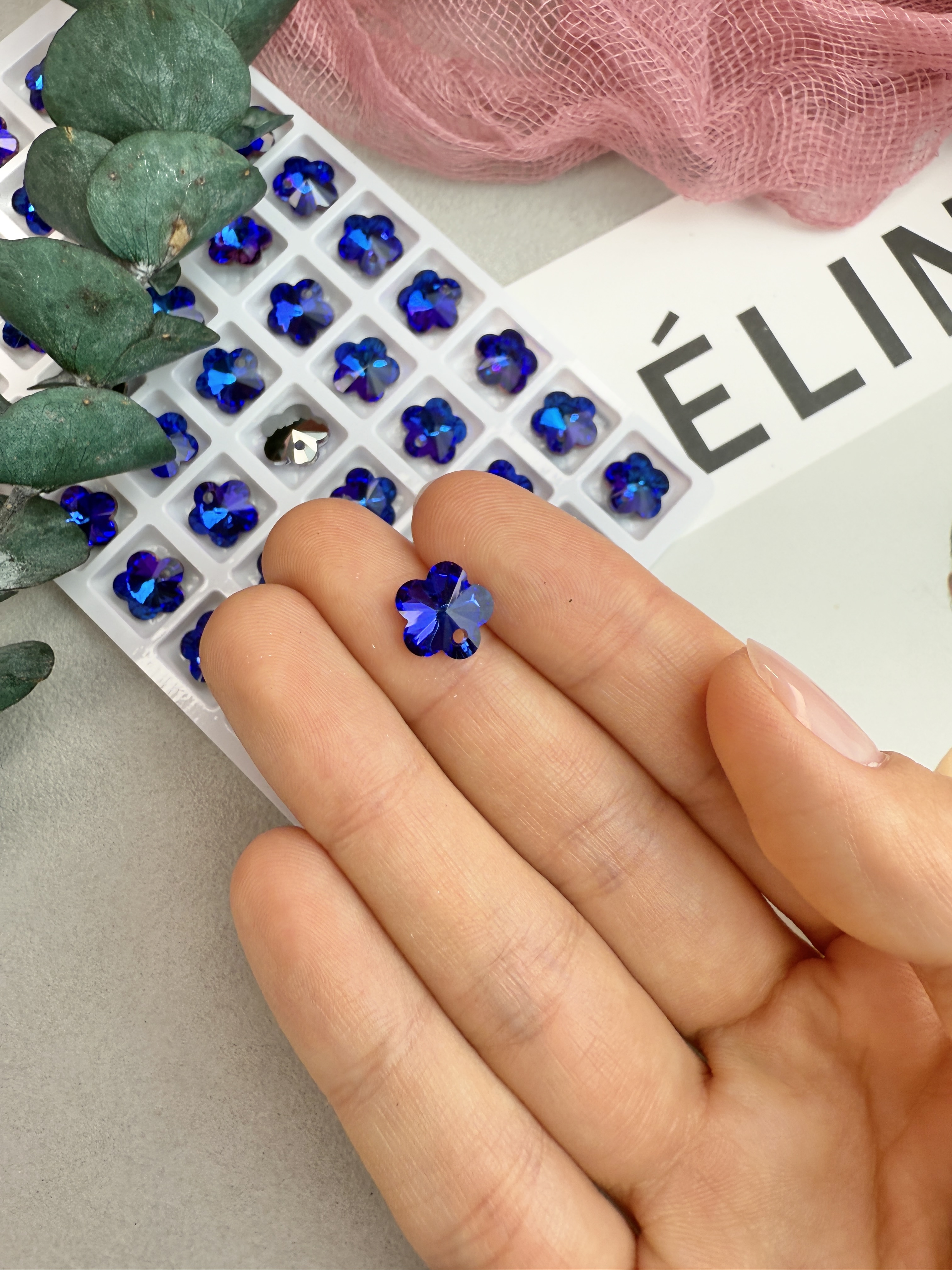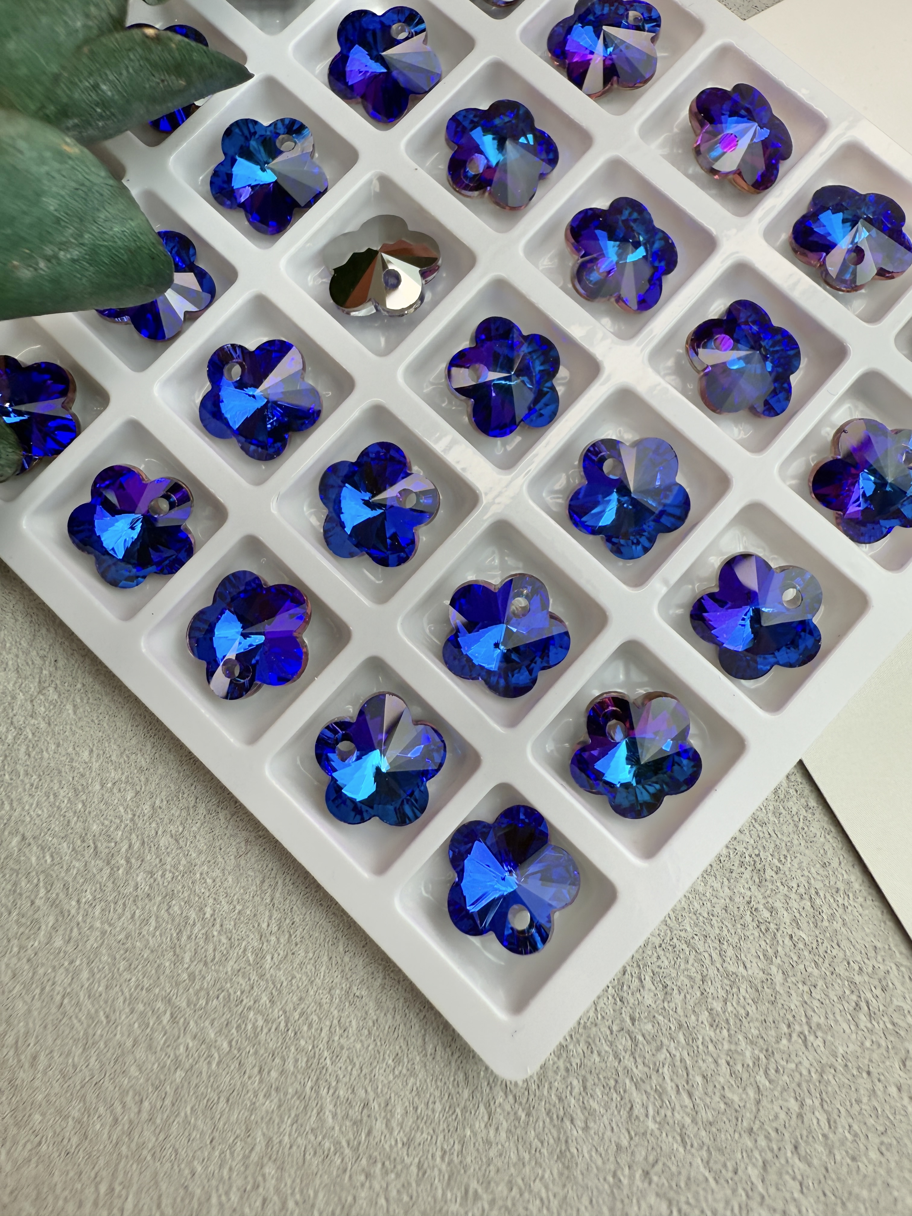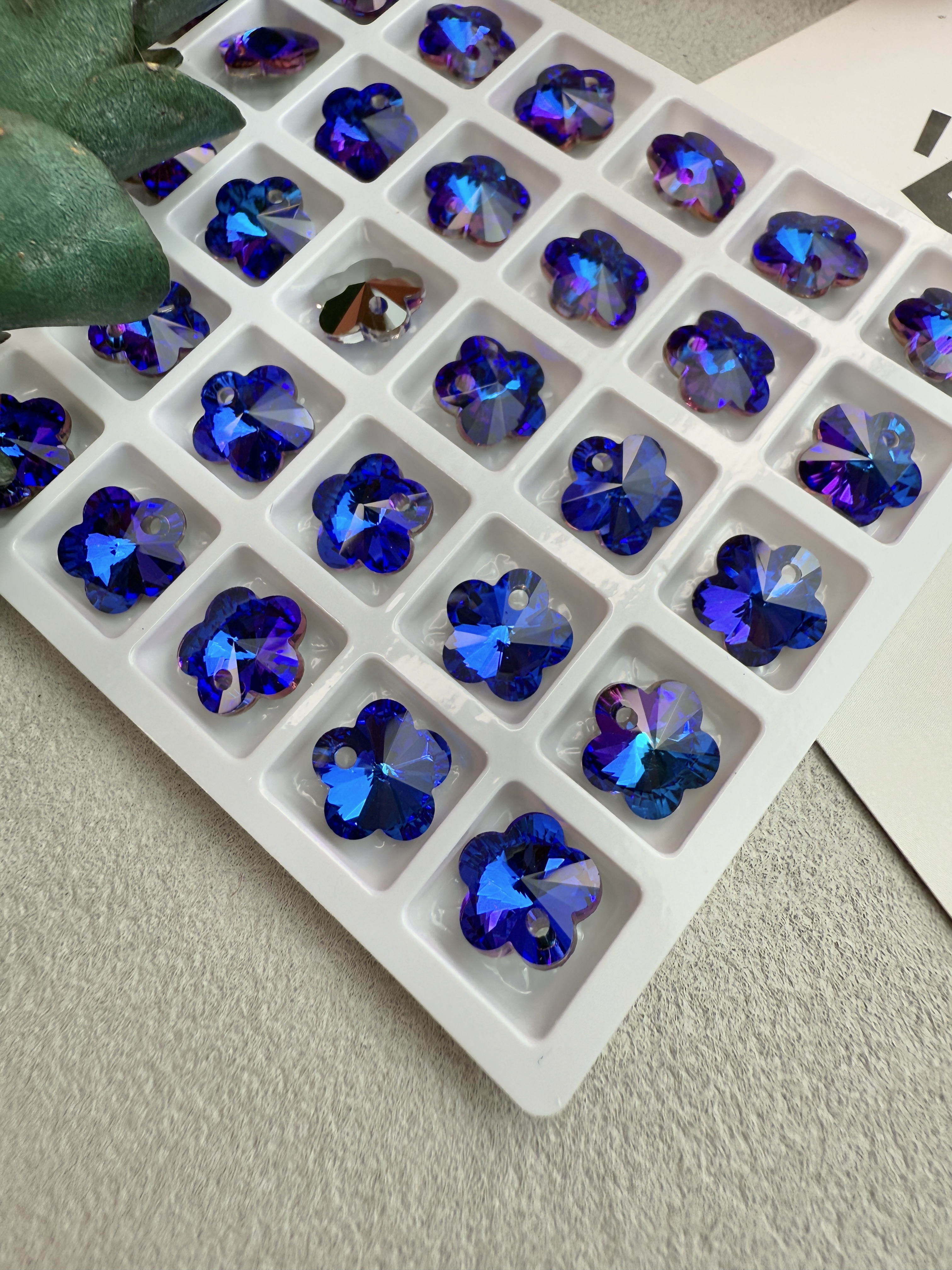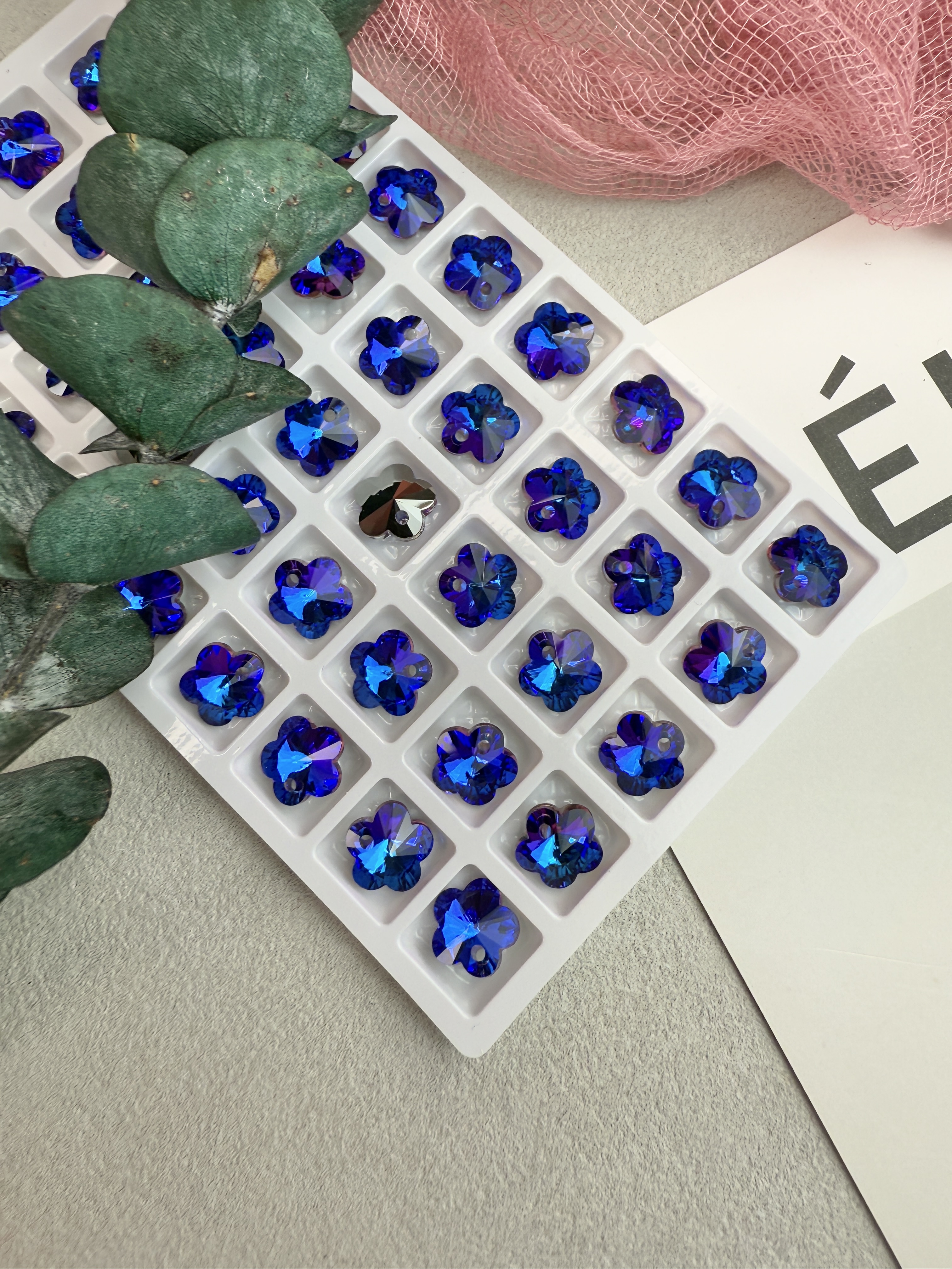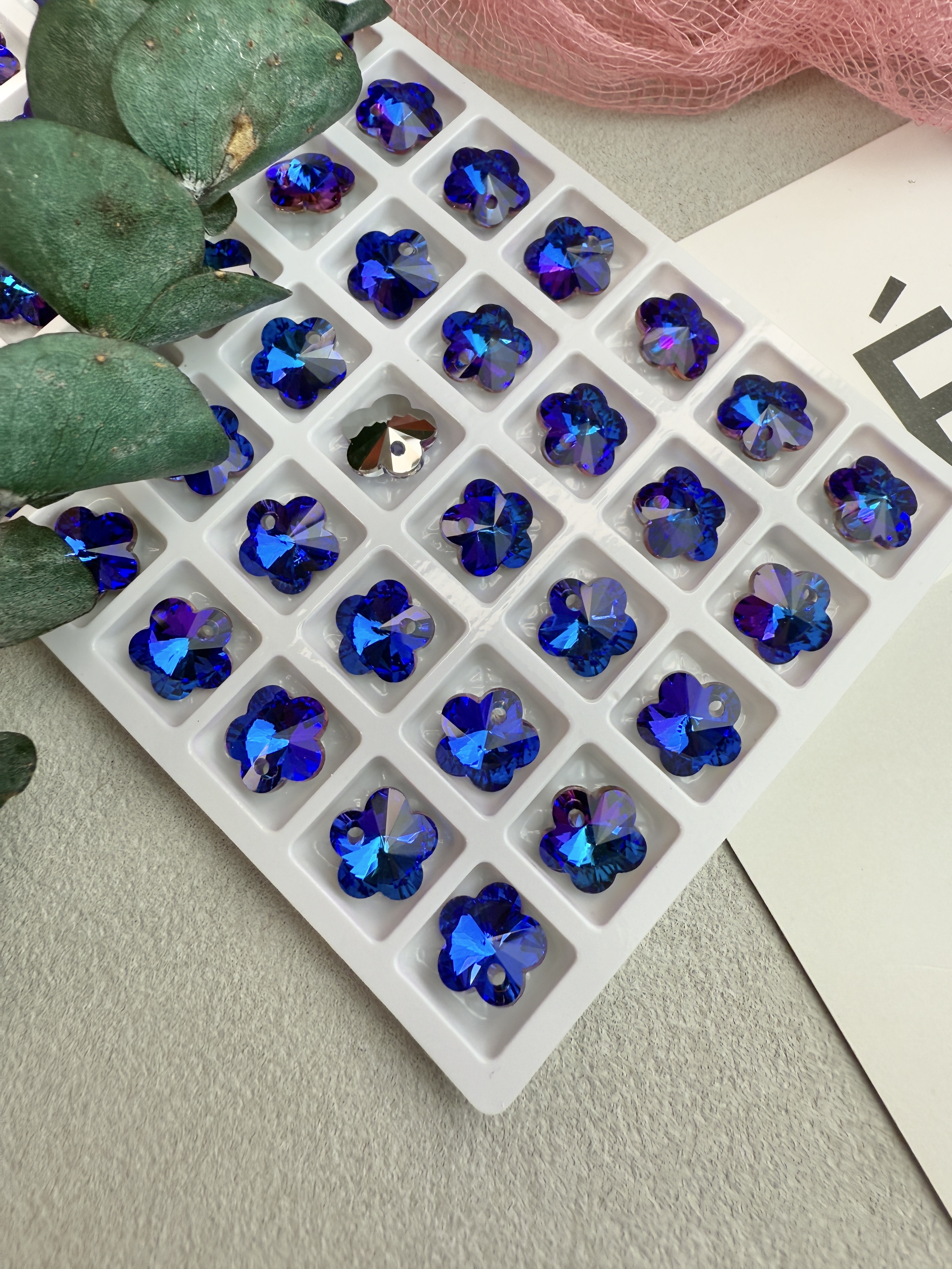 Изящная подвеска в виде маленького цветочка с переливающимися гранями. Подвеска выполнена из хрустального стекла (стекло с добавлением свинца для повышения блеска и твердости). Цвет переливается от темно-синего до фиолетового цвета. Размер одного цветочка 10 мм, в упаковке 2 штуки.