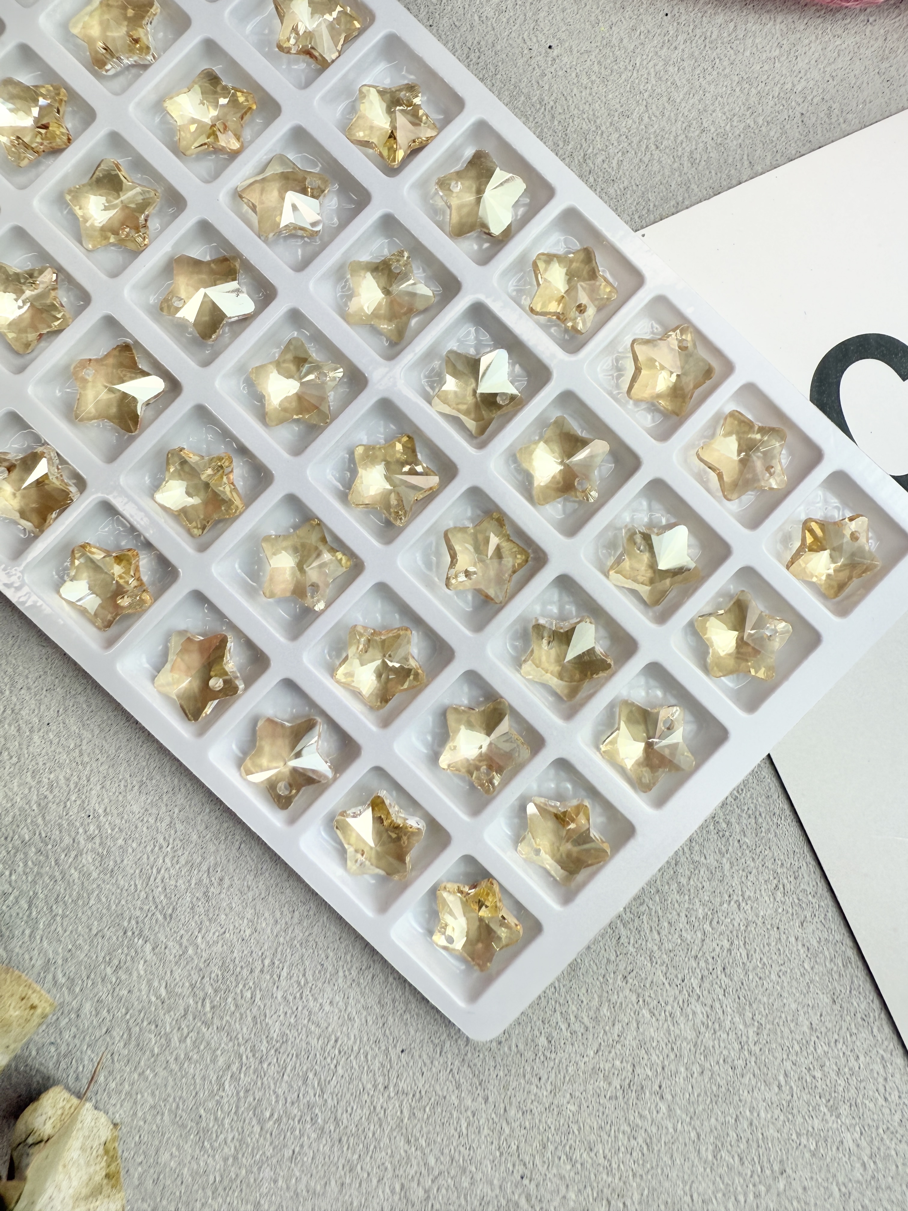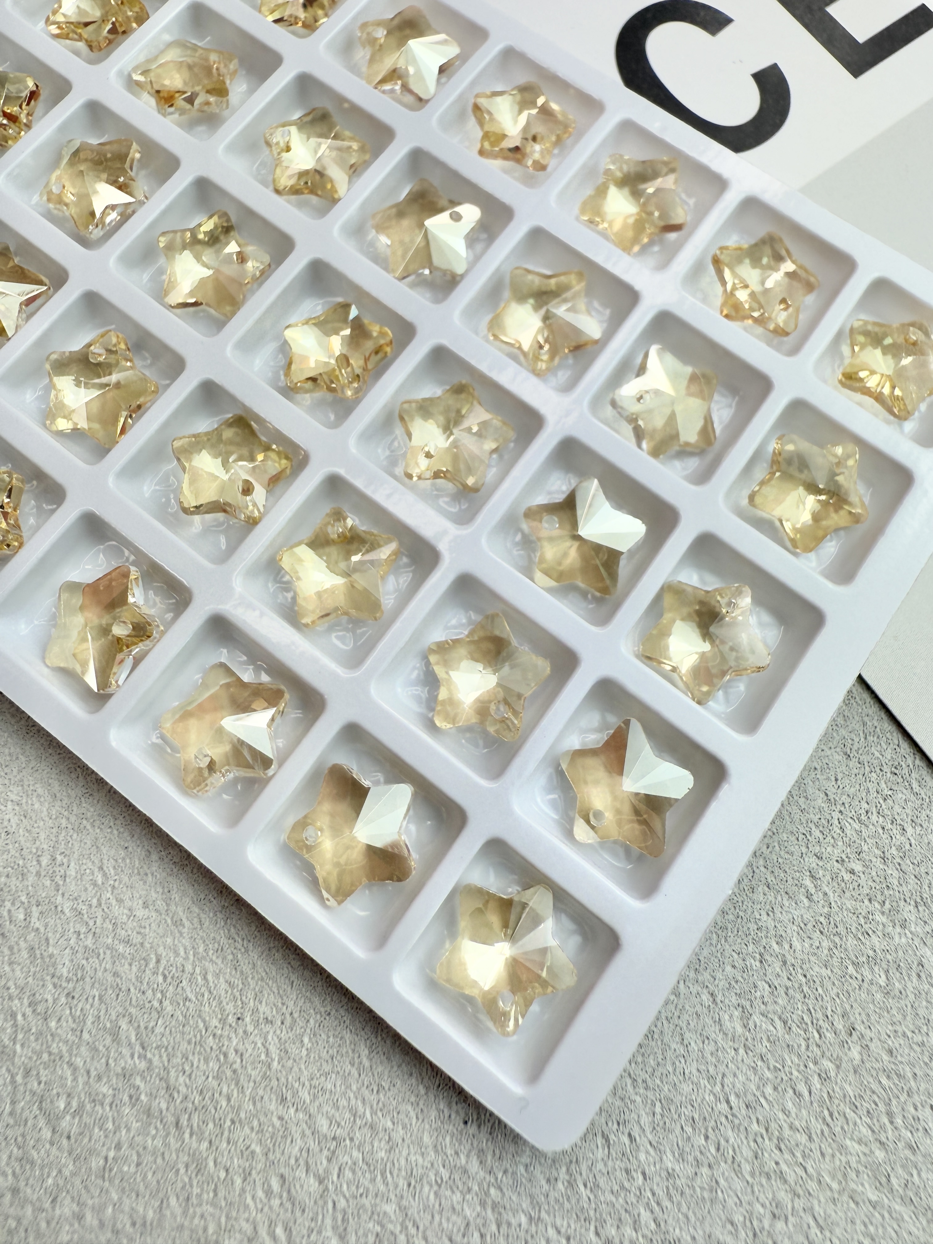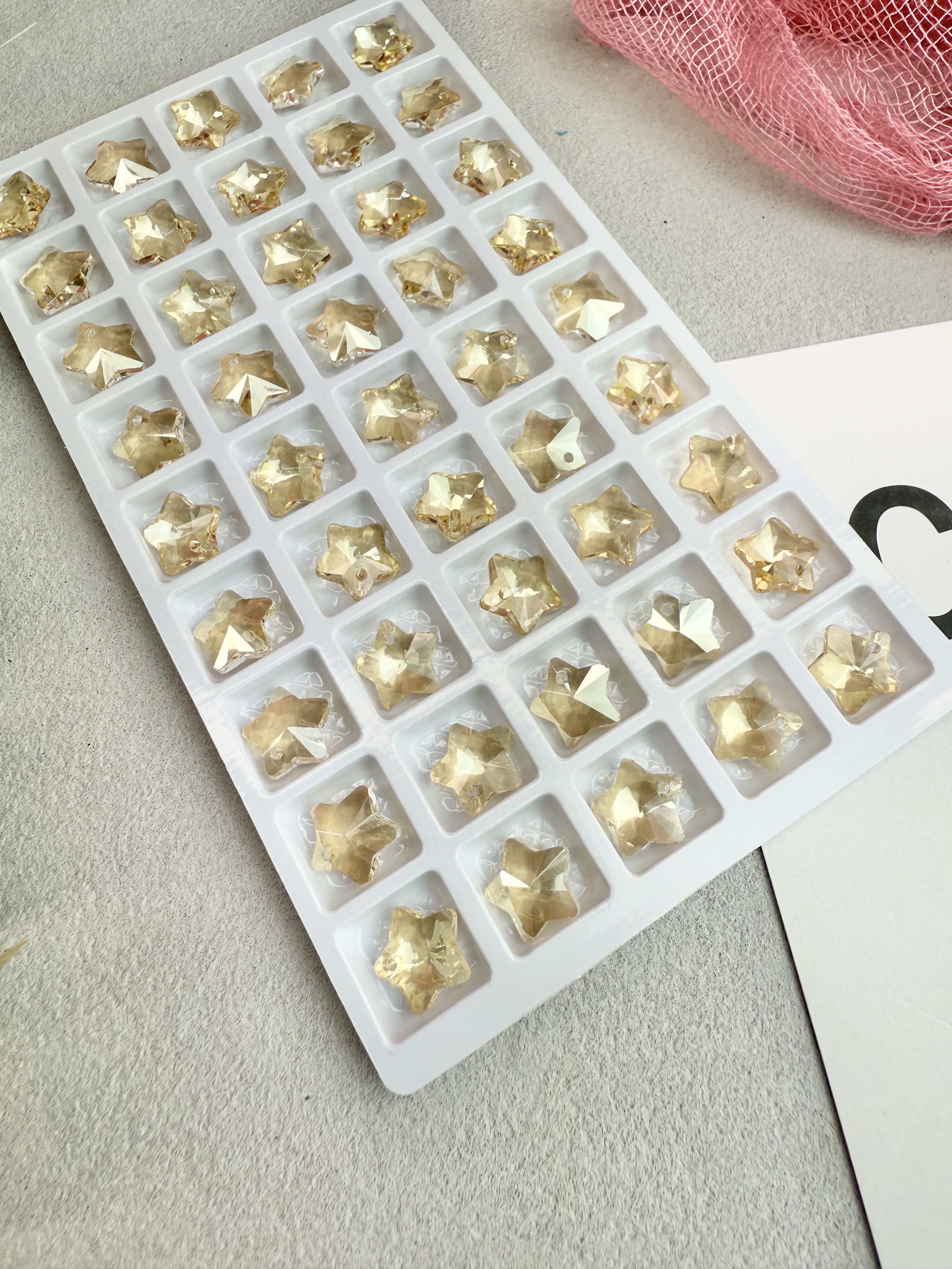 Изящная подвеска в виде маленькой звезды с переливающимися гранями. Подвеска выполнена из хрустального стекла (стекло с добавлением свинца для повышения блеска и твердости). Цвет переливается металлическим отливом золотого цвета. Размер одной подвески 10 мм, в упаковке 2 штуки.