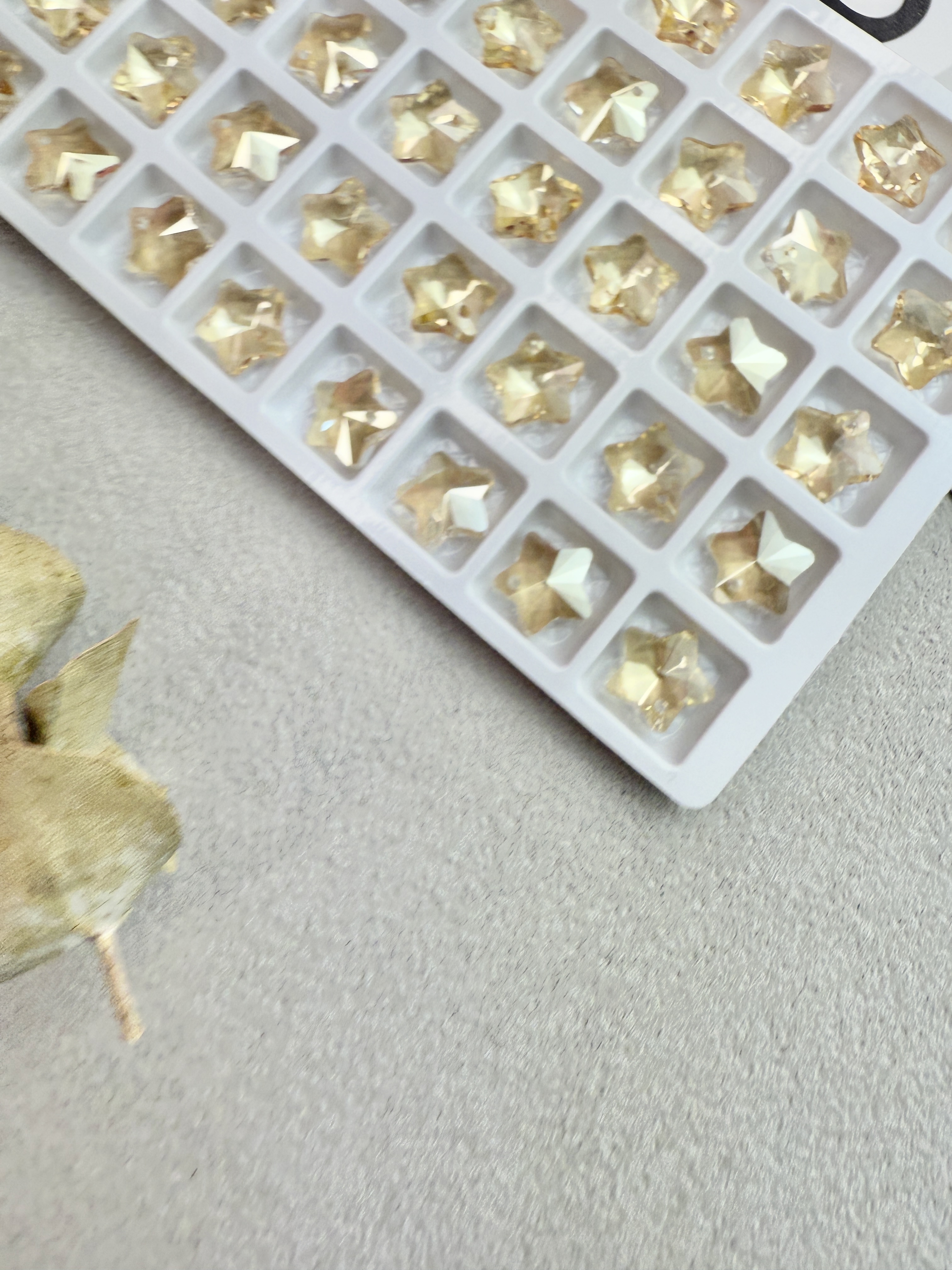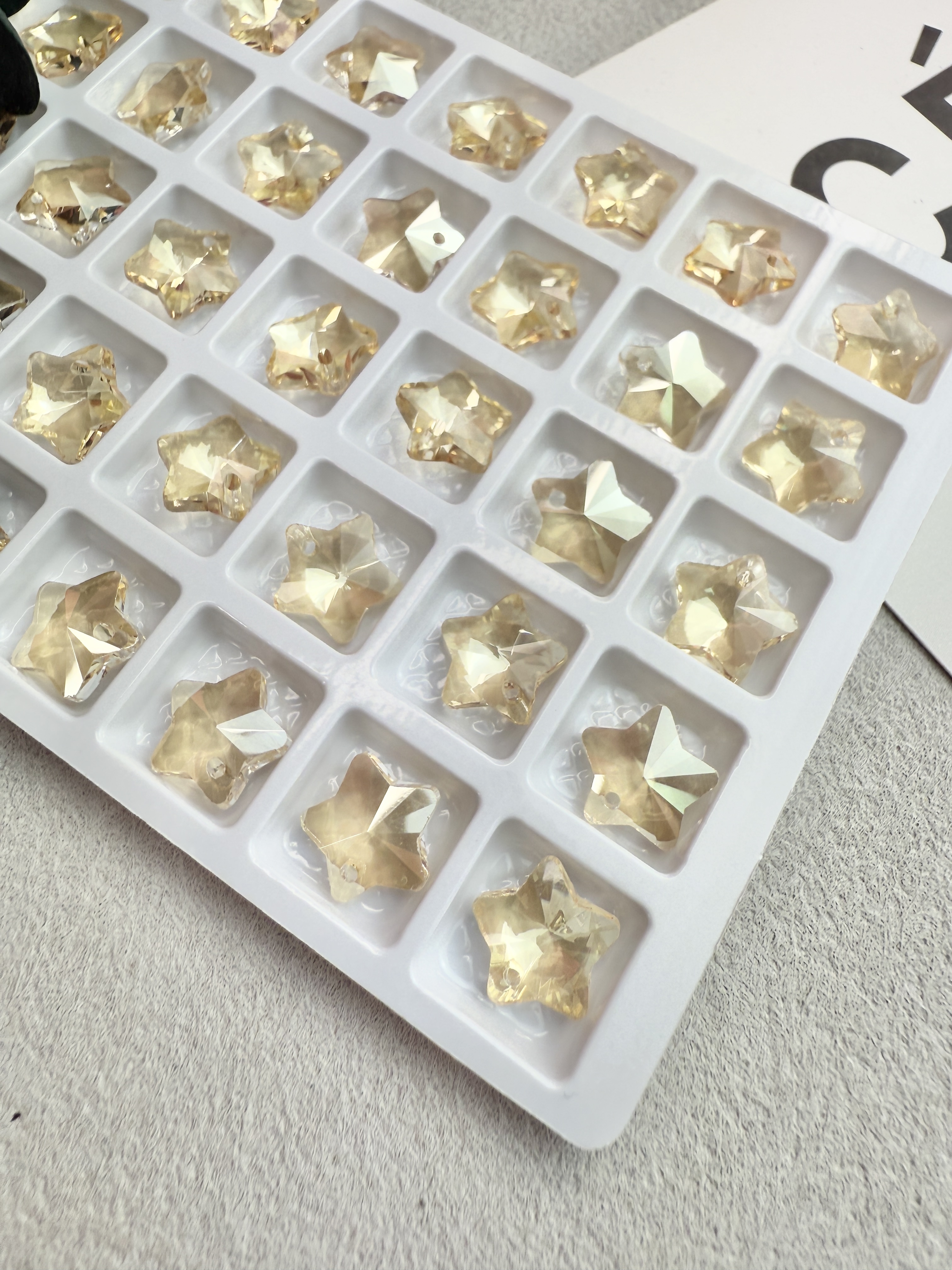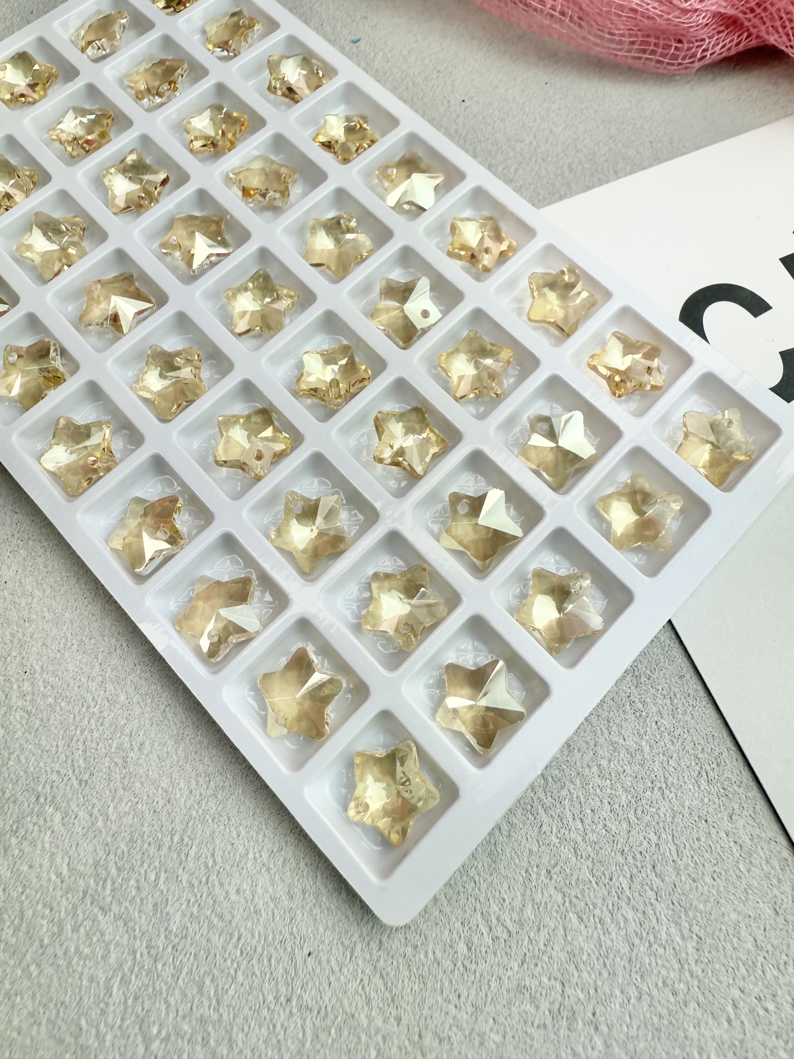 Изящная подвеска в виде маленькой звезды с переливающимися гранями. Подвеска выполнена из хрустального стекла (стекло с добавлением свинца для повышения блеска и твердости). Цвет переливается металлическим отливом золотого цвета. Размер одной подвески 10 мм, в упаковке 2 штуки.