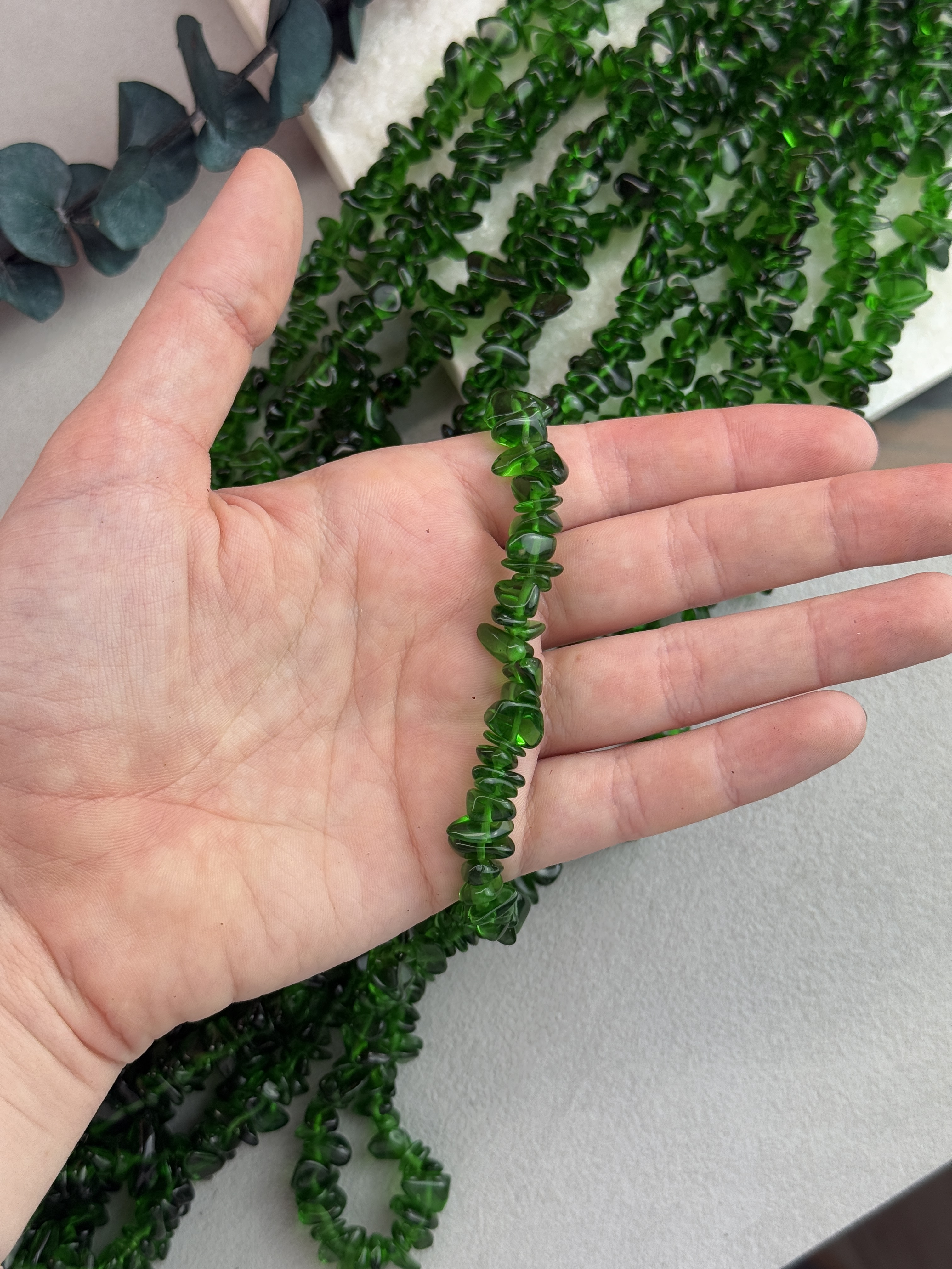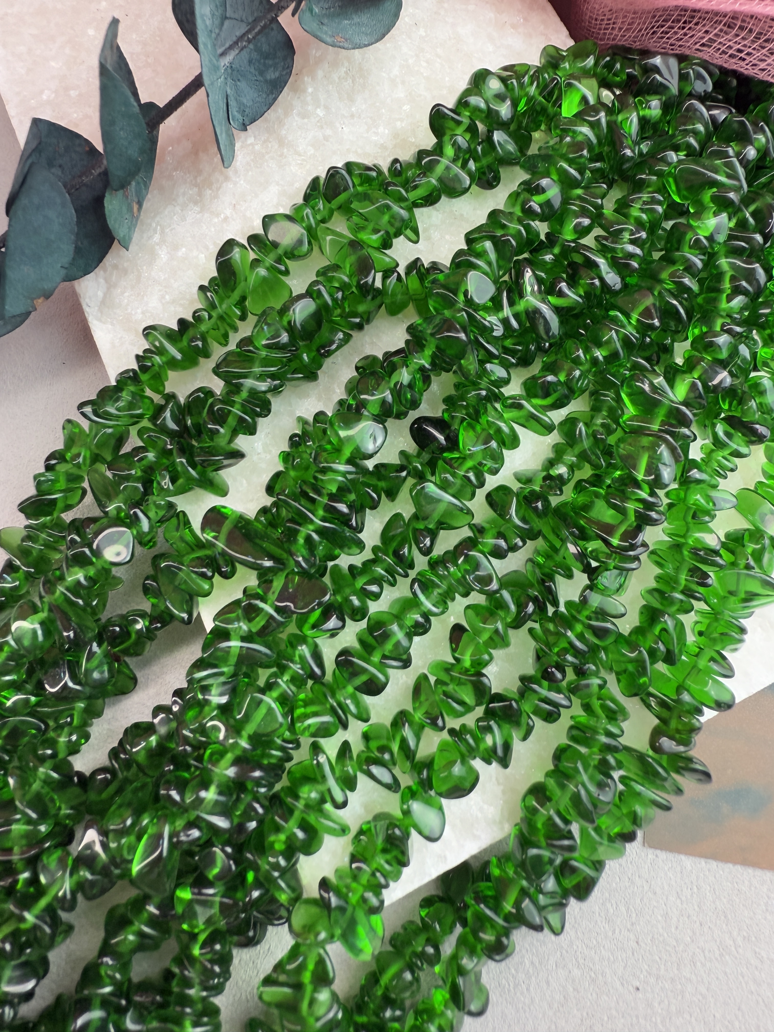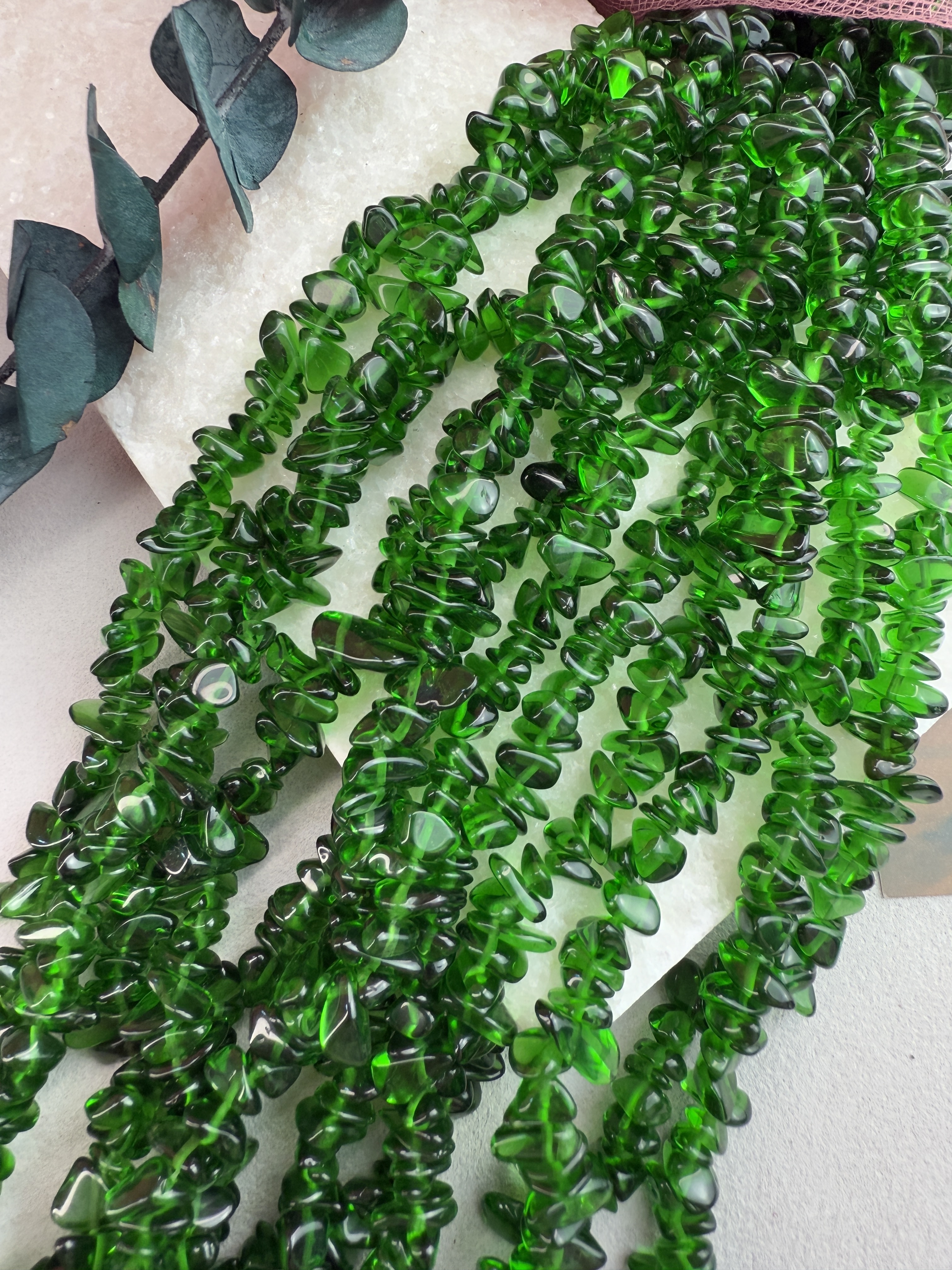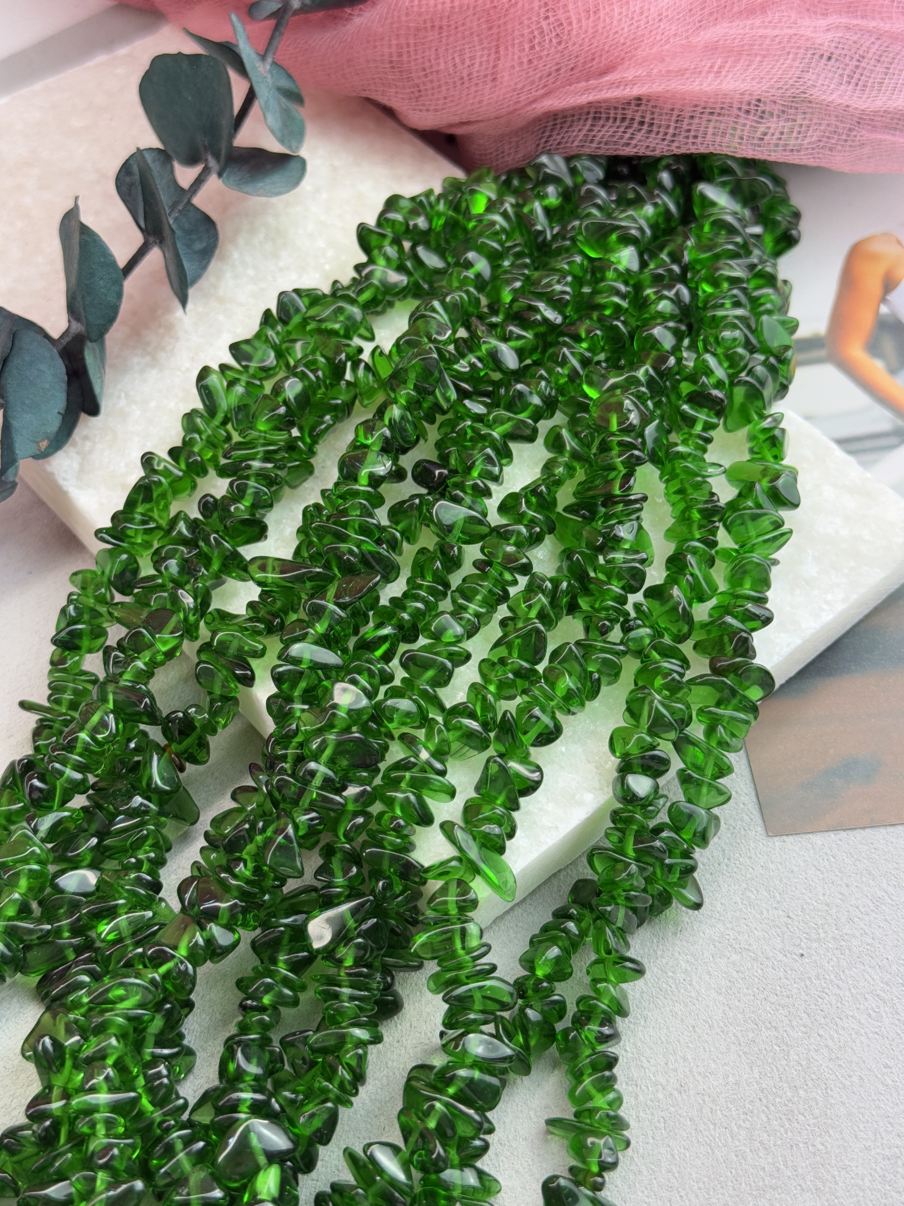 Стеклянные бусины темно-зеленого цвета. Размер бусин (примерный) 5-8 мм. Продается россыпью или на нити длиной 80 см (нить иногда рвется и мы меняем фасовку на россыпь). Форма всех бусин разная, неопределенная (галька).