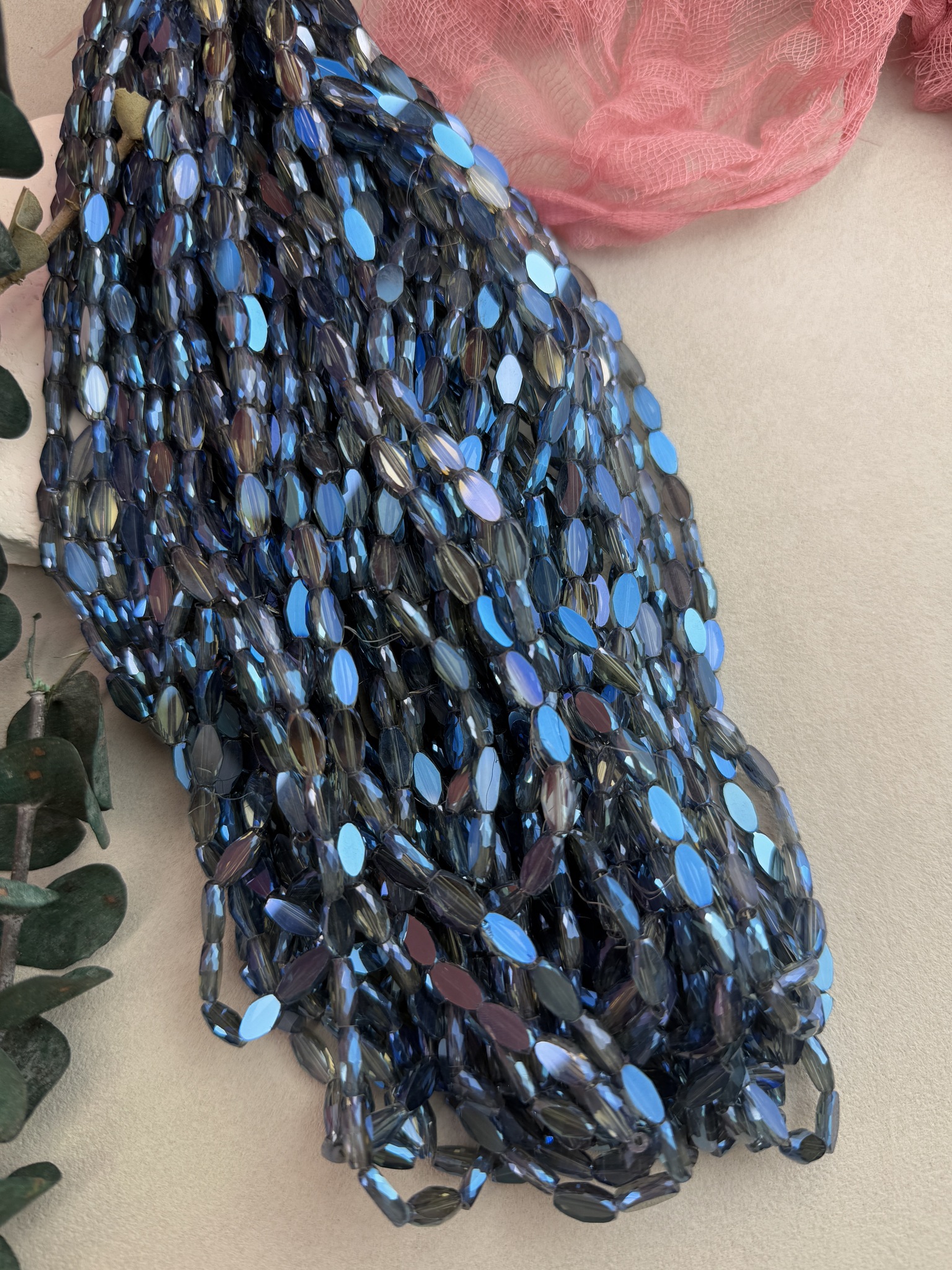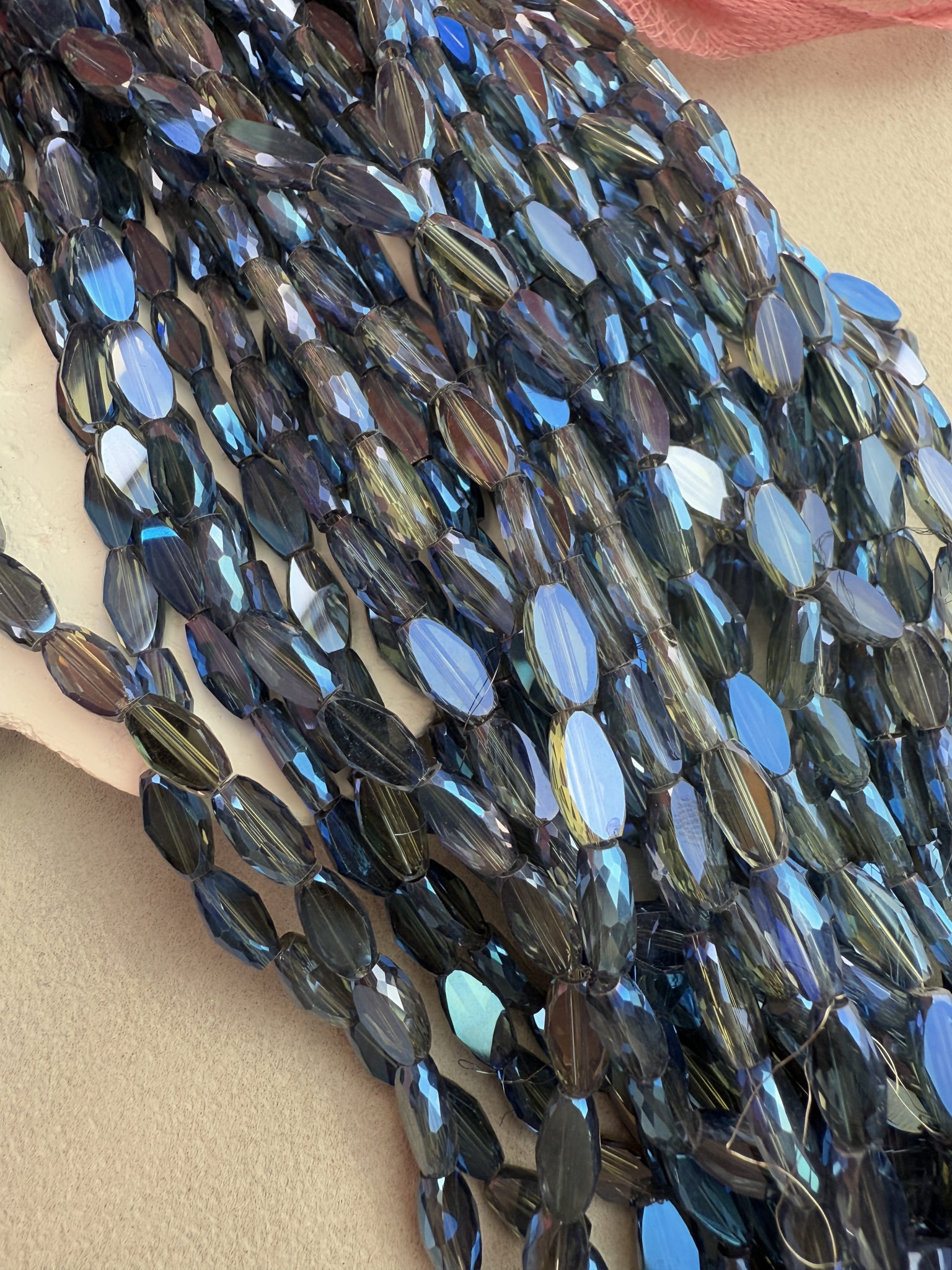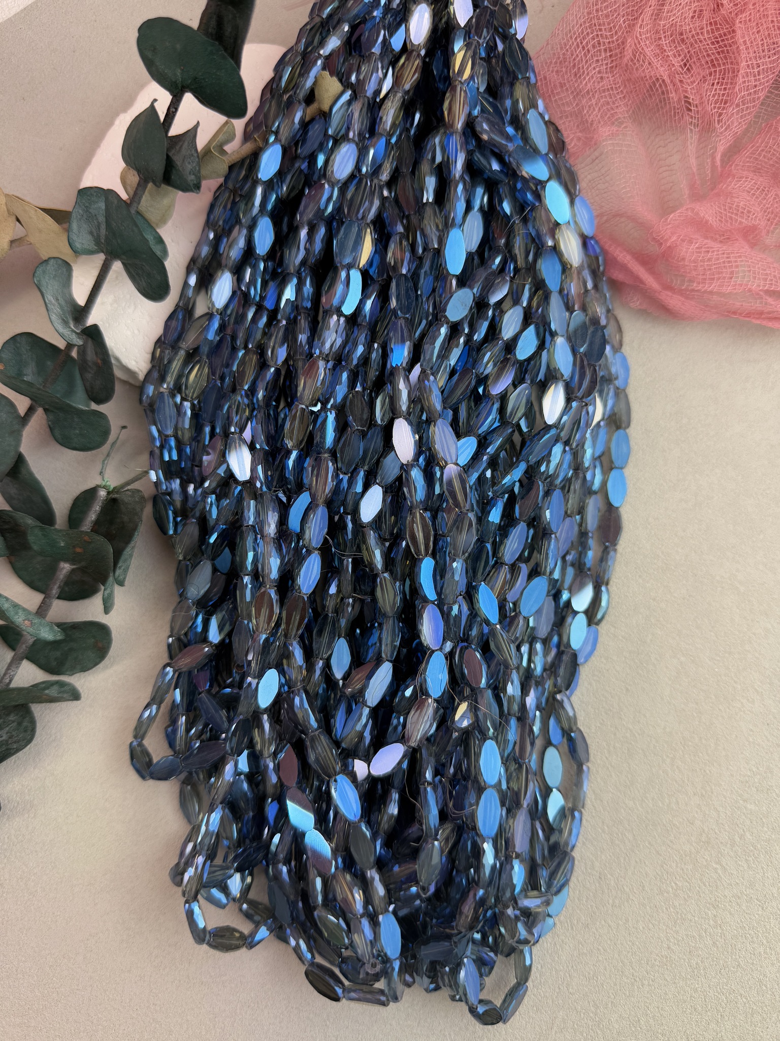 Овальные бусины из стекла с гальванизированным покрытием синего цвета. Боковые стороны имеют красивые грани за счет чего бусины красиво переливаются. Возможно наличие незначительных микро царапин на поверхности бусин. Продаются на нити 50 см или россыпью. Размер одной бусины 6*10 мм.