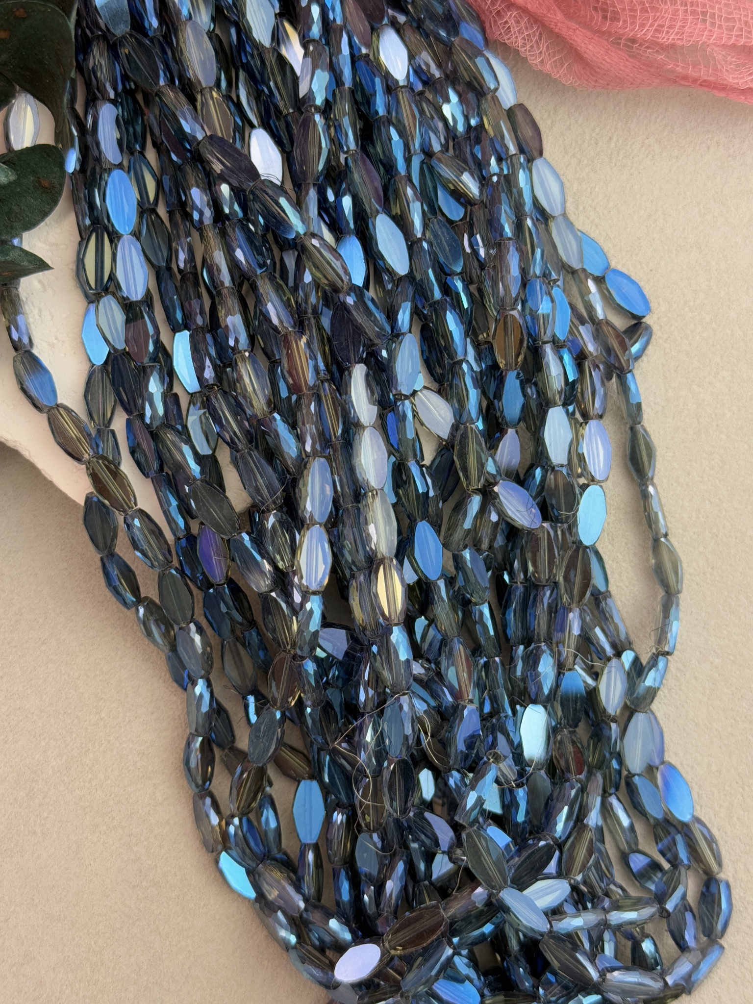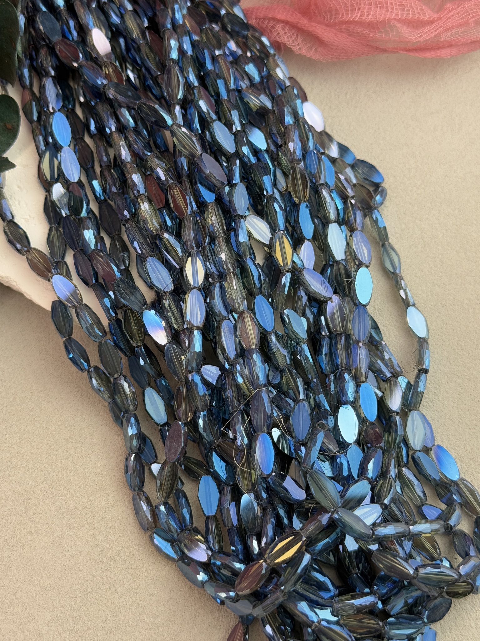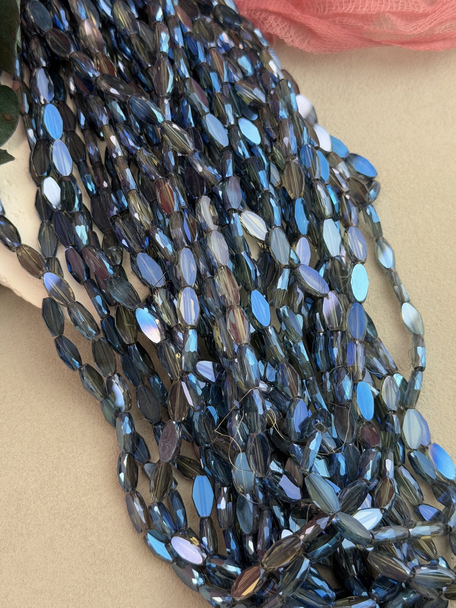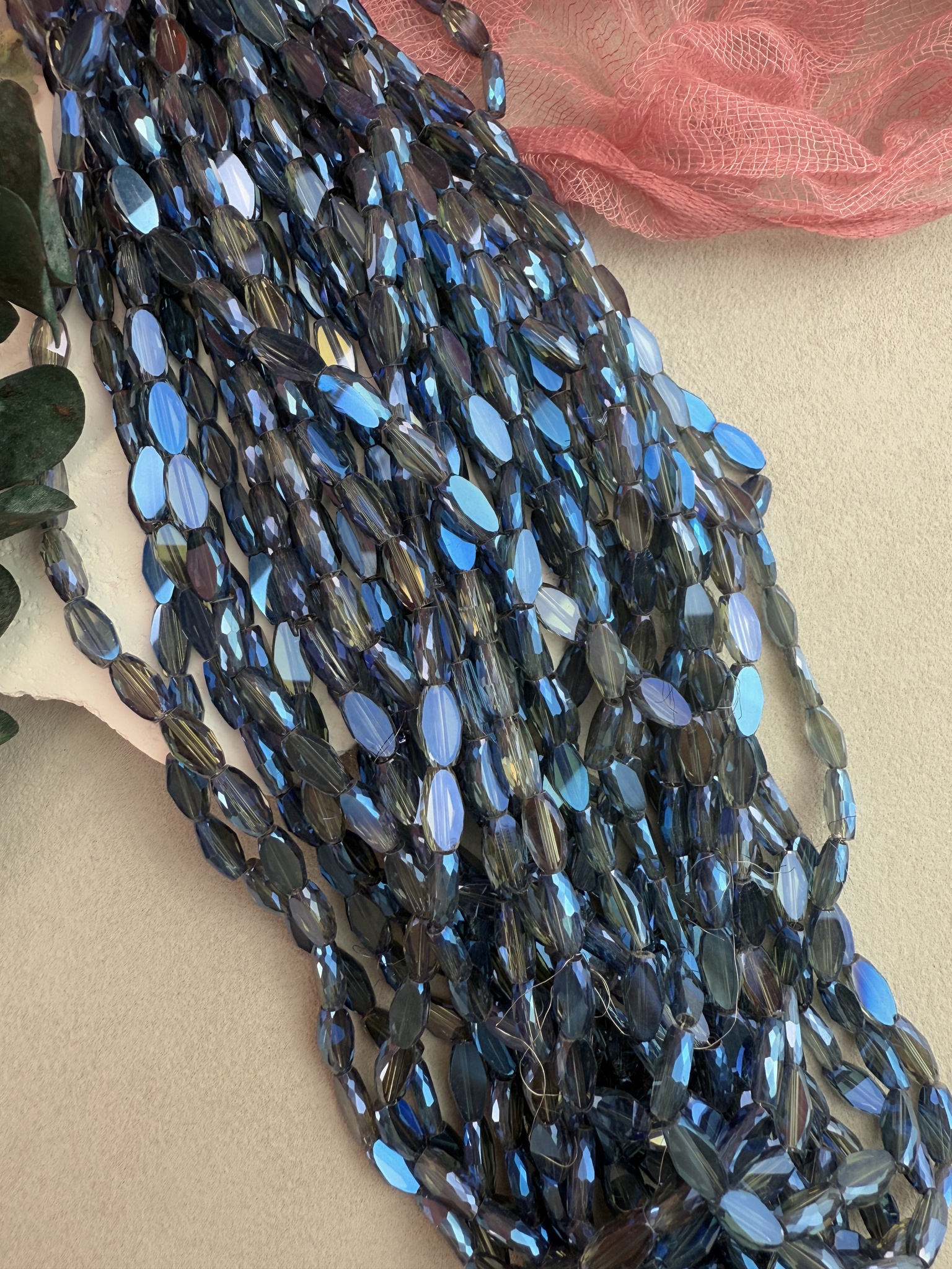 Овальные бусины из стекла с гальванизированным покрытием синего цвета. Боковые стороны имеют красивые грани за счет чего бусины красиво переливаются. Возможно наличие незначительных микро царапин на поверхности бусин. Продаются на нити 50 см или россыпью. Размер одной бусины 6*10 мм.
